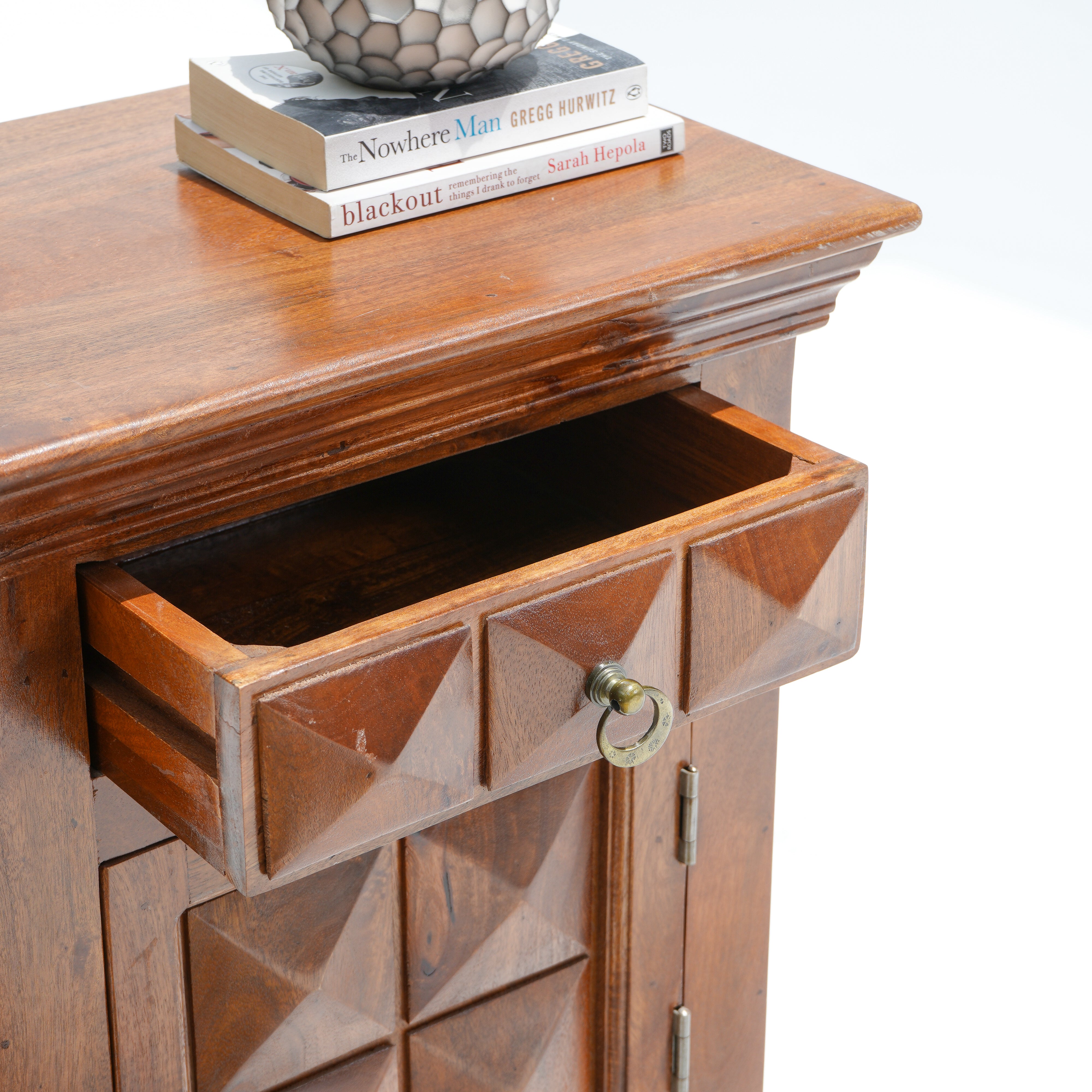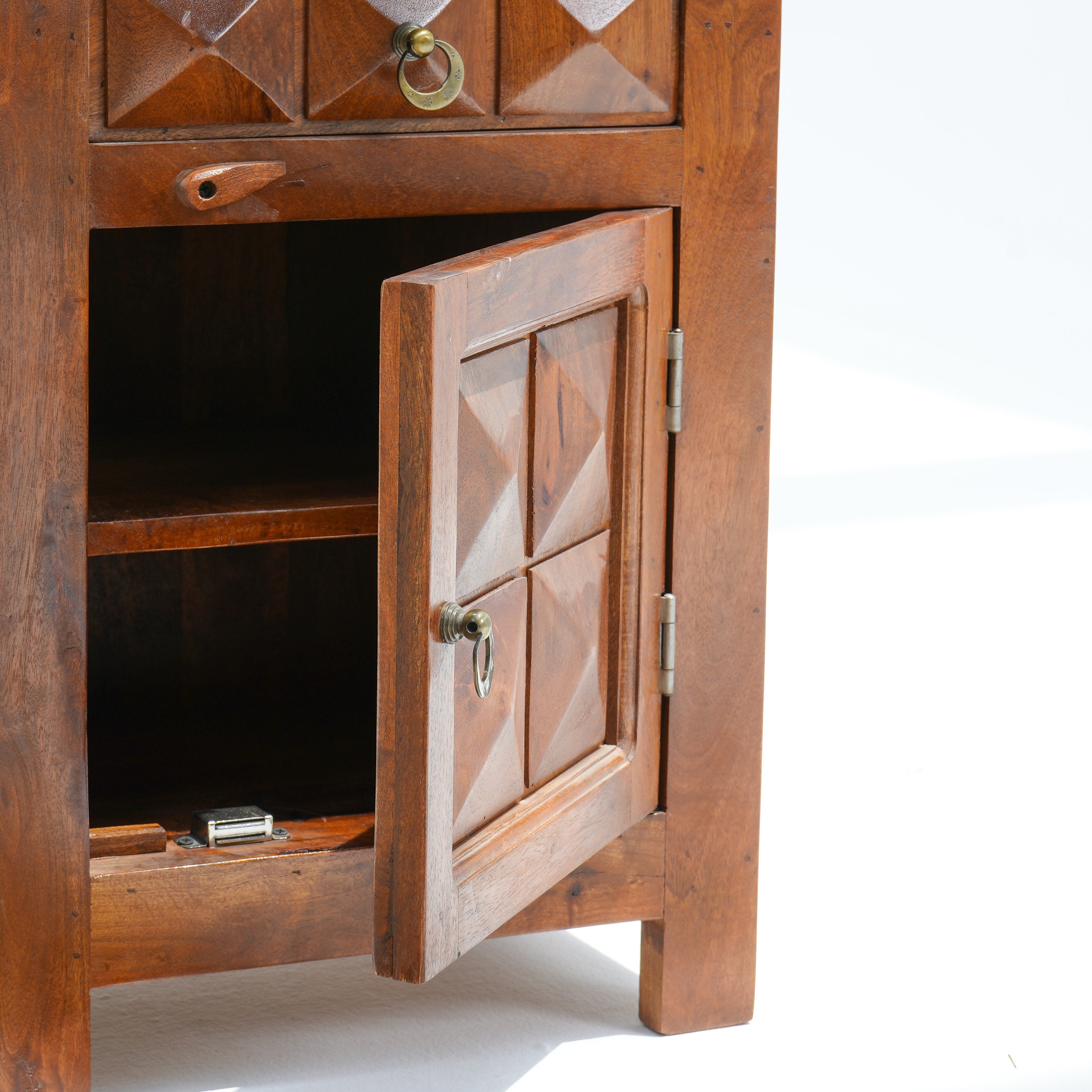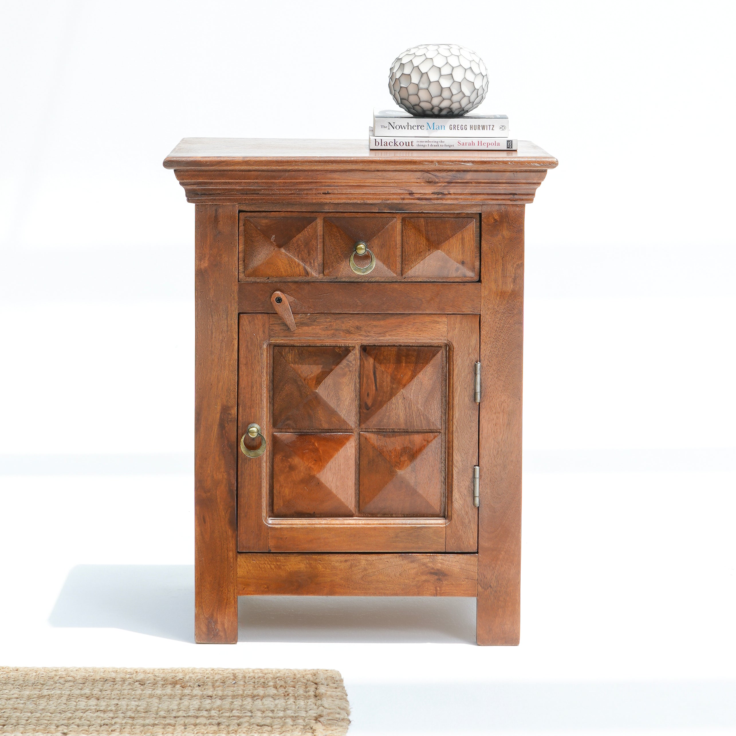 طاولة جانبية ماسية: مصنوعة يدويًا من خشب الورد الصلب، تتميز هذه الطاولة المعالجة ضد النمل الأبيض بتصميم أنيق وتفاصيل دقيقة. تعكس كل قطعة براعة حرفية فريدة. تشمل ضمانًا لمدة عام واحد لجودة تدوم طويلًا.