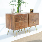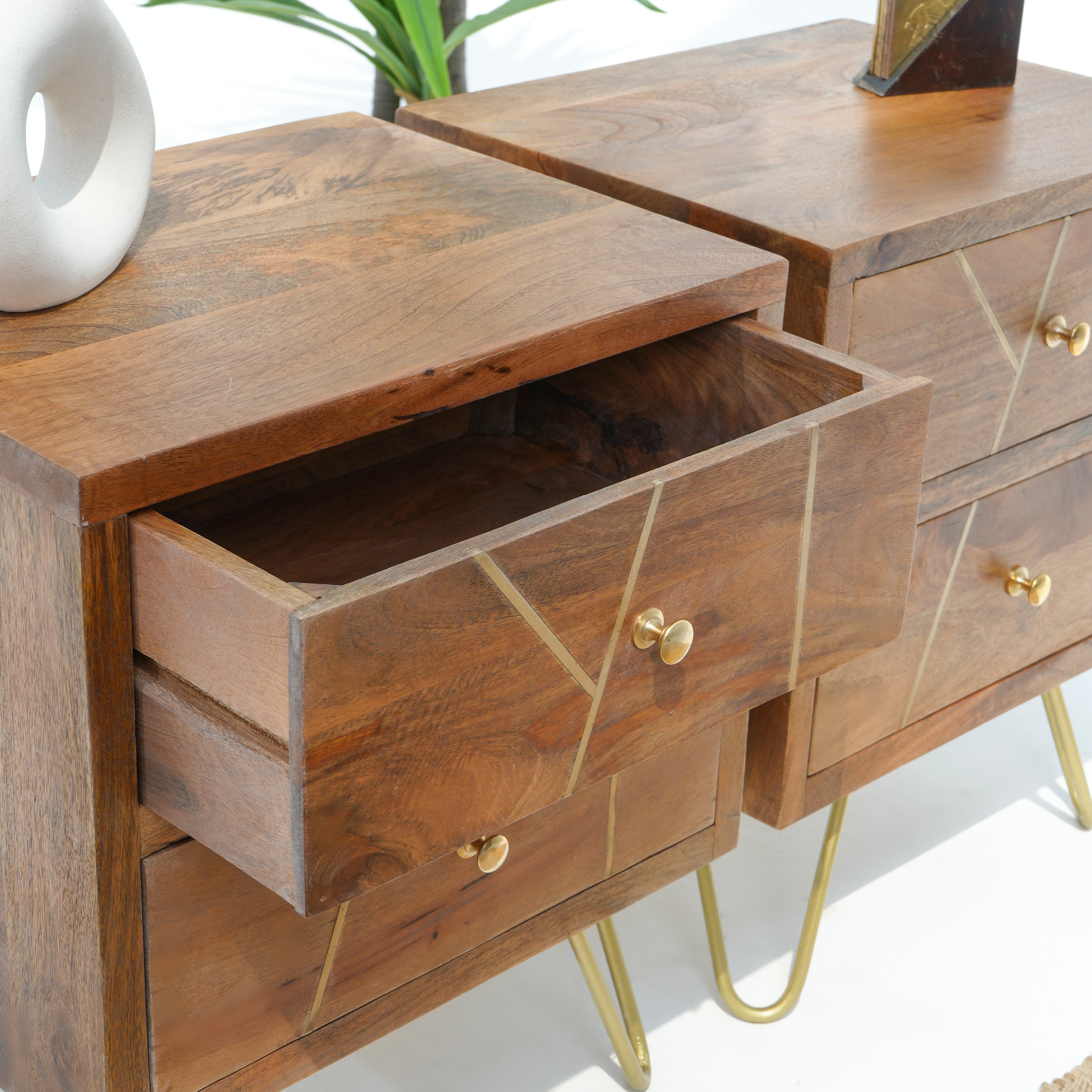 طاولة جانبية مانجولوكس جولدلاين: مصنوعة من خشب الماهوجني الصلب، هذه الطاولة الجانبية المعالجة ضد النمل الأبيض تتميز بلمسات ذهبية رائعة. مصنوعة يدويًا بجودة عالية، تجمع بين الأناقة والعملية مع درجين واسعين. تشمل ضمانًا لمدة عام.