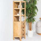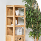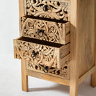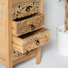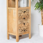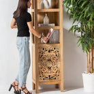 تجمع خزانة الكتب الخشبية المنحوتة "دابورا" بين التخزين العملي والحرفية اليدوية المتقنة. مصنوعة من خشب المانجو الصلب بلونه الطبيعي، تتميز هذه القطعة بتفاصيل منحوتة يدويًا بدقة تضفي عمقًا بصريًا وجمالًا على أي غرفة. توفر أربعة أدراج واسعة مساحة تخزين مخفية للكتب والوثائق والأغراض الشخصية، بينما تعرض الرفوف المفتوحة مجموعتك بأسلوب أنيق. يضمن هيكل خشب المانجو المتين عمرًا طويلًا، ويكتسب بريقًا مميزًا مع مرور الوقت. خيار مثالي لهواة جمع التحف وعشاق التصميم الذين يبحثون عن أثاث عالي الجودة يجمع بين العملية والجمال الفني.