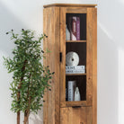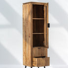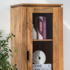 خزانة فلوتلاين الخشبية ذات الباب الزجاجي الواحد - قطعة فنية مصنوعة يدويًا ببراعة من الهند. مصنوعة من خشب المانجو الصلب الفاخر، تجمع هذه الخزانة بين المتانة والجمال الراقي. يعرض الباب الزجاجي الواحد مقتنياتك الثمينة ويحميها من الغبار، بينما يوفر البابان الخشبيان الصلبان مساحة تخزين مخفية لأغراضك اليومية. تعكس كل قطعة براعة حرفية أصيلة، مما يجعلها إضافة استثنائية لأي منزل. مثالية لعرض المقتنيات أو الكتب أو القطع الزخرفية بأناقة خالدة.