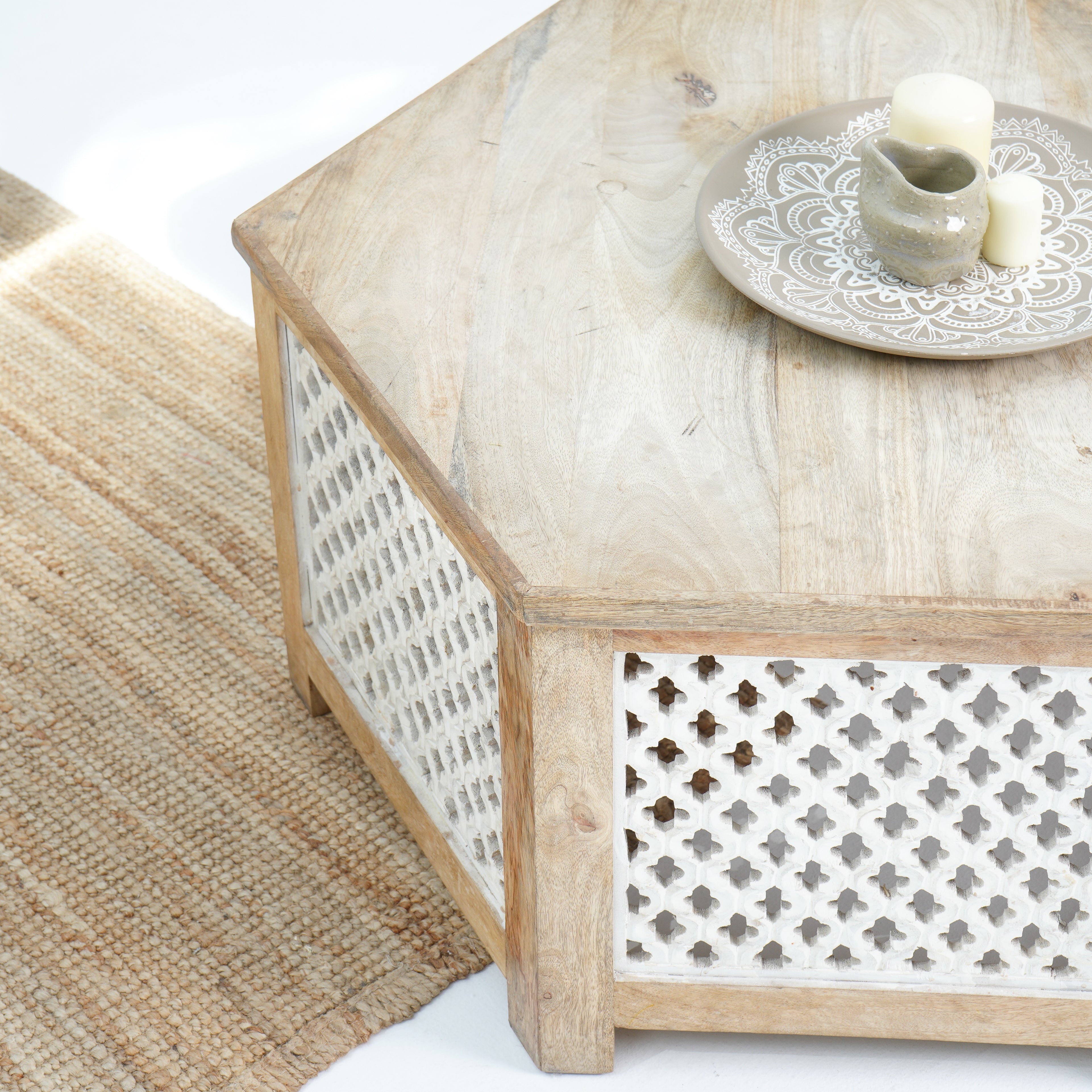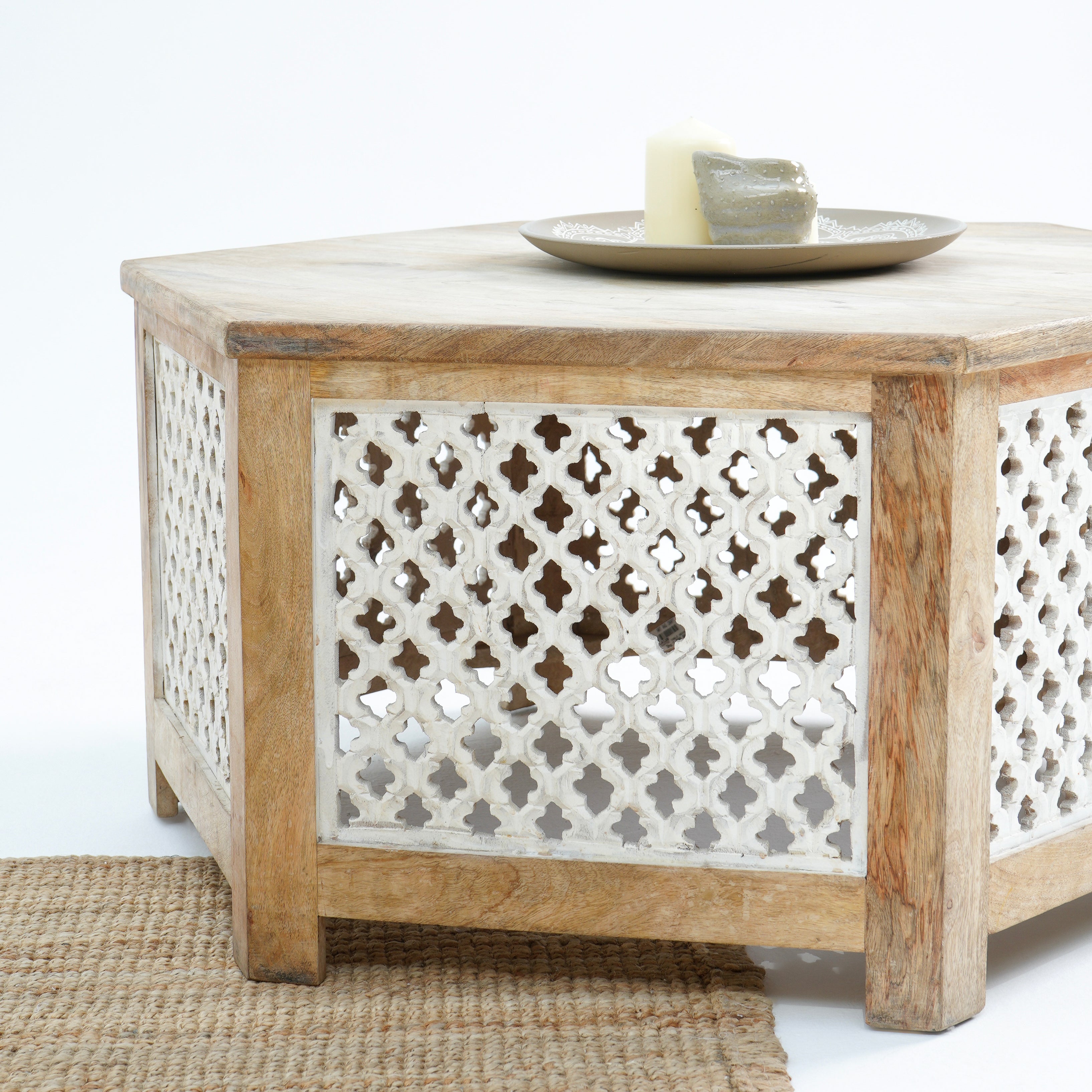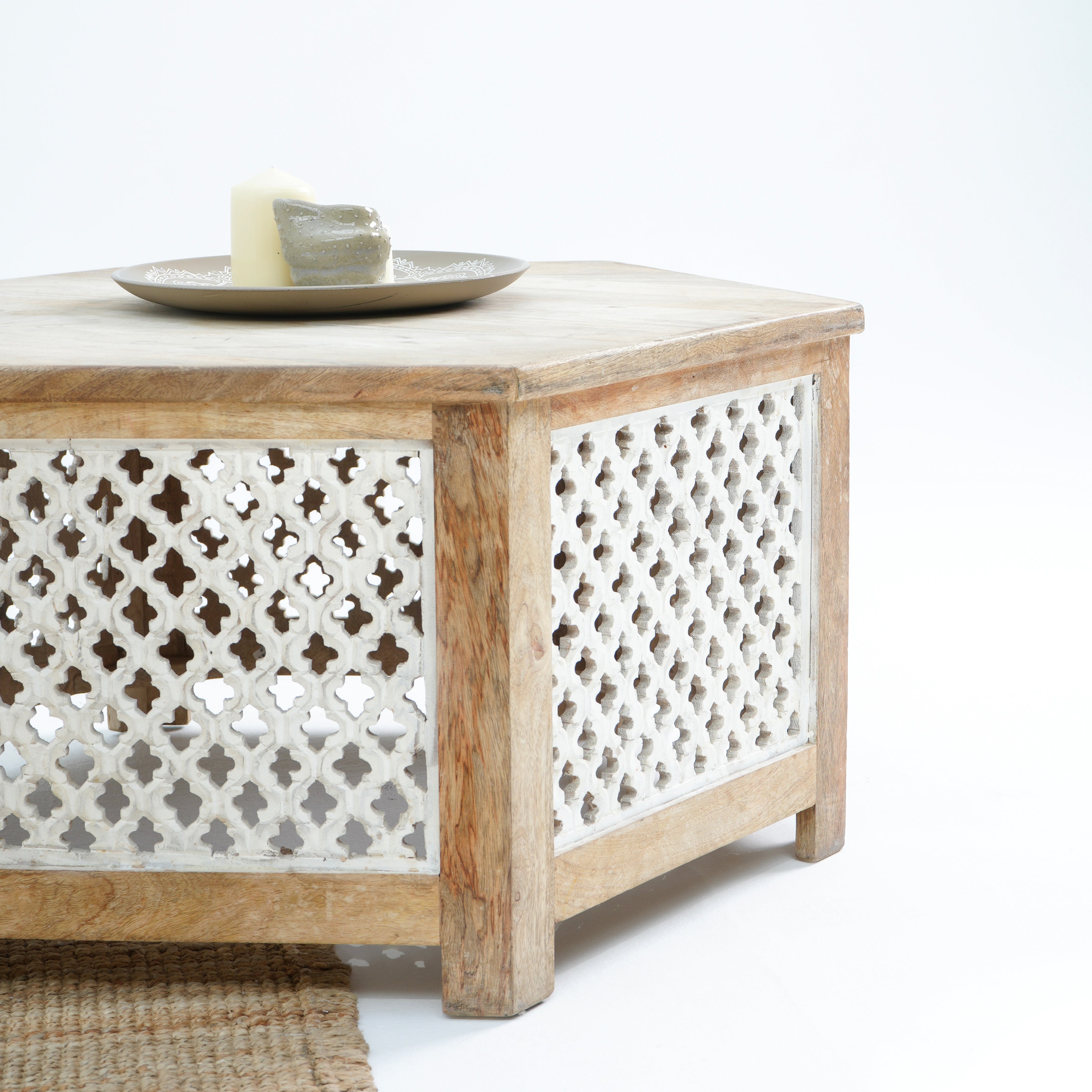 طاولة القهوة "جرين آند جلو" تحفة فنية مصنوعة من الخشب الصلب في الهند. تضفي نقوشها الخشبية الفريدة وألوانها الدافئة لمسة مميزة على مساحتك. مع ضمان لمدة عام، تُعدّ خيارًا أنيقًا ومتينًا لمنزلك!