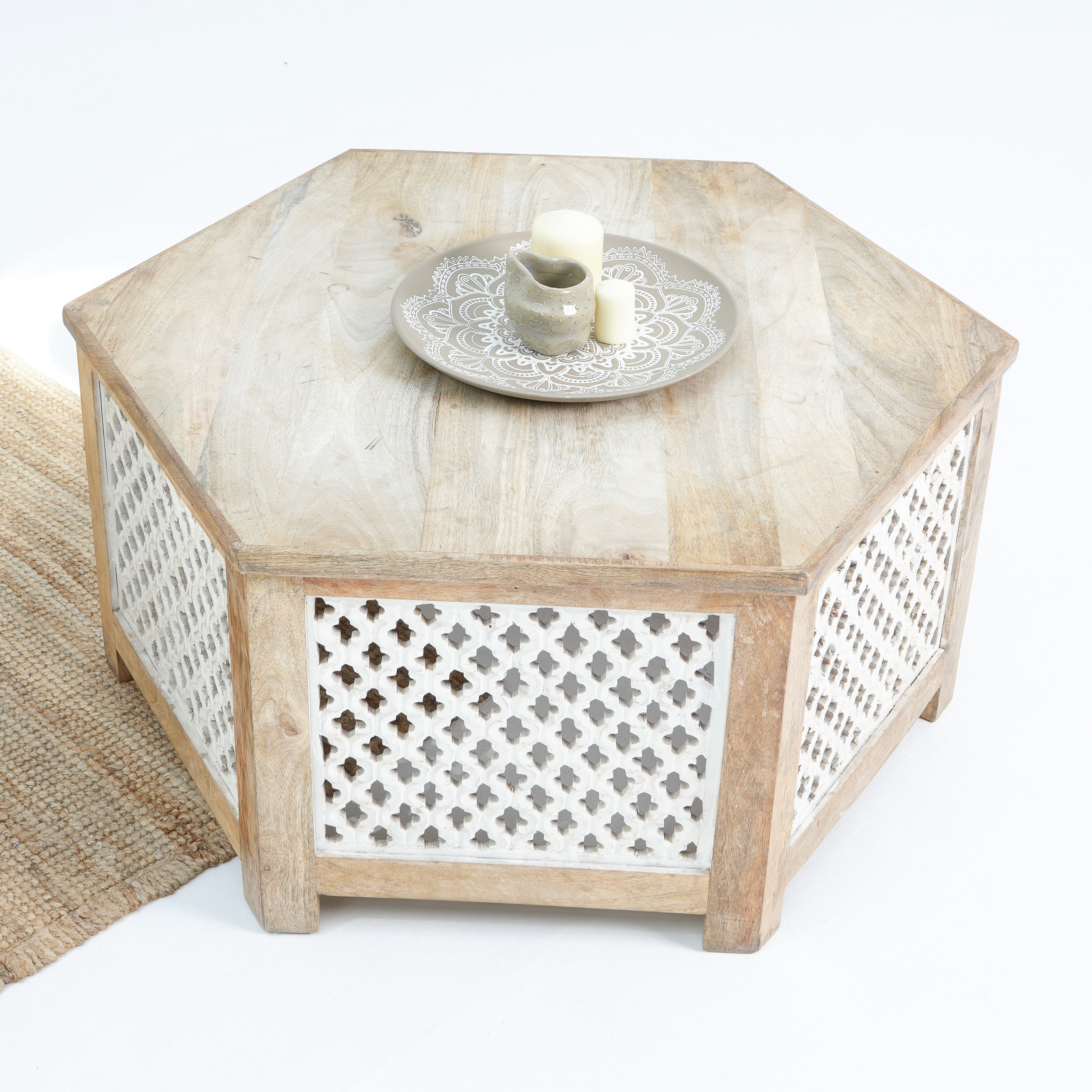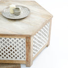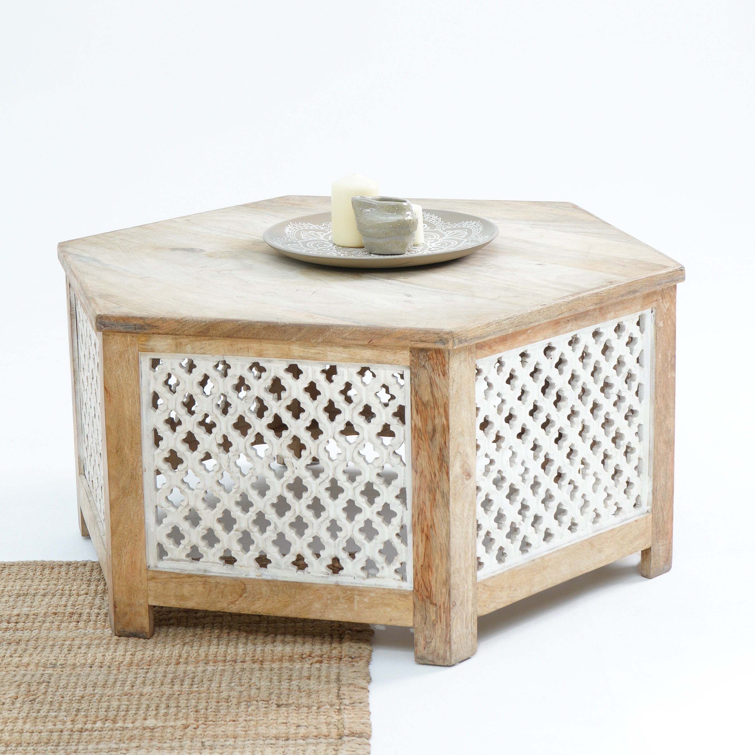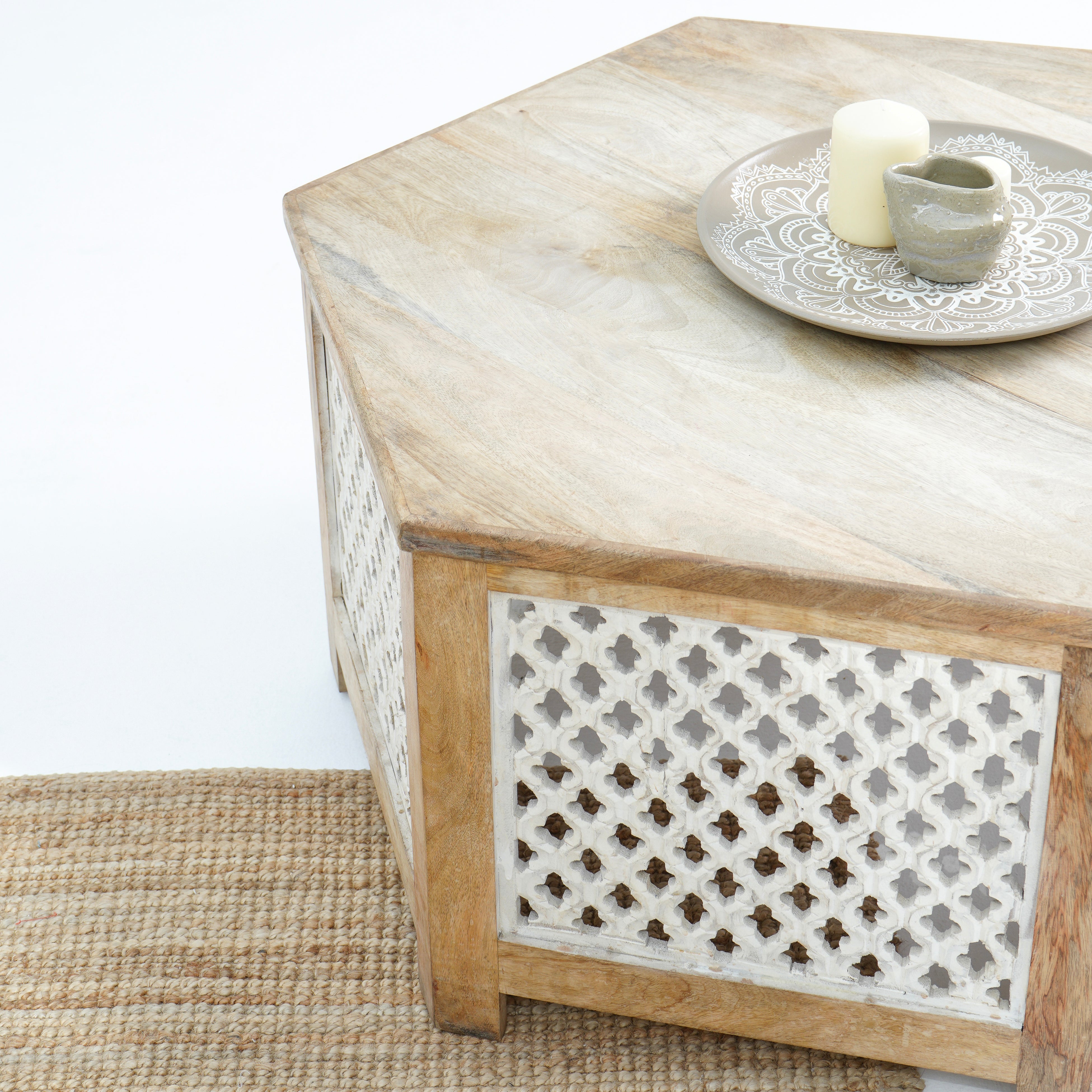طاولة القهوة "جرين آند جلو" تحفة فنية مصنوعة من الخشب الصلب في الهند. تضفي نقوشها الخشبية الفريدة وألوانها الدافئة لمسة مميزة على مساحتك. مع ضمان لمدة عام، تُعدّ خيارًا أنيقًا ومتينًا لمنزلك!