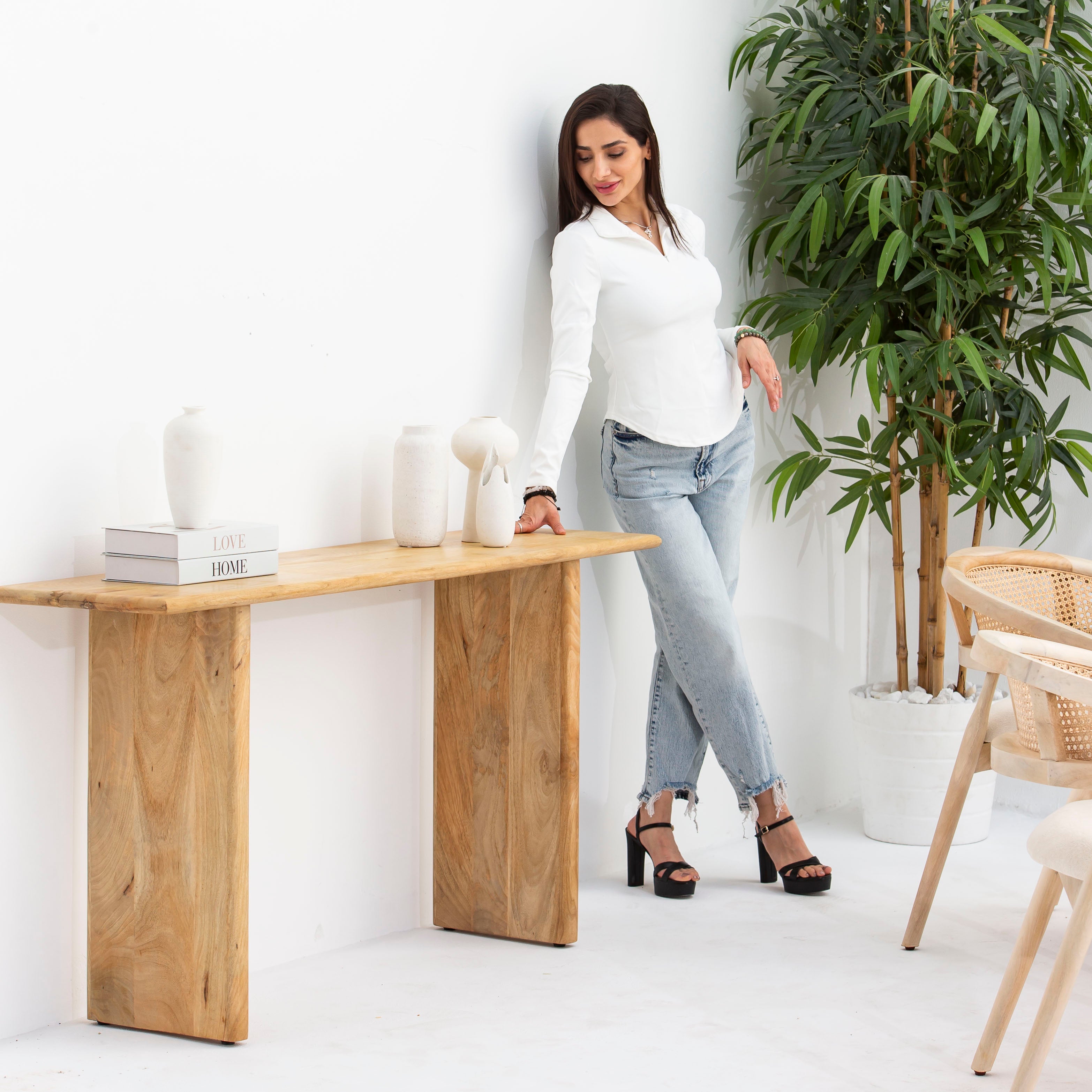 تجمع طاولة الكونسول الخشبية ذات التشطيب البسيط من AUREVO بين الأناقة البسيطة والتصميم العملي. صُنعت هذه الطاولة من خشب عالي الجودة بلون طبيعي، وتتميز بمظهر أنيق وبسيط يُناسب الديكورات الداخلية العصرية والكلاسيكية على حد سواء. يُبرز تشطيبها البسيط جمال حبيبات الخشب الطبيعية ودفئه، مما يجعلها إضافة مثالية للمداخل وغرف المعيشة والممرات. يضمن هيكلها المتين أداءً موثوقًا، بينما يسمح تصميمها البسيط باستخدامها كسطح عرض أو مساحة عمل أو قطعة ديكور مميزة. إنها الخيار الأمثل لمن يبحثون عن أثاث خالد يُعطي الأولوية للجودة على الزخرفة.