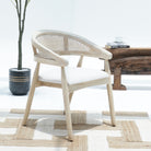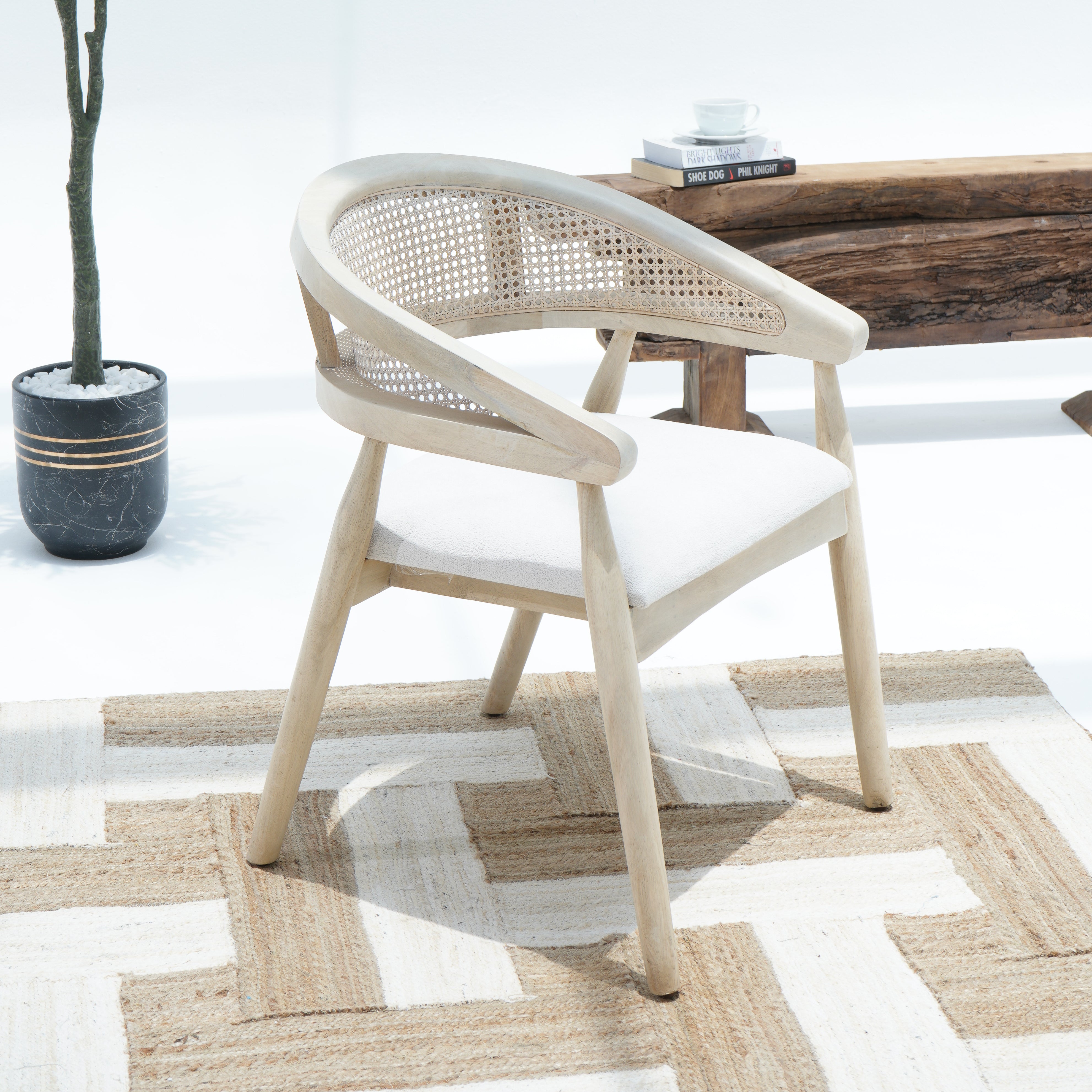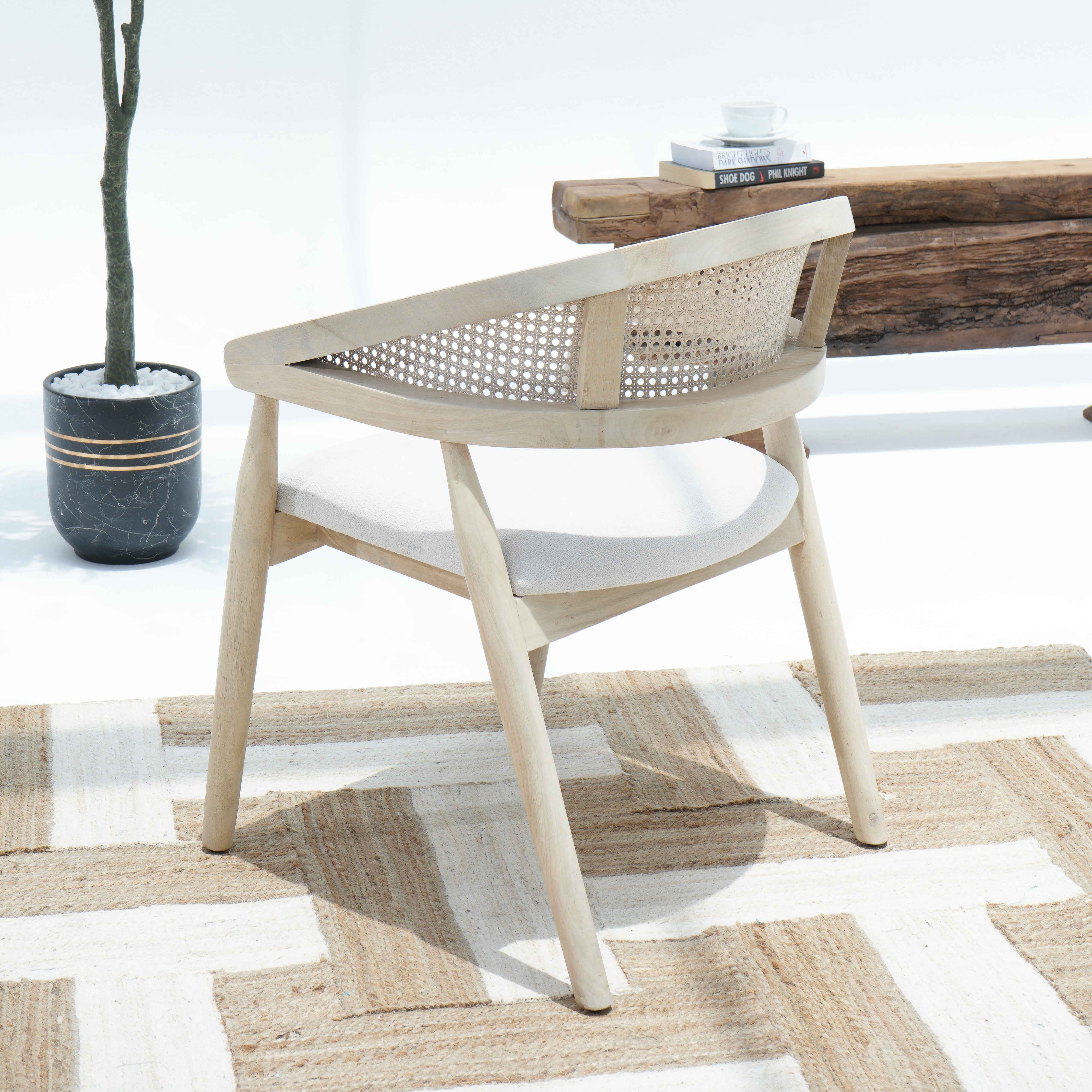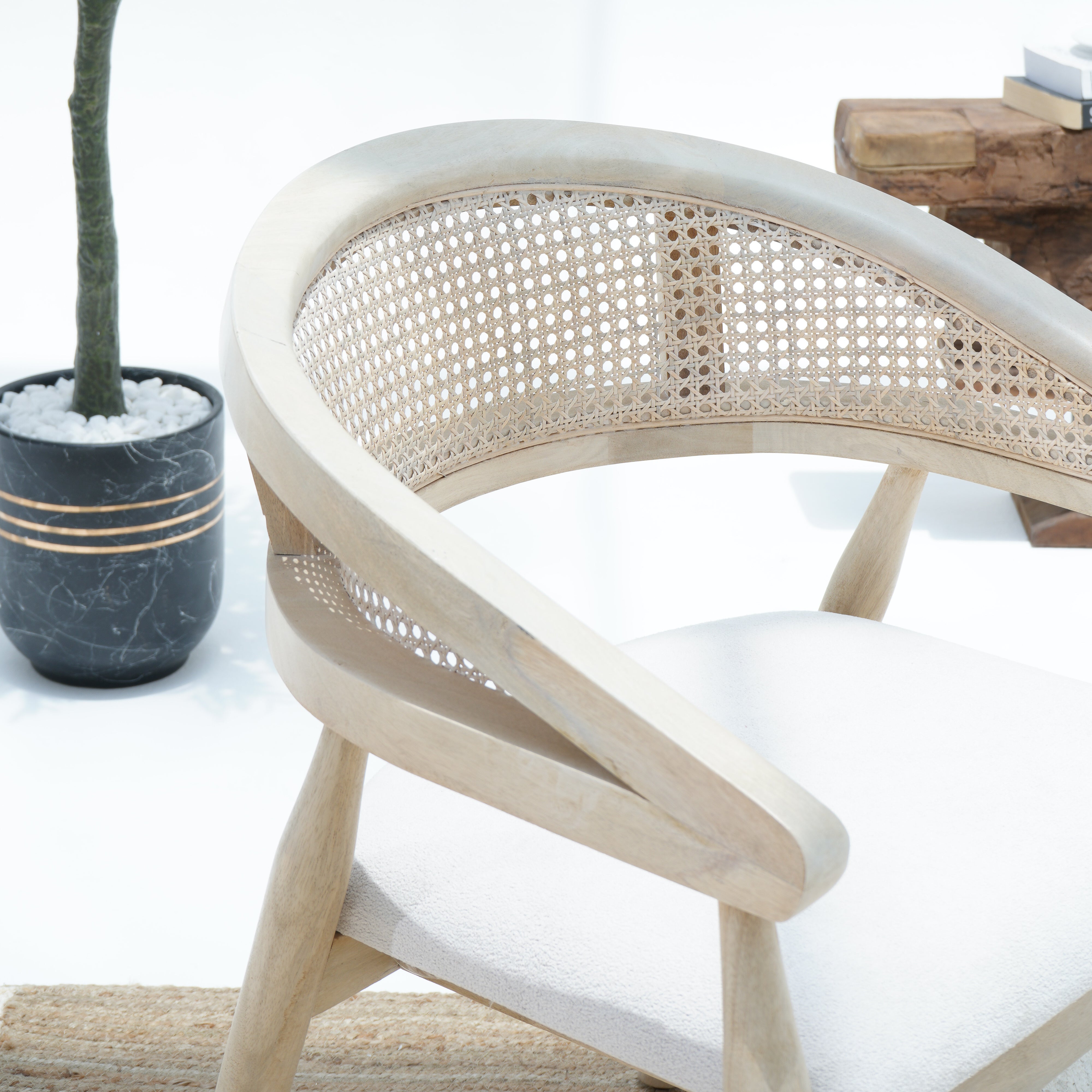 كرسي قصب أنيق من الروطان: يتميز هذا الكرسي بإطار خشبي مصنوع يدويًا بتفاصيل أنيقة من الروطان، ويبلغ عرض مقعده 48 سم وارتفاعه 45 سم. يجمع بين سحر التصميم الكلاسيكي والراحة، وهو مصنوع في الهند ومضمون بضمان لمدة عام.
