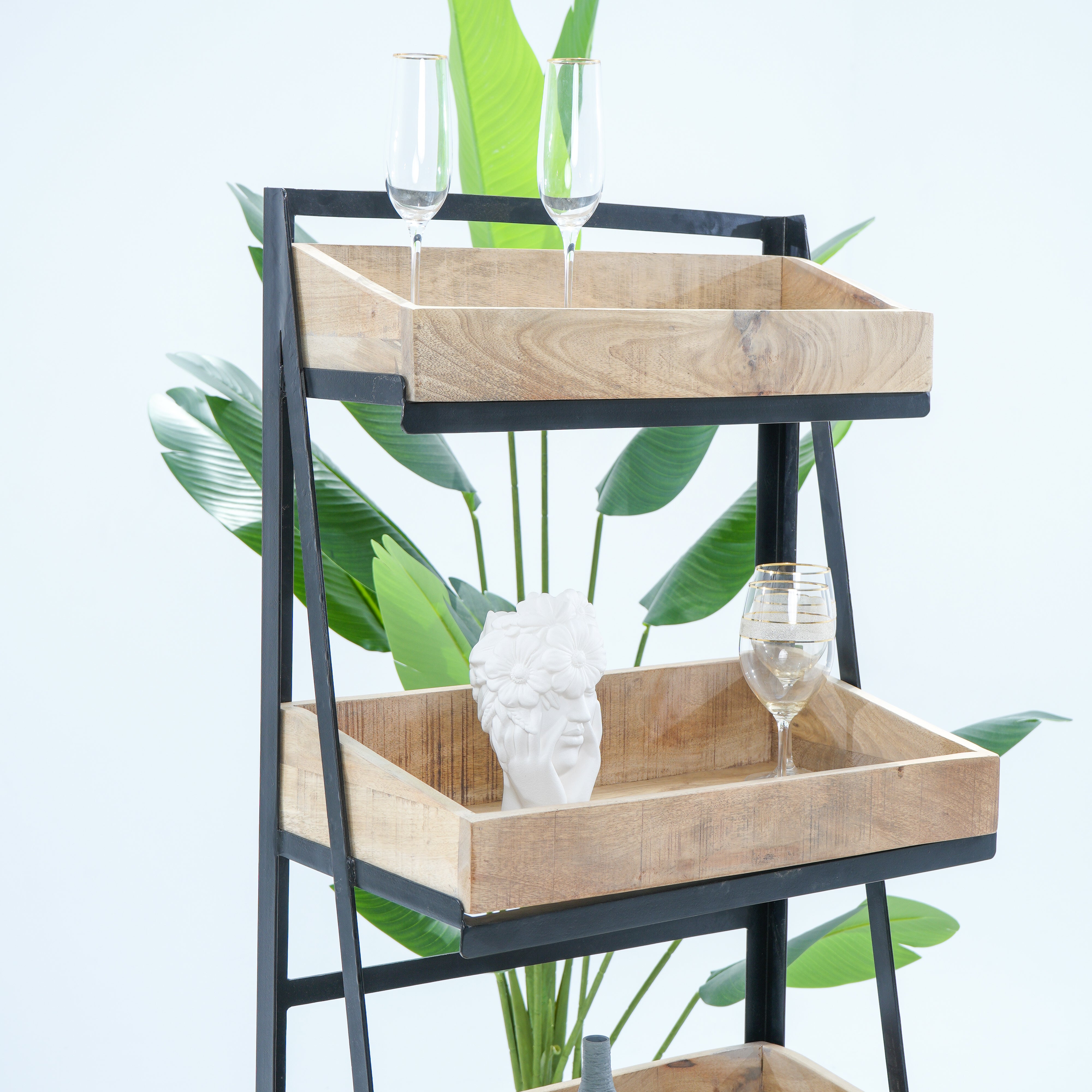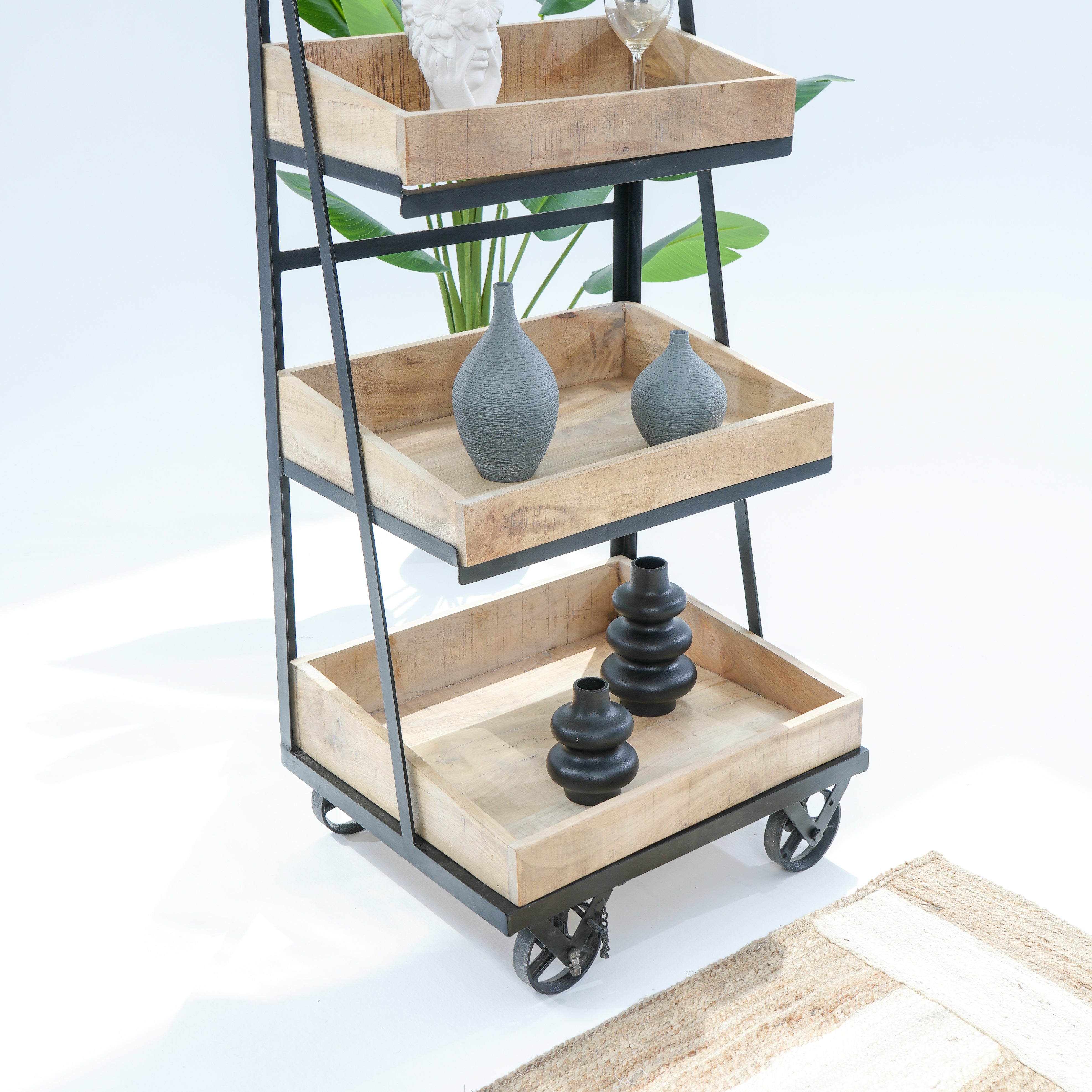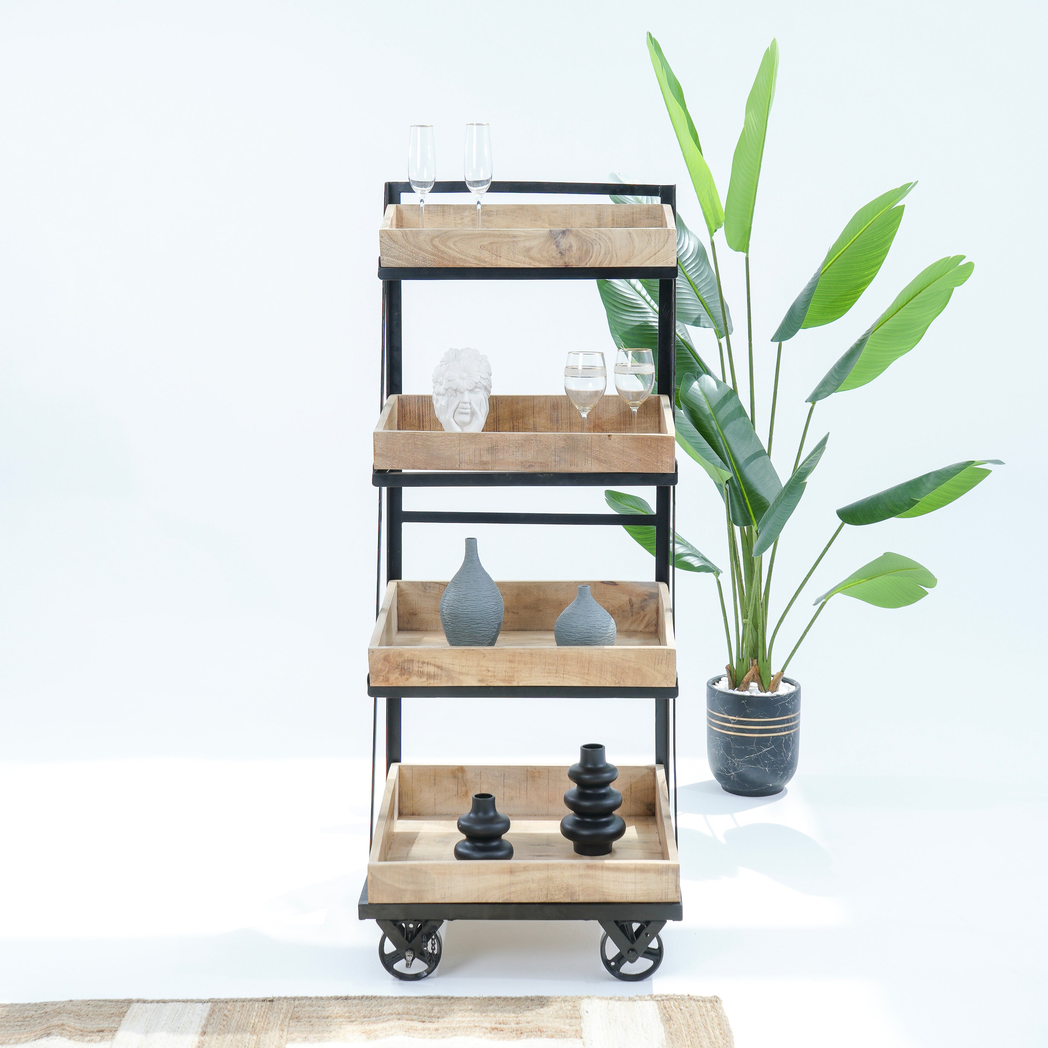 Handcrafted with warm mango wood and sturdy iron accents, this kitchen trolley brings rustic elegance to your culinary space. Four generously sized shelves provide ample storage for cookware, ingredients, and kitchen essentials, while the robust metal frame ensures lasting durability. The natural grain of mango wood adds character and warmth to any kitchen aesthetic. Effortlessly mobile on smooth-rolling wheels, this trolley transitions seamlessly from prep station to serving piece, making it an indispensable addition to both traditional and contemporary kitchens.
