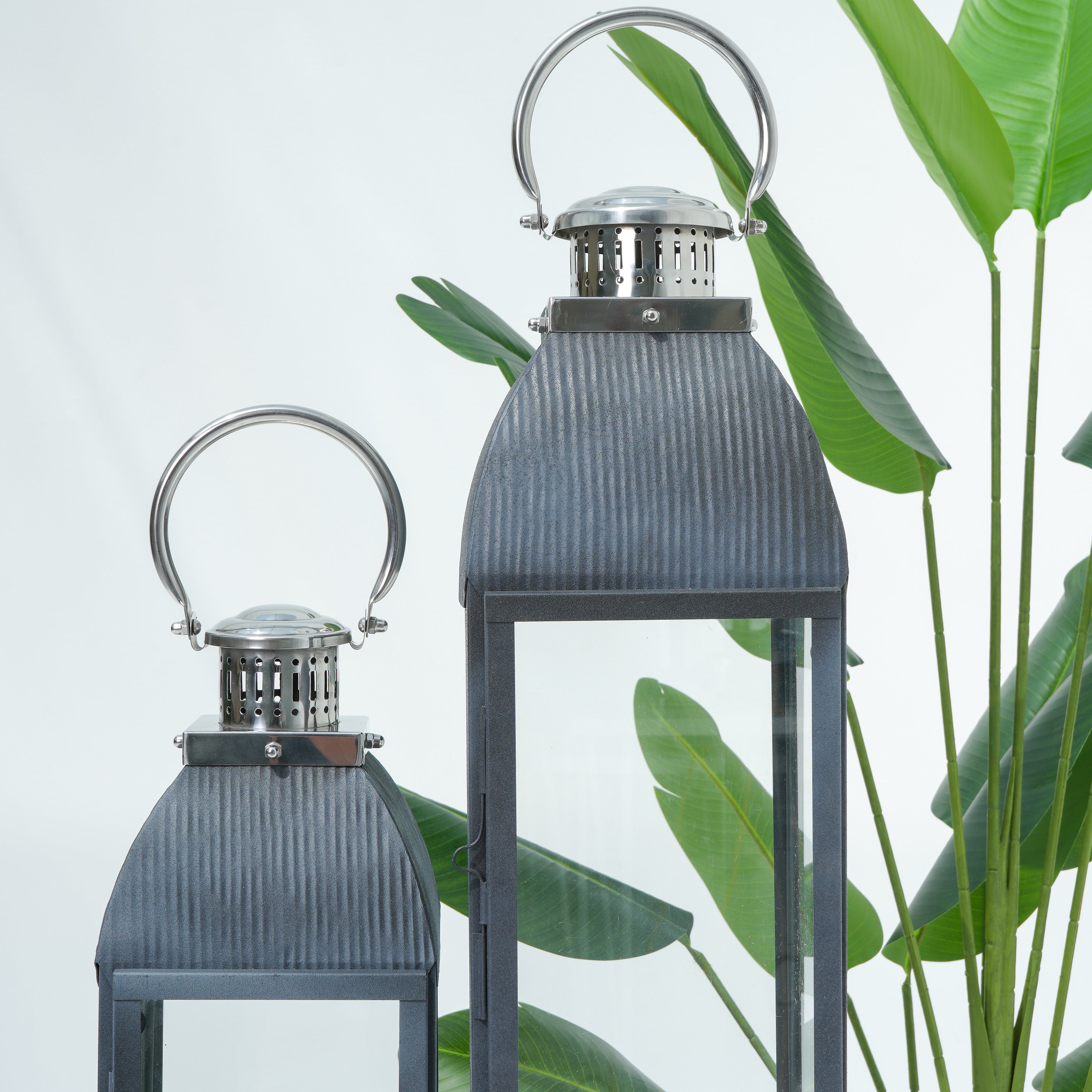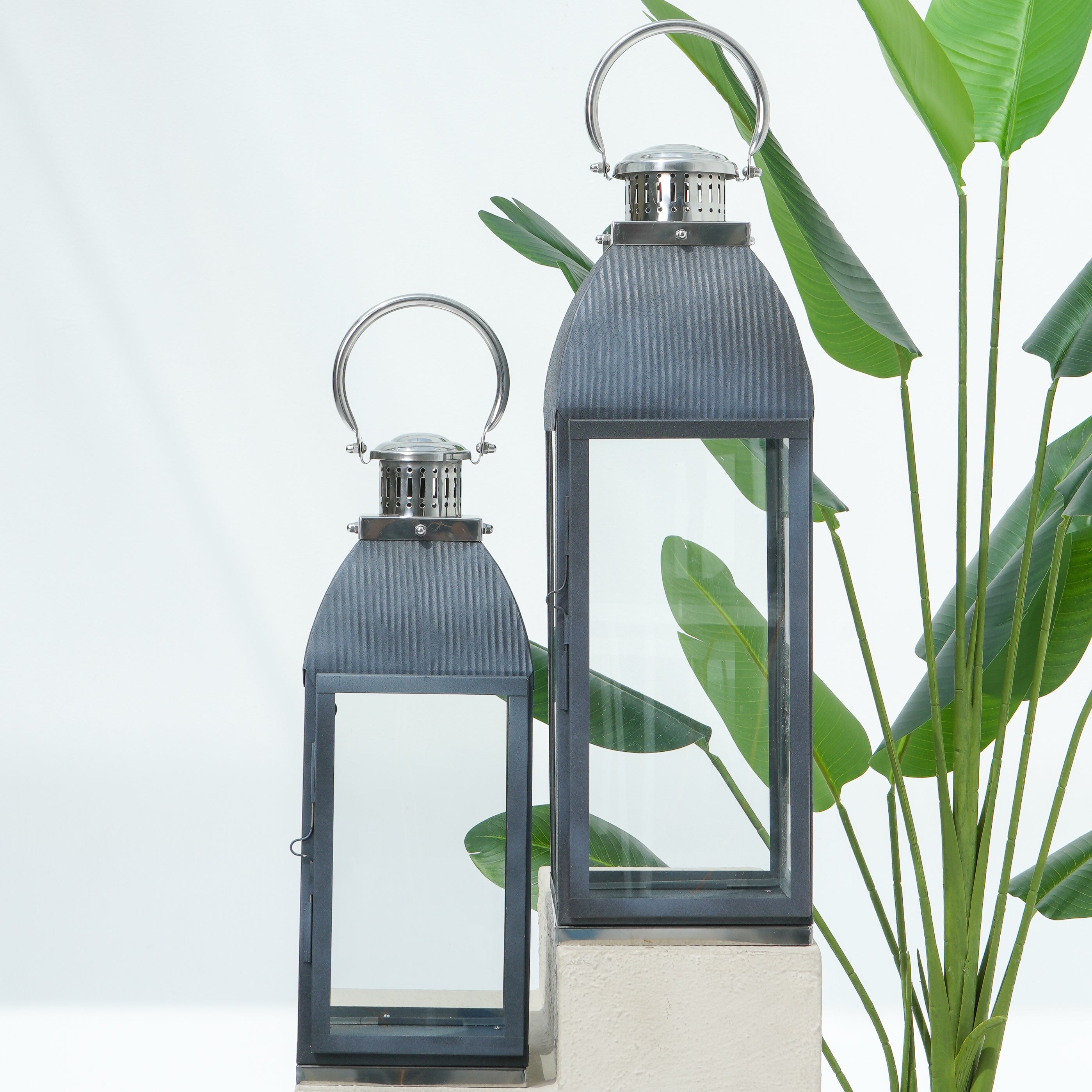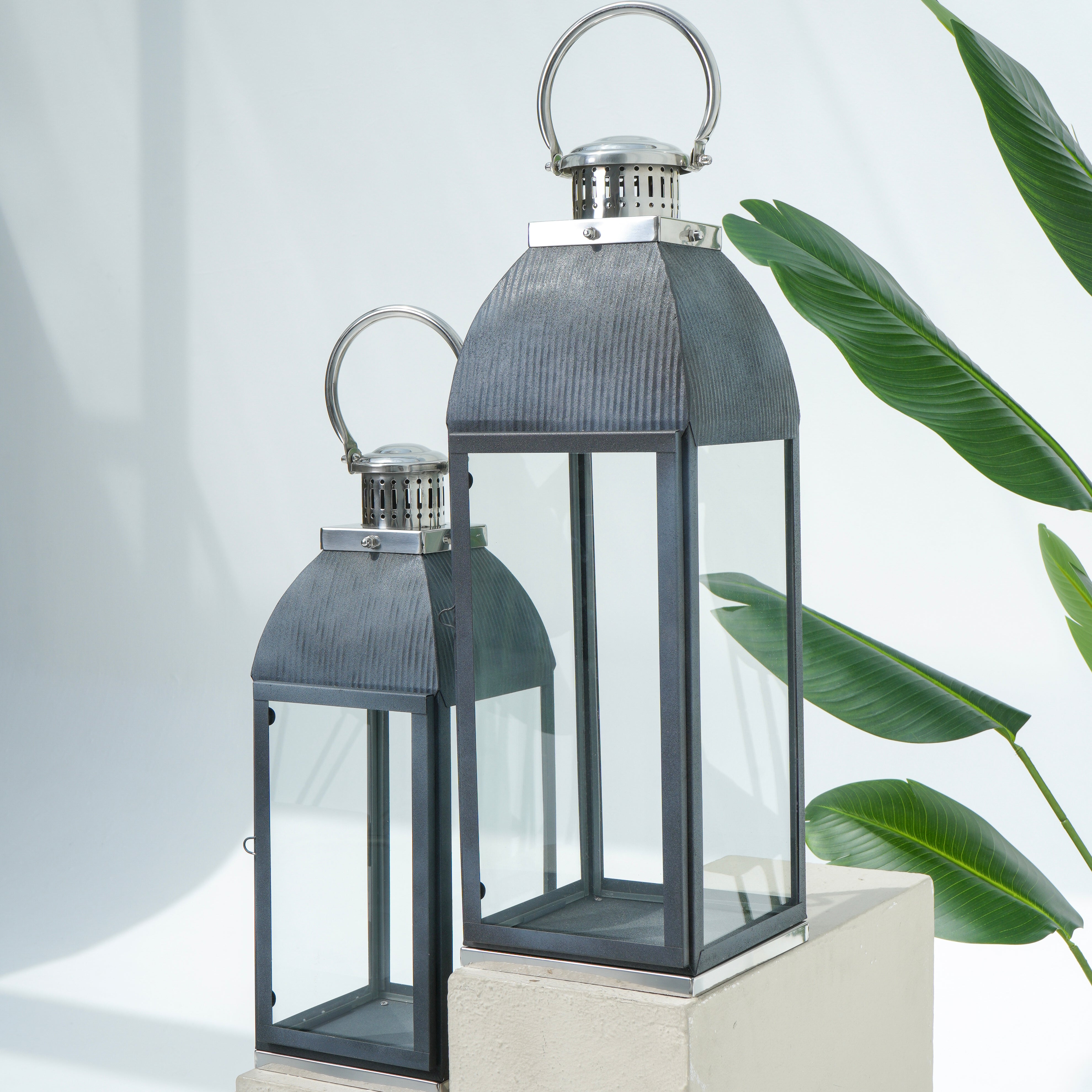 يتميز هذا الفانوس بتصميم عصري أنيق مصنوع من الفولاذ المقاوم للصدأ الأسود اللامع والزجاج، مما يضفي لمسة معاصرة. الأبعاد: 22.86 × 71.12 سم.
