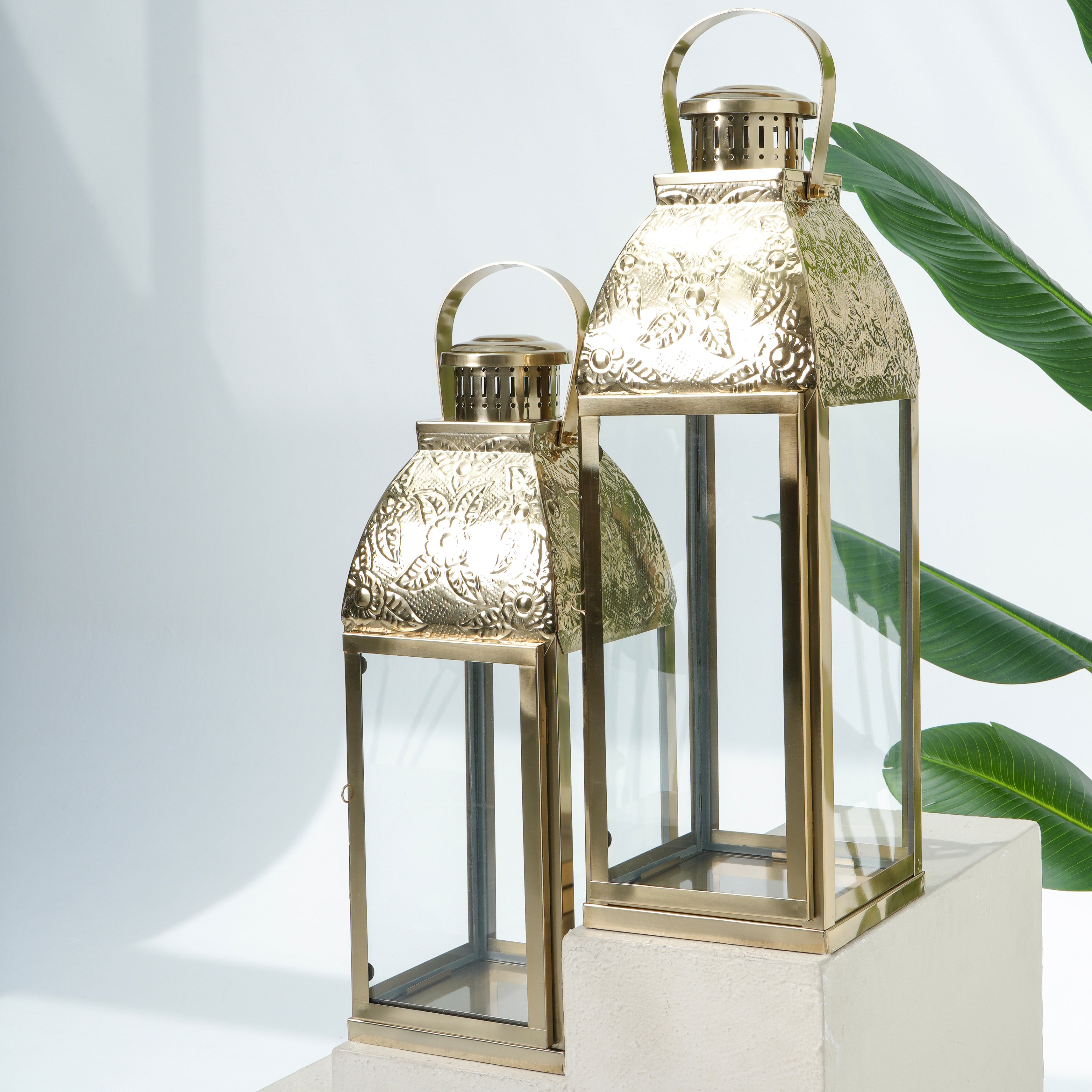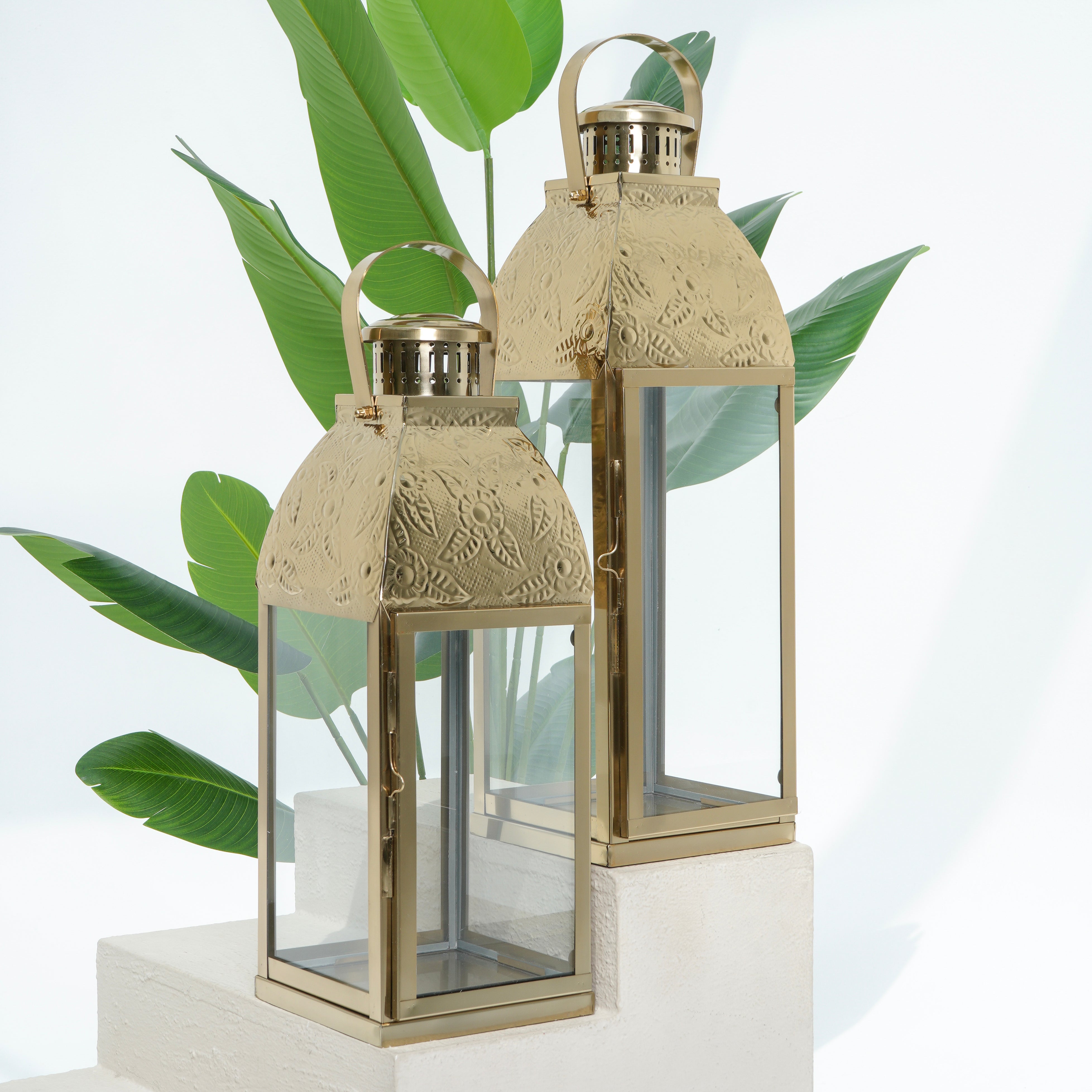 يتميز هذا الفانوس بتصميم فاخر من الفولاذ المقاوم للصدأ الذهبي والزجاج، مما يخلق توهجًا جذابًا. الأبعاد: 21.59 × 68.58 سم.