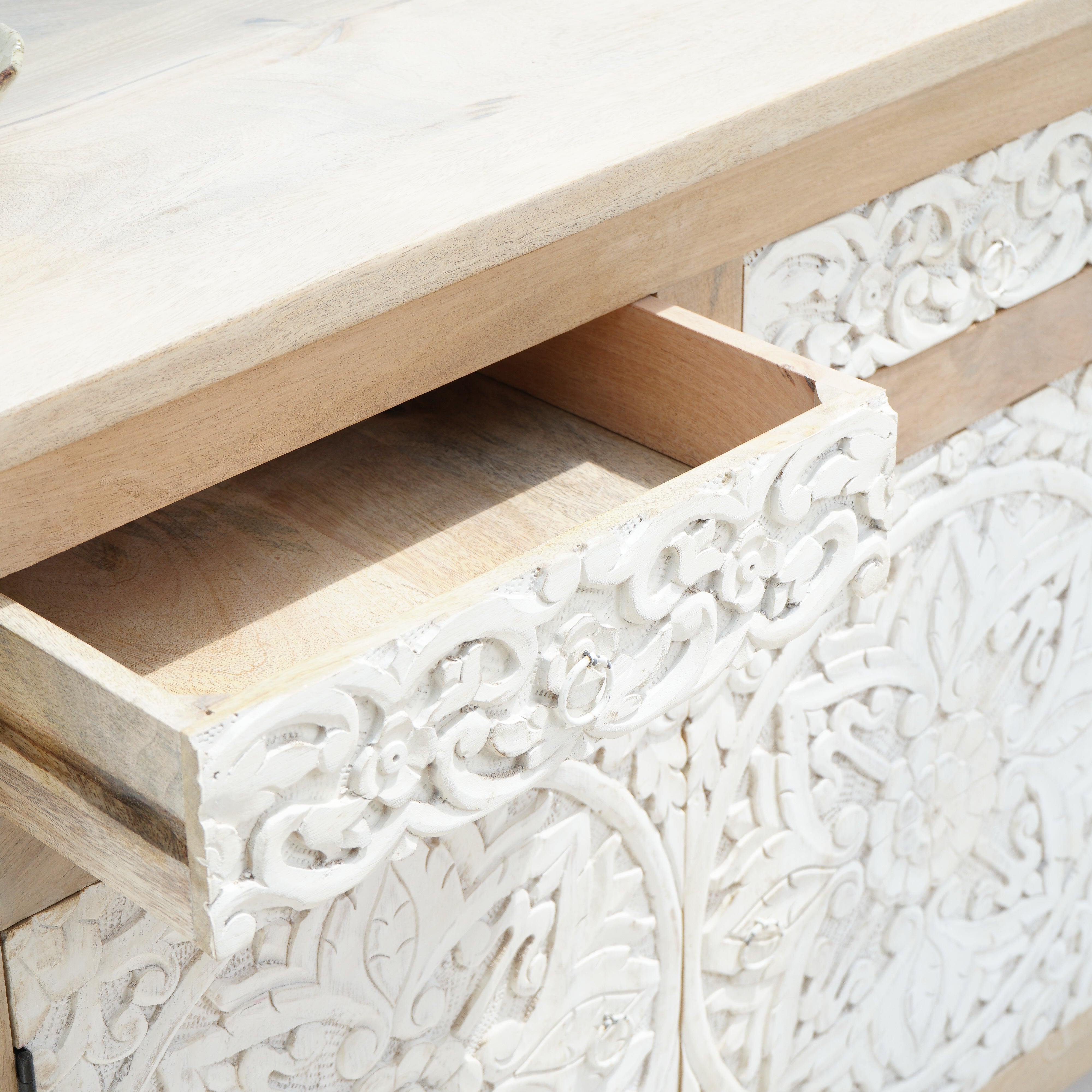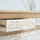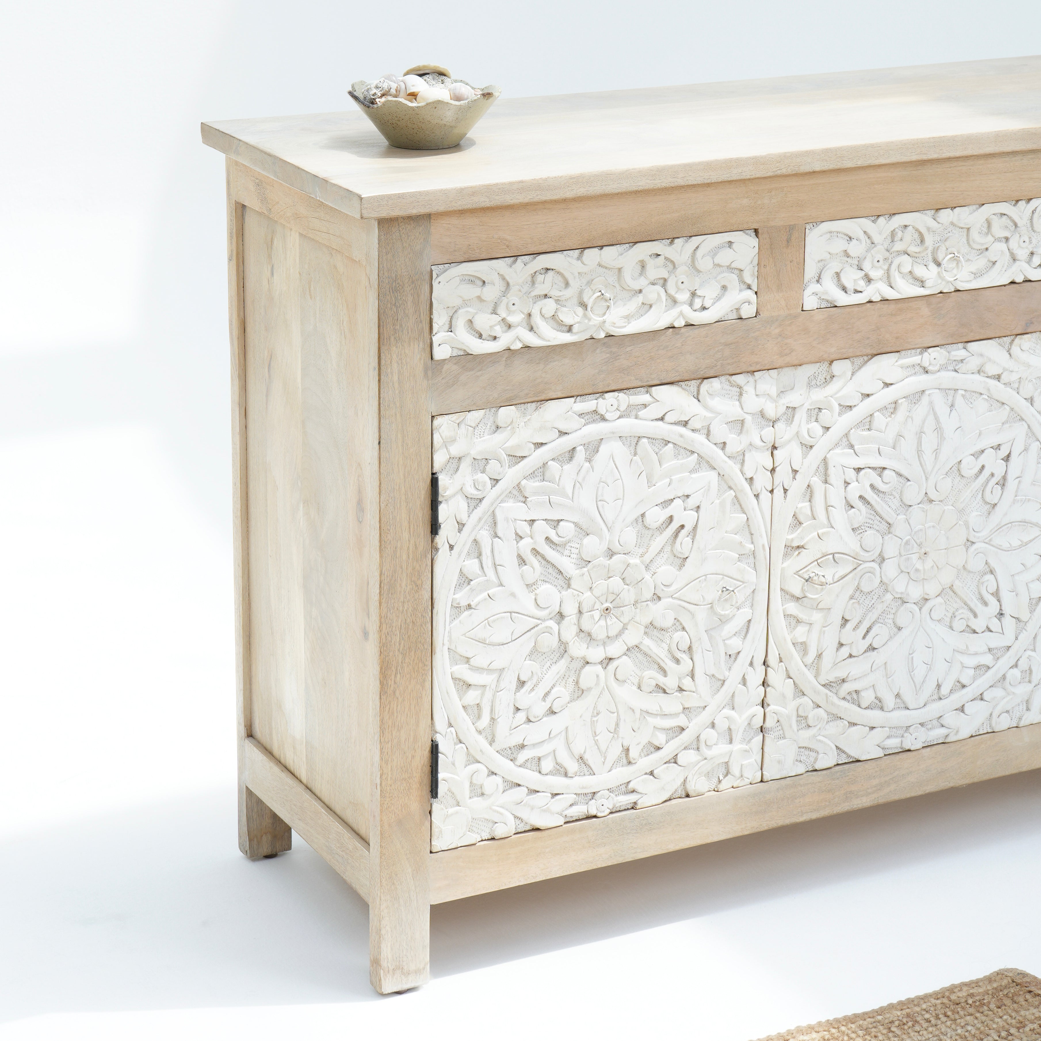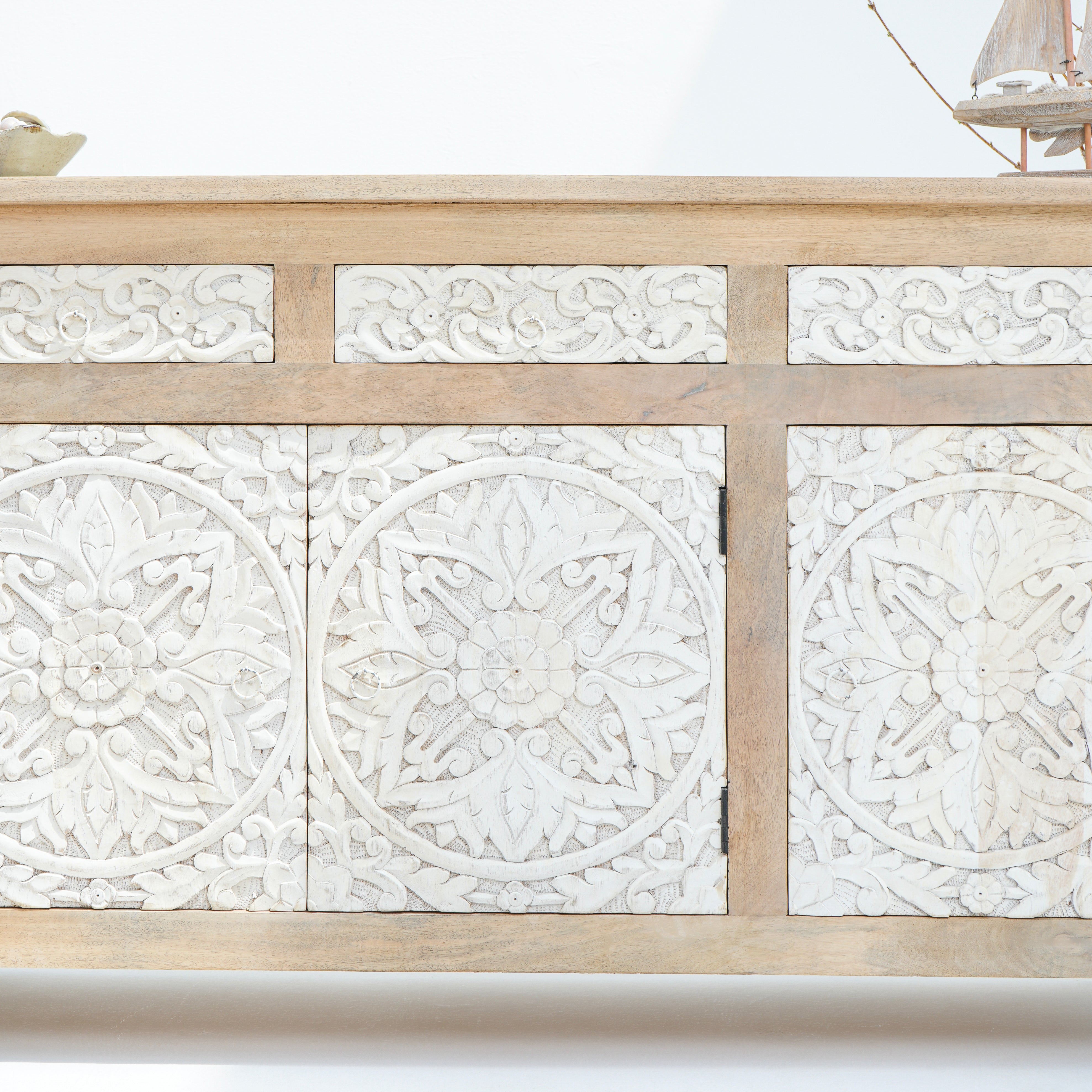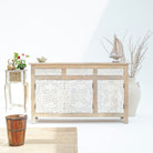 خزانة دابورا الجانبية بثلاثة أبواب وثلاثة أدراج مصنوعة من الخشب الصلب، لتُبرز جماله الطبيعي وطابعه الفريد بفضل تفاصيلها المصنوعة يدويًا. يضمن هيكلها المتين عمرًا طويلًا، بينما توفر الأبواب الثلاثة والأدراج الثلاثة مساحة تخزين واسعة لتنظيم أغراضك الأساسية. تجمع هذه الخزانة بين العملية والحرفية اليدوية، مما يجعلها إضافة راقية لأي غرفة معيشة أو طعام.