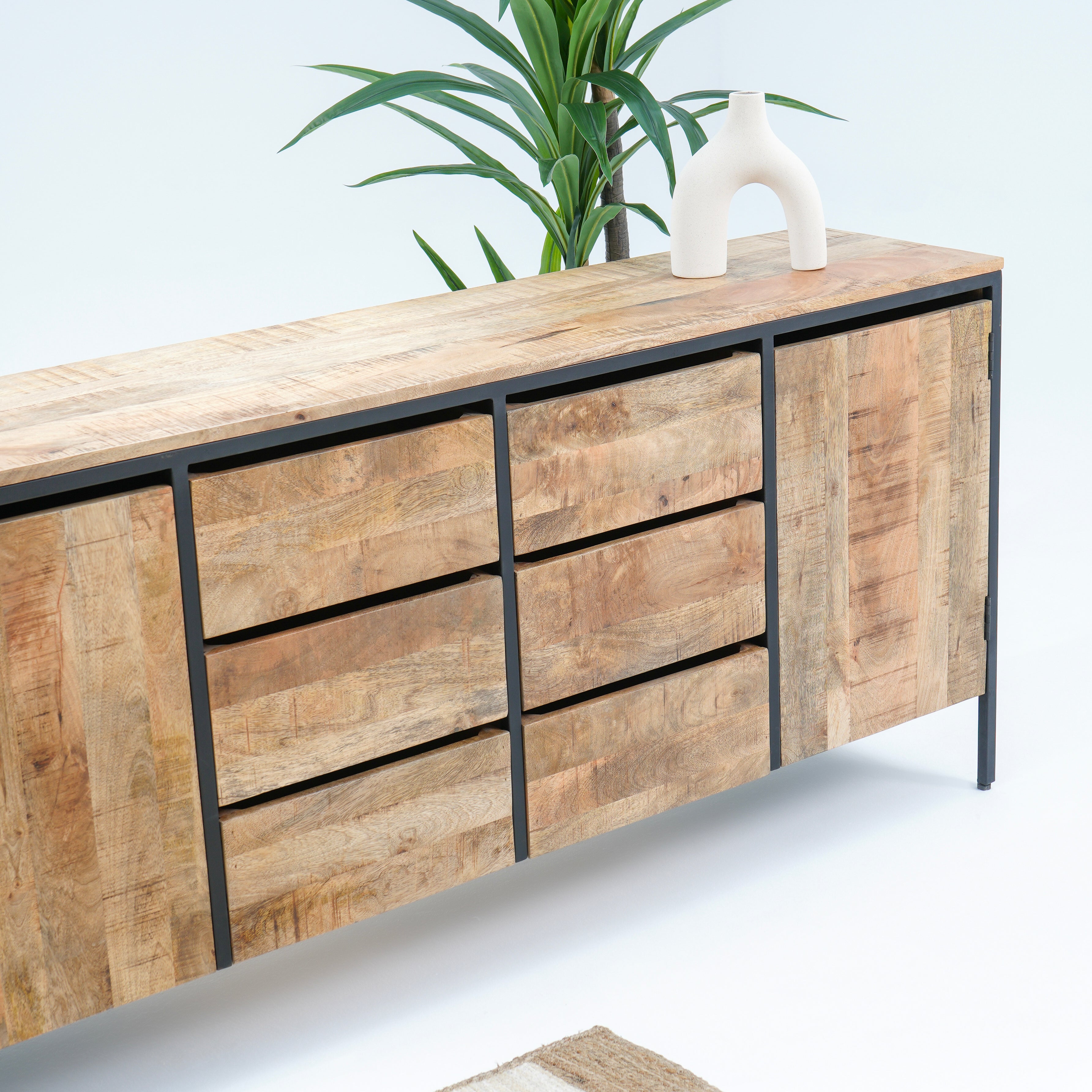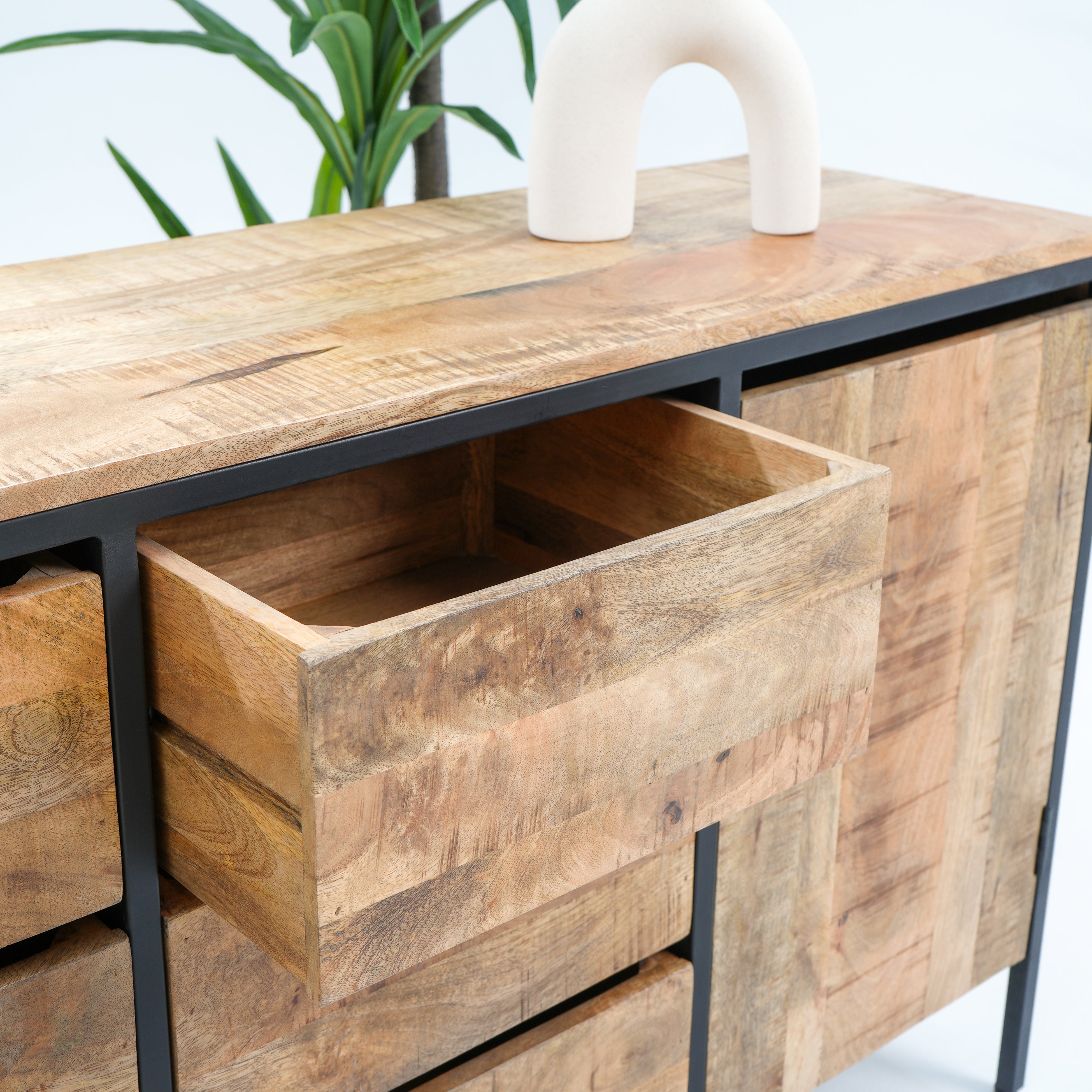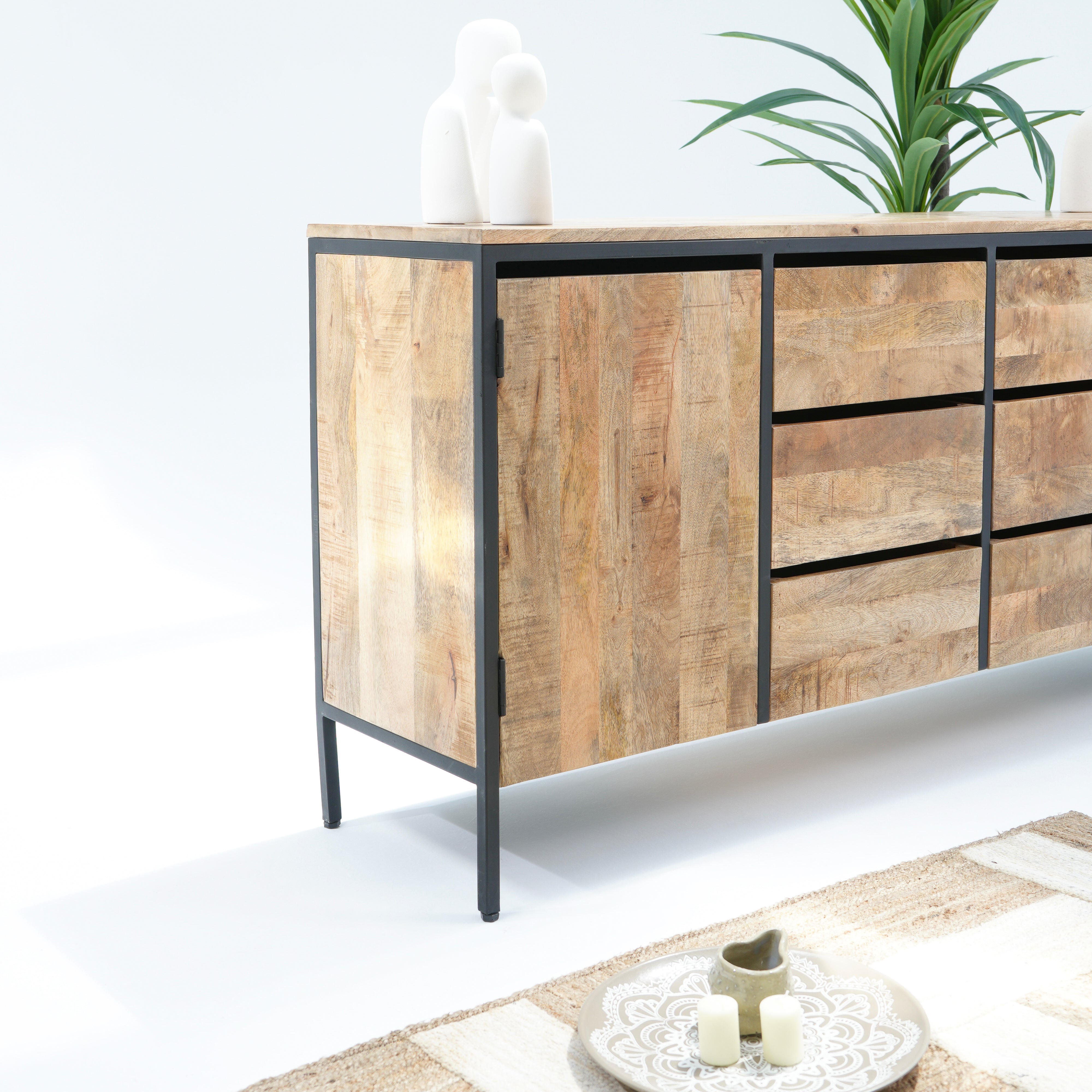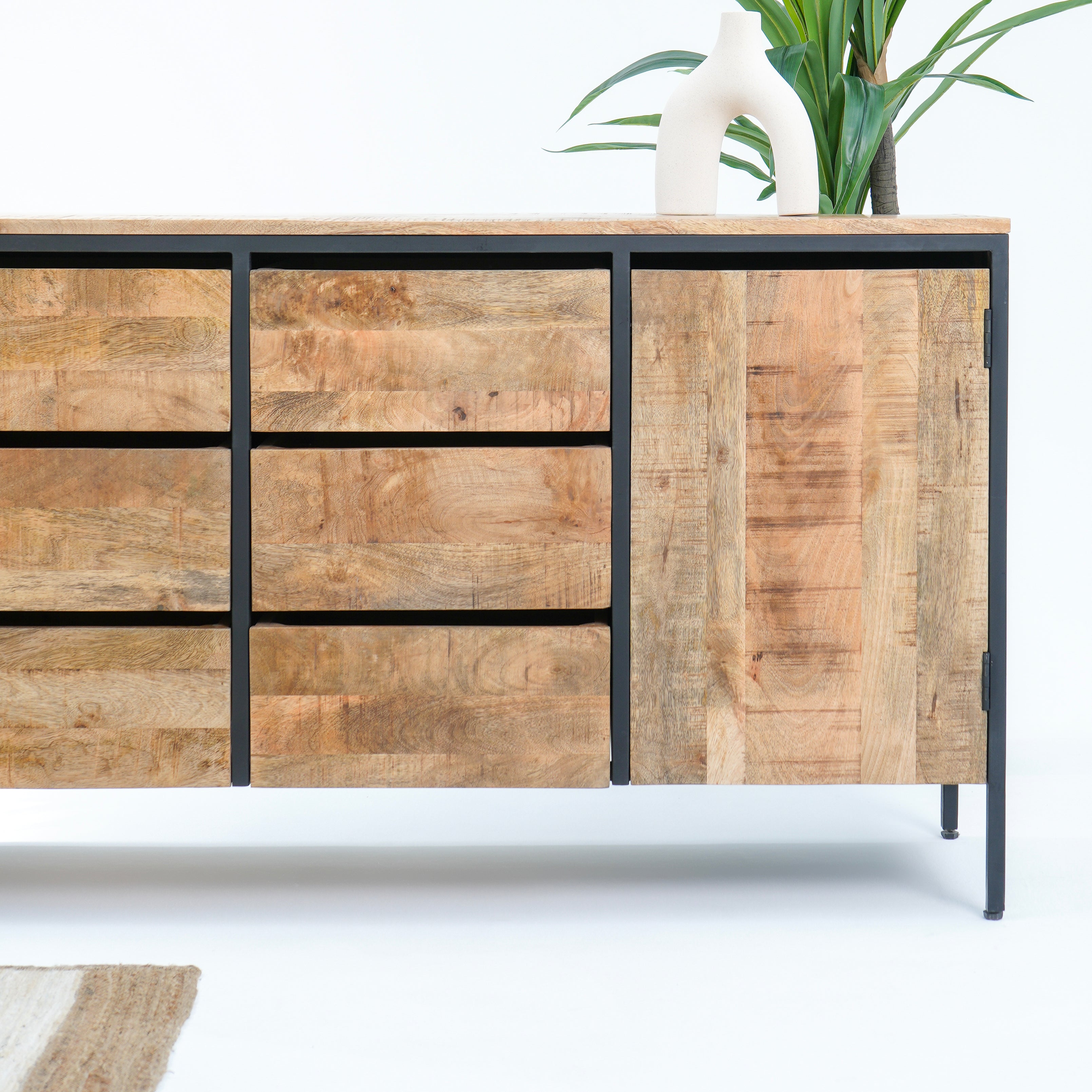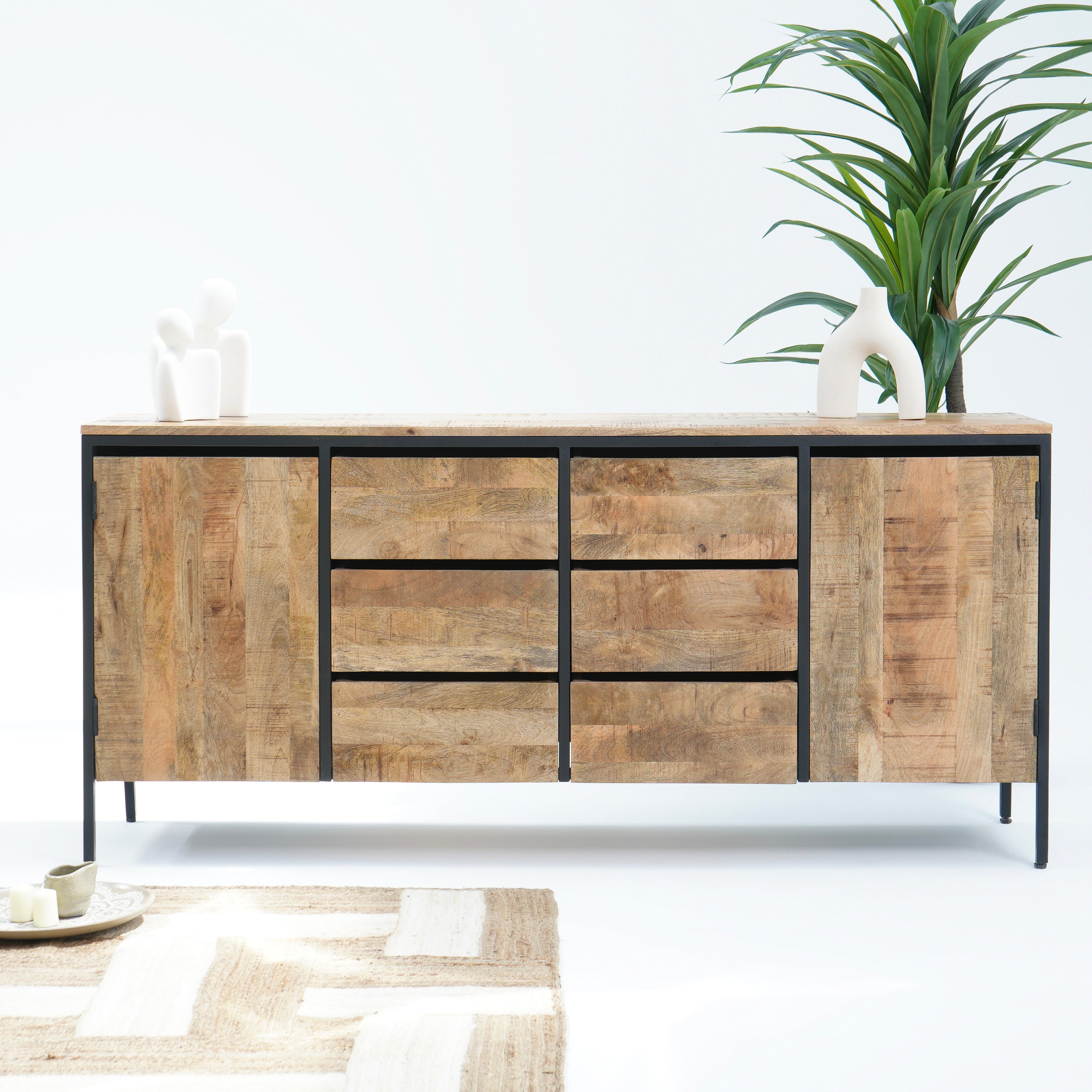 تتميز خزانة ستيلوود الجانبية ذات الطابع الصناعي بستة أدراج واسعة وبابين متينين، مما يوفر مساحة تخزين وفيرة لغرفة المعيشة أو غرفة الطعام. صُنعت من مواد متينة، وتجمع بين العملية والتصميم الصناعي الأنيق للمساعدة في الحفاظ على تنظيم مساحتك وإضفاء لمسة جمالية عليها. مثالية لتخزين الأغراض الأساسية مع تعزيز جمالية منزلك.