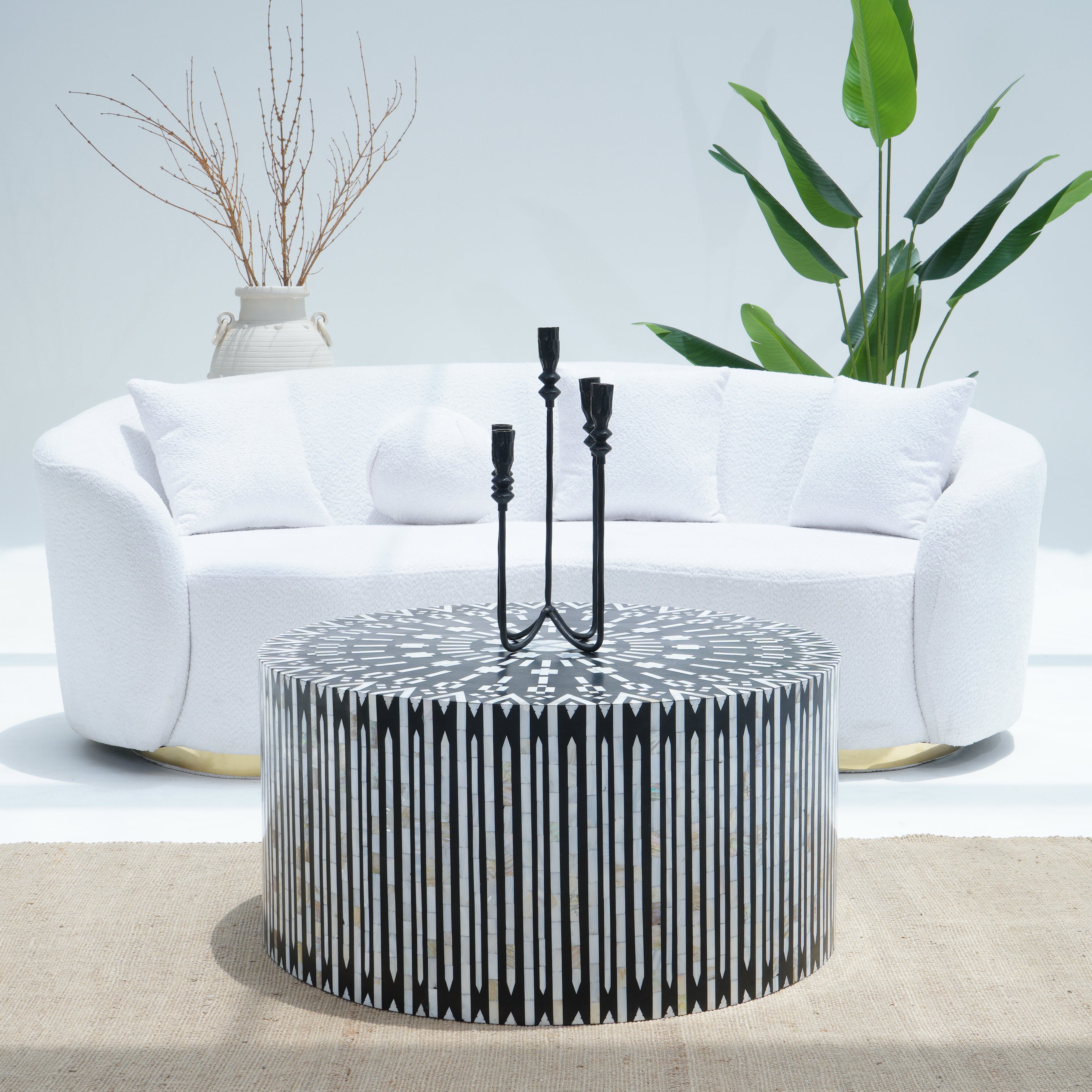 طاولة القهوة المستديرة البيضاء المصنوعة من عرق اللؤلؤ تُضفي لمسة أنيقة وعملية على أي مساحة. صُنعت في الهند، وتأتي مع ضمان لمدة عام كامل لضمان راحتكم.