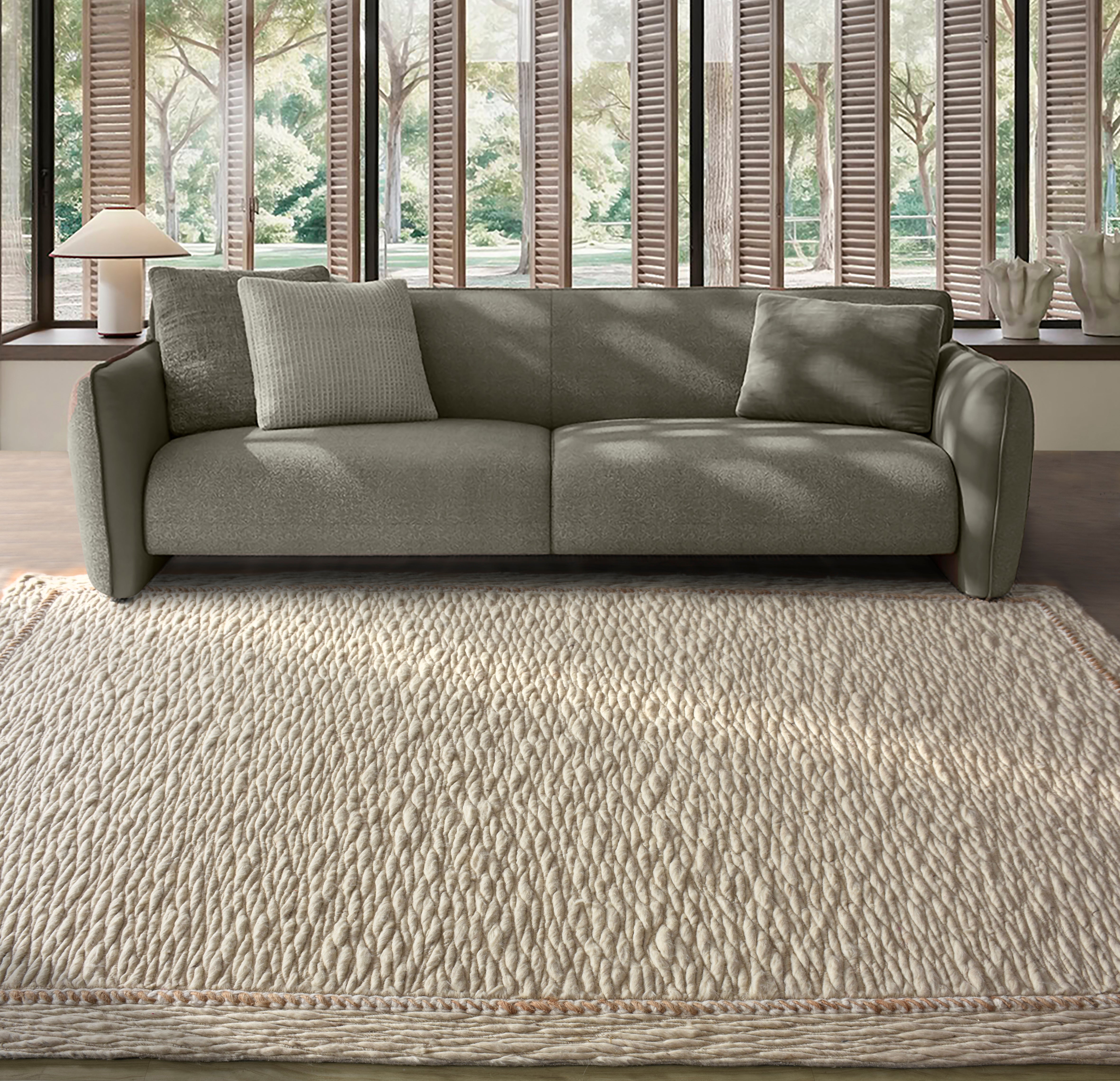 Crafted with meticulous attention to detail, this handmade carpet blends premium wool and natural jute fibers to create a textured, durable floor covering. The combination of materials offers warmth underfoot while the jute adds earthy character and longevity. Perfect for living spaces, bedrooms, or entryways, this artisanal piece brings authentic craftsmanship and organic beauty to any room. Each carpet is uniquely made, ensuring no two pieces are identical.