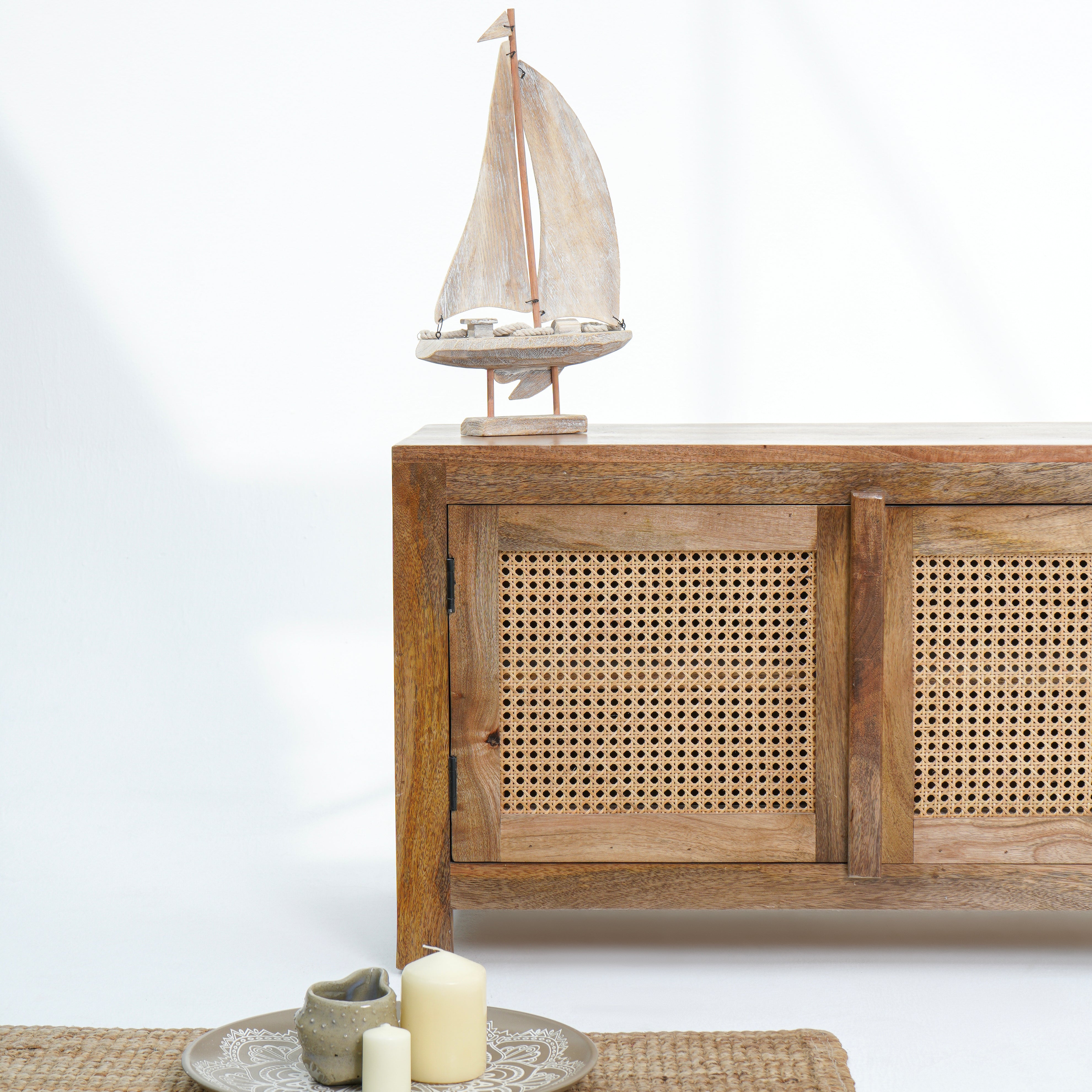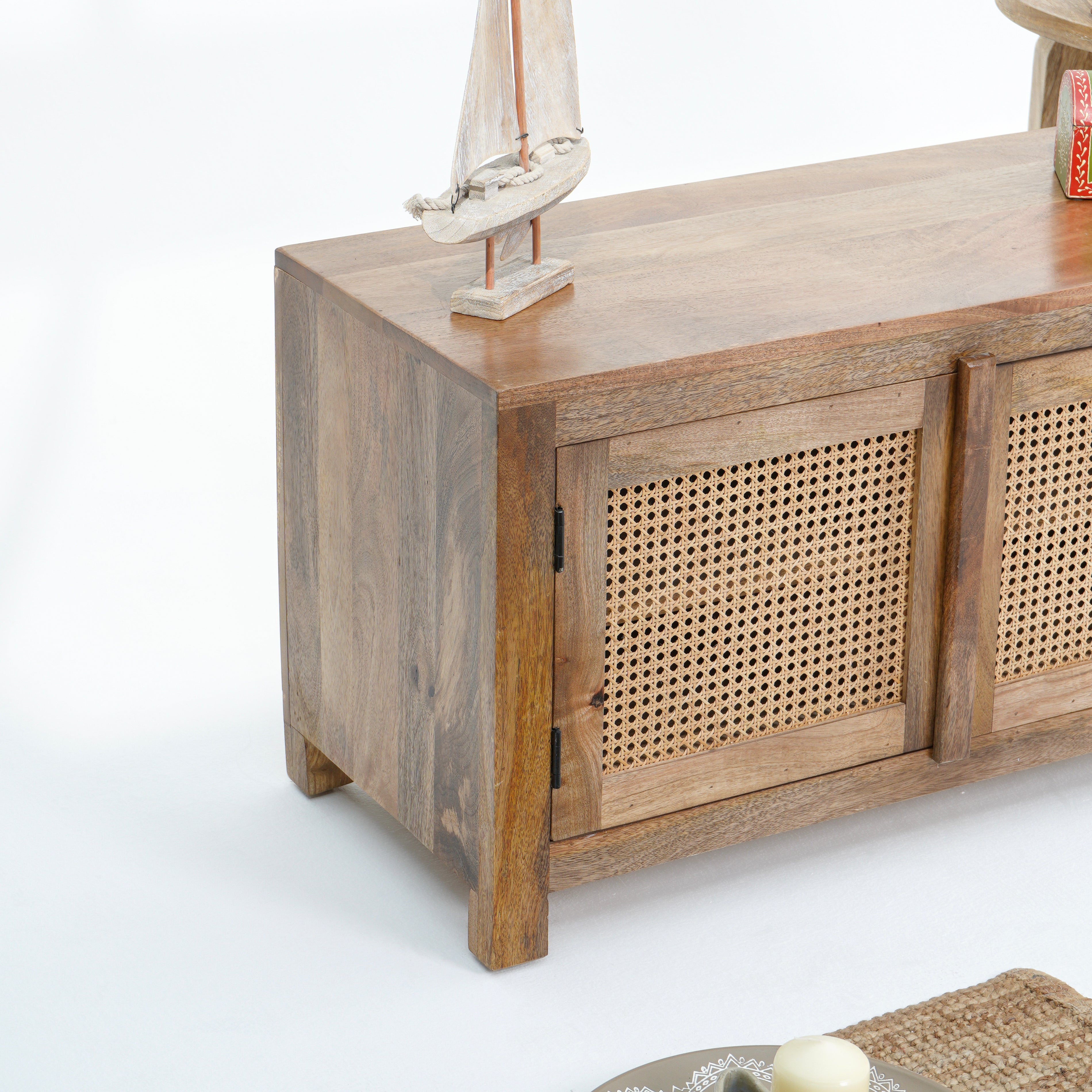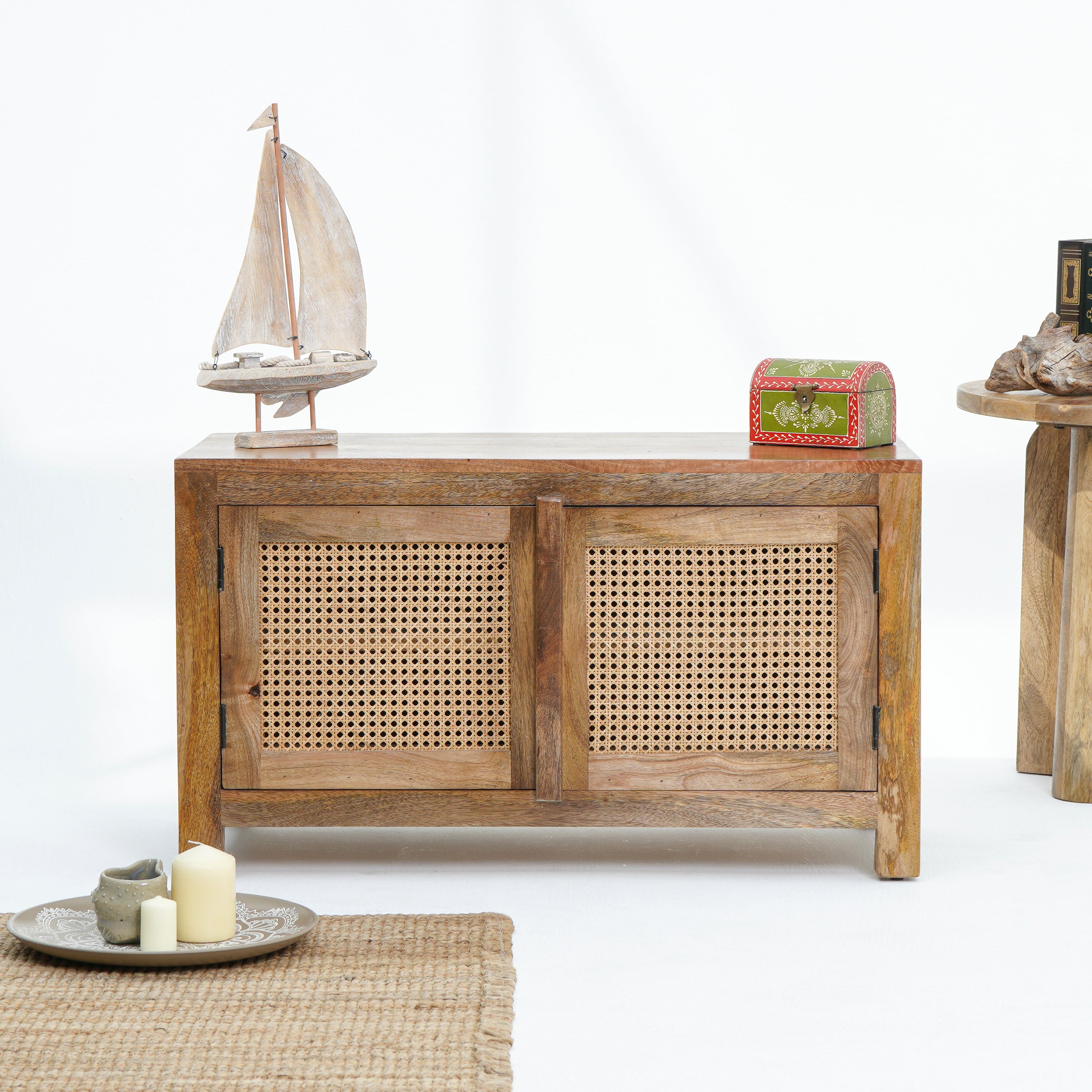Handcrafted with natural cane detailing, this two-door shoe rack brings warmth and organic elegance to your entryway. Each piece showcases traditional craftsmanship, featuring sturdy construction paired with the timeless appeal of woven cane panels. The dual-door design provides ample storage while maintaining a light, airy aesthetic that complements both modern and classic interiors. Perfect for organizing footwear while adding artisanal character to your home.
