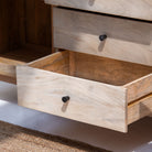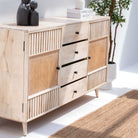 تجمع خزانة كانوفيا الجانبية ذات البابين والأدراج الأربعة المصنوعة من قصب السكر بين الحرفية التقليدية والتصميم العملي. صُنعت هذه القطعة يدويًا في الهند من الخشب الصلب، وتتميز ببابين مزينين بنقوش قصب السكر وأربعة أدراج واسعة، مما يوفر مساحة تخزين وفيرة لأدوات الطعام أو ديكور غرفة المعيشة. يضمن هيكلها المصنوع من الخشب الطبيعي المتانة وطول العمر، بينما تضفي نقوش قصب السكر لمسة جمالية دافئة. تُعد هذه الخزانة إضافة مثالية للمنازل التي تبحث عن أثاث أصيل مصنوع يدويًا يتميز بجاذبية عملية.