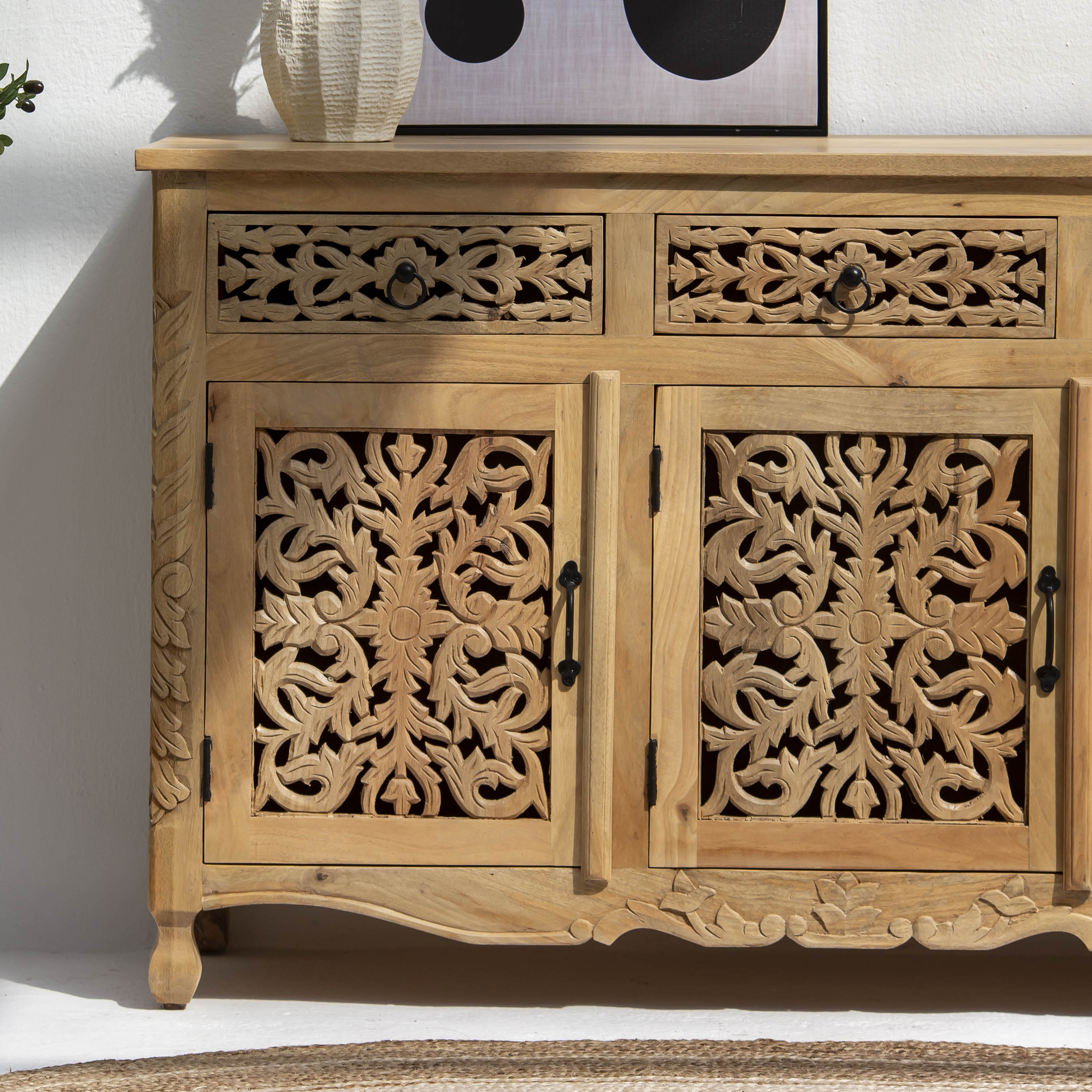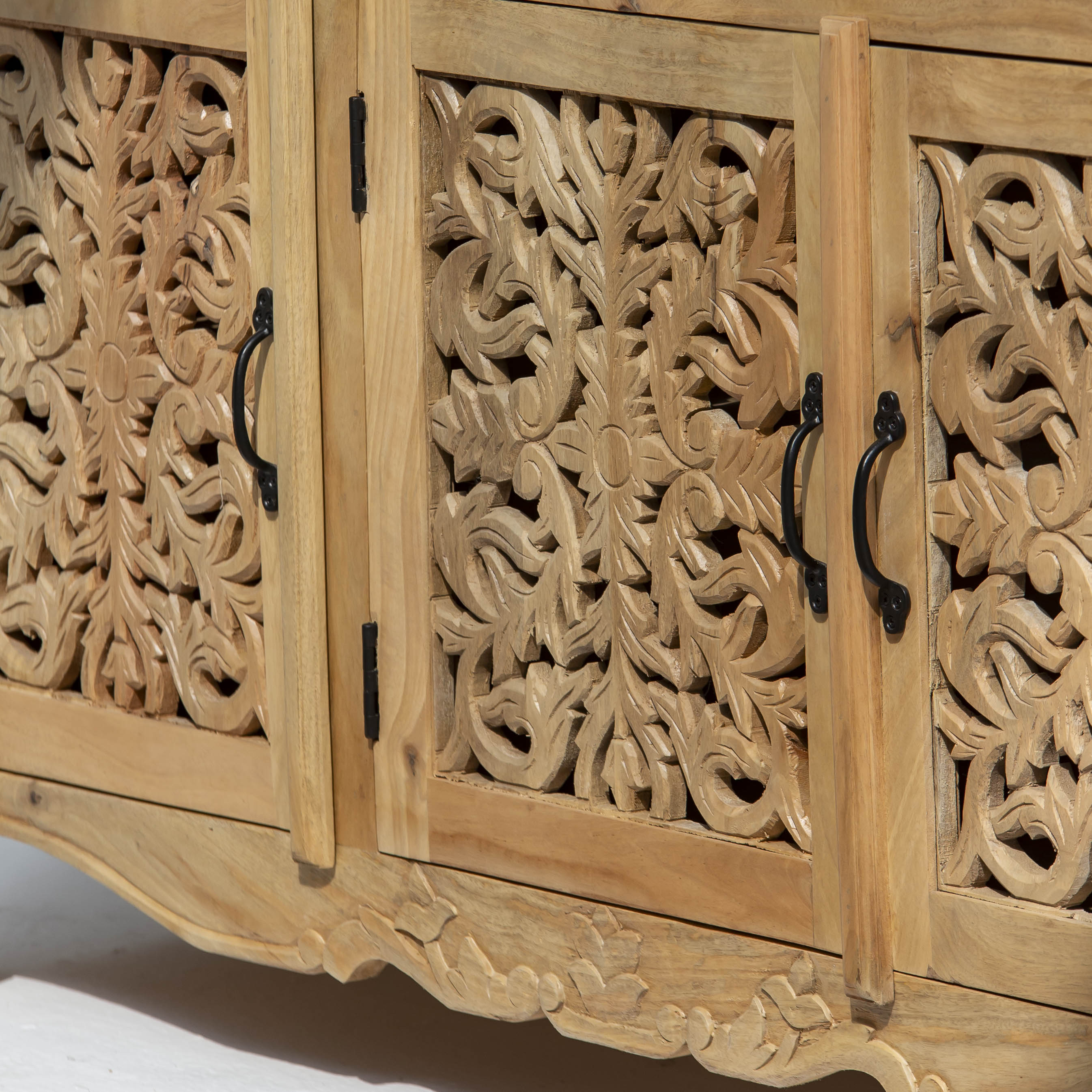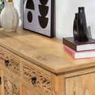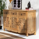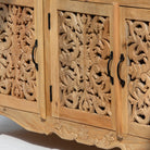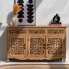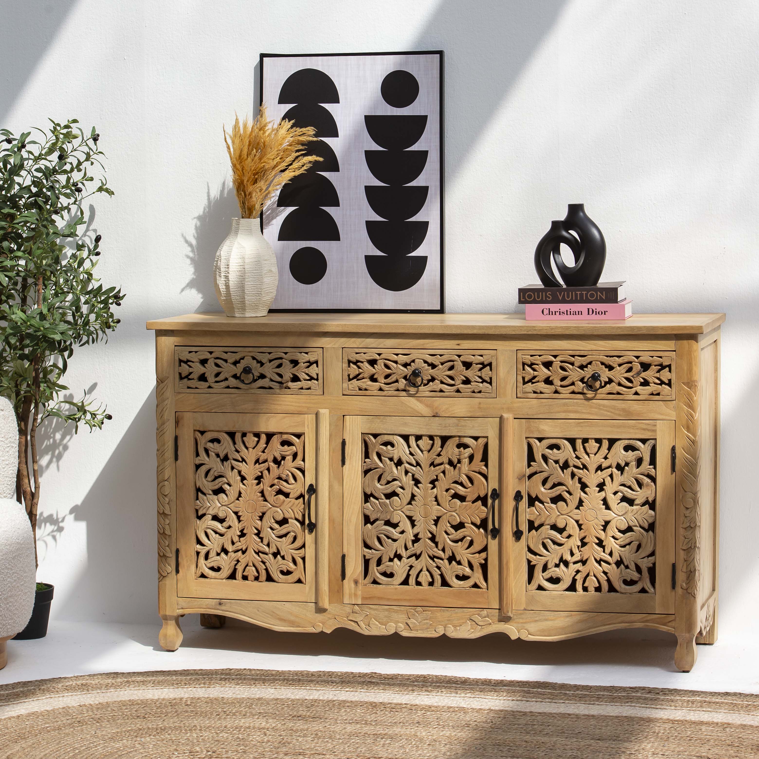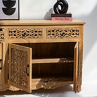 Handcrafted with meticulous attention to detail, this wooden sideboard showcases traditional carving techniques that elevate any dining or living space. Featuring three spacious drawers and three cabinet doors, it offers generous storage for tableware, linens, and décor while maintaining an elegant silhouette. The intricate carved embellishments reflect artisanal craftsmanship, creating a statement piece that blends functionality with timeless aesthetic appeal. Perfect for those who appreciate handmade furniture with character and heritage.