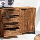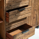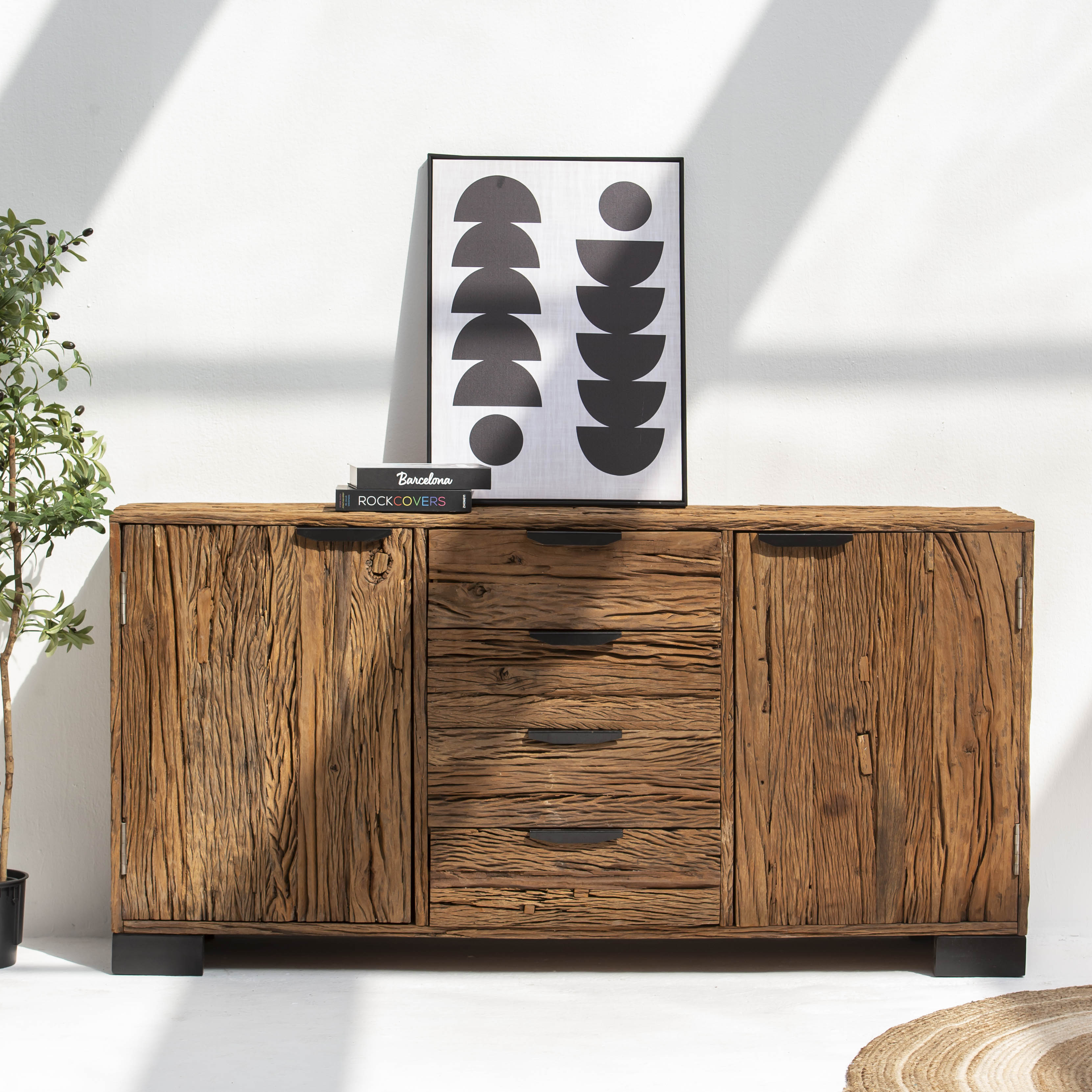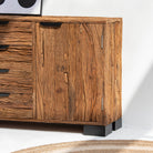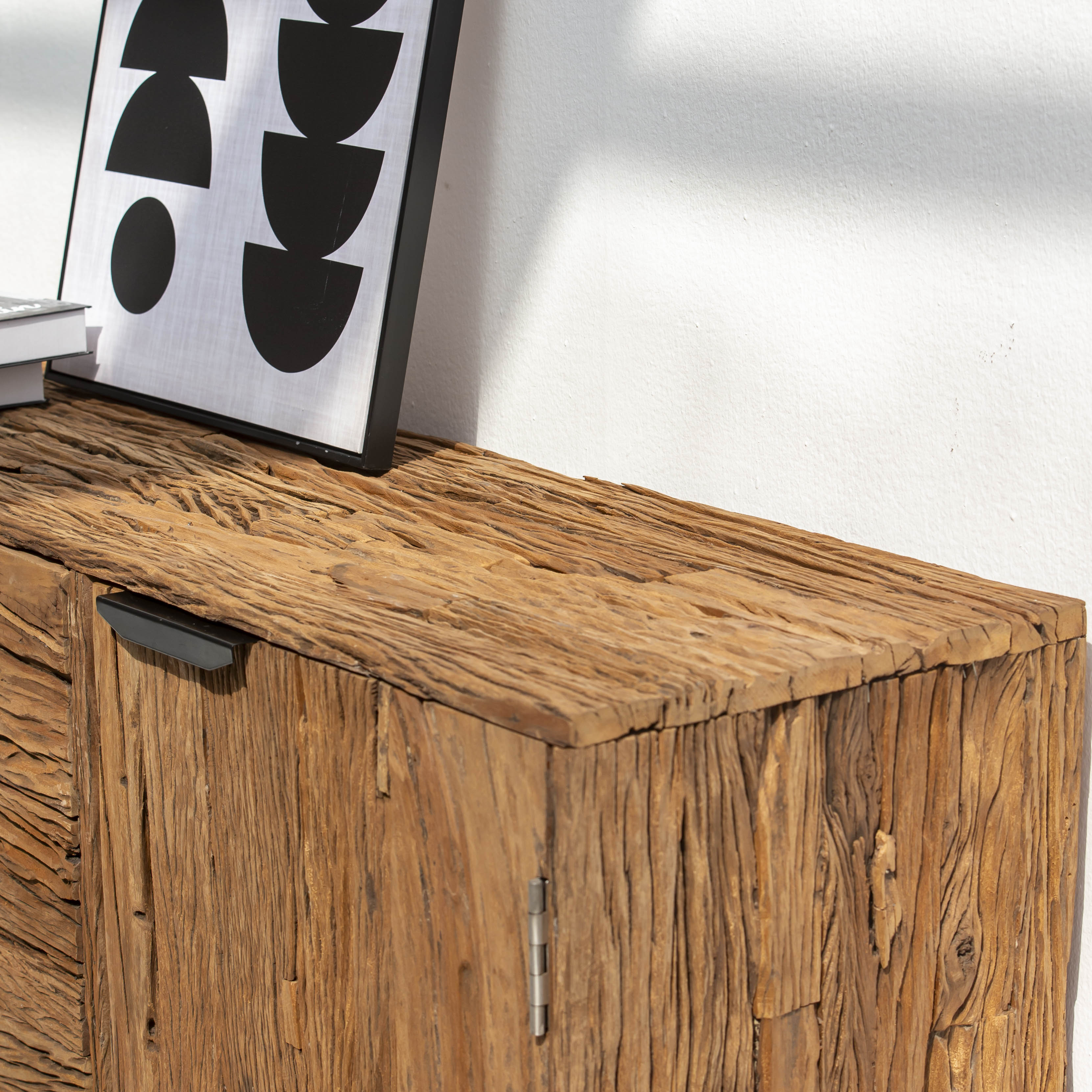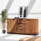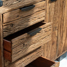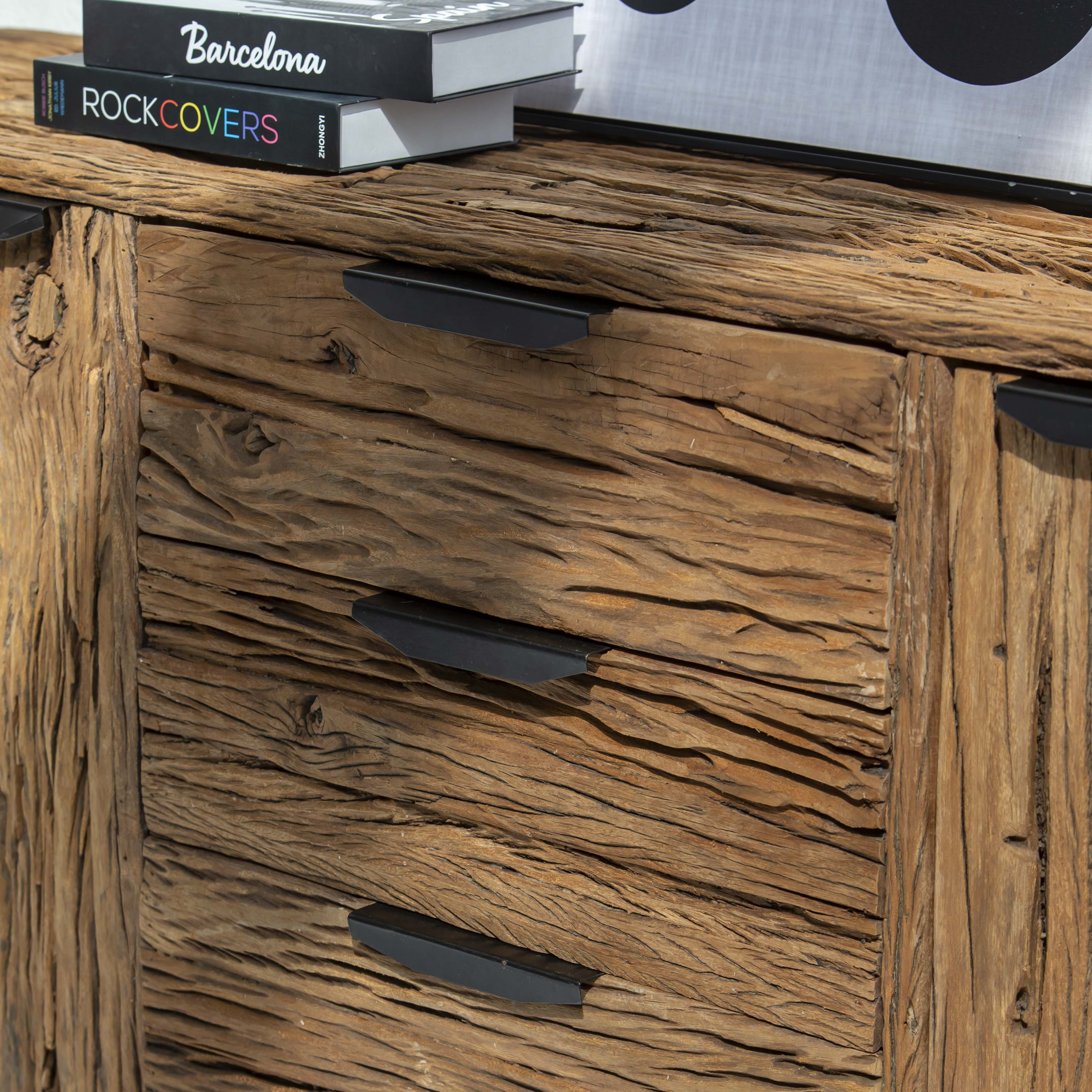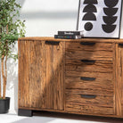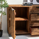 Crafted from reclaimed railway wood, this distinctive sideboard brings industrial heritage into your home. Each piece tells a story through its weathered grain and authentic patina, showcasing the character of its storied past. Featuring sturdy construction and ample storage, it serves as both a functional centerpiece and a conversation starter. Perfect for those who appreciate the marriage of history and design, this sideboard adds warmth and personality to any room while honoring the craftsmanship of a bygone era.