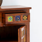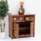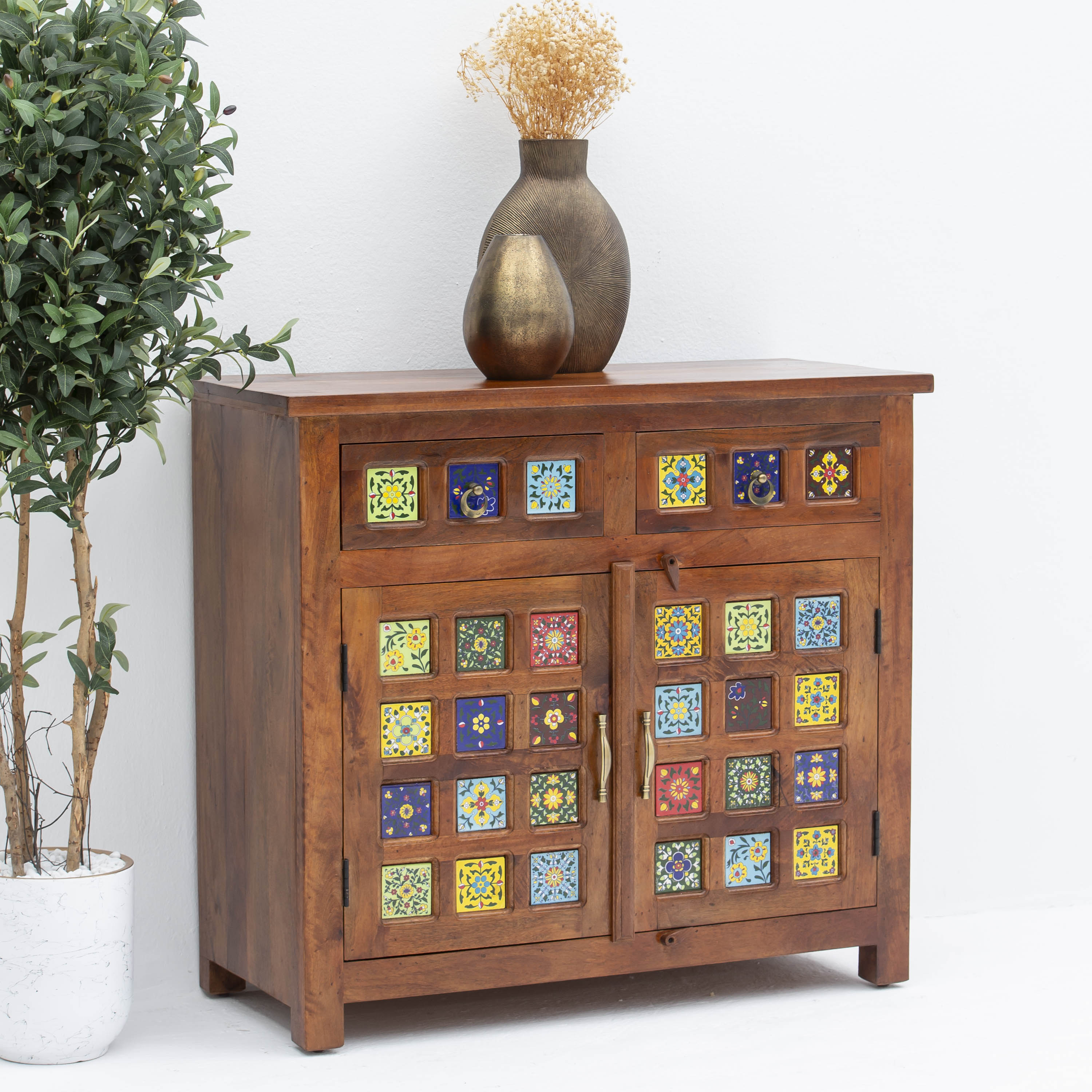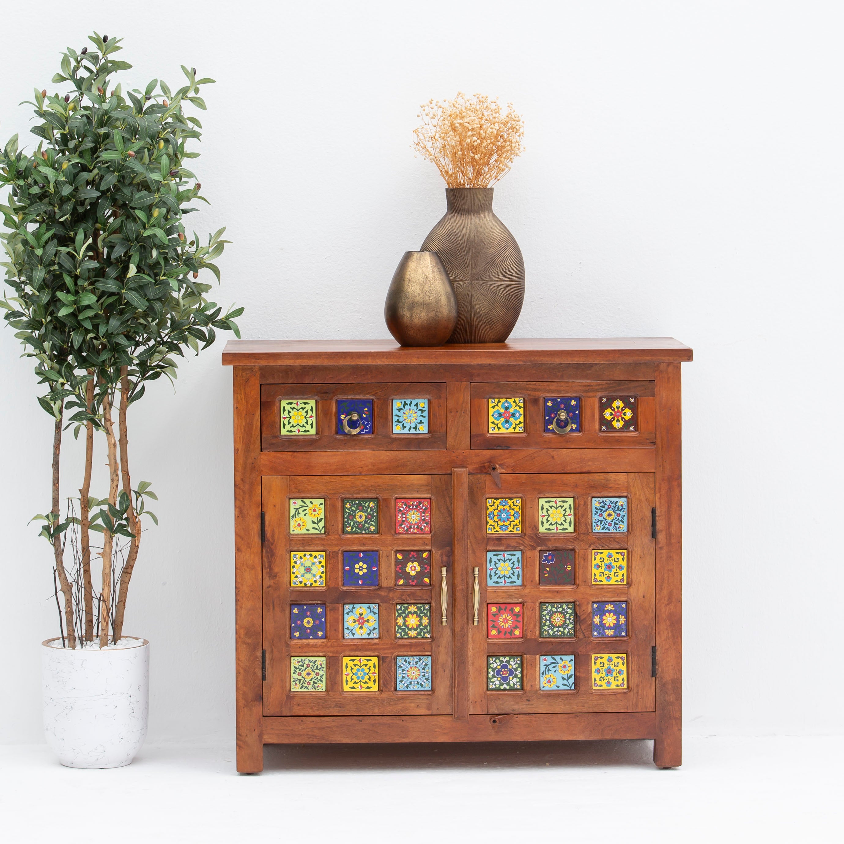 This wooden sideboard showcases artisanal craftsmanship with its striking tile-fronted design. Each piece celebrates the beauty of natural materials, combining solid wood construction with decorative tilework that tells a story. The thoughtfully proportioned storage offers versatility for entryways, dining rooms, or living spaces. Handcrafted details elevate it beyond mere furniture—it's a conversation starter that reflects your appreciation for authentic, well-made pieces. A timeless addition that brings warmth, texture, and artistic flair to your home.