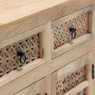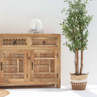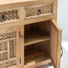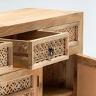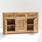تُجسّد خزانة سييرا الجانبية براعة الحرفيين الهنود التقليديين، فهي مصنوعة يدويًا بدقة متناهية من خشب المانجو الصلب. يجمع تصميمها ذو الأبواب الثلاثة والأدراج الثلاثة بين التخزين العملي والجاذبية الفنية، حيث تتميز بتفاصيل منحوتة دقيقة تُبرز مهارة الحرفيين. يضمن هيكلها المتين المصنوع من خشب المانجو المتانة وطول العمر، بينما تُضفي ألوان الخشب الدافئة لمسة جمالية على مختلف أنماط الديكور الداخلي. تُعد هذه الخزانة مثالية لغرف الطعام أو غرف المعيشة، فهي تجمع بين التخزين العملي والجمال الأخاذ الذي يُبرز تراث الأثاث المصنوع يدويًا.