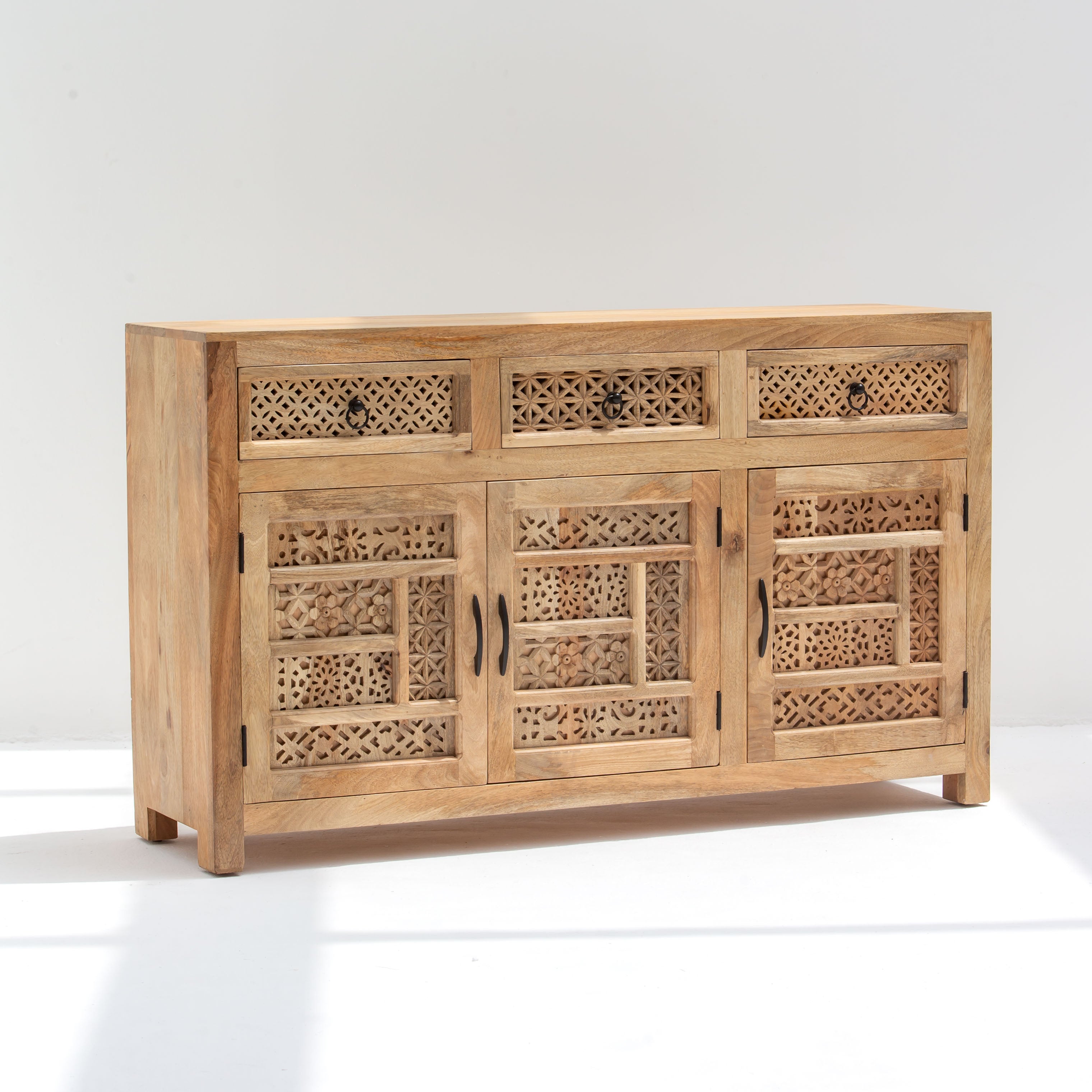 خزانة جانبية خشبية منحوتة من سييرا بثلاثة أبواب وثلاثة أدراج