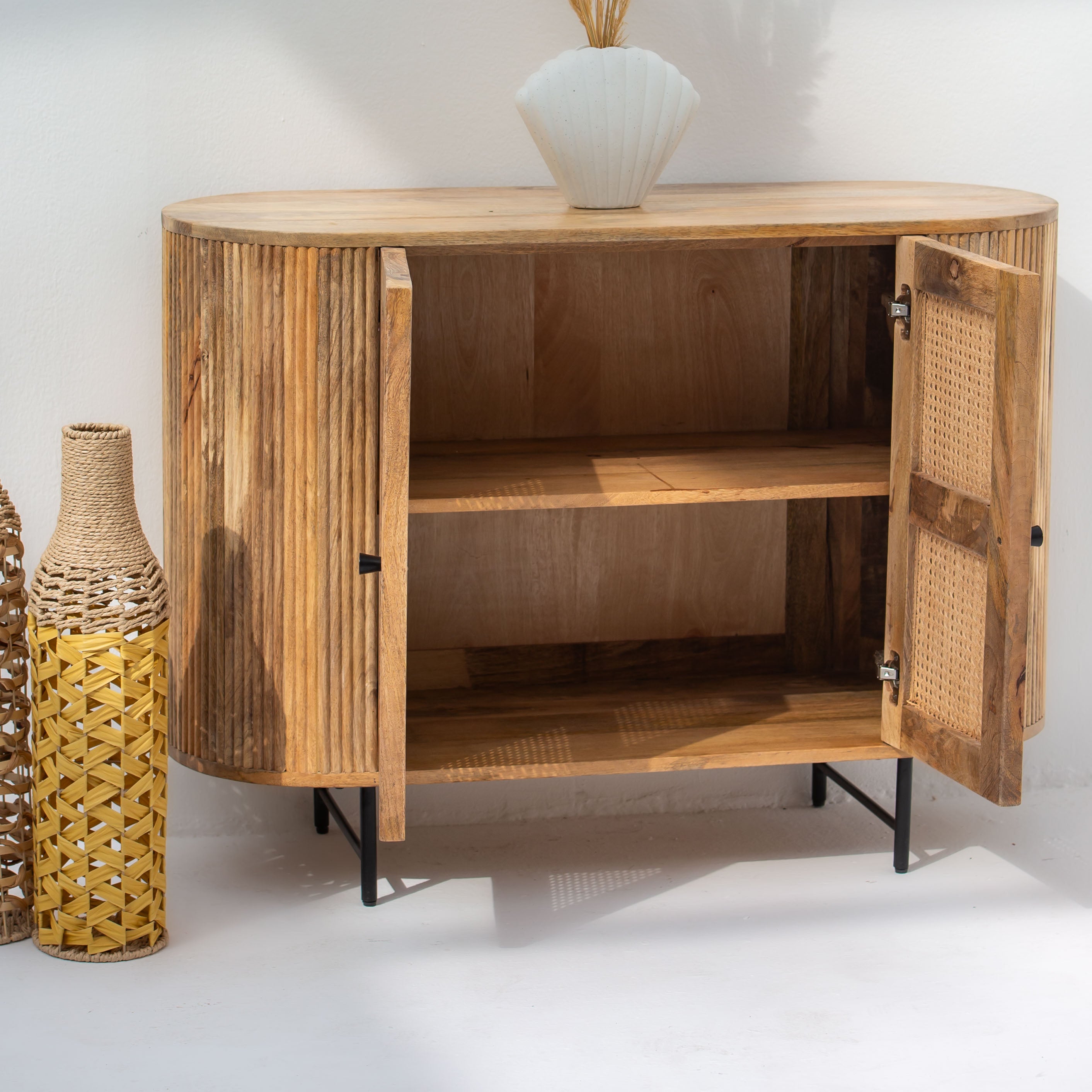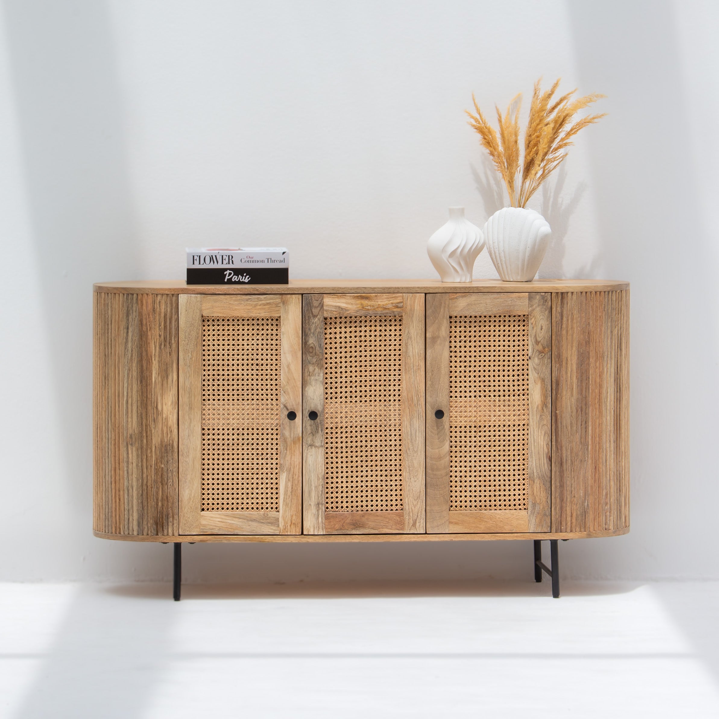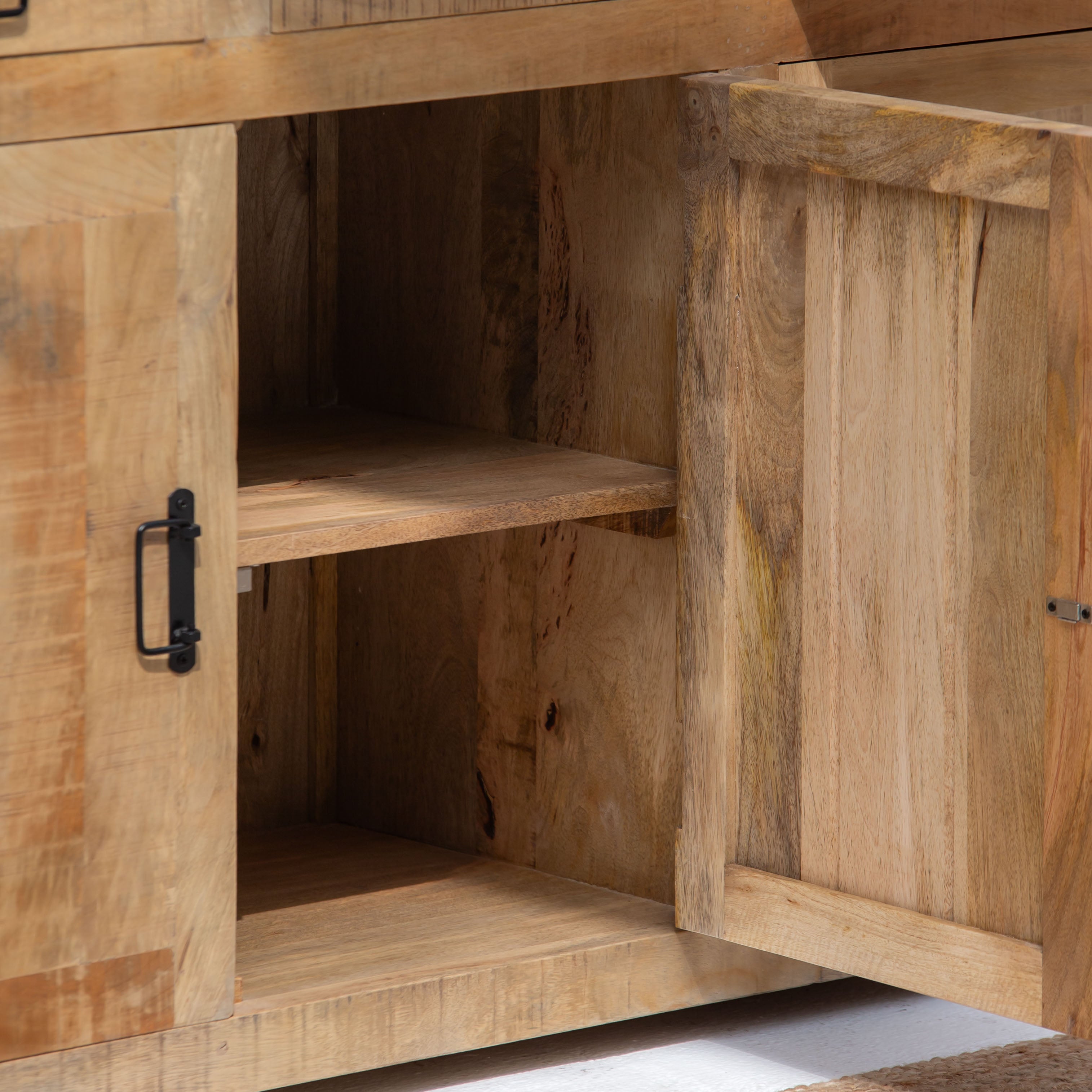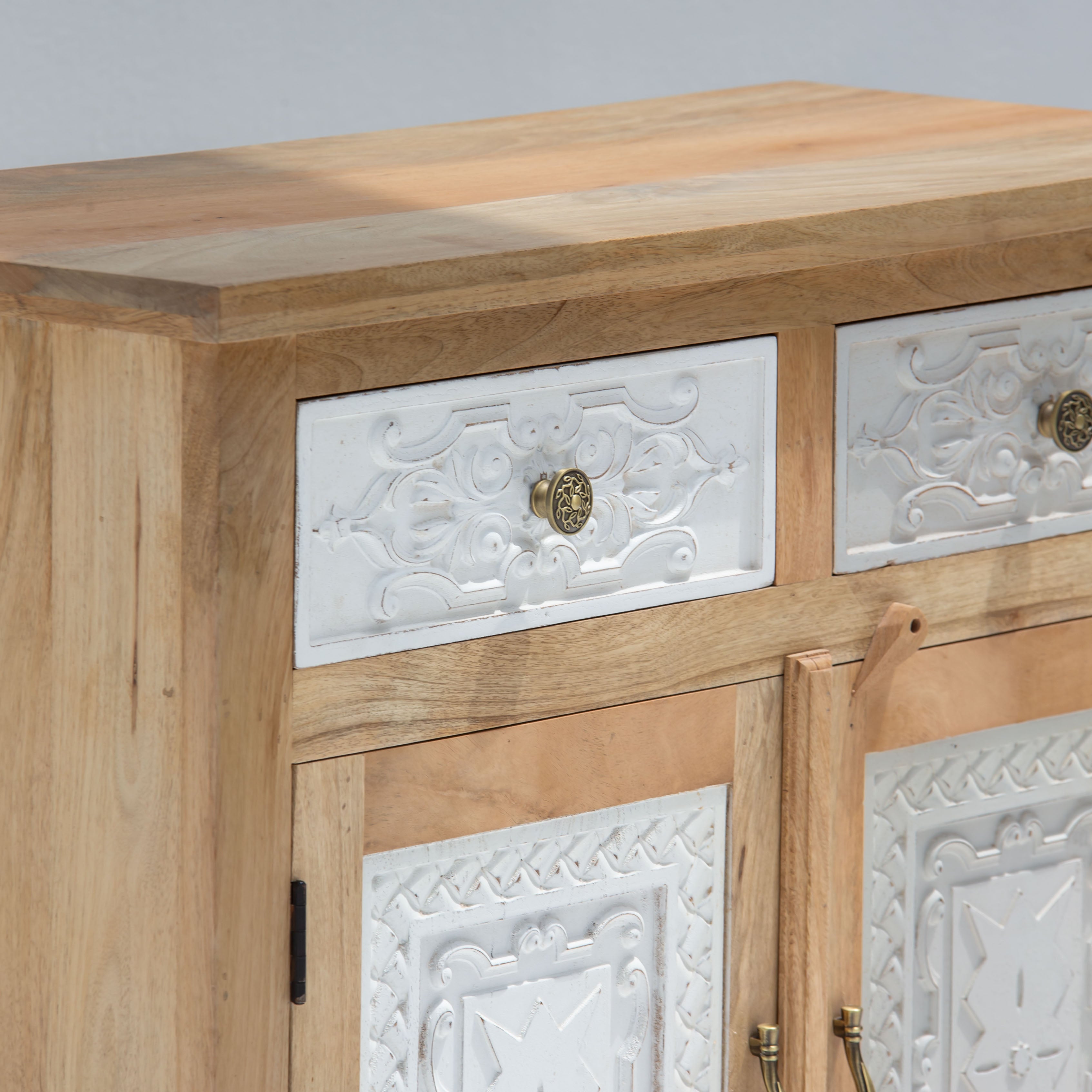 أضف لمسة من السحر الخالد والأناقة العصرية إلى مساحة معيشتك مع خزانة البوفيه المنحوتة يدويًا ، المصنوعة بحرفية عالية من خشب المانجو المستدام وخشب الأكاسيا المتين . تمزج هذه القطعة بسلاسة بين التصميم البسيط والحرفية العريقة ، لتجمع بين العملية والجمال في منزلك.