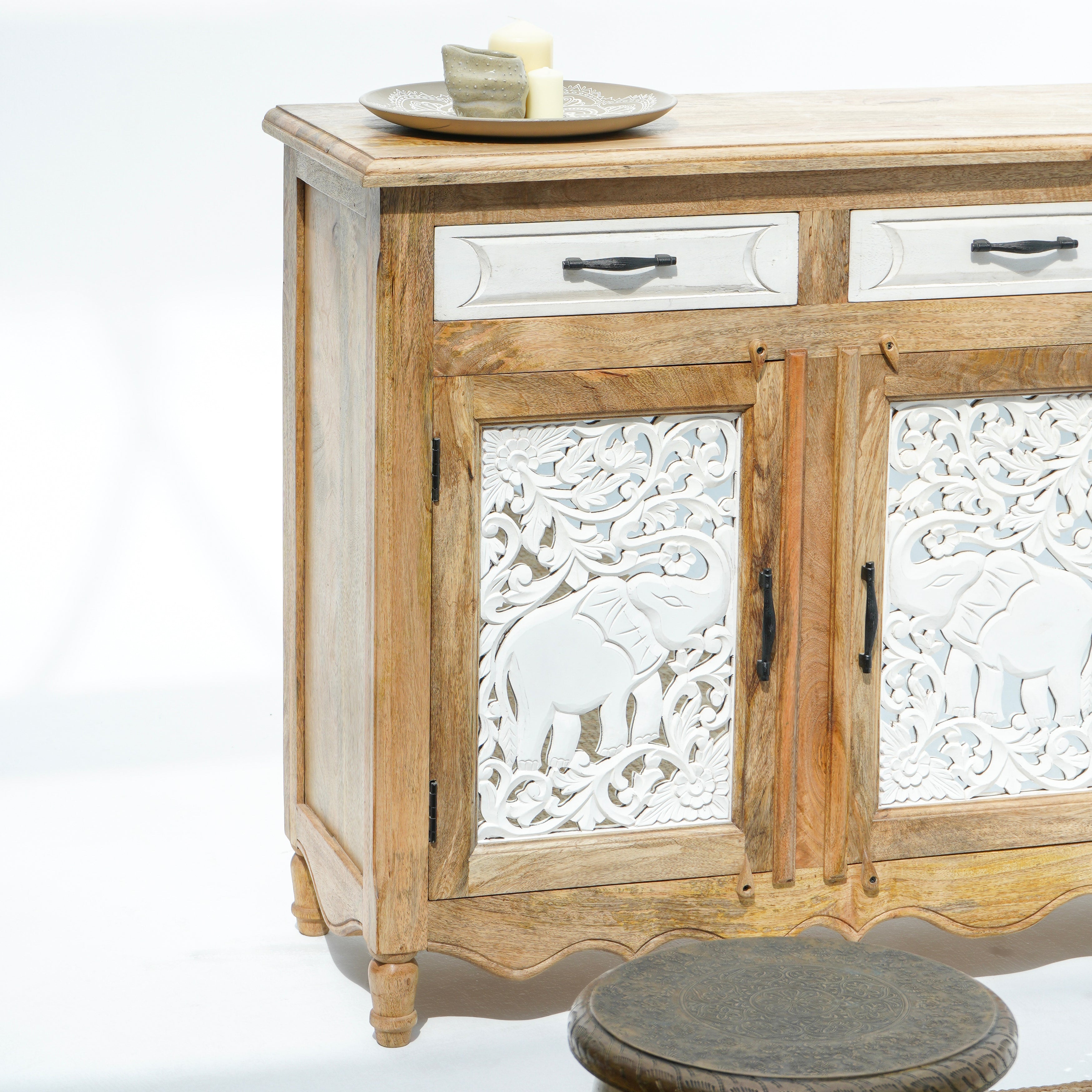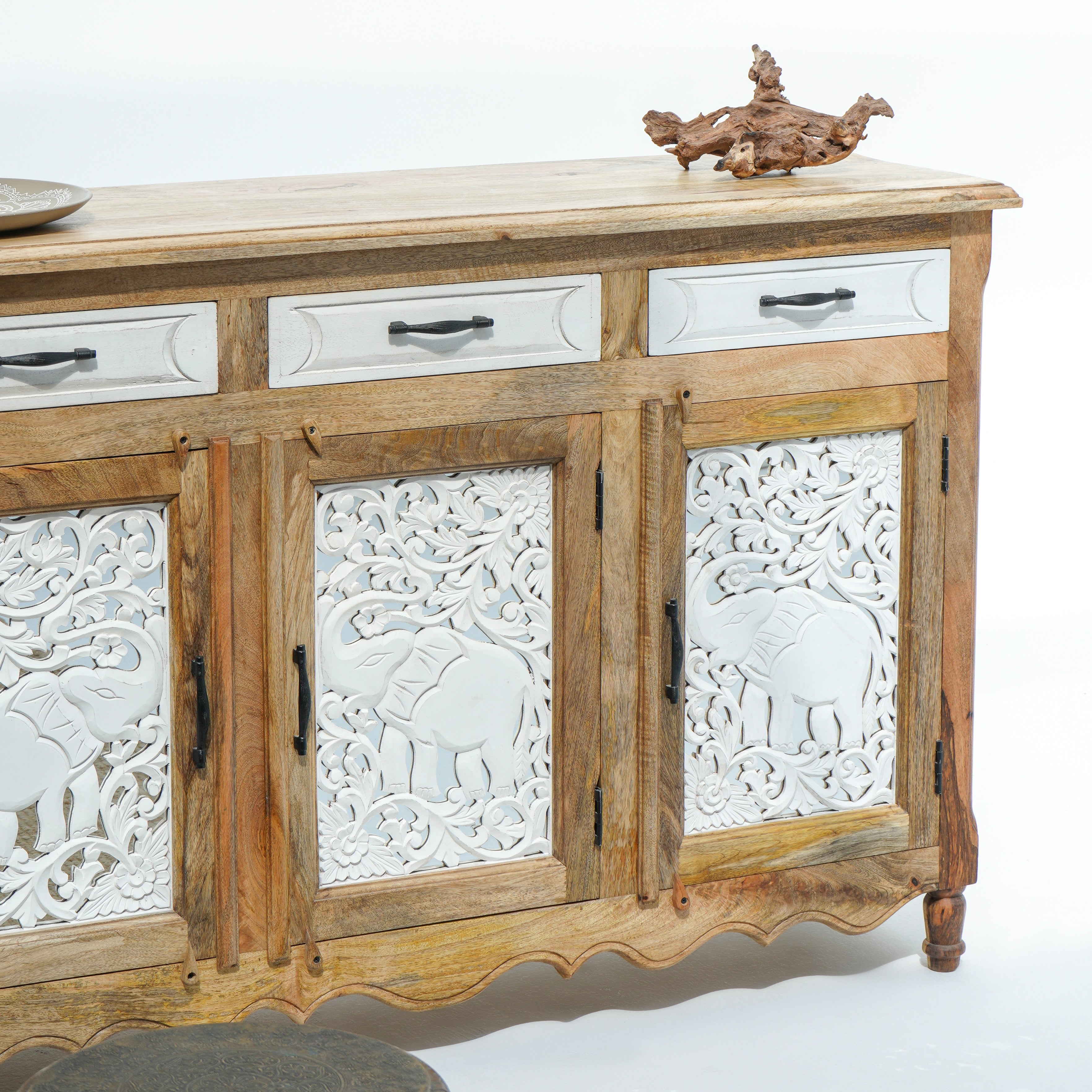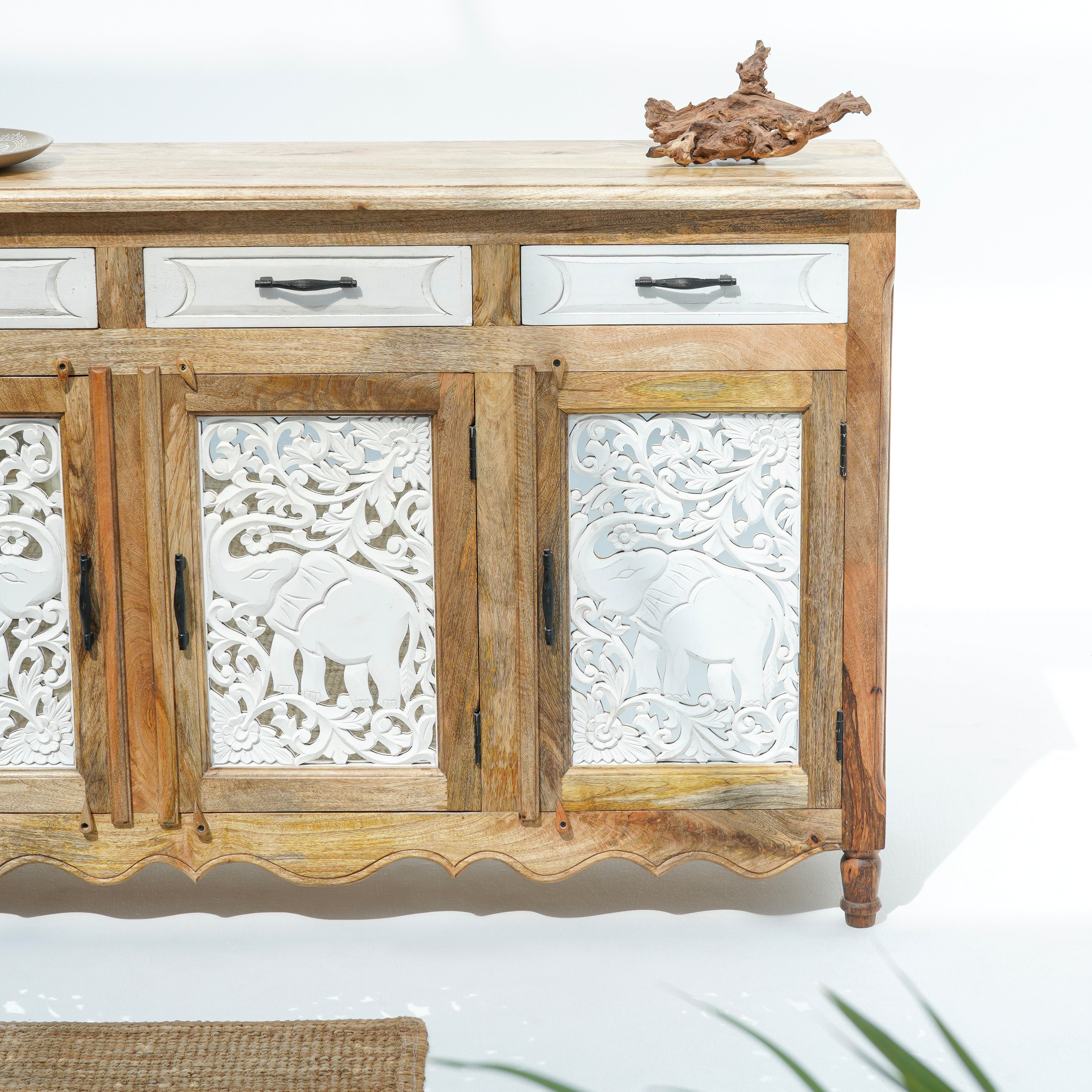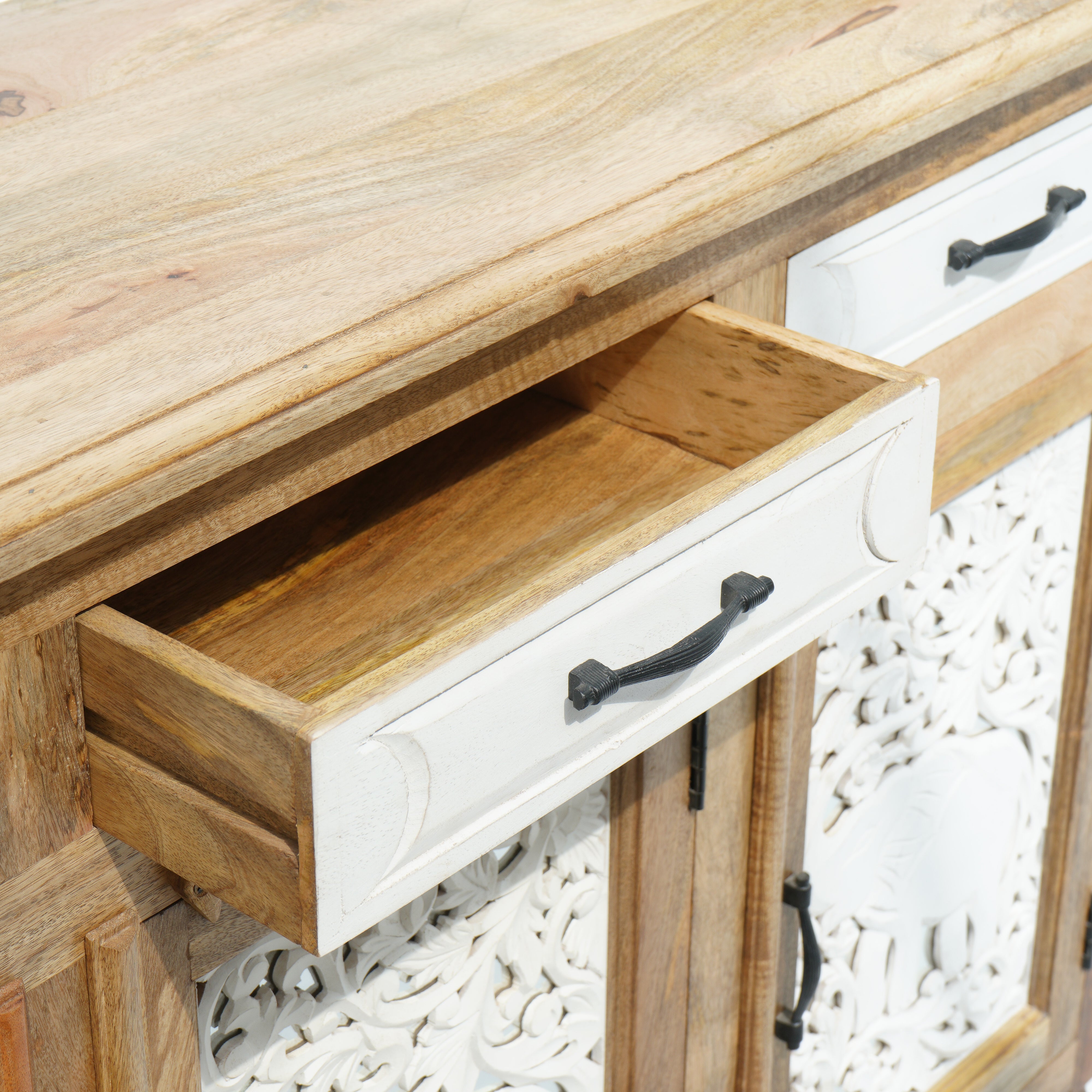 بوفيه وخزانة جانبية خشبية منحوتة يدويًا - خشب المانجو والأكاسيا