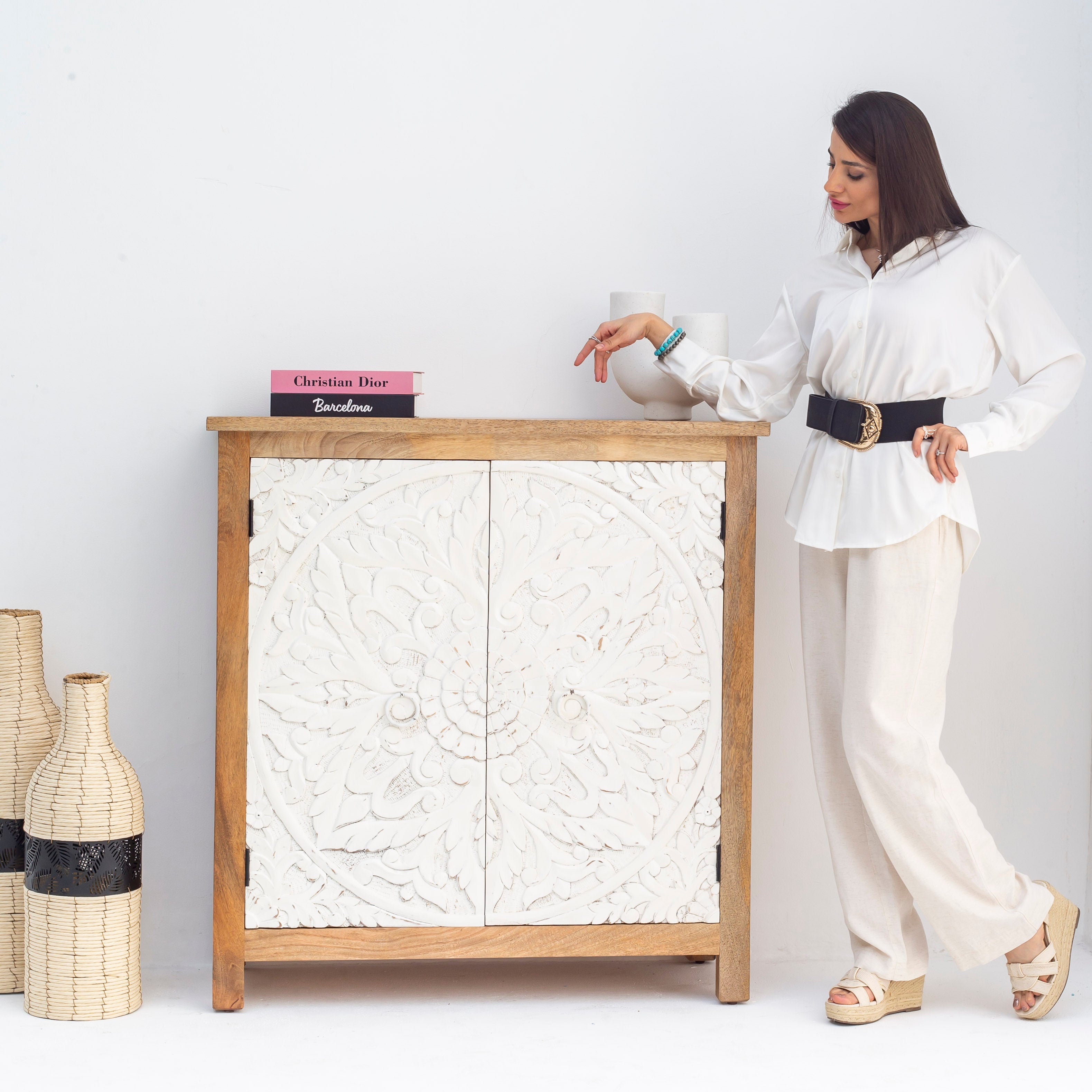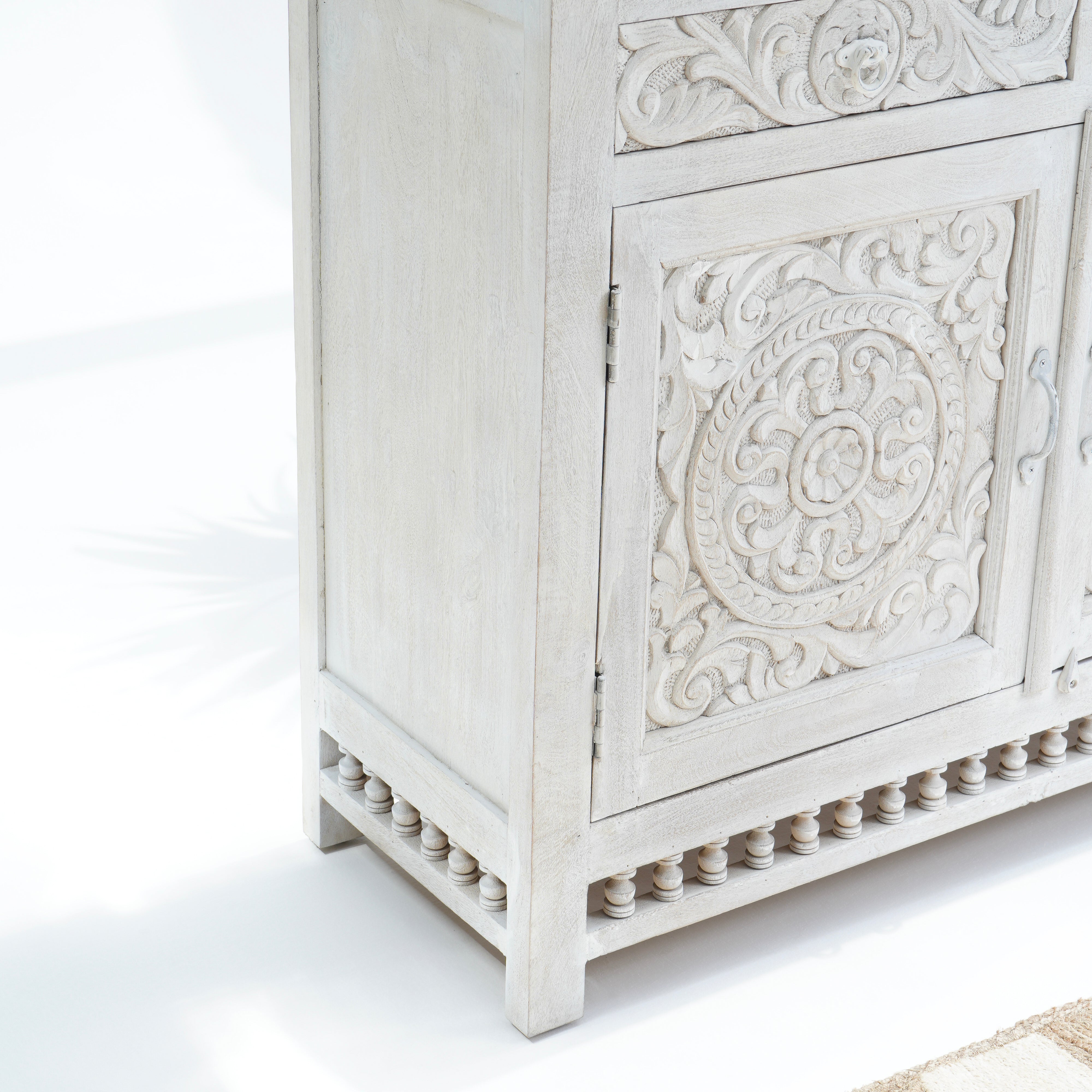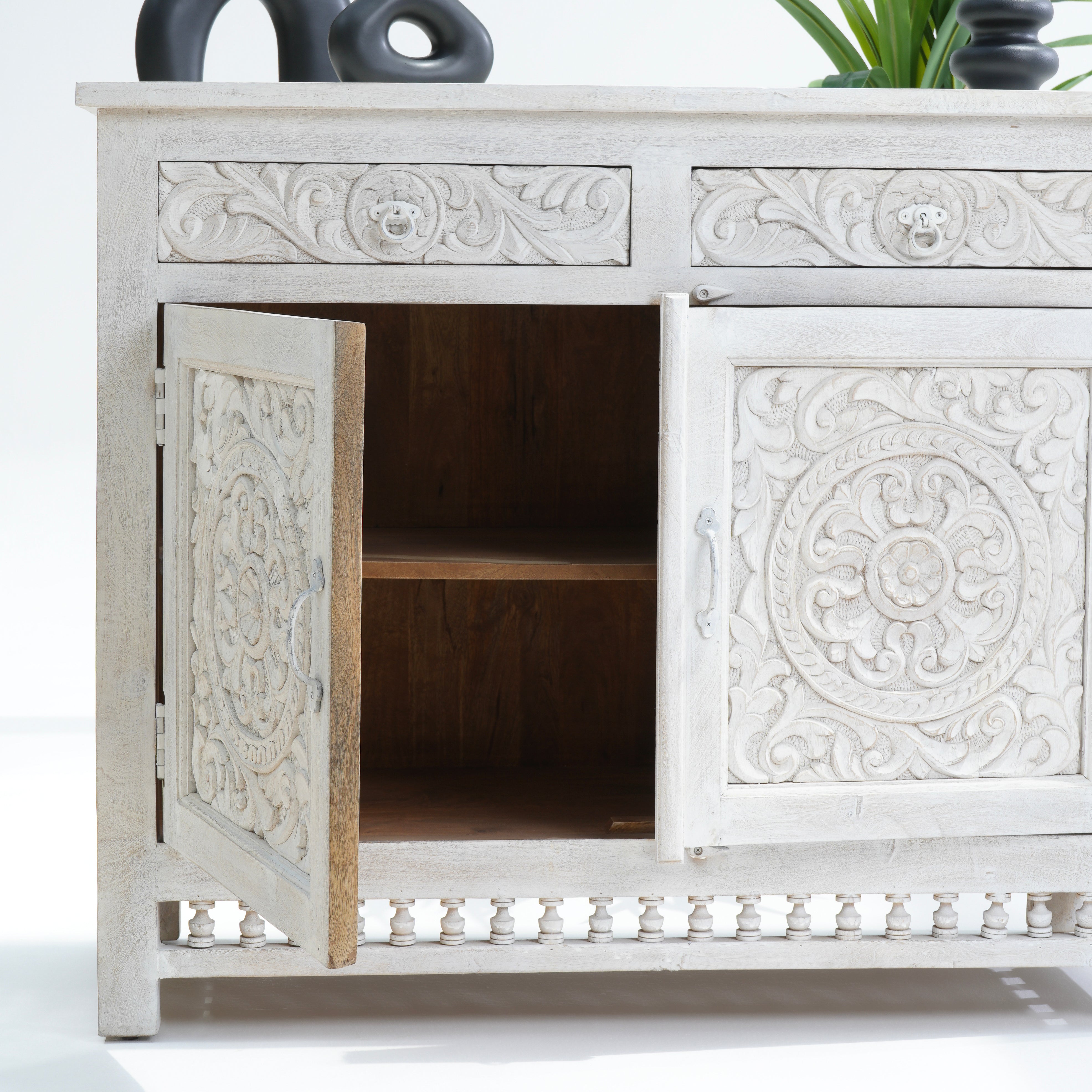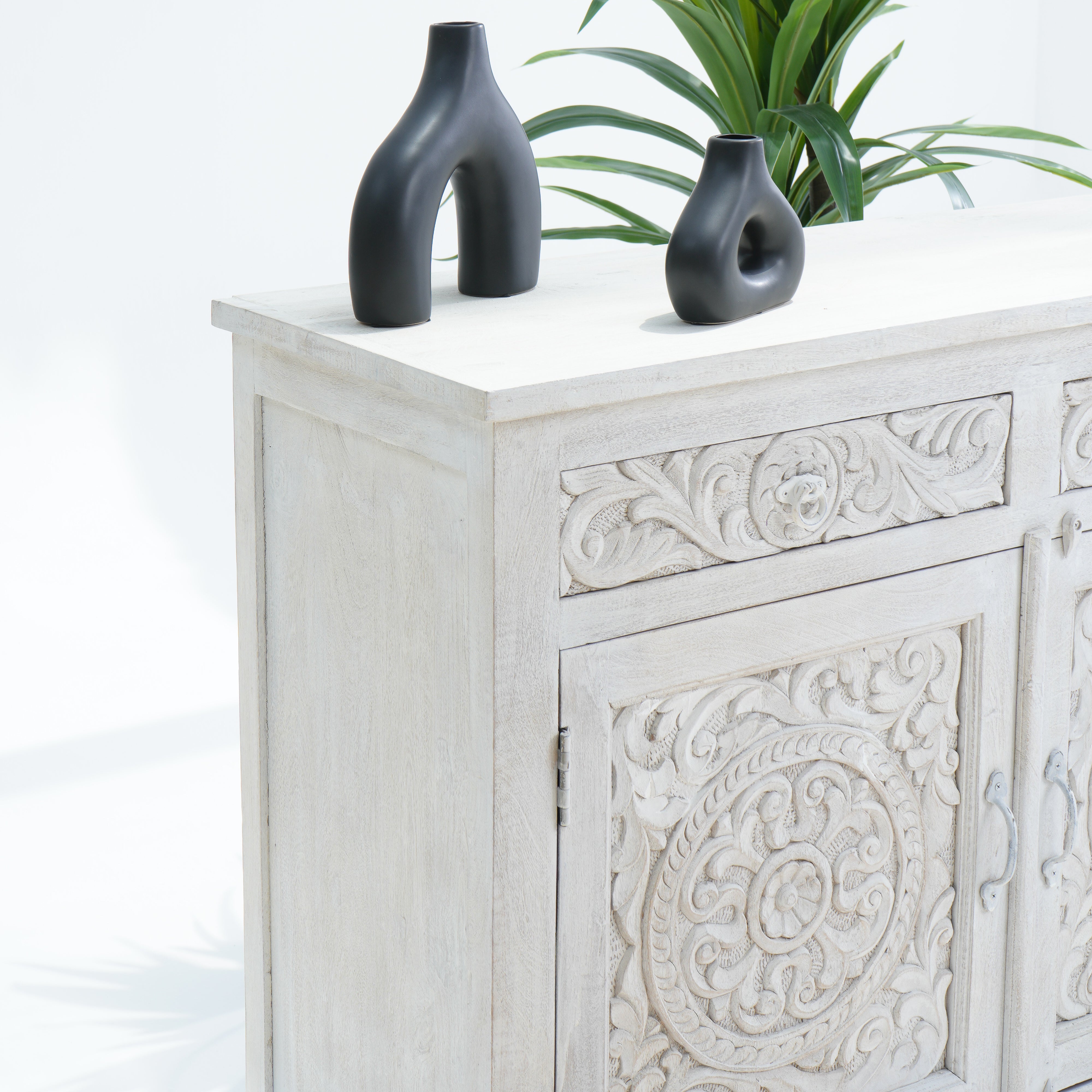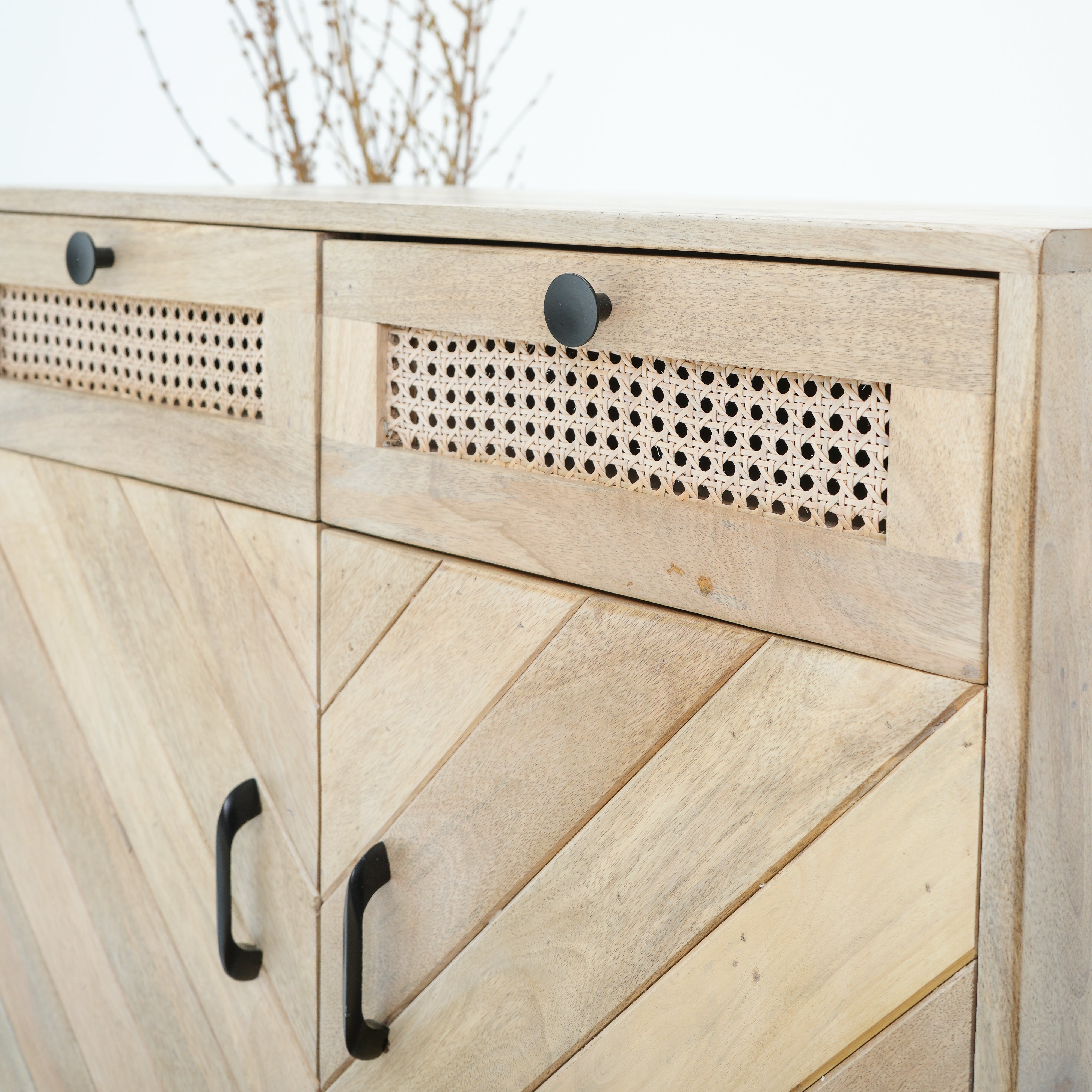 أضف لمسة من السحر الخالد والأناقة العصرية إلى مساحة معيشتك مع خزانة البوفيه المنحوتة يدويًا ، المصنوعة بحرفية عالية من خشب المانجو المستدام وخشب الأكاسيا المتين . تمزج هذه القطعة بسلاسة بين التصميم البسيط والحرفية العريقة ، لتجمع بين العملية والجمال في منزلك.