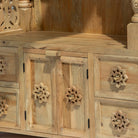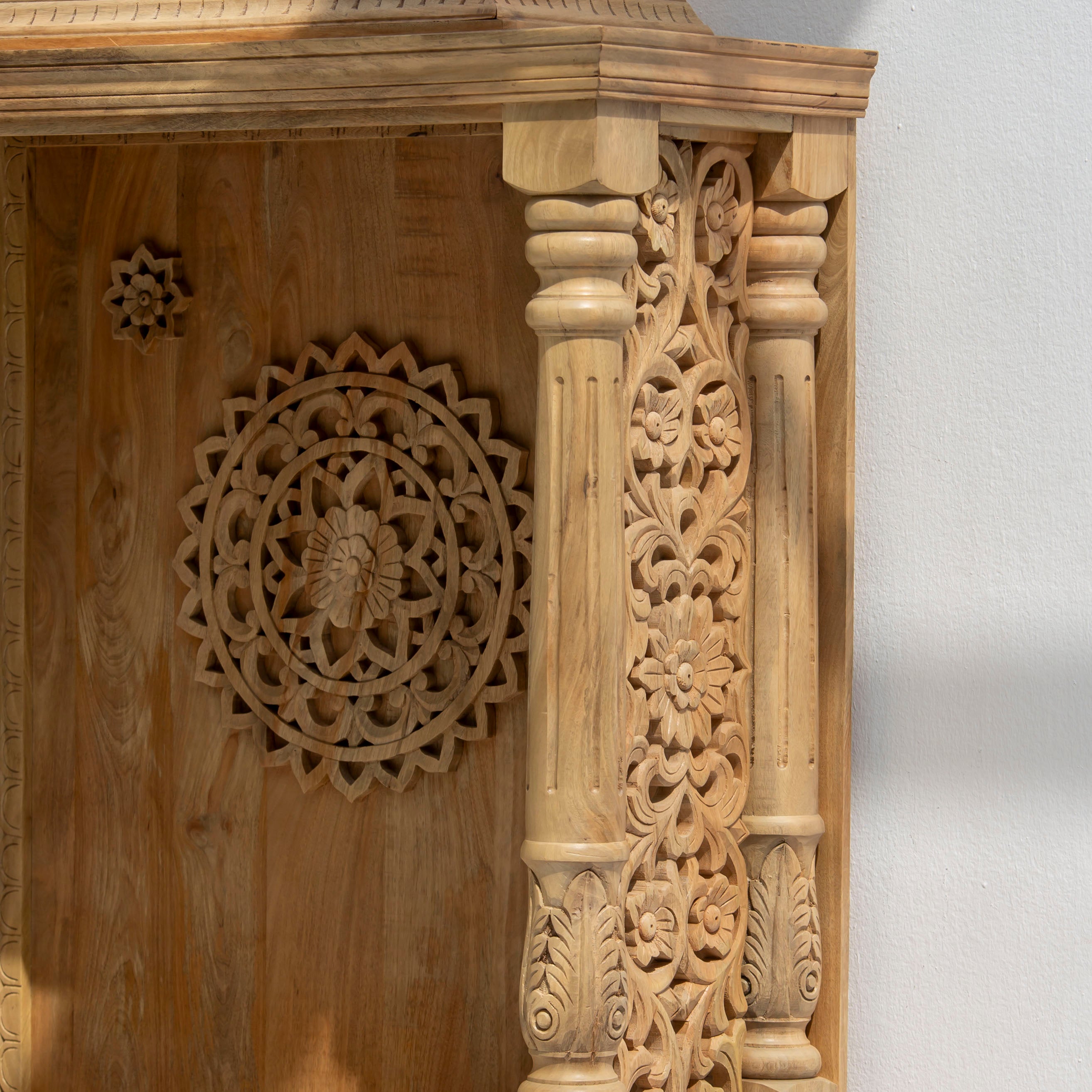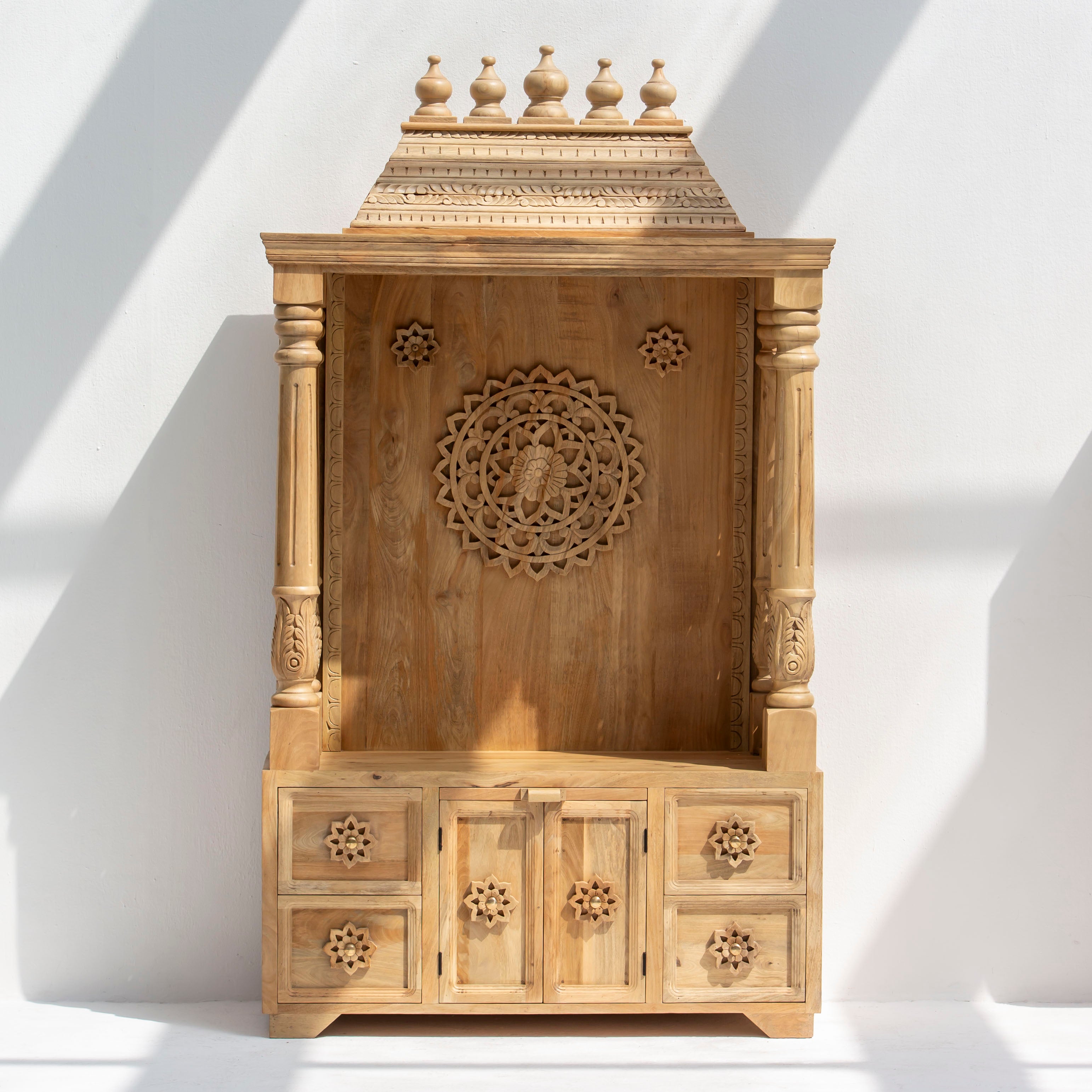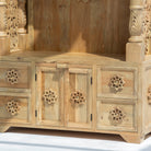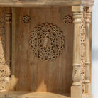 Handcrafted wooden carving temple made from solid mango wood, showcasing authentic Indian artistry. This beautifully carved piece features natural wood tones that highlight intricate details and traditional design elements. Perfect for adding cultural elegance to your home or sacred space. Each temple is uniquely crafted, making it a distinctive decorative accent that celebrates skilled woodworking heritage.