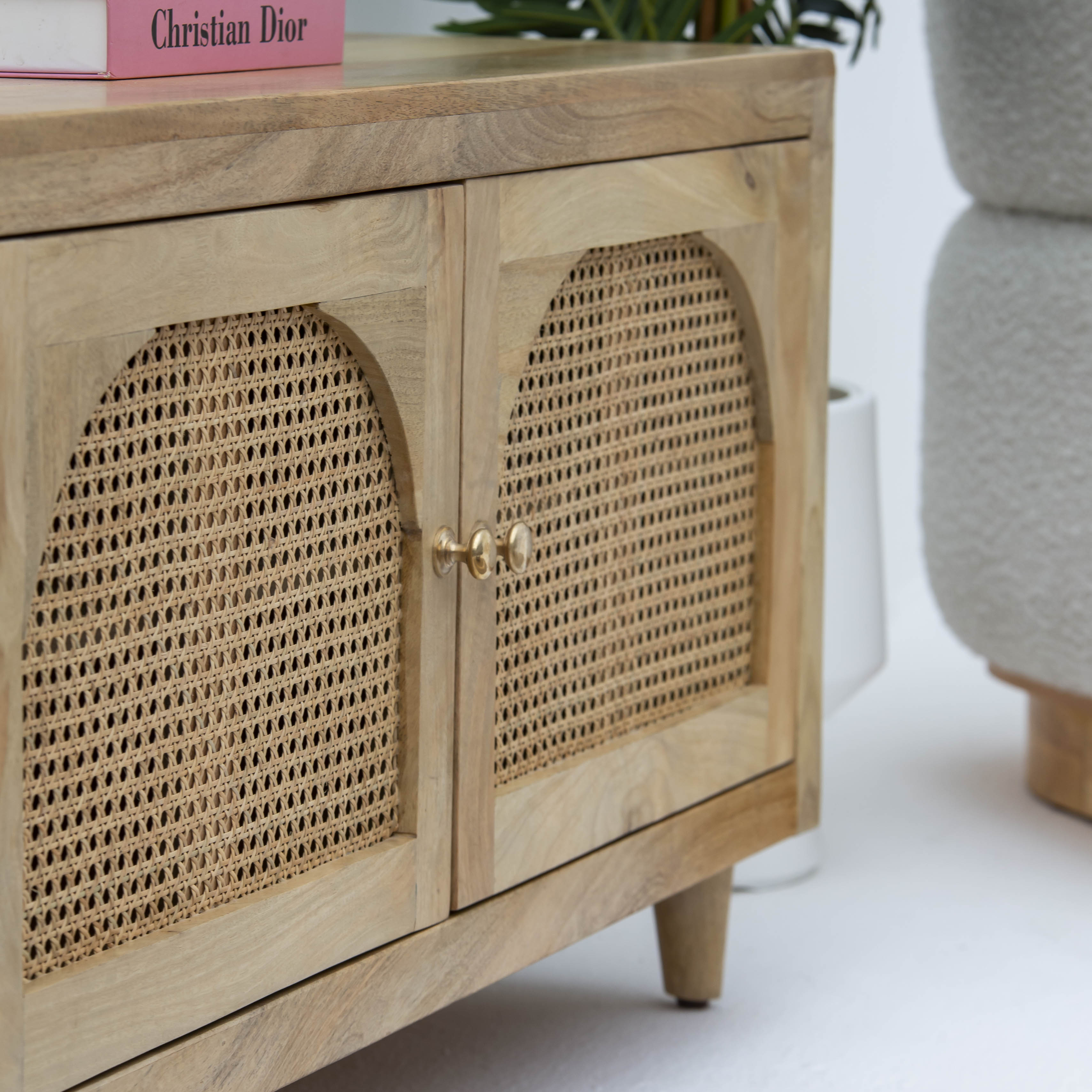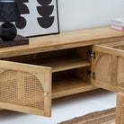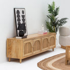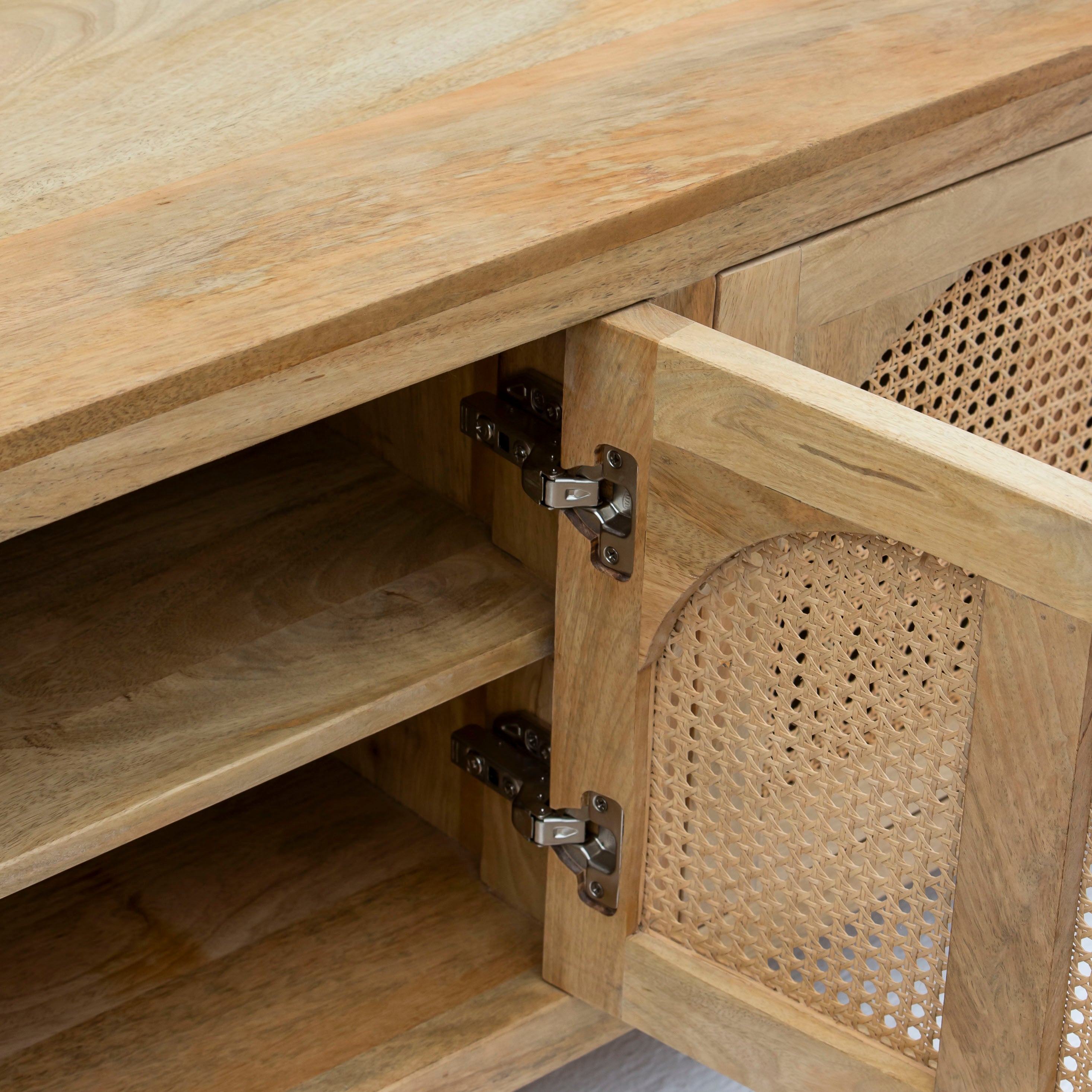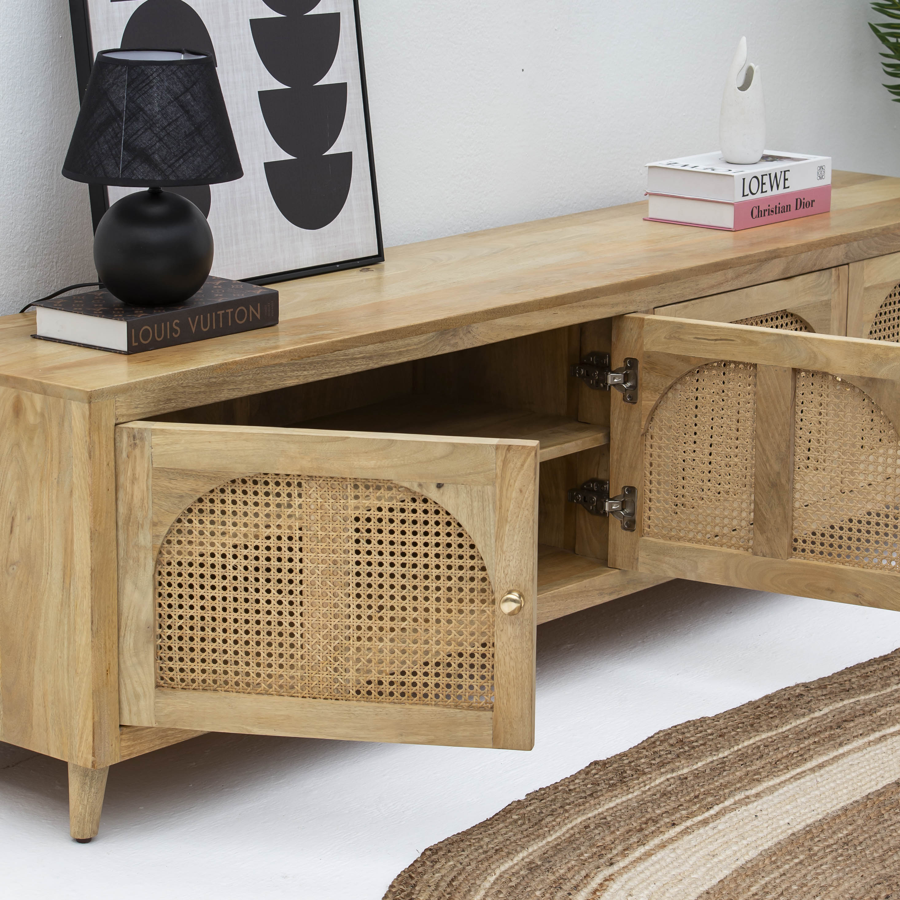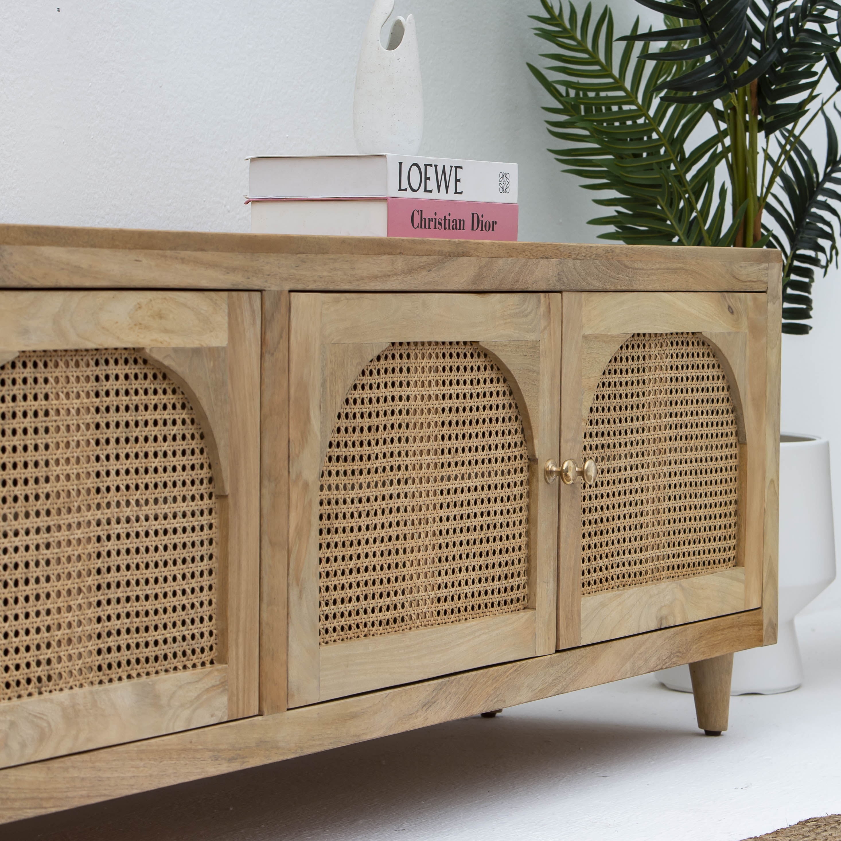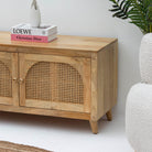 Crafted from sustainably sourced mango wood, the Canova Cane Four Door TV Stand brings warmth and character to your living space. Its four-door design offers generous storage for media equipment and entertainment essentials, while the natural wood grain and cane detailing showcase traditional artisanal craftsmanship. A timeless piece that balances functionality with organic beauty, perfect for those who appreciate handcrafted furniture with authentic appeal.