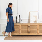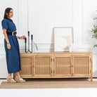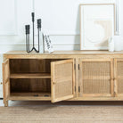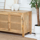 صُنعت طاولة التلفزيون "كانوفيا" يدويًا بعناية فائقة بالتفاصيل، لتُبرز الدفء الطبيعي لخشب المانجو الفاخر مع لمسات أنيقة من القصب. تتميز بأربعة أبواب واسعة توفر مساحة تخزين وفيرة لأجهزة الوسائط المتعددة ولوازم الترفيه، مع الحفاظ على مظهر جمالي راقٍ. تعكس كل قطعة براعة الحرفيين الهنود الأصيلين، لتضفي طابعًا فنيًا خالدًا على مساحة معيشتك. بفضل بنيتها المتينة وتصميمها المدروس، تُعد هذه الطاولة قطعة مركزية عملية، واحتفاءً بفن النجارة التقليدي.