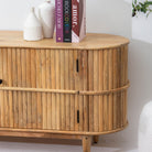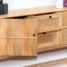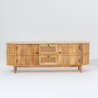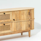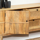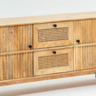 يجمع حامل التلفزيون "لوين" المصنوع من خشب المانجو الطبيعي بين الحرفية التقليدية والتصميم العملي. يتميز هذا الحامل بدرجين واسعين وبابين خشبيين، مما يوفر مساحة تخزين كبيرة لأجهزة الوسائط المتعددة وملحقاتها. تضفي تفاصيل القصب المميزة لمسة جمالية جذابة مع الحفاظ على طابع دافئ وطبيعي. صُمم هذا الحامل ليدوم طويلاً باستخدام تقنيات النجارة الهندية الأصيلة، فهو يُعد حلاً عملياً للترفيه وقطعة فنية مميزة تُضفي طابعاً فريداً على أي مساحة معيشة.