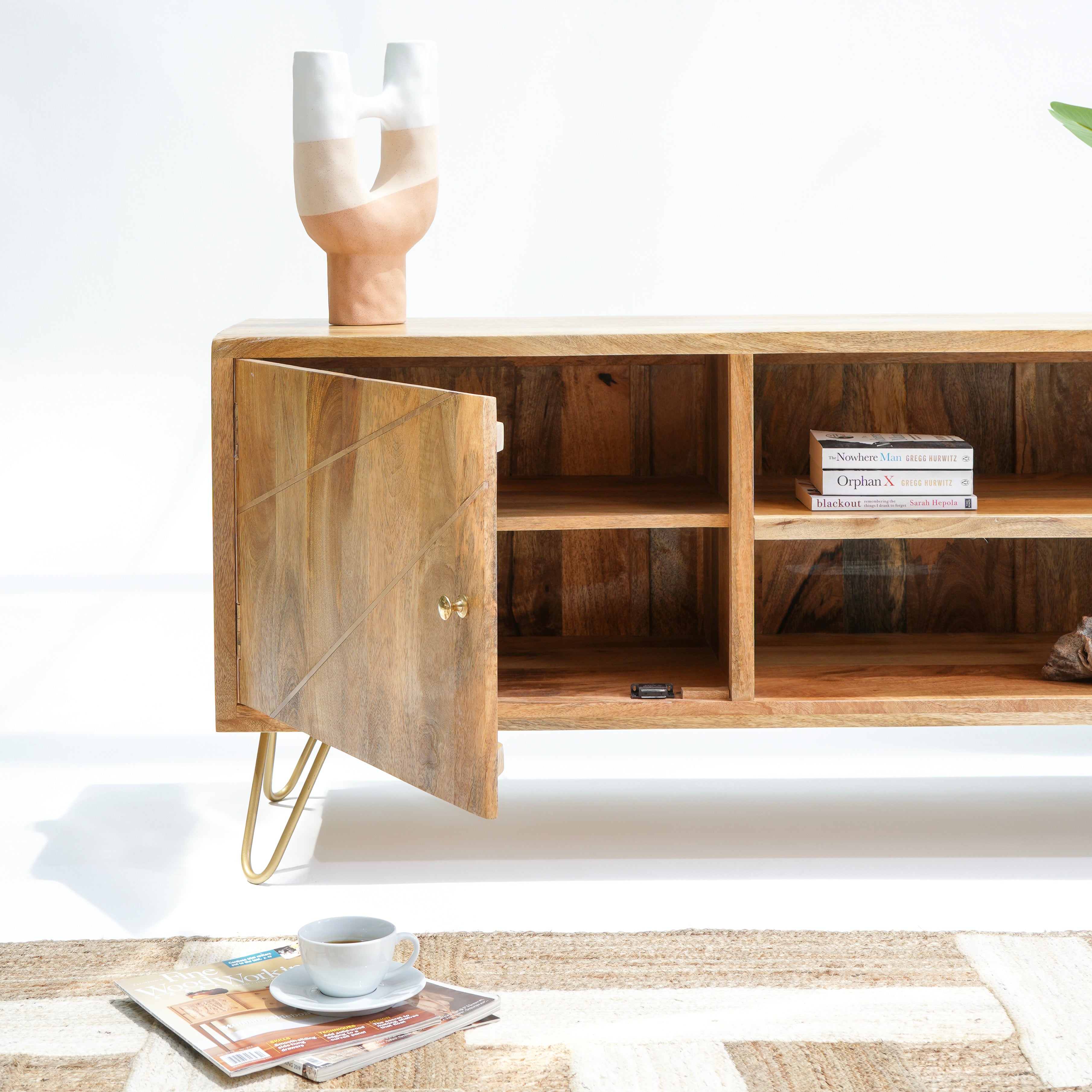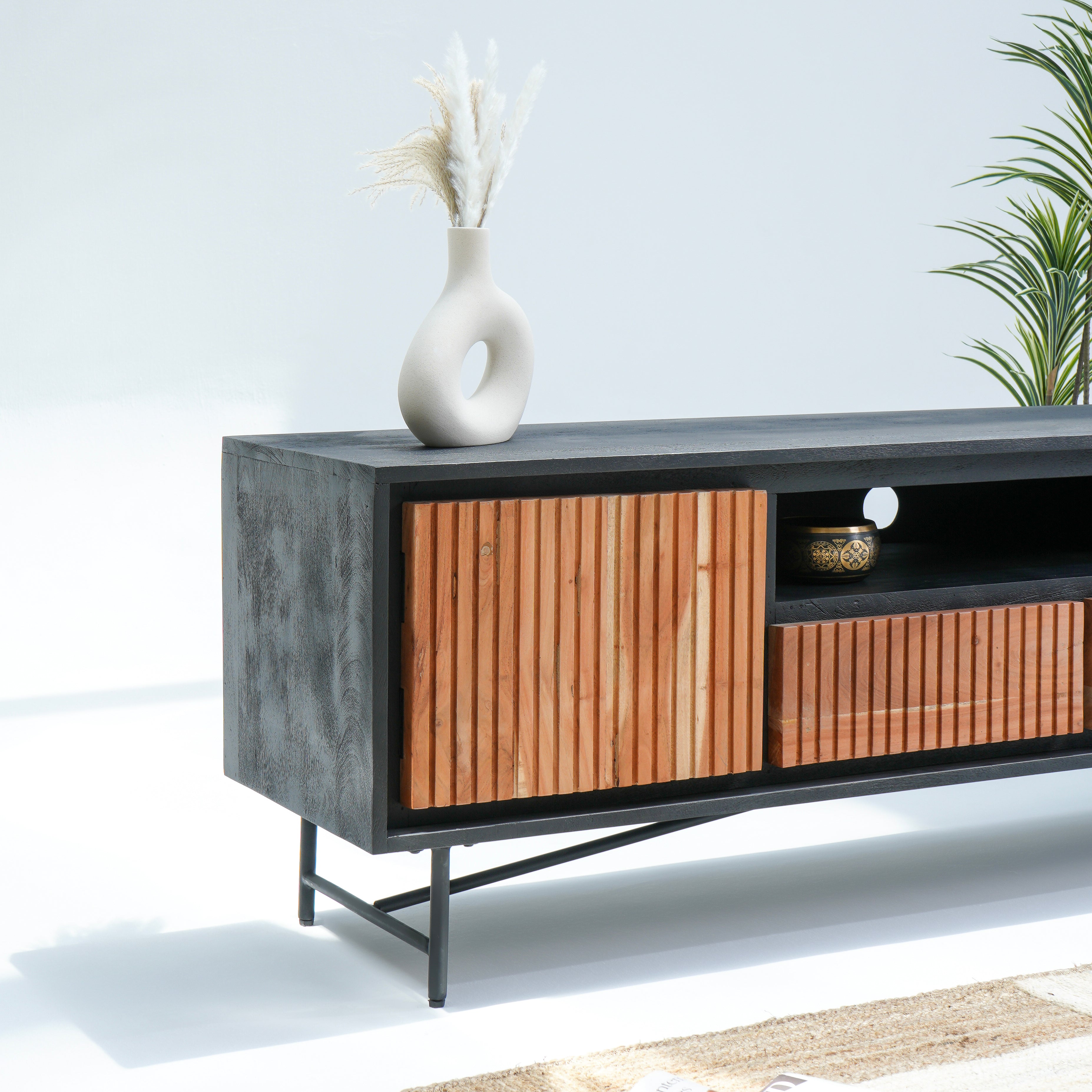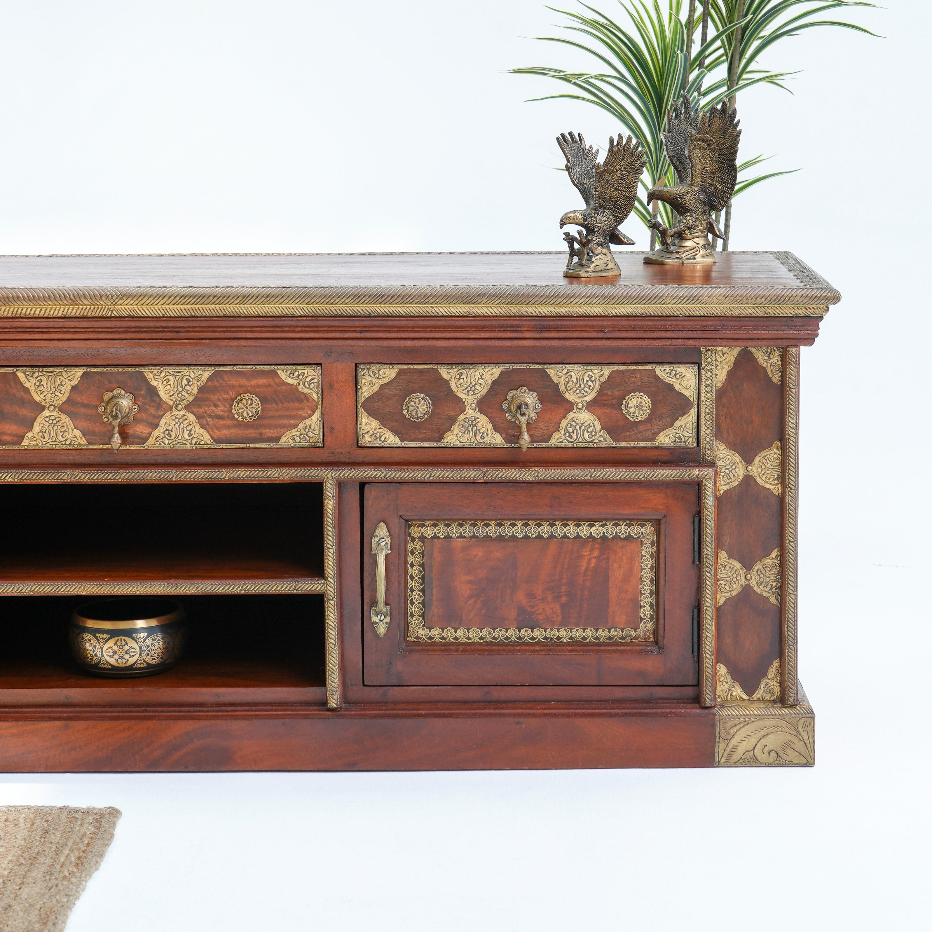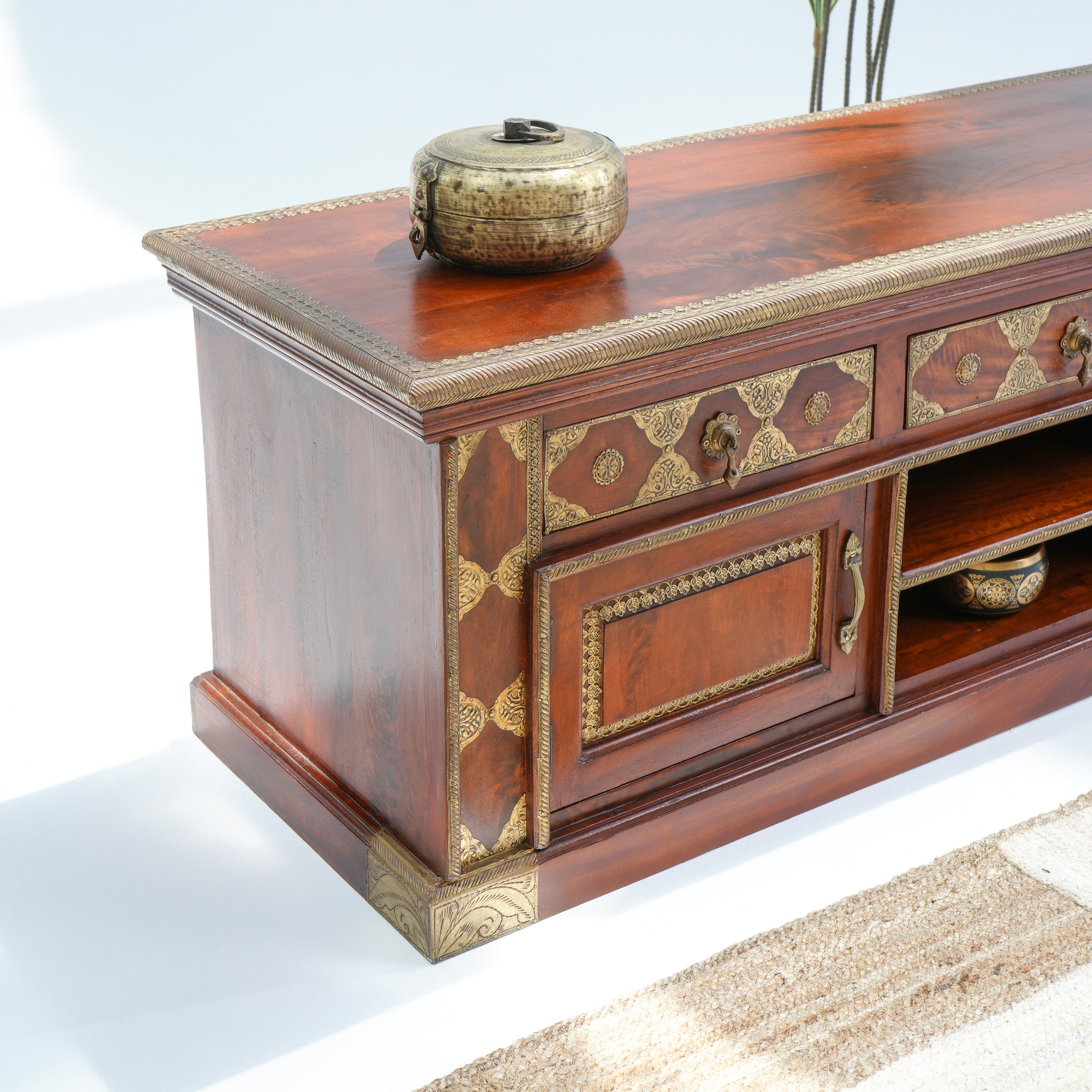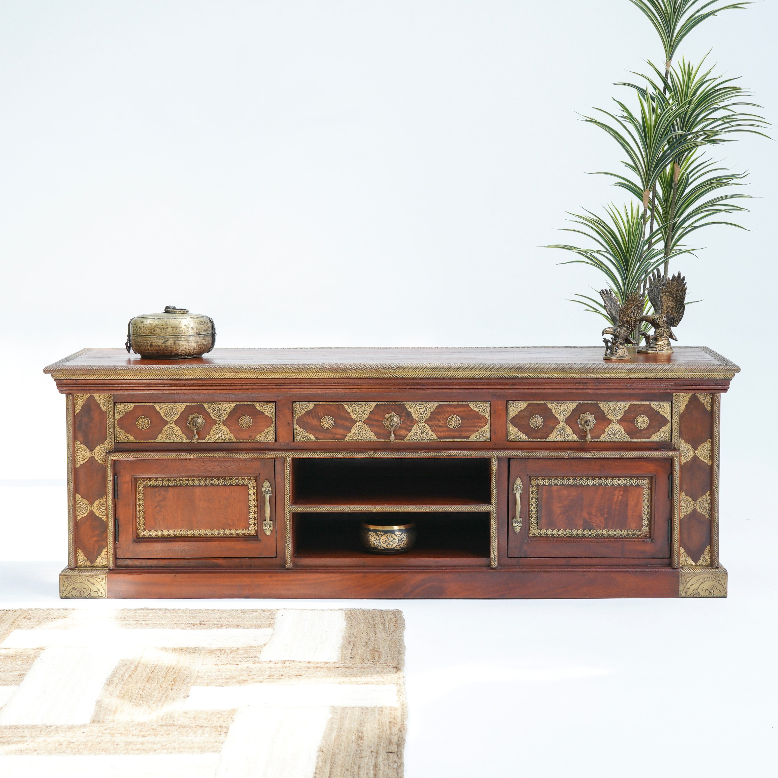 تتميز وحدات الوسائط هذه، المصنوعة من أخشاب صلبة فاخرة ومتينة مثل خشب الشيشم أو المانجو أو الساج، بما يلي: