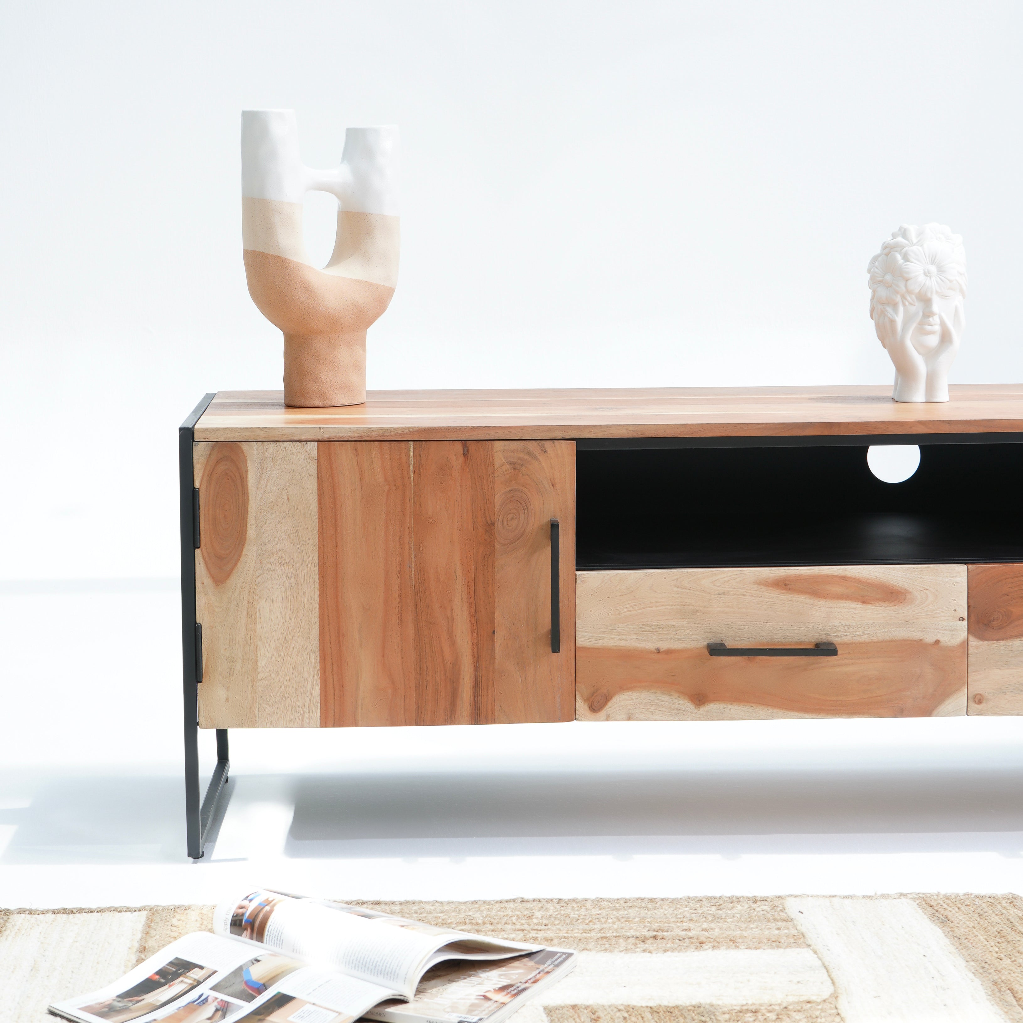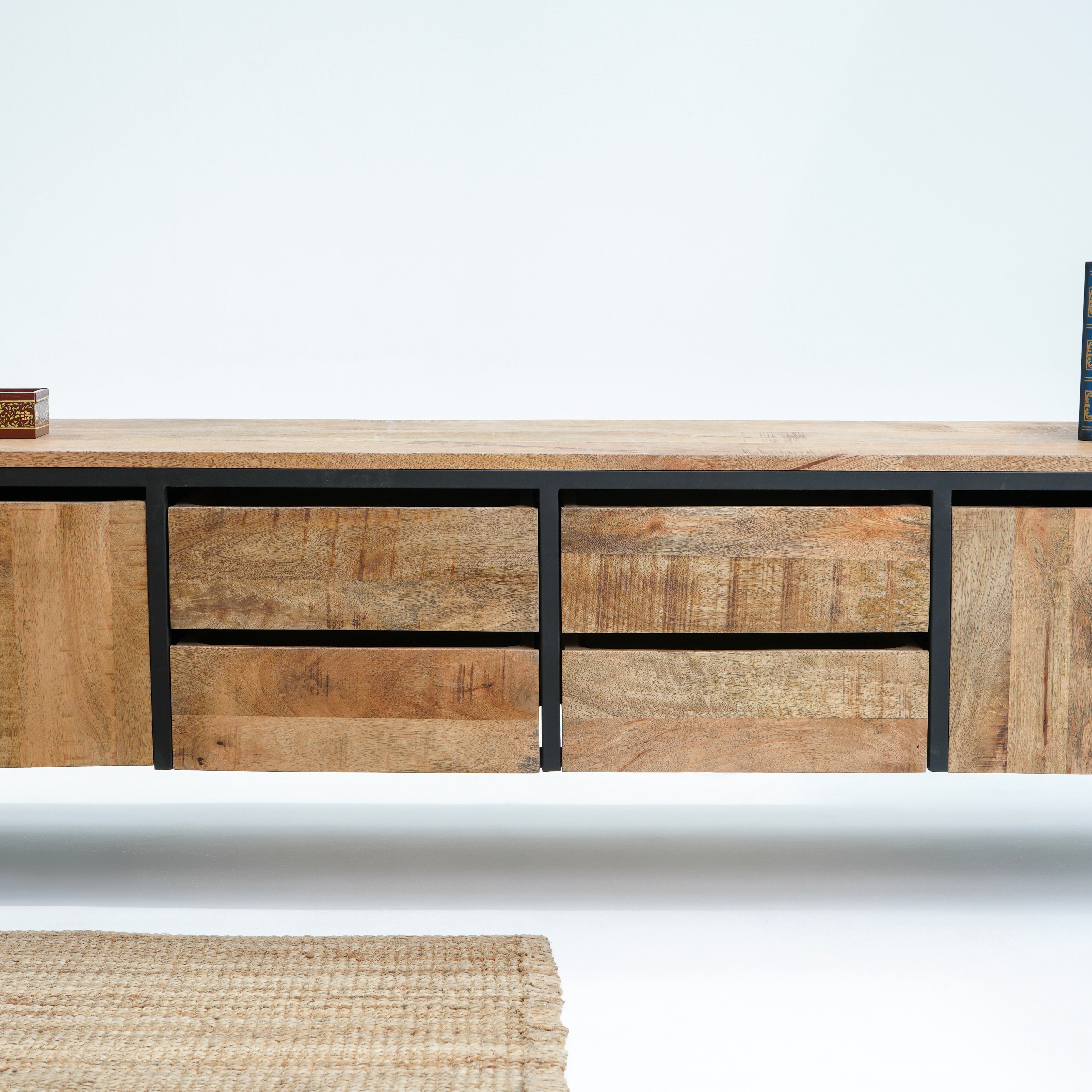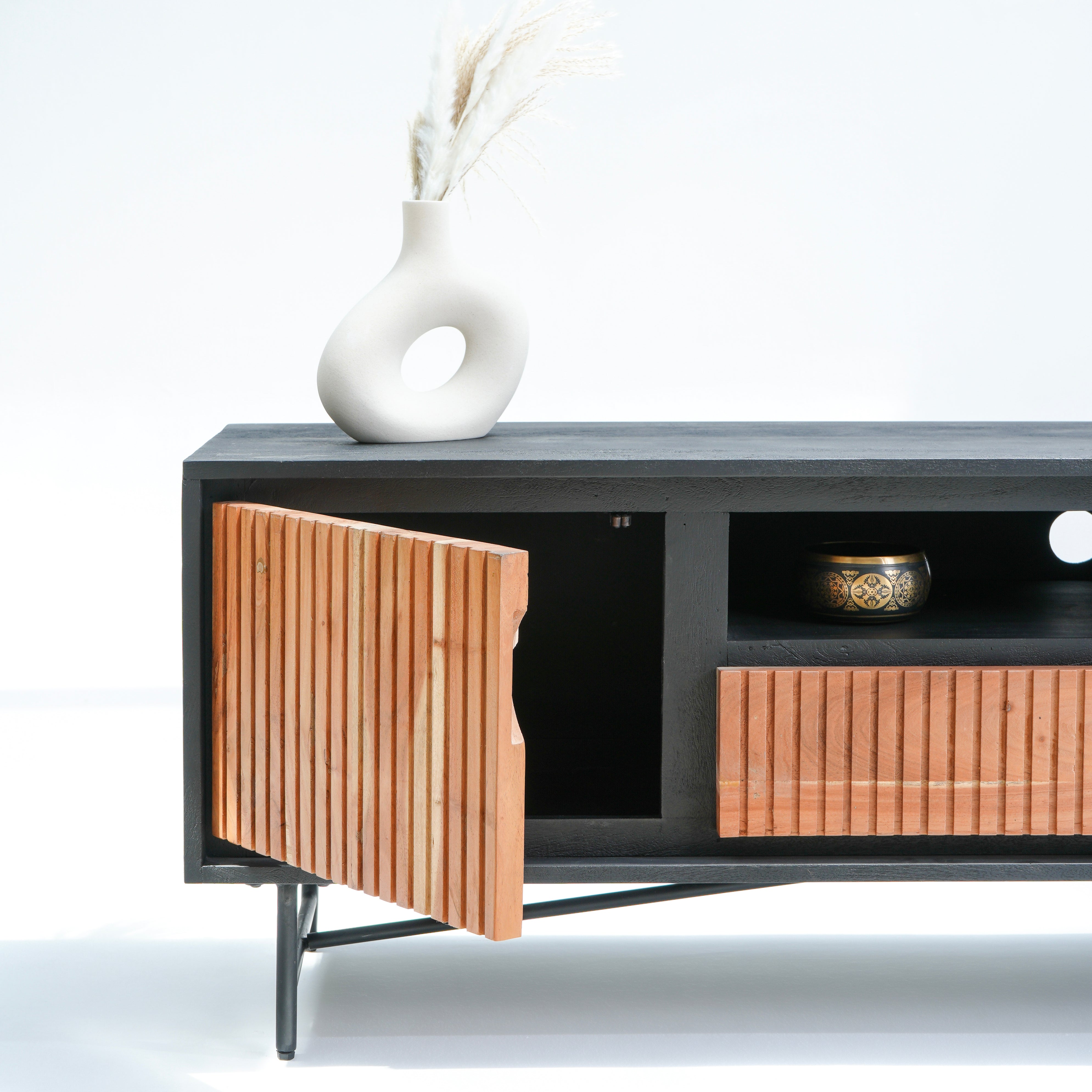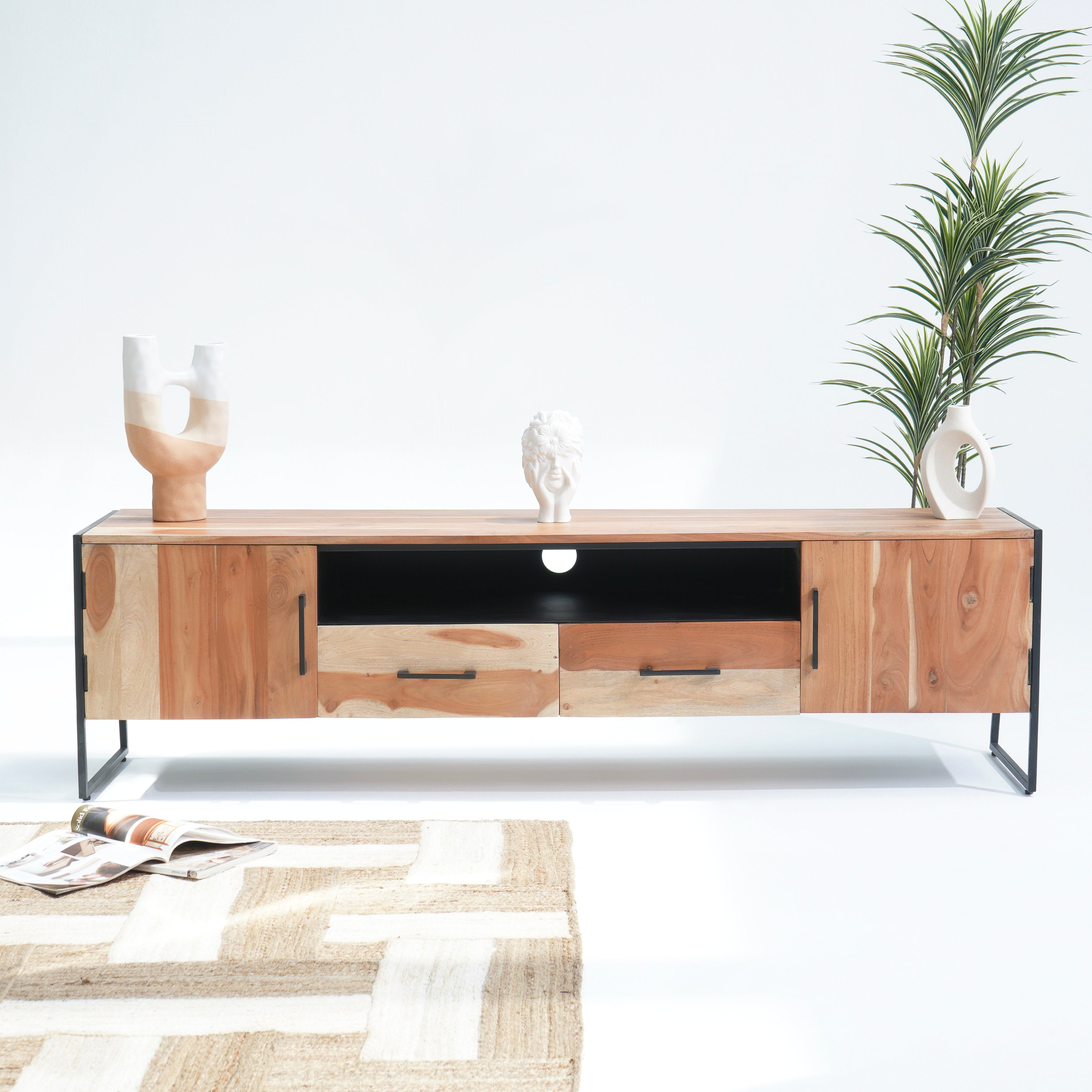 تتميز وحدات الوسائط هذه، المصنوعة من أخشاب صلبة فاخرة ومتينة مثل خشب الشيشم أو المانجو أو الساج، بما يلي: