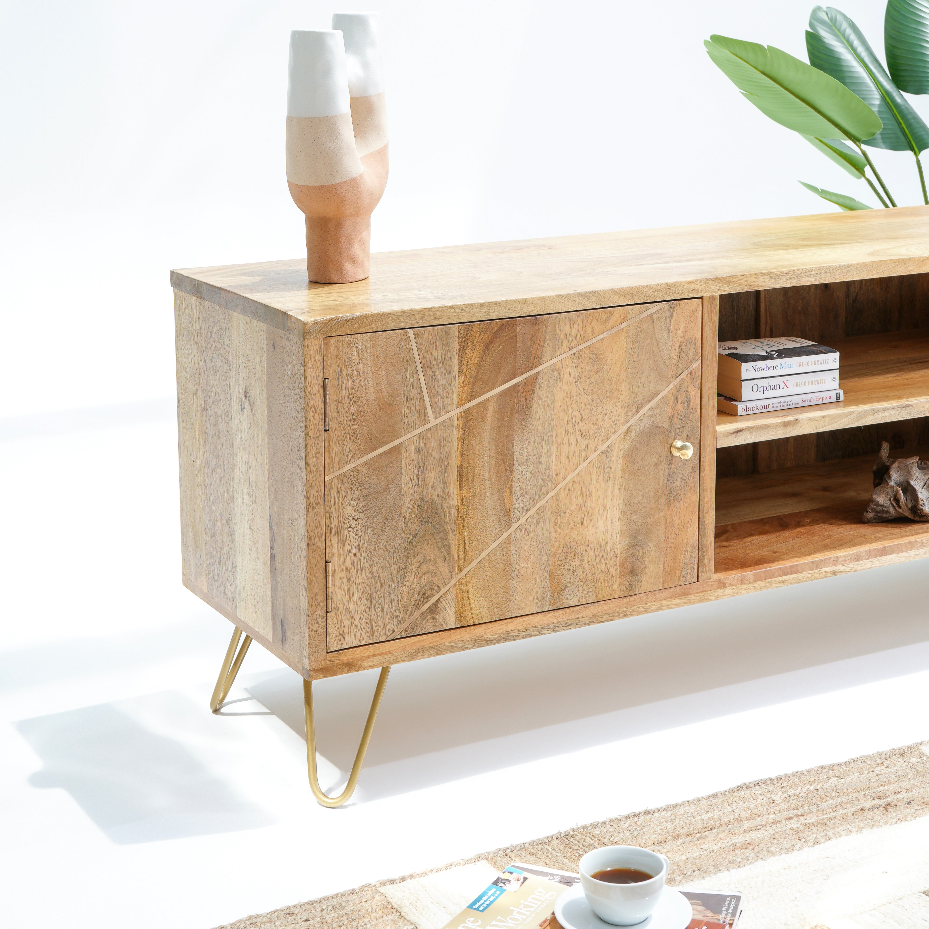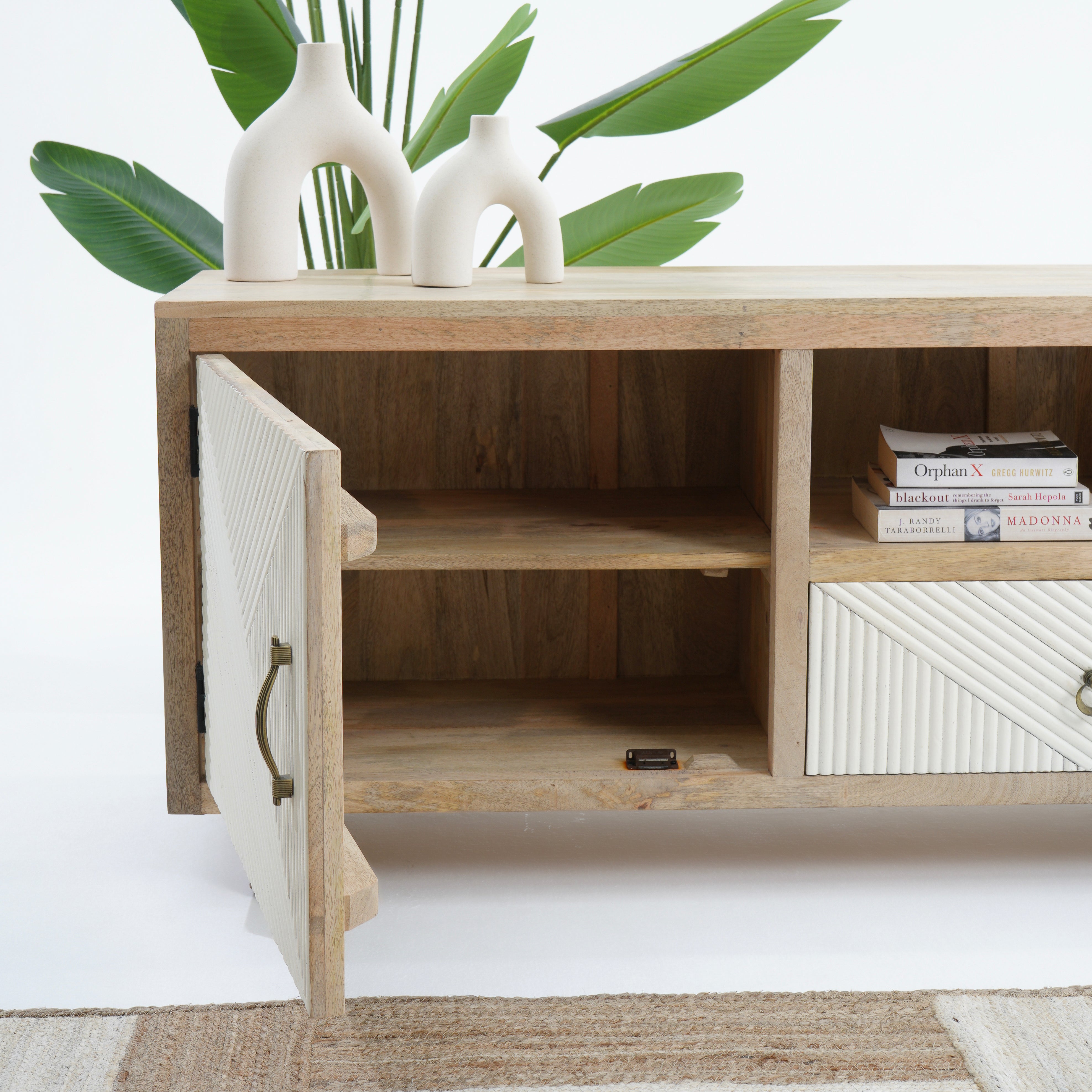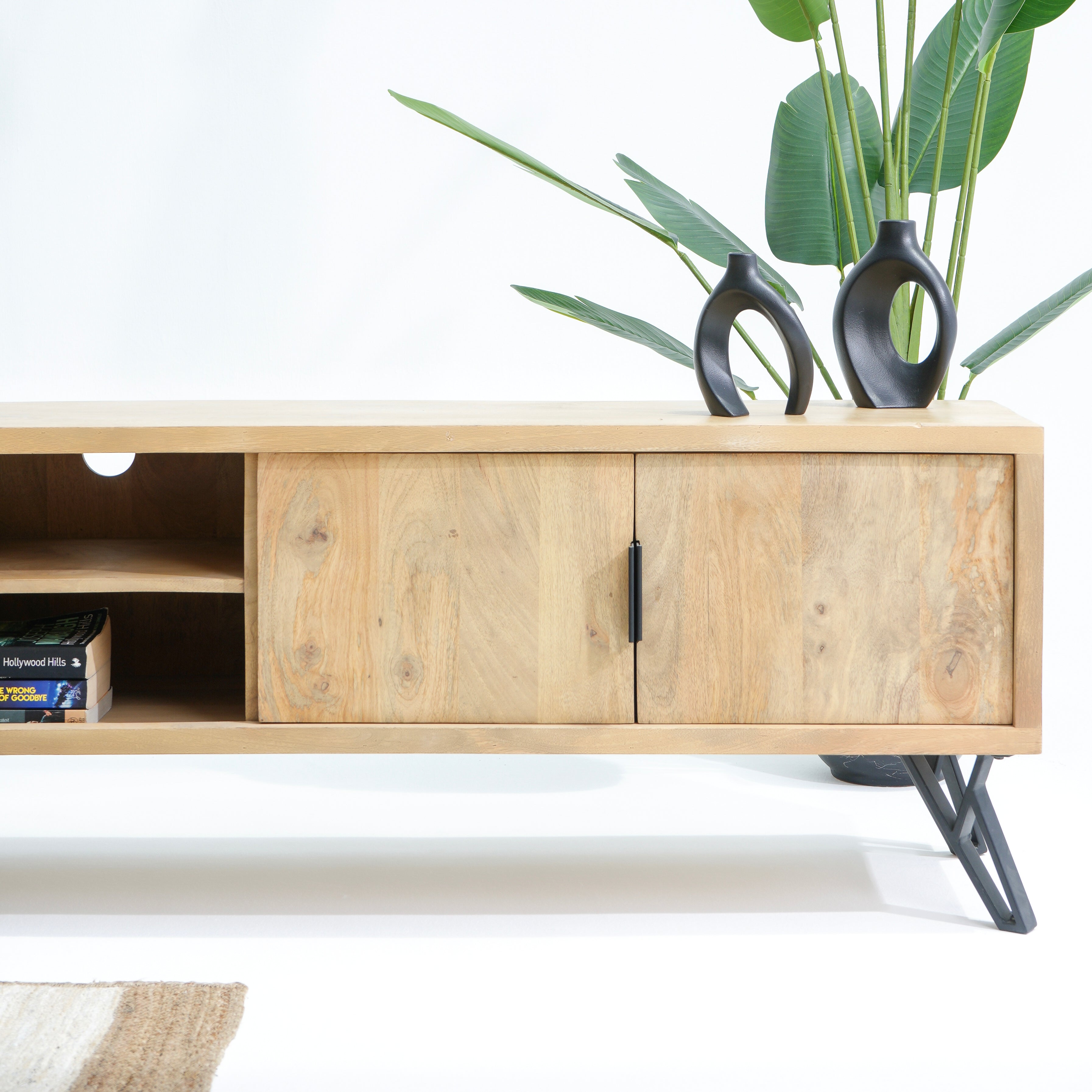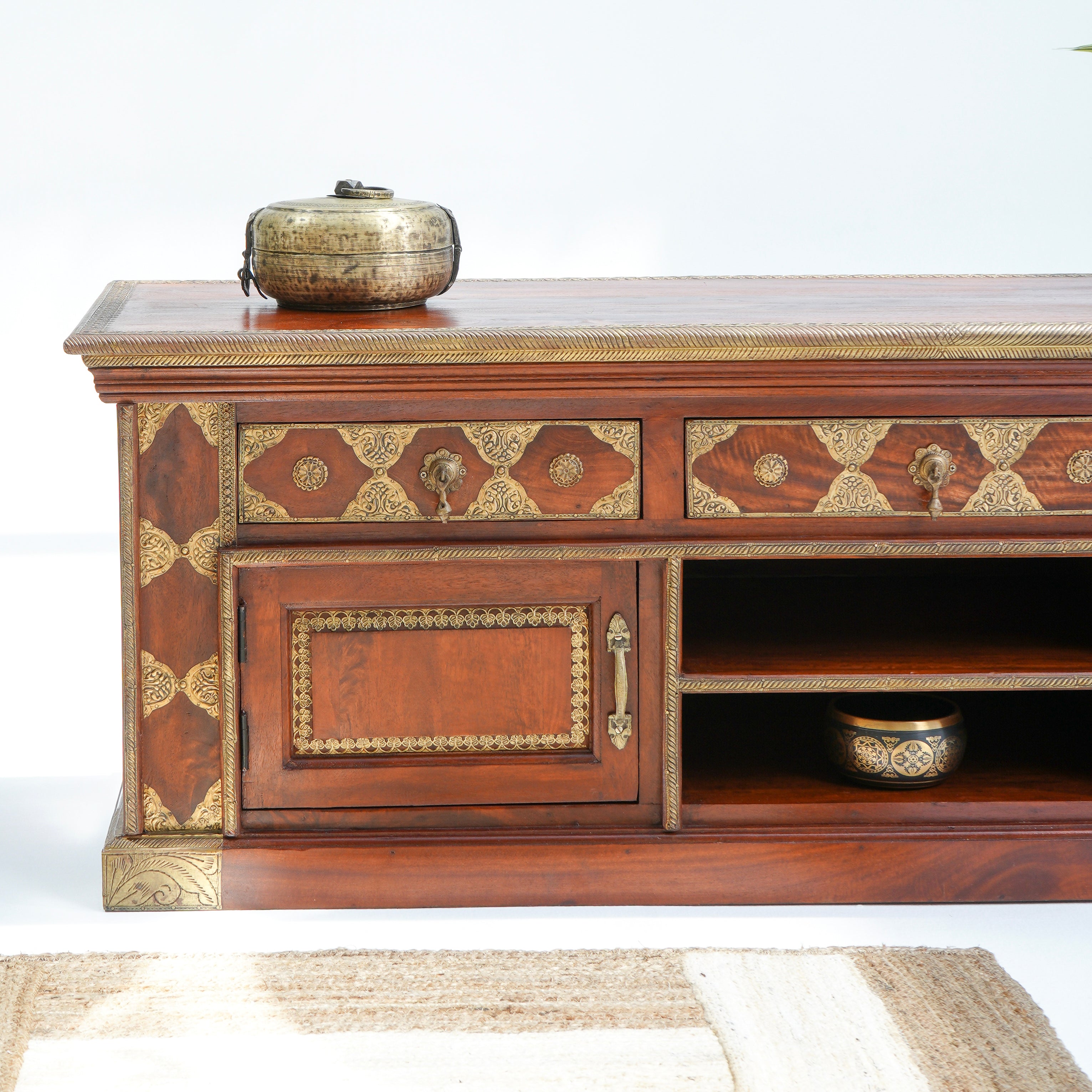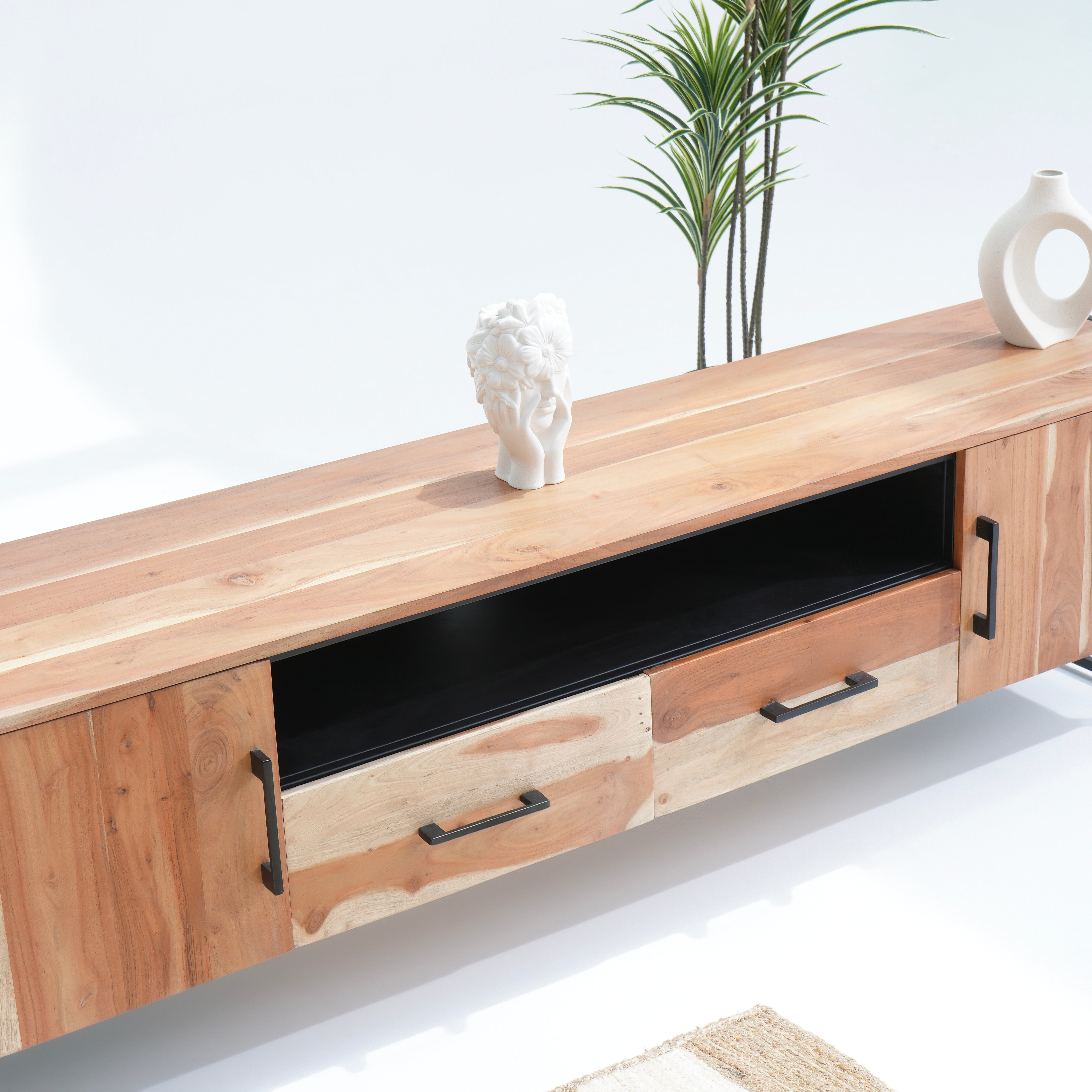 تتميز وحدات الوسائط هذه، المصنوعة من أخشاب صلبة فاخرة ومتينة مثل خشب الشيشم أو المانجو أو الساج، بما يلي: