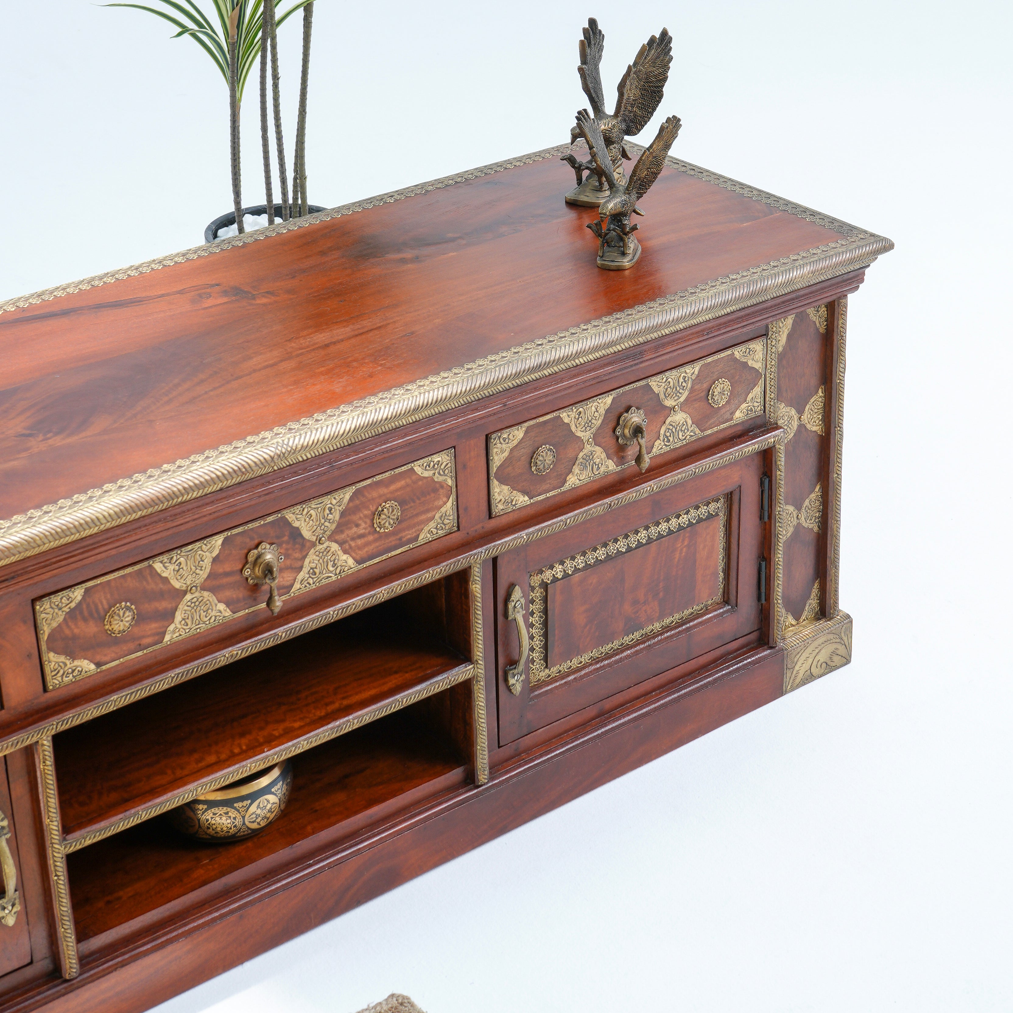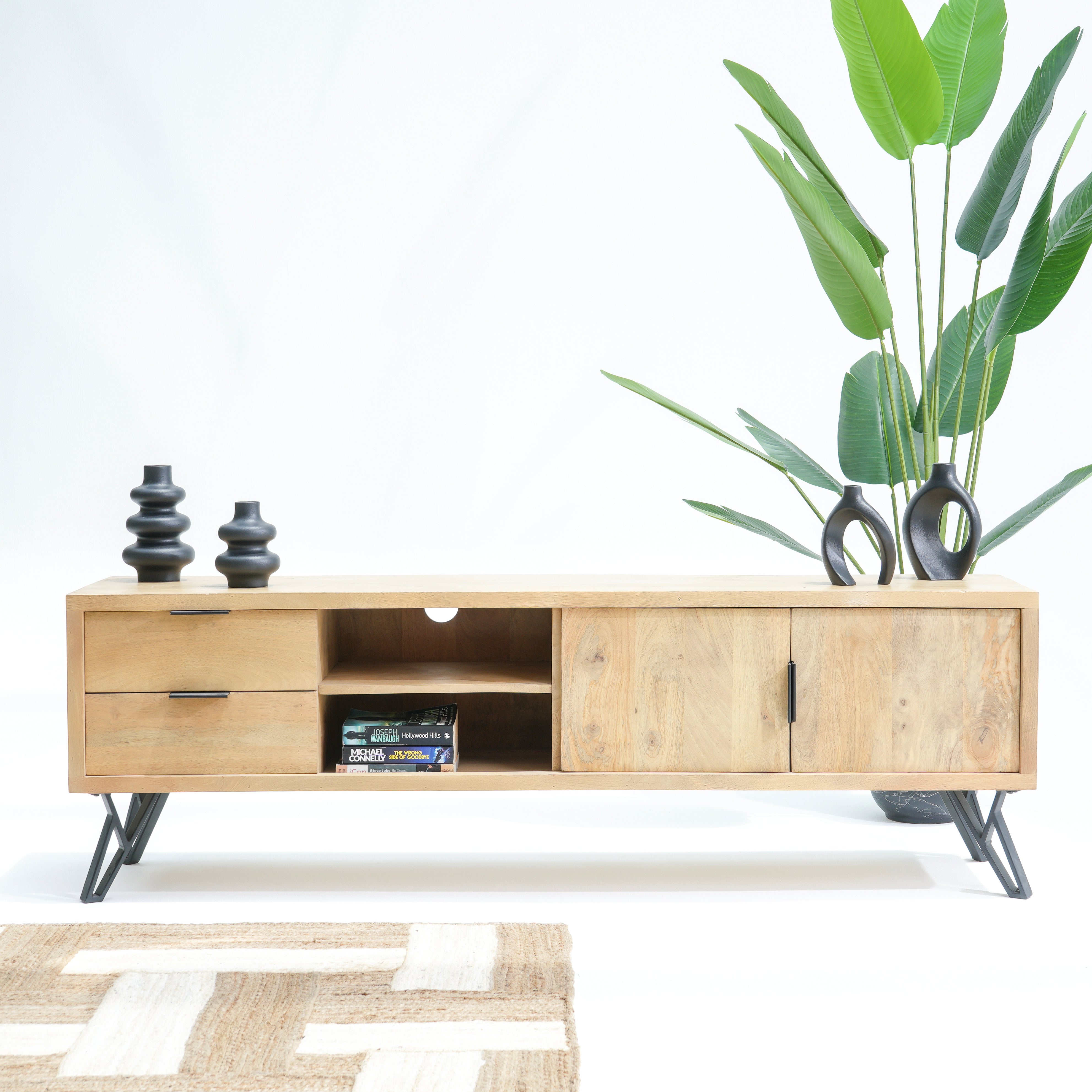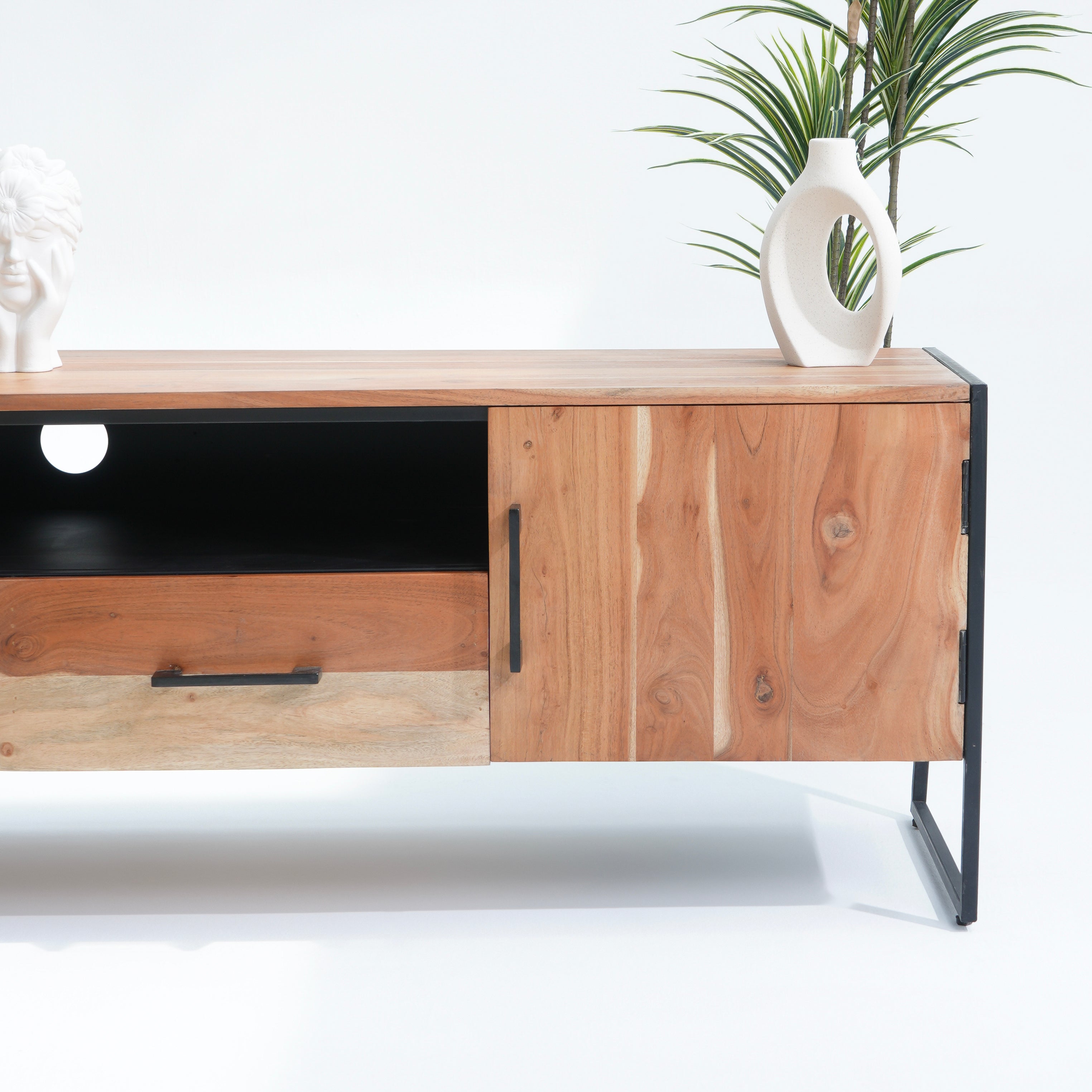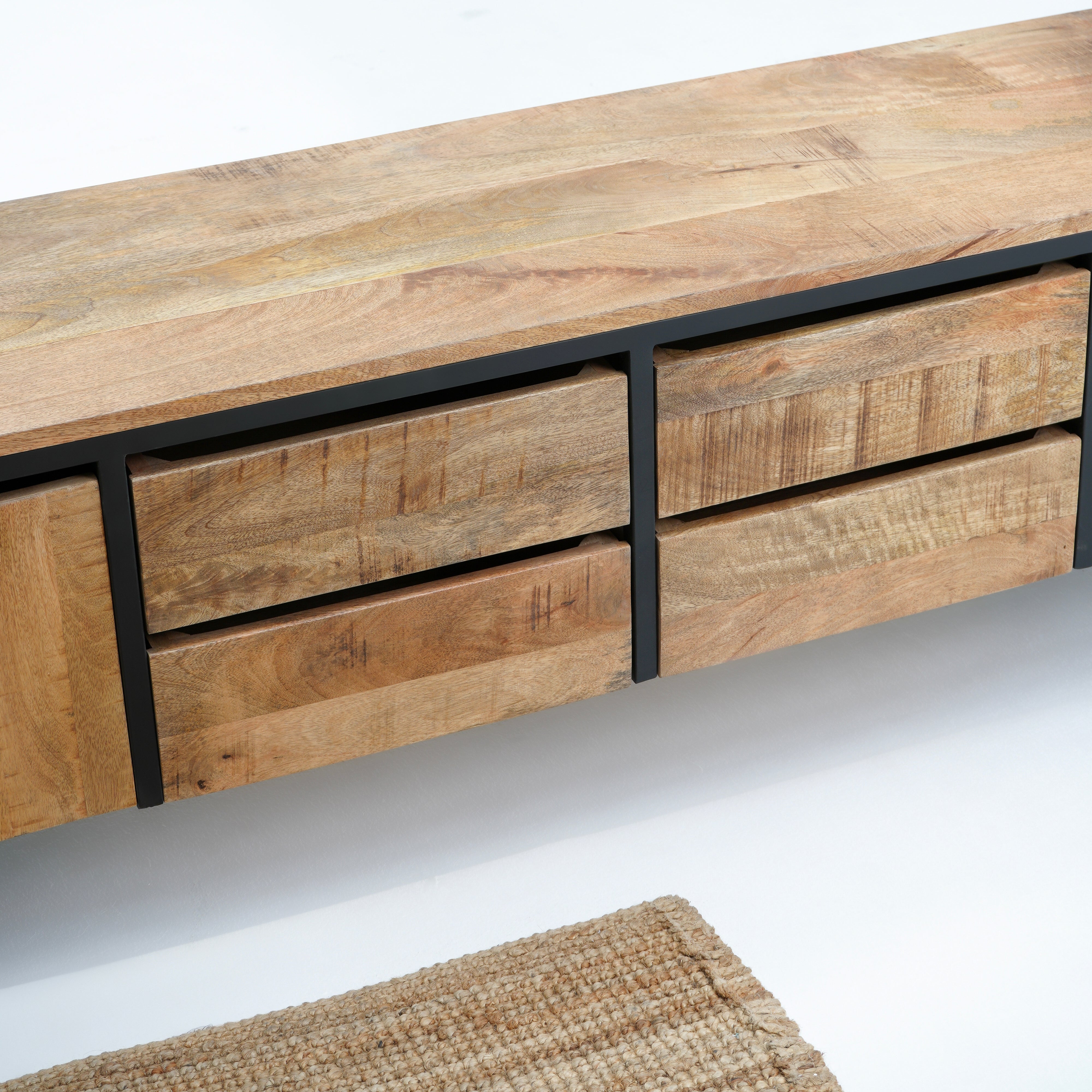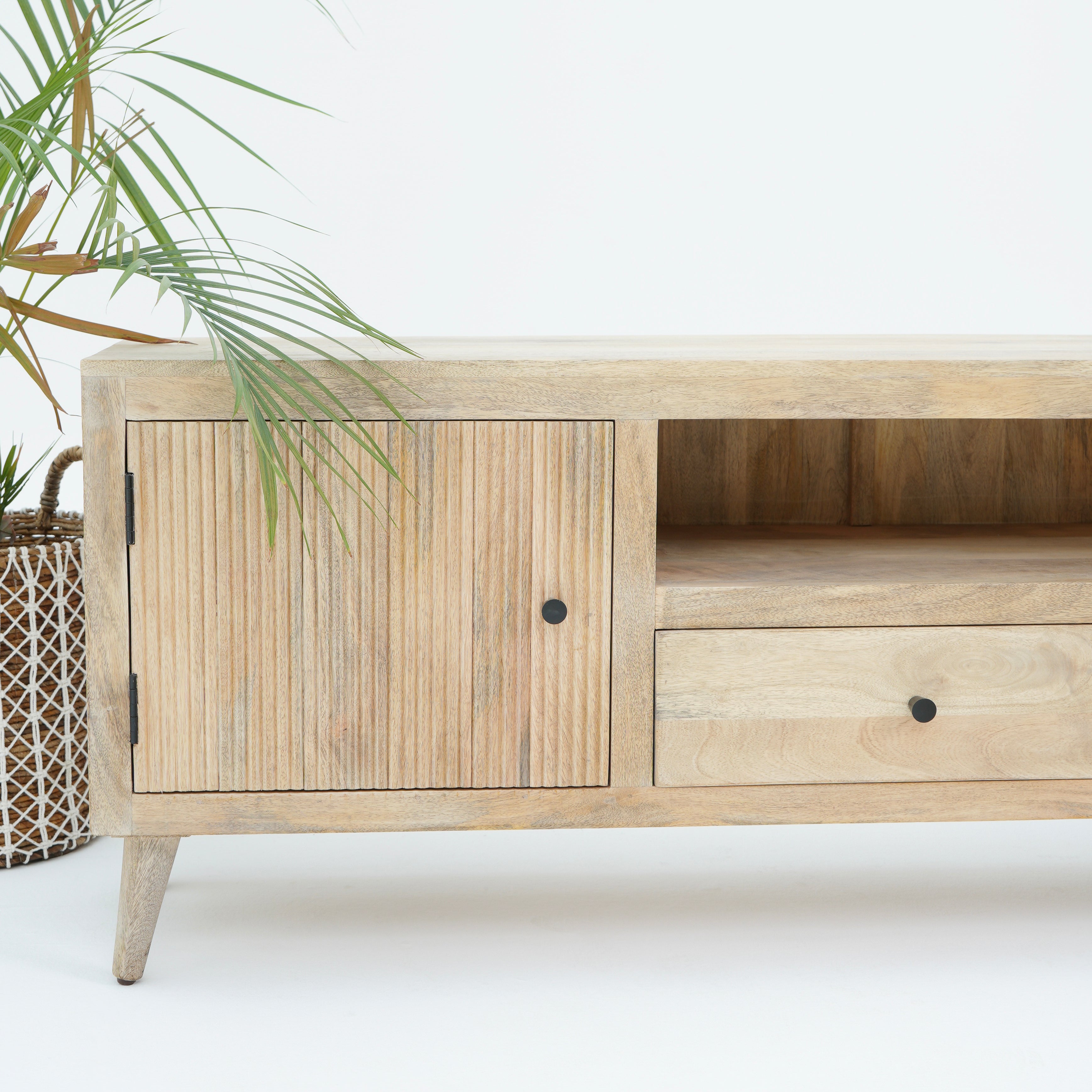 تتميز وحدات الوسائط هذه، المصنوعة من أخشاب صلبة فاخرة ومتينة مثل خشب الشيشم أو المانجو أو الساج، بما يلي: