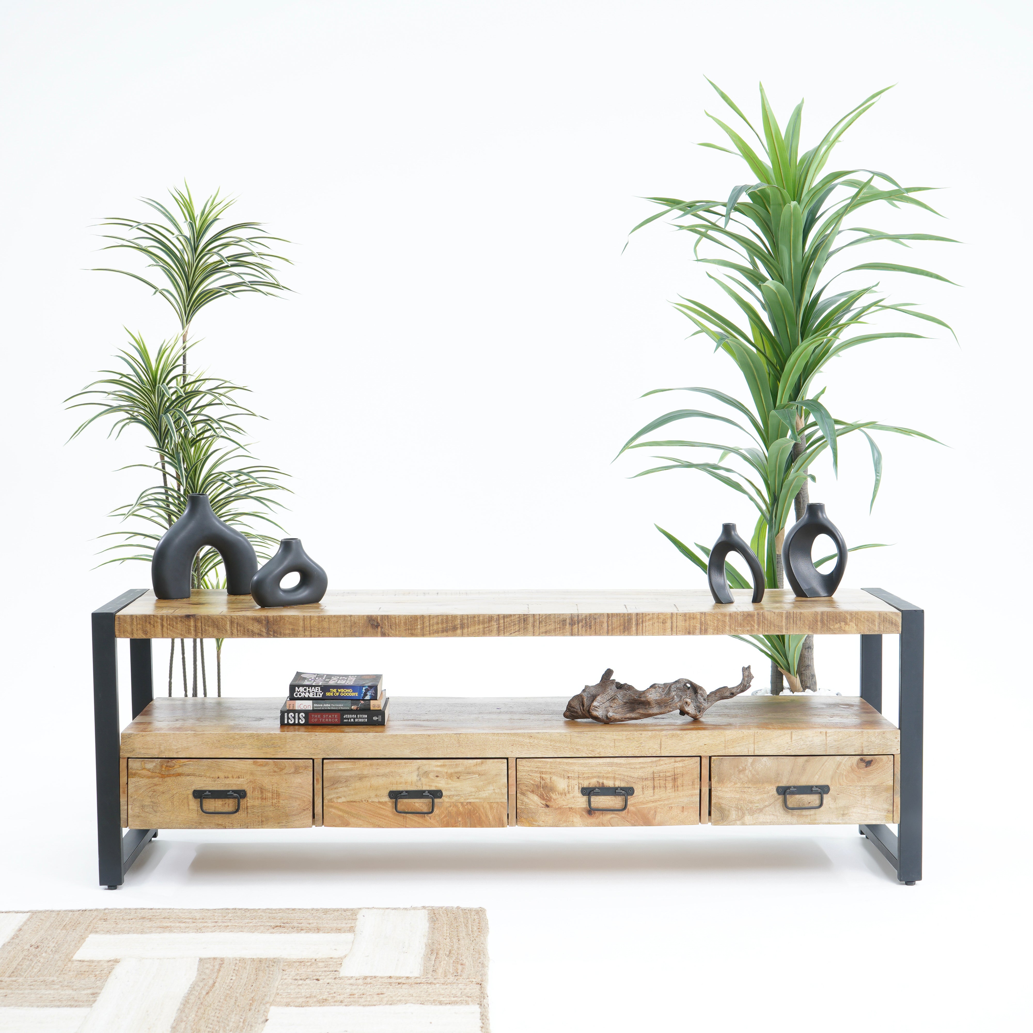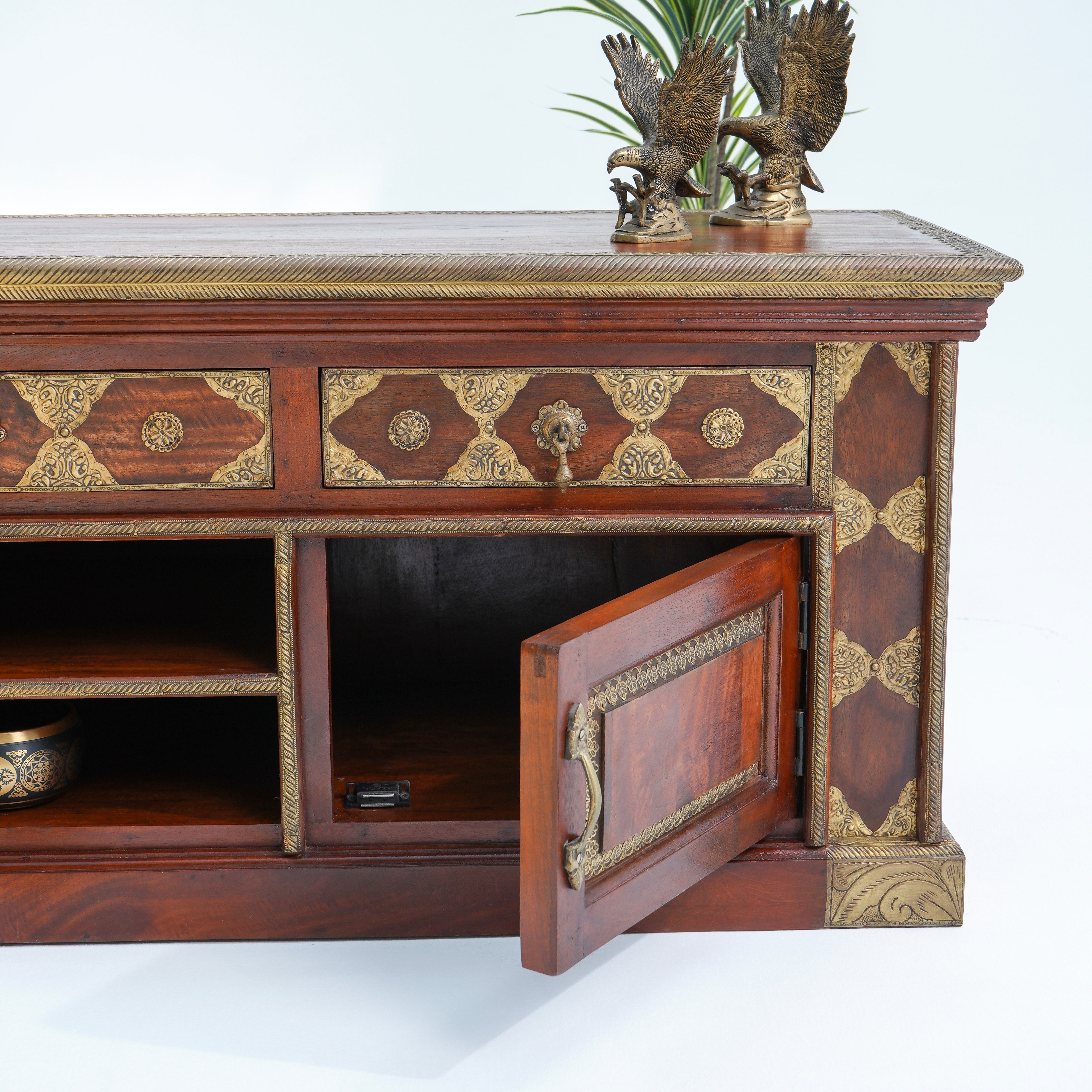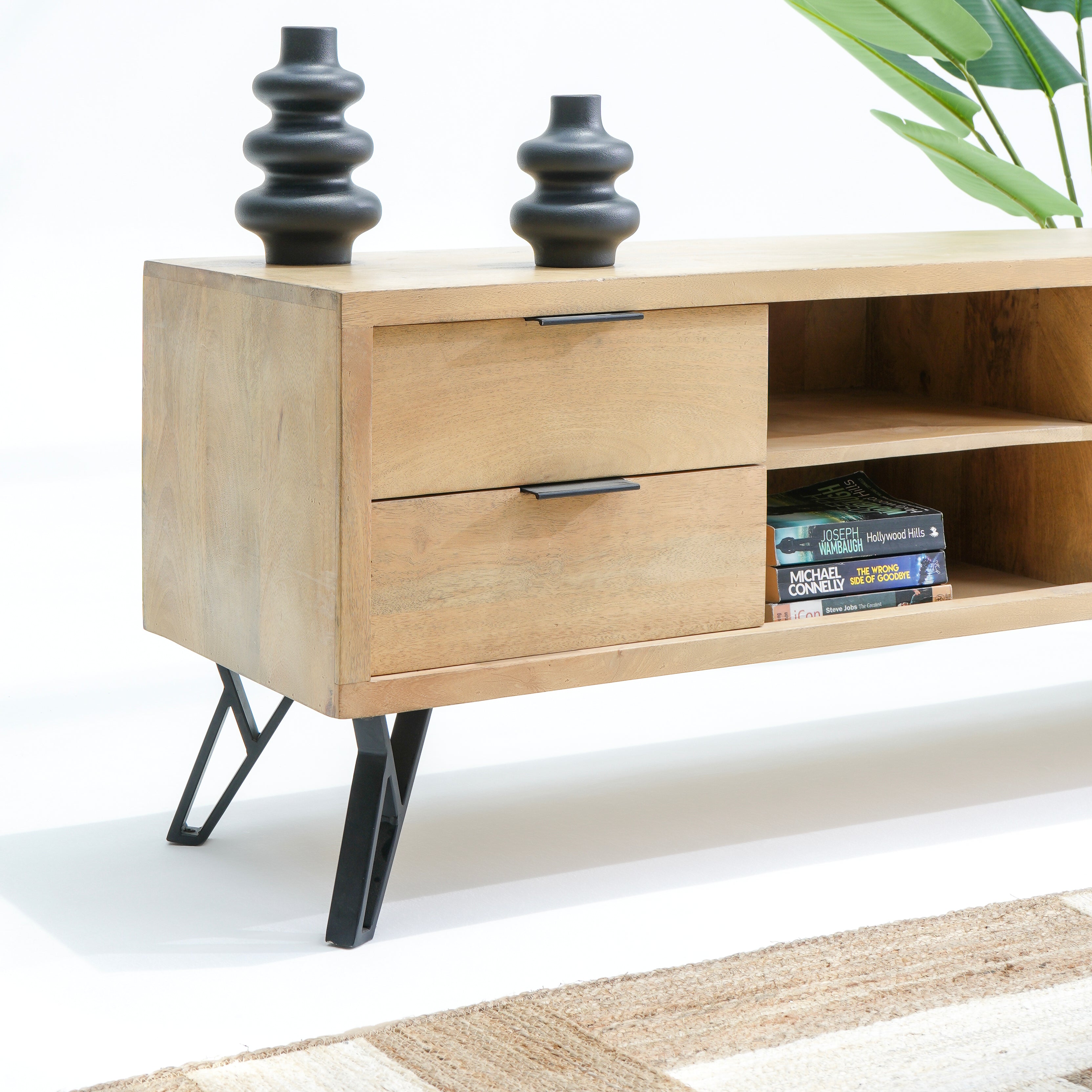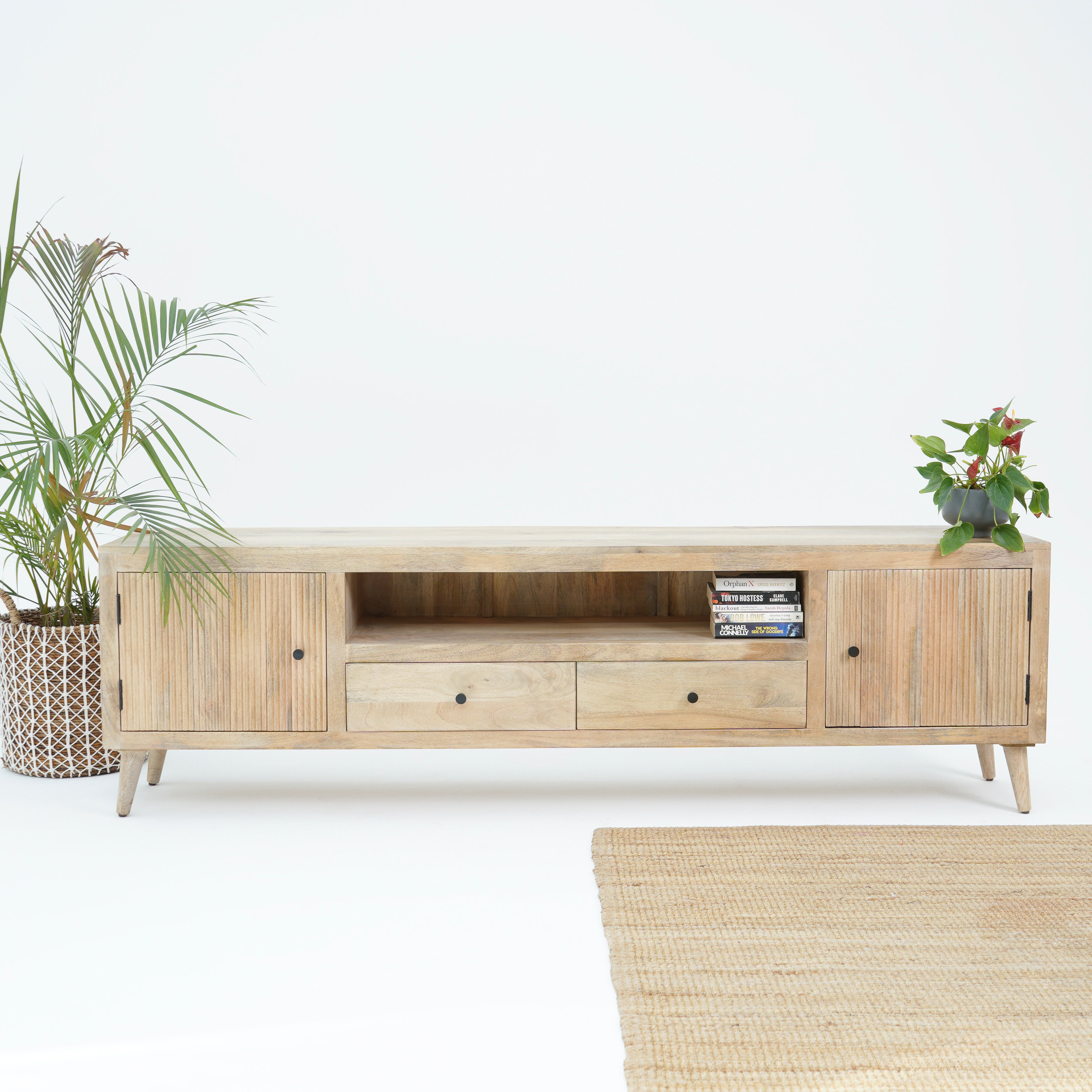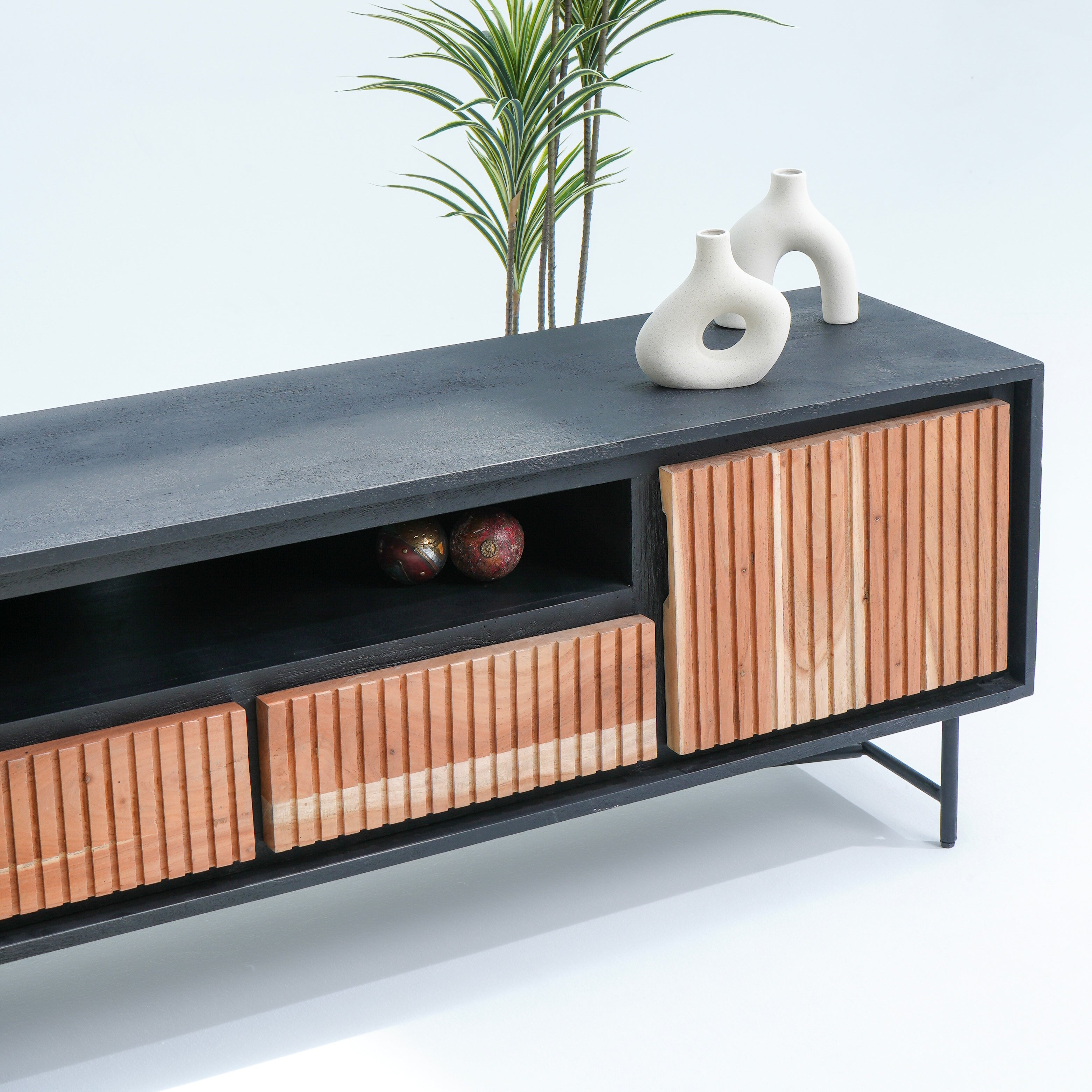 تتميز وحدات الوسائط هذه، المصنوعة من أخشاب صلبة فاخرة ومتينة مثل خشب الشيشم أو المانجو أو الساج، بما يلي: