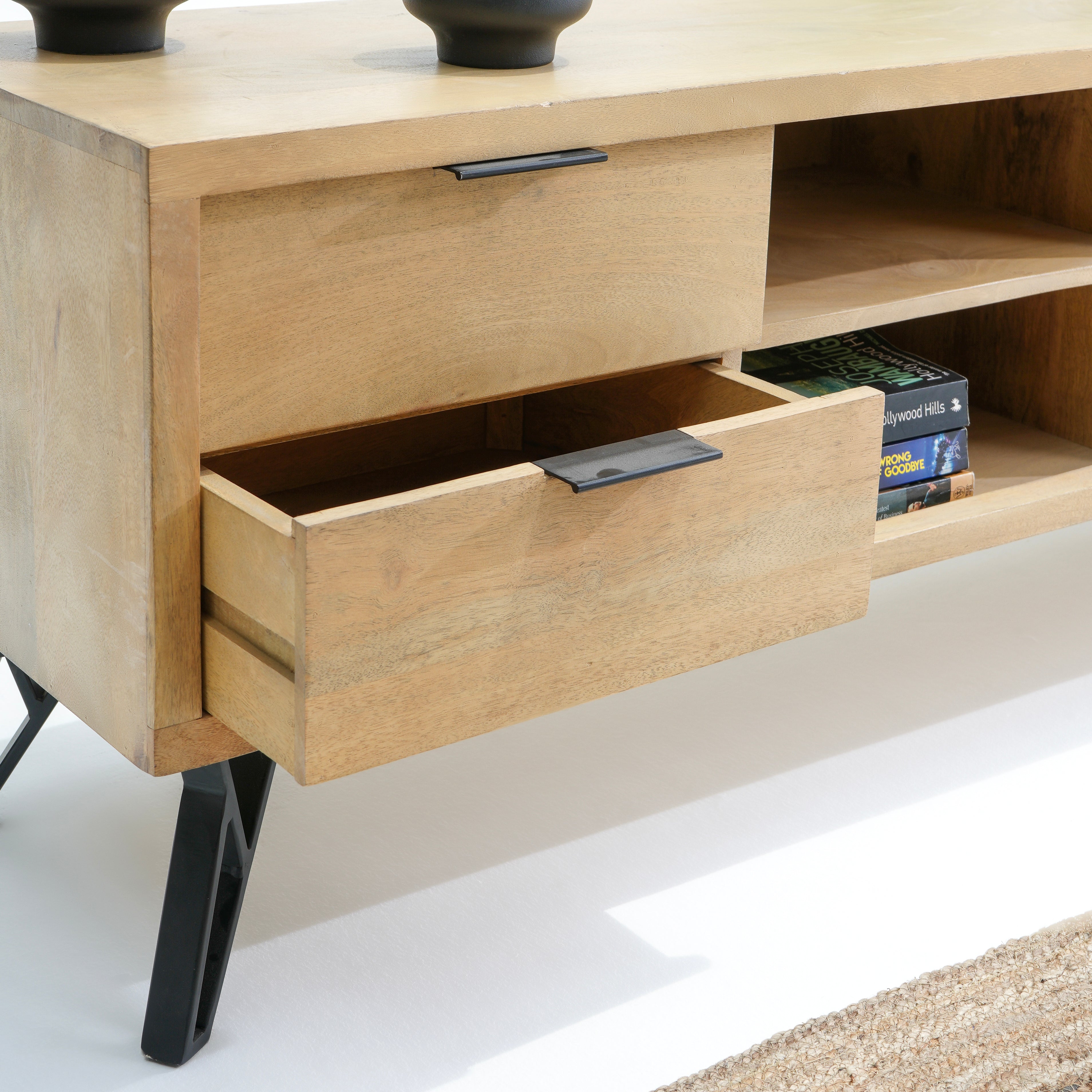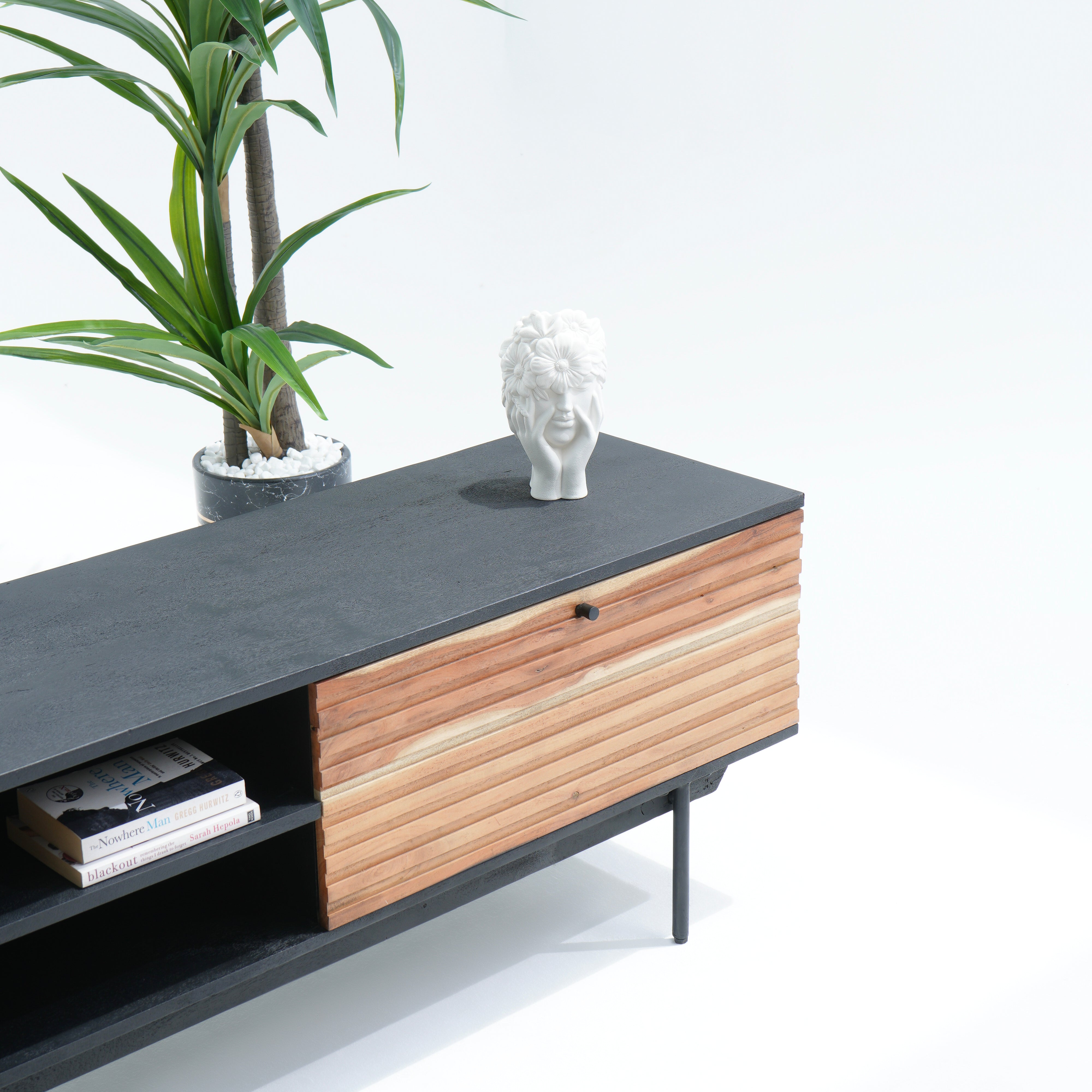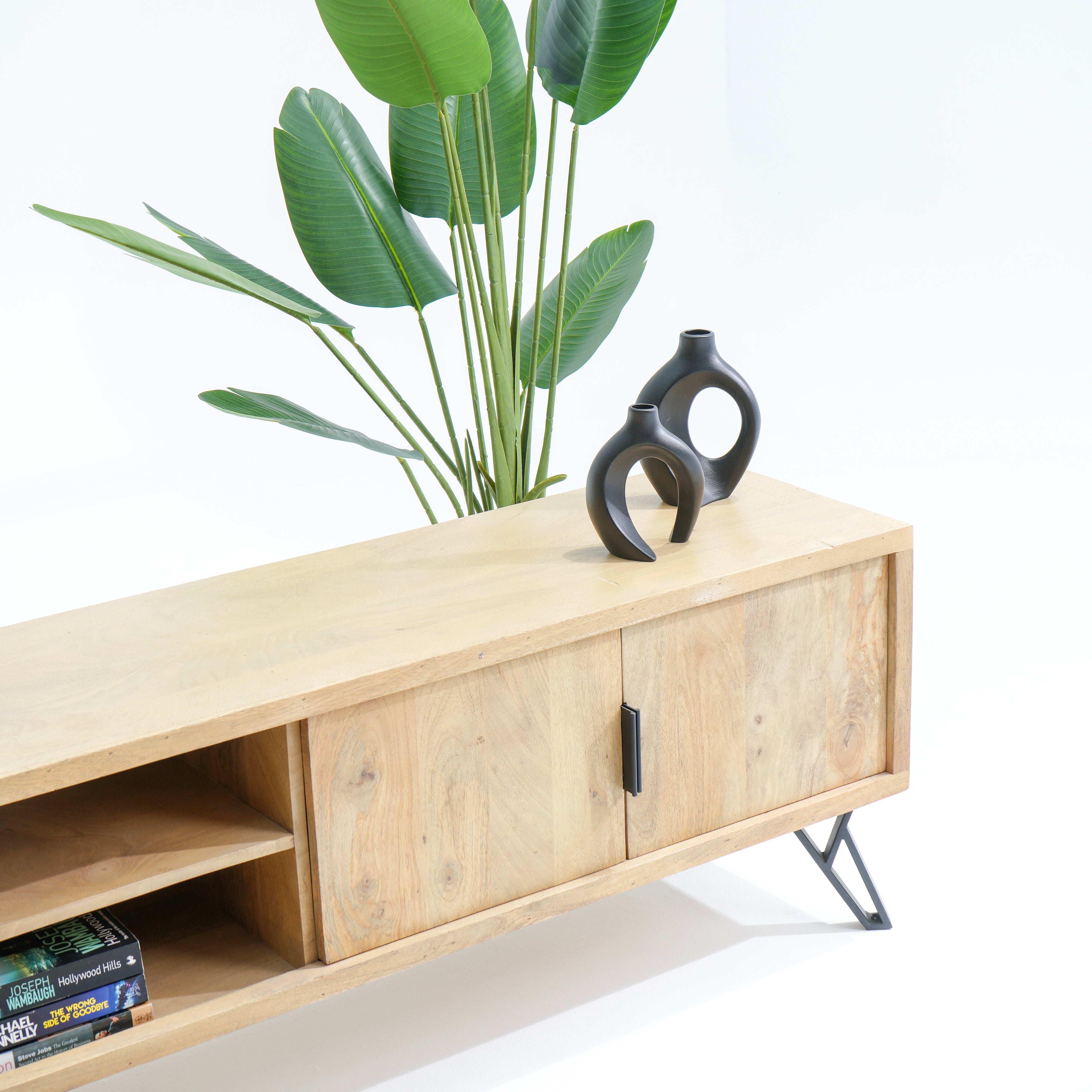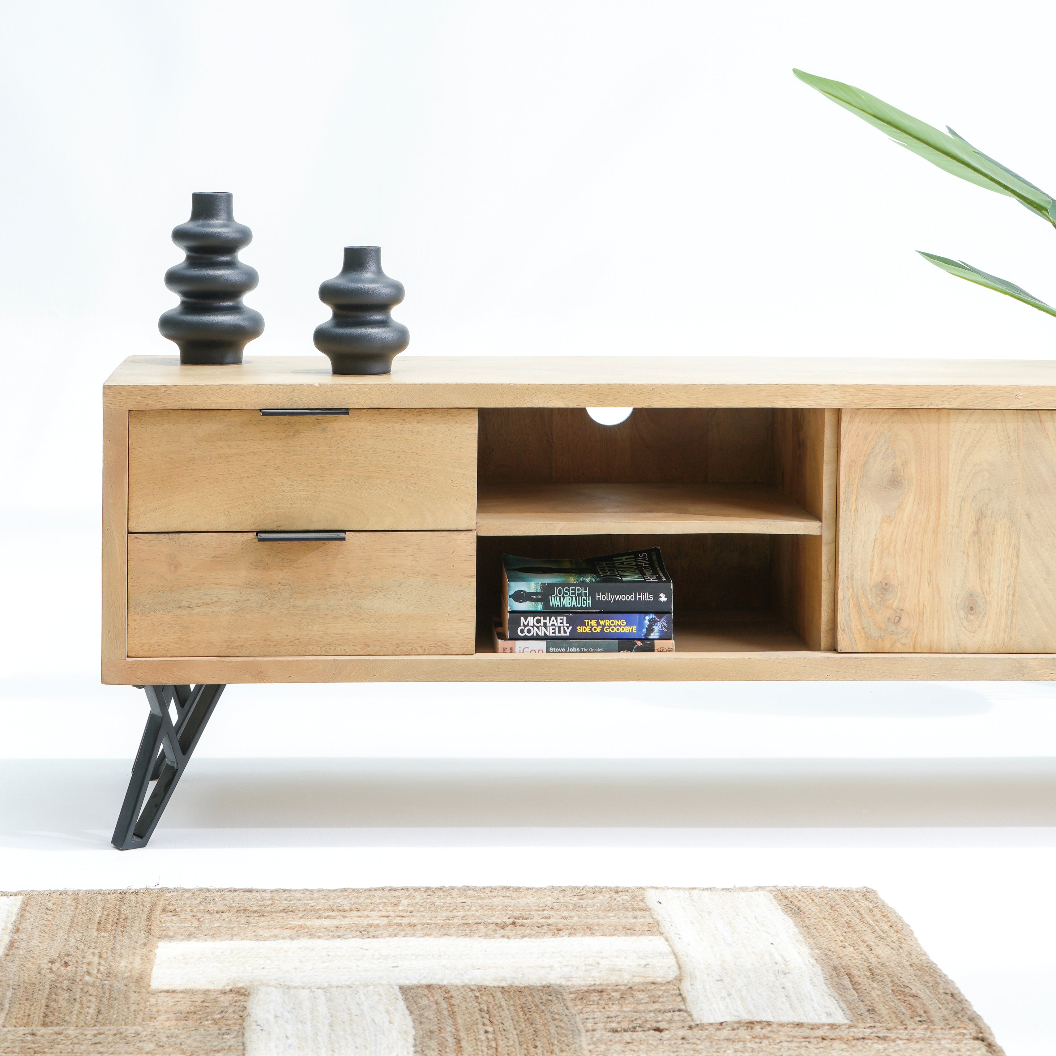 تتميز وحدات الوسائط هذه، المصنوعة من أخشاب صلبة فاخرة ومتينة مثل خشب الشيشم أو المانجو أو الساج، بما يلي: