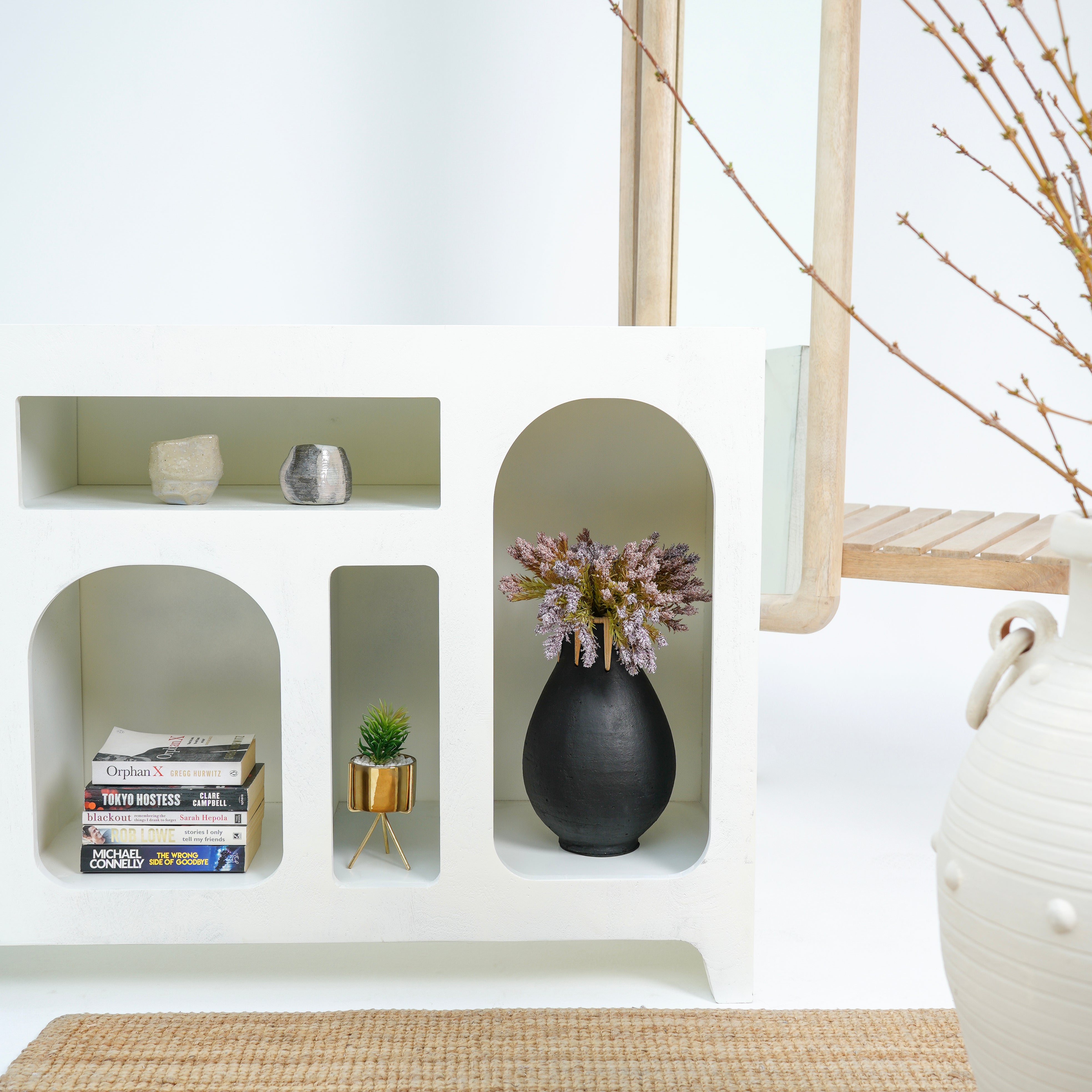 تُقدّم خزانة "آرتش" الجانبية البيضاء المفتوحة حلاً أنيقاً وعصرياً للتخزين بفضل تصميمها المفتوح، مما يُسهّل الوصول إلى أغراضك الأساسية مع الحفاظ على ترتيب مساحتك. يُكمّل لونها الأبيض النقي أي ديكور، مضيفاً لمسة من الأناقة والإشراق إلى غرفتك. تُعدّ هذه الخزانة مثالية لعرض القطع الزخرفية أو تخزين المستلزمات اليومية، فهي تجمع بين الأناقة والعملية لتلبية احتياجاتك في تنظيم منزلك.