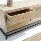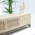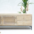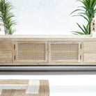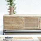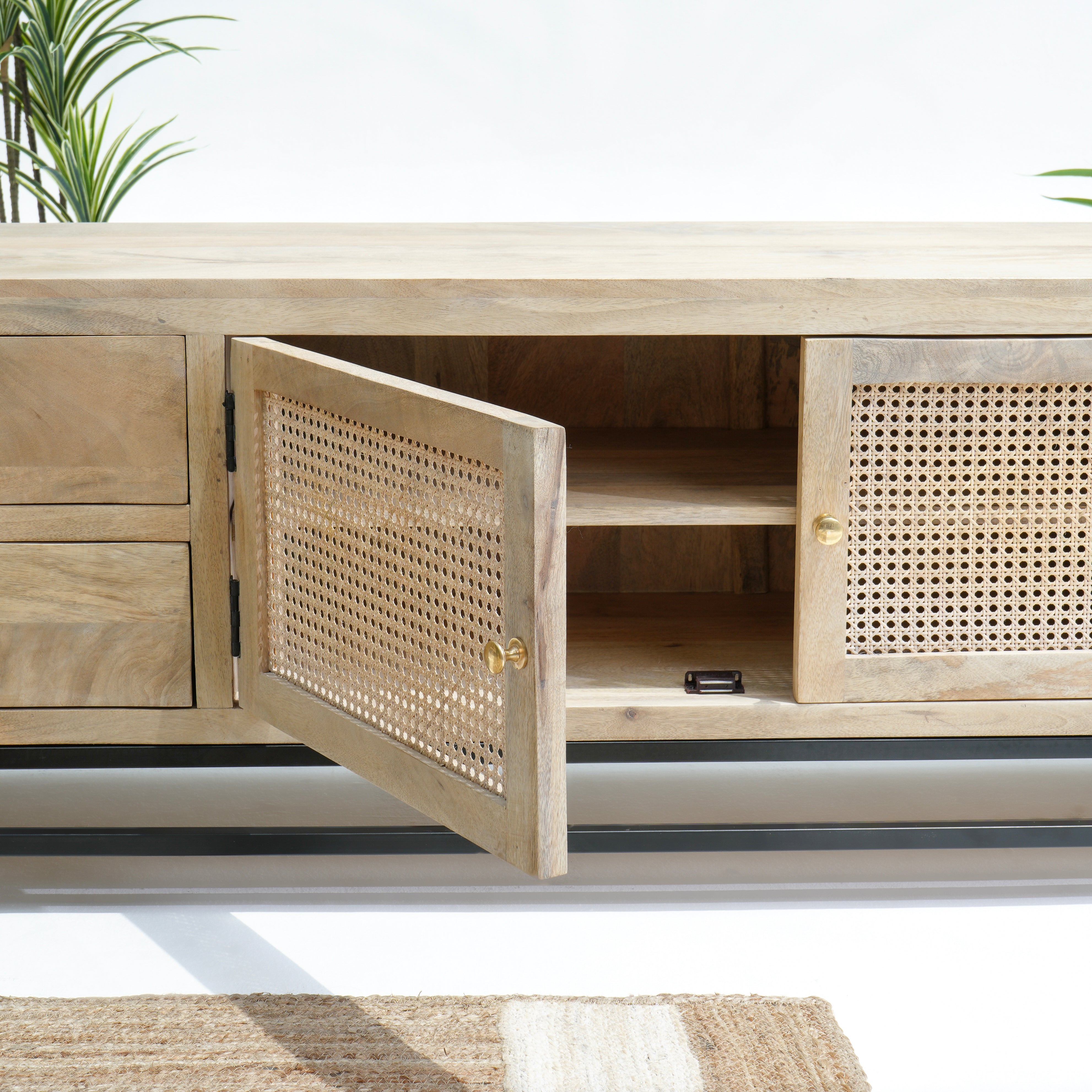 أضف لمسة من الأناقة الخالدة والسحر الطبيعي إلى مساحة معيشتك مع حامل التلفزيون المصنوع من قصب كانوفيا. يتميز هذا الحامل، المصنوع يدويًا من خشب المانجو الصلب الفاخر، بأبواب من قصب الروطان المنسوجة يدويًا بدقة، والتي تمزج بين الحرفية اليدوية والتصميم العملي.