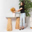 تجمع طاولة الكونسول الرخامية من تيرالوكس بين الأناقة الخالدة والتصميم العملي. تتميز بسطح رخامي فاخر يبرز عروقه الطبيعية وتدرجات ألوانه الرقيقة، مما يجعلها قطعةً مميزةً وجذابةً في آنٍ واحد، وسطحًا عمليًا مثاليًا للمداخل وغرف المعيشة والممرات. توفر الأرجل الخشبية المتينة بلمستها النهائية الطبيعية تباينًا دافئًا مع برودة الرخام، لتخلق جمالية راقية تُناسب الديكورات الداخلية العصرية والكلاسيكية على حدٍ سواء. بفضل متانتها وتعدد استخداماتها، تُضفي هذه الطاولة لمسةً راقيةً على أي مساحة بفضل حرفيتها العالية وأسلوبها الخالد.