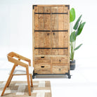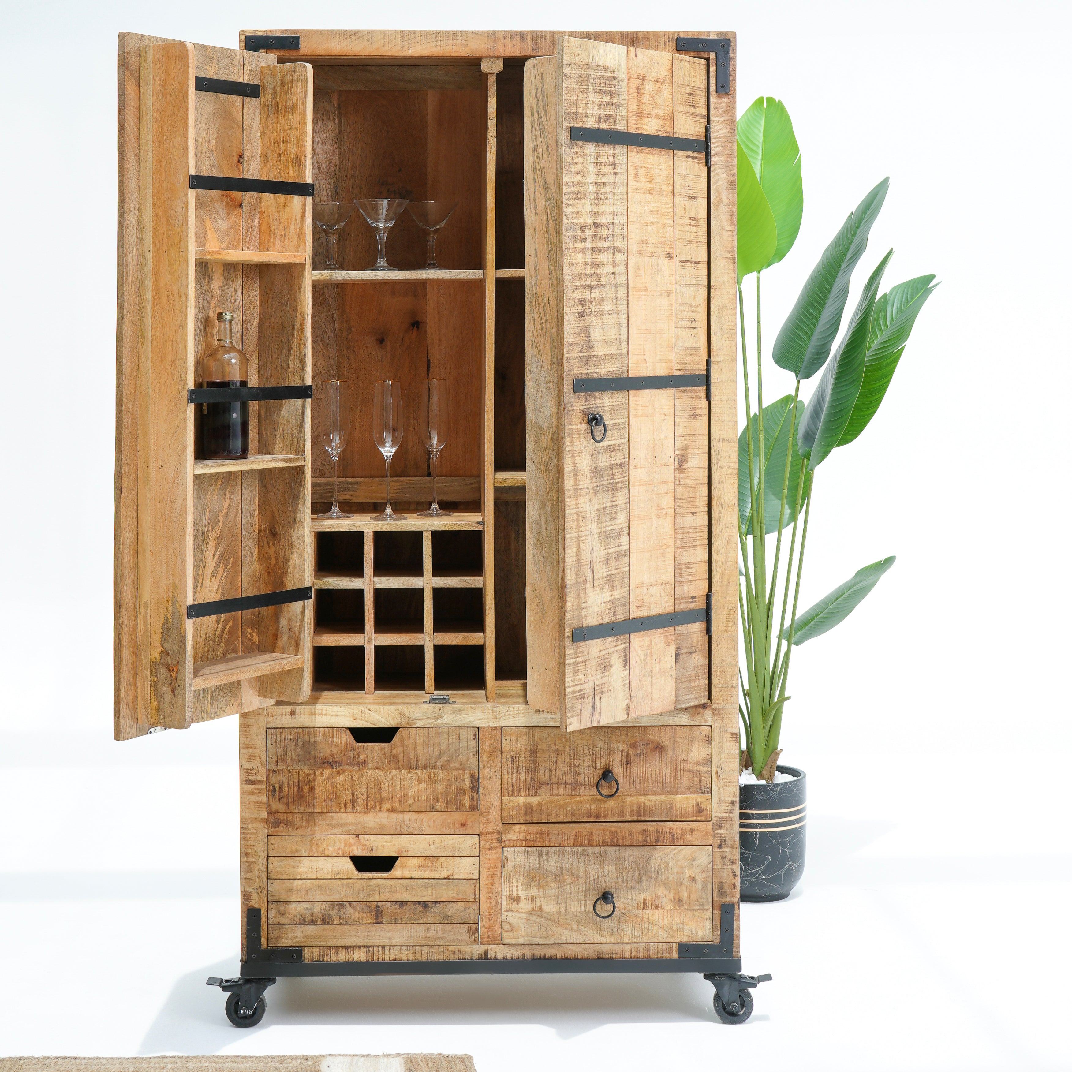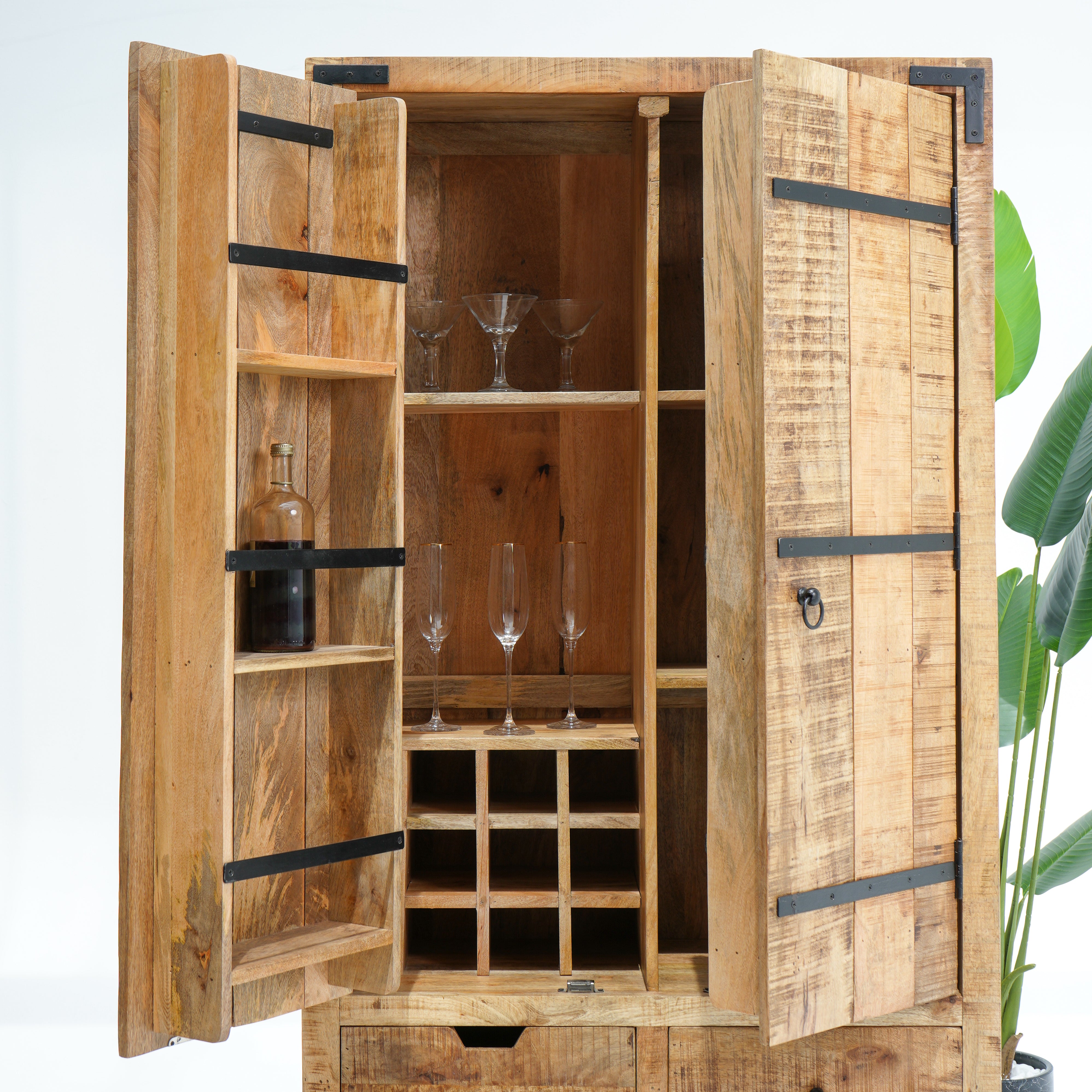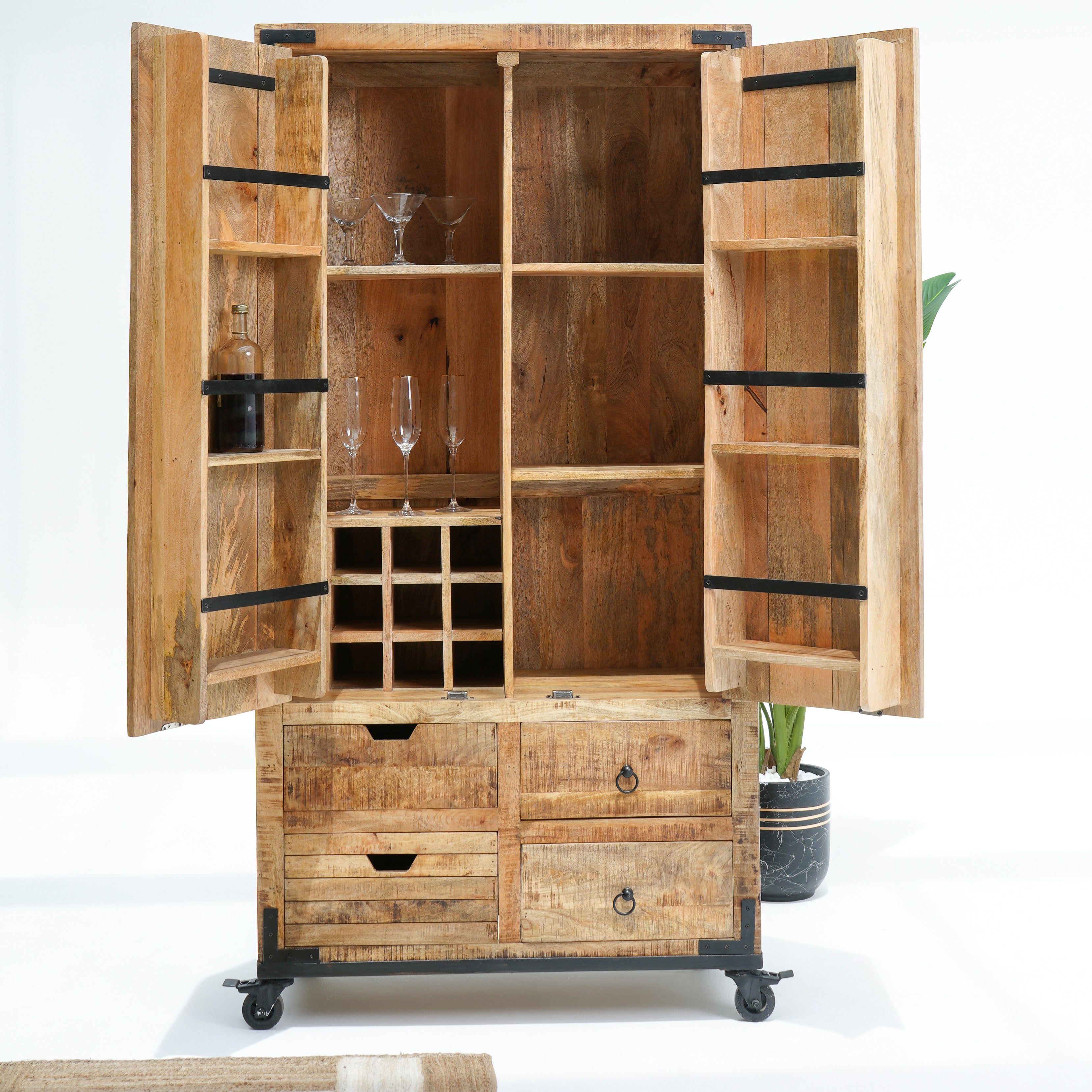 بفضل تشطيبها الخشبي العتيق وتجهيزاتها النحاسية، تُنظم هذه الخزانة المشروبات والأواني الزجاجية بأناقة، مما يجعلها قطعة مميزة للضيافة.