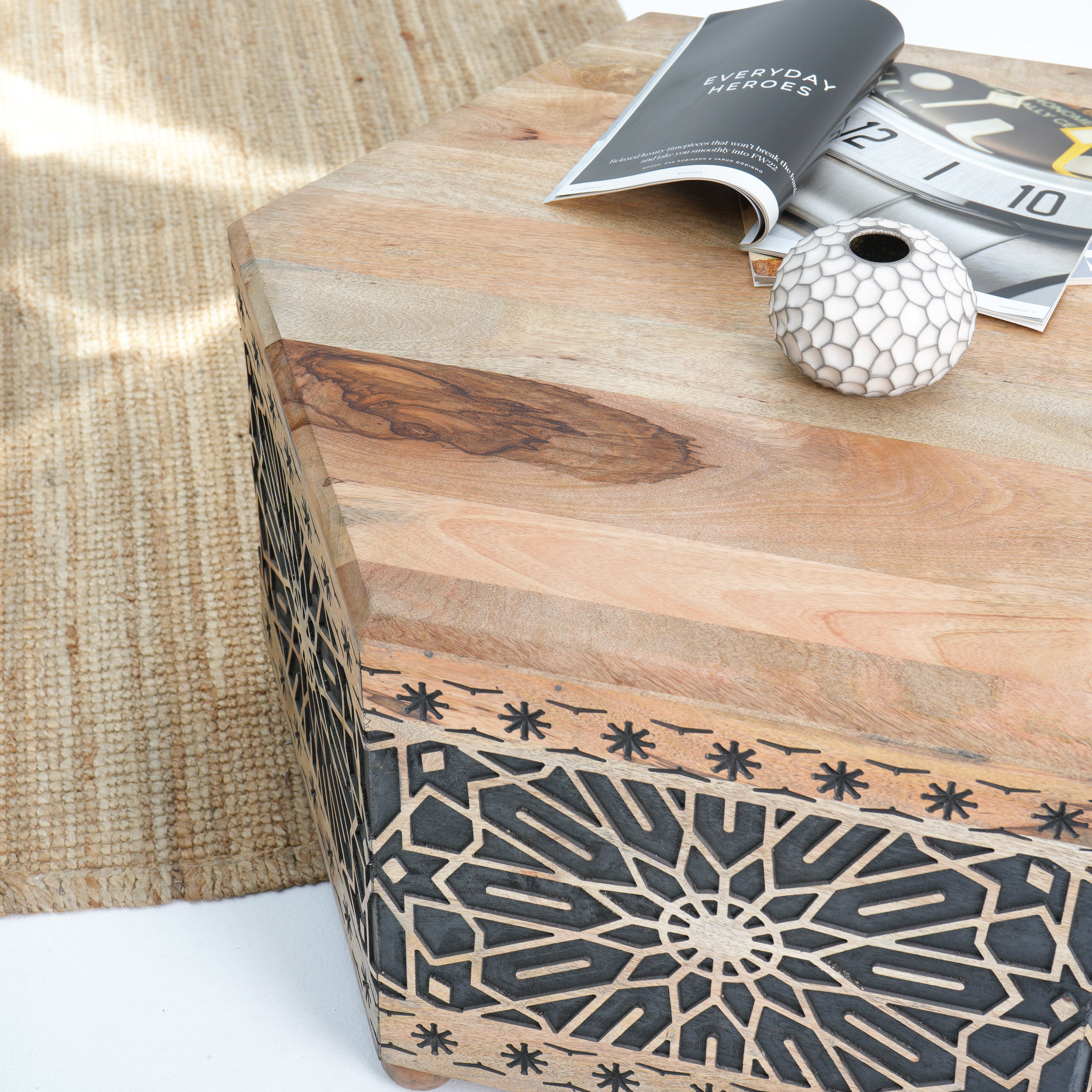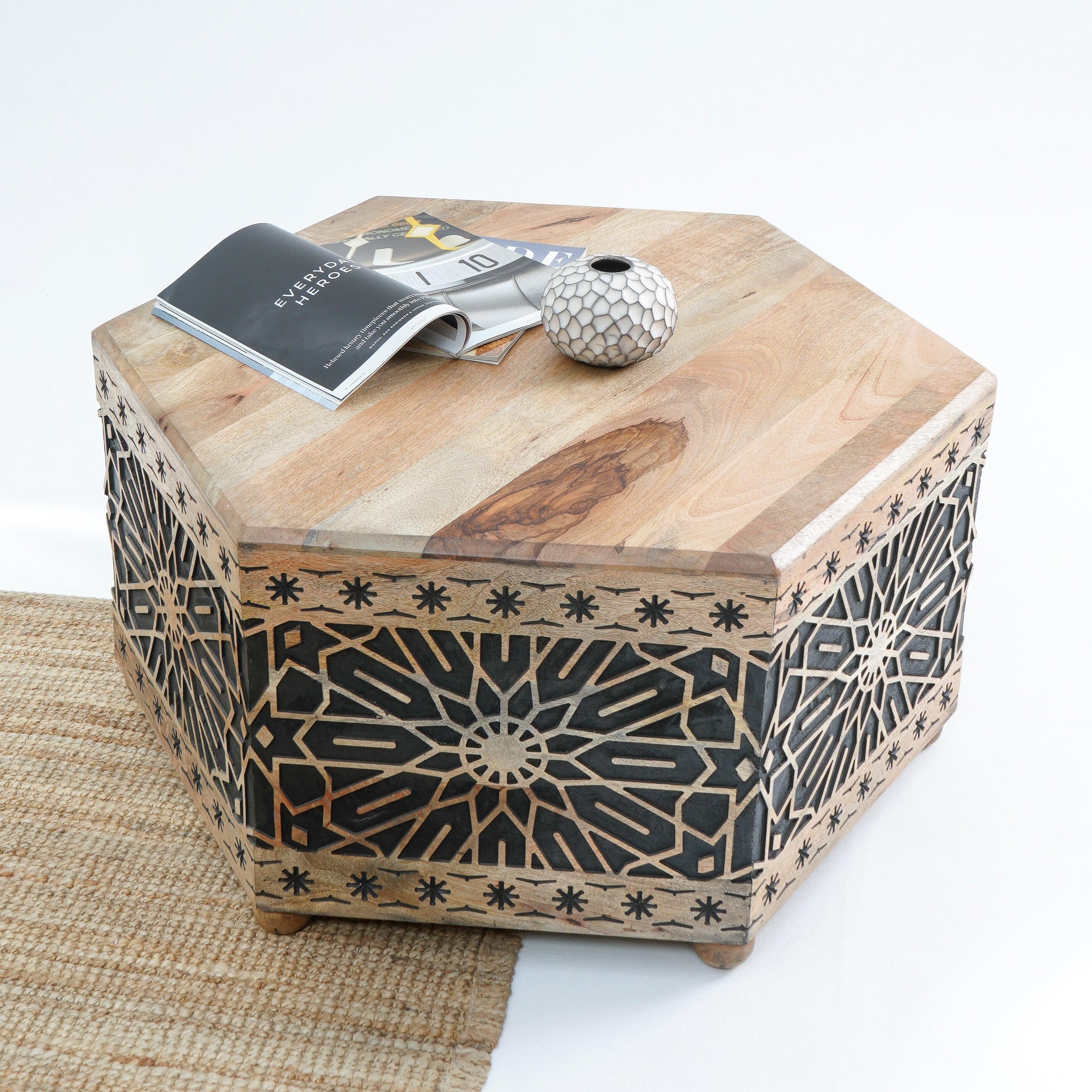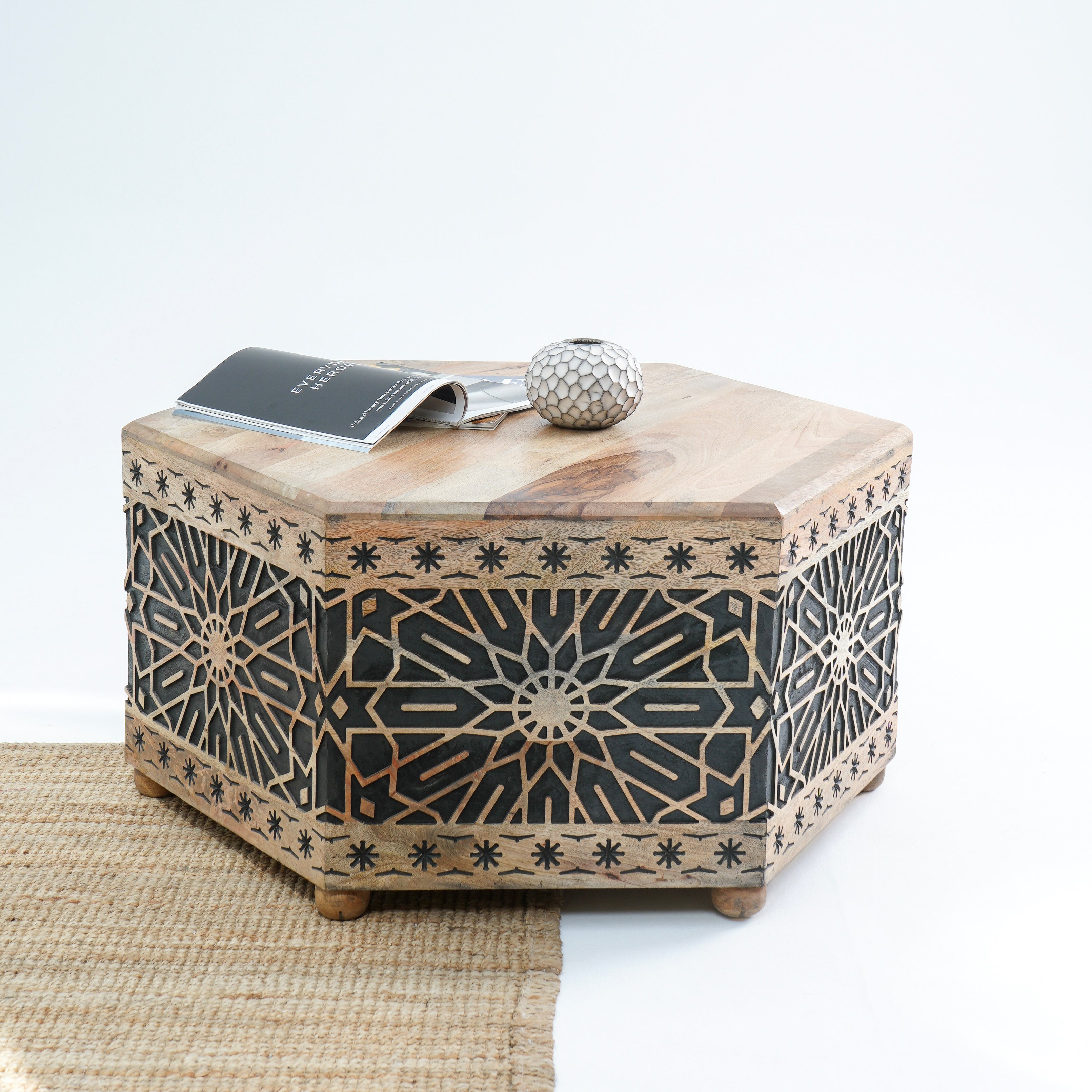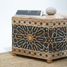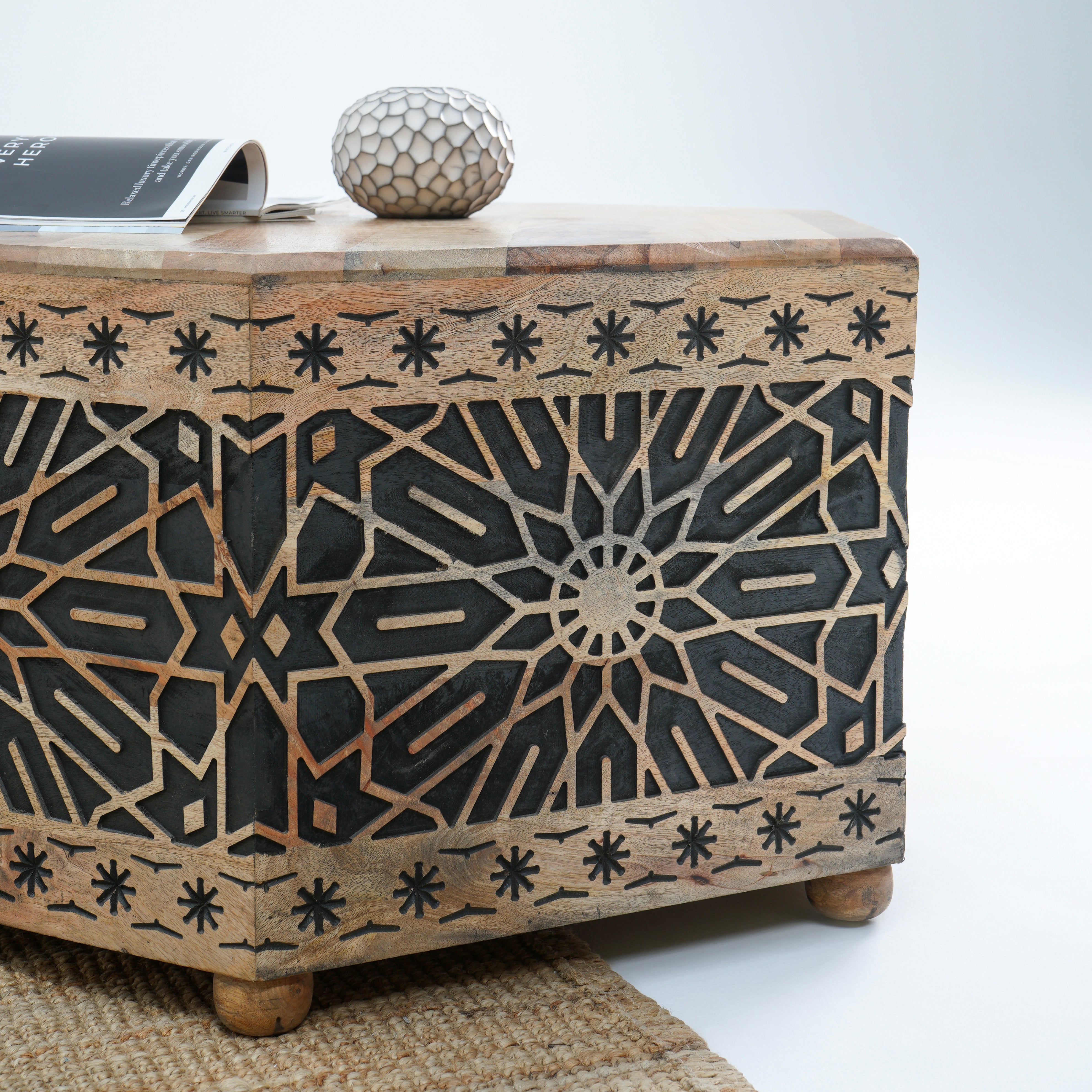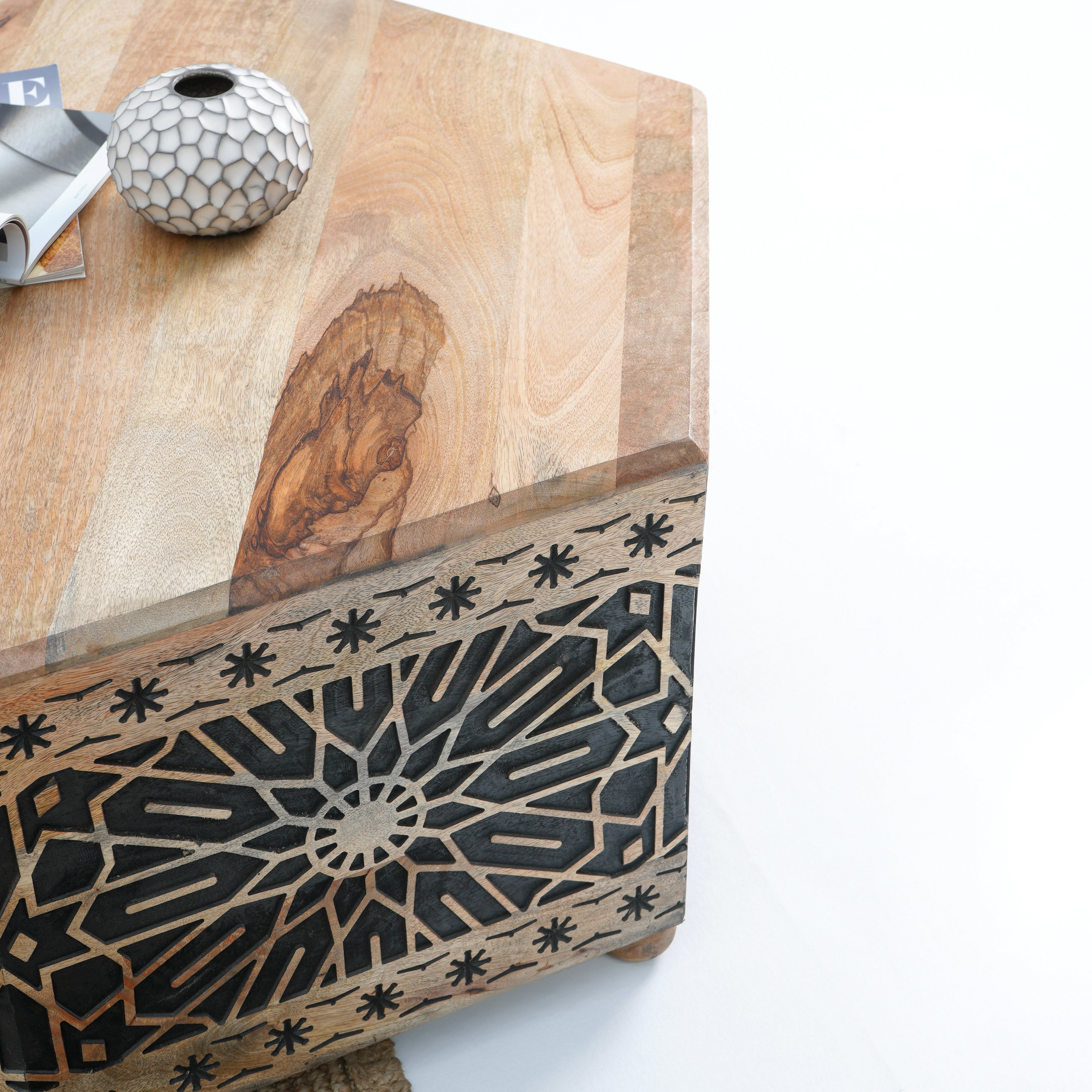 Introducing The Ivory cnc design black Coffee Table, a beautiful blend of solid wood and rustic charm. Handcrafted in India, this table is perfect for creating a warm, inviting atmosphere in your living space. Backed by a 1-year warranty for durability!