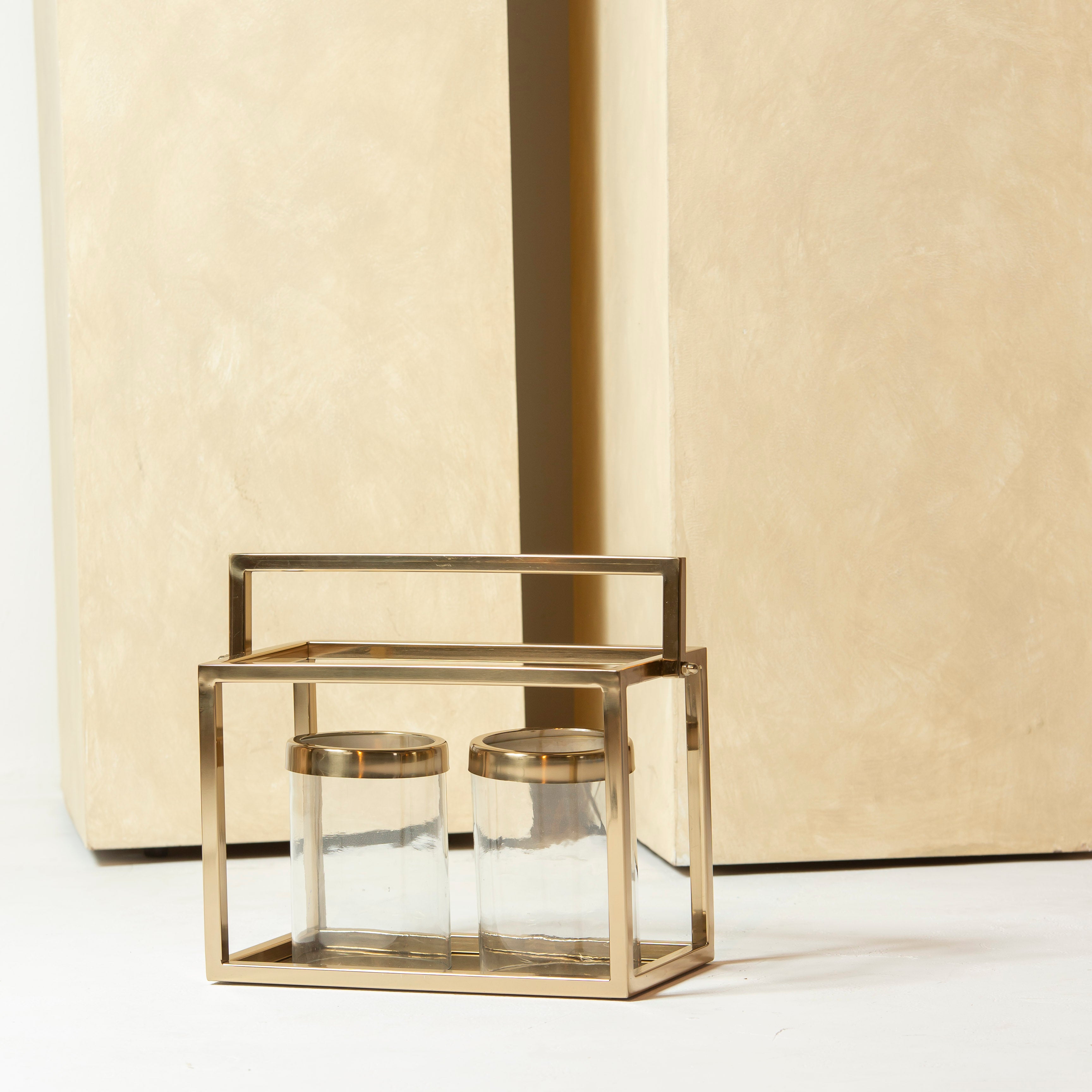 Blending gold stainless steel and glass, this charming hurricane adds a warm glow to any space. Dimensions: 35.56 x 19.05 x 25.40 cm.