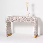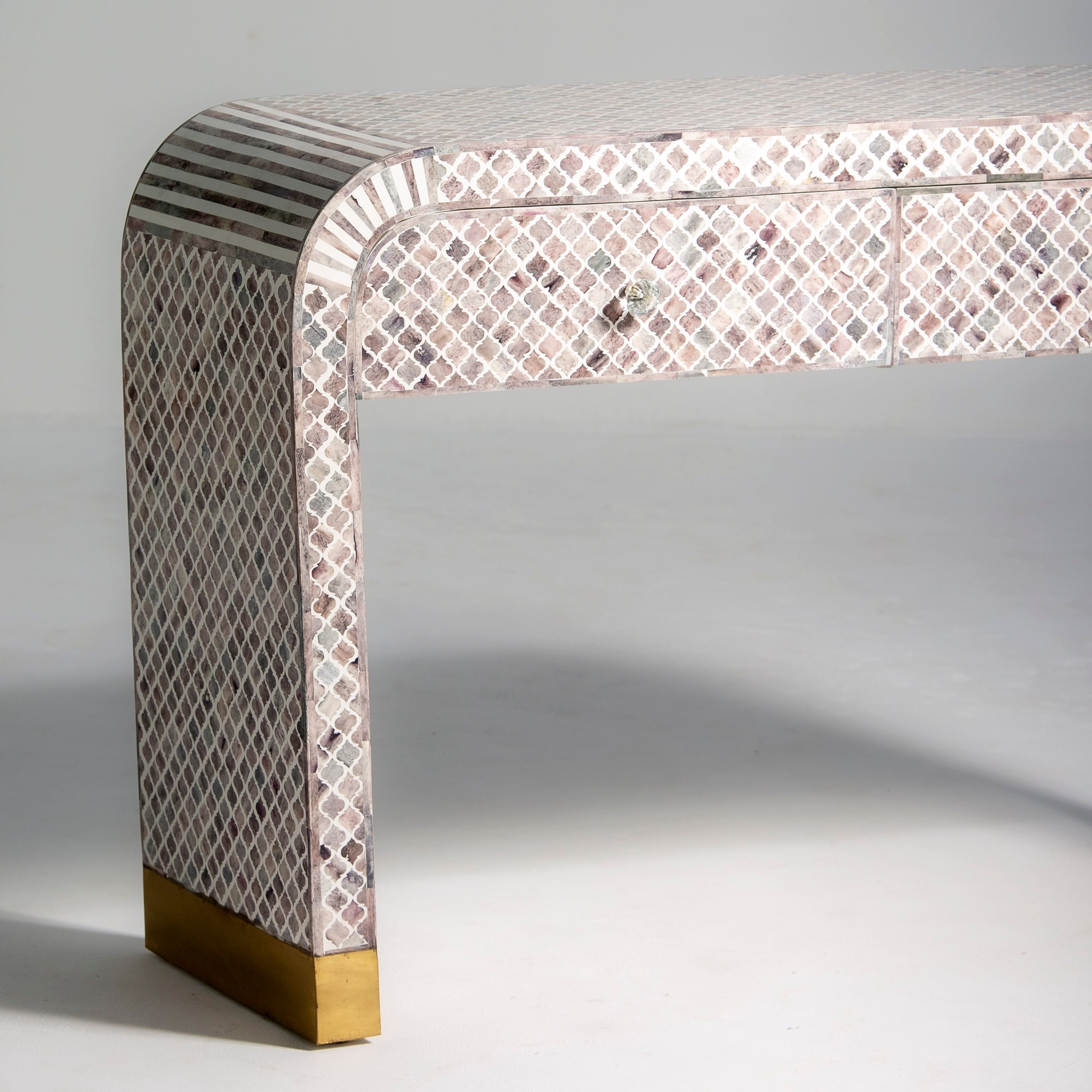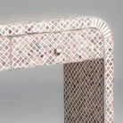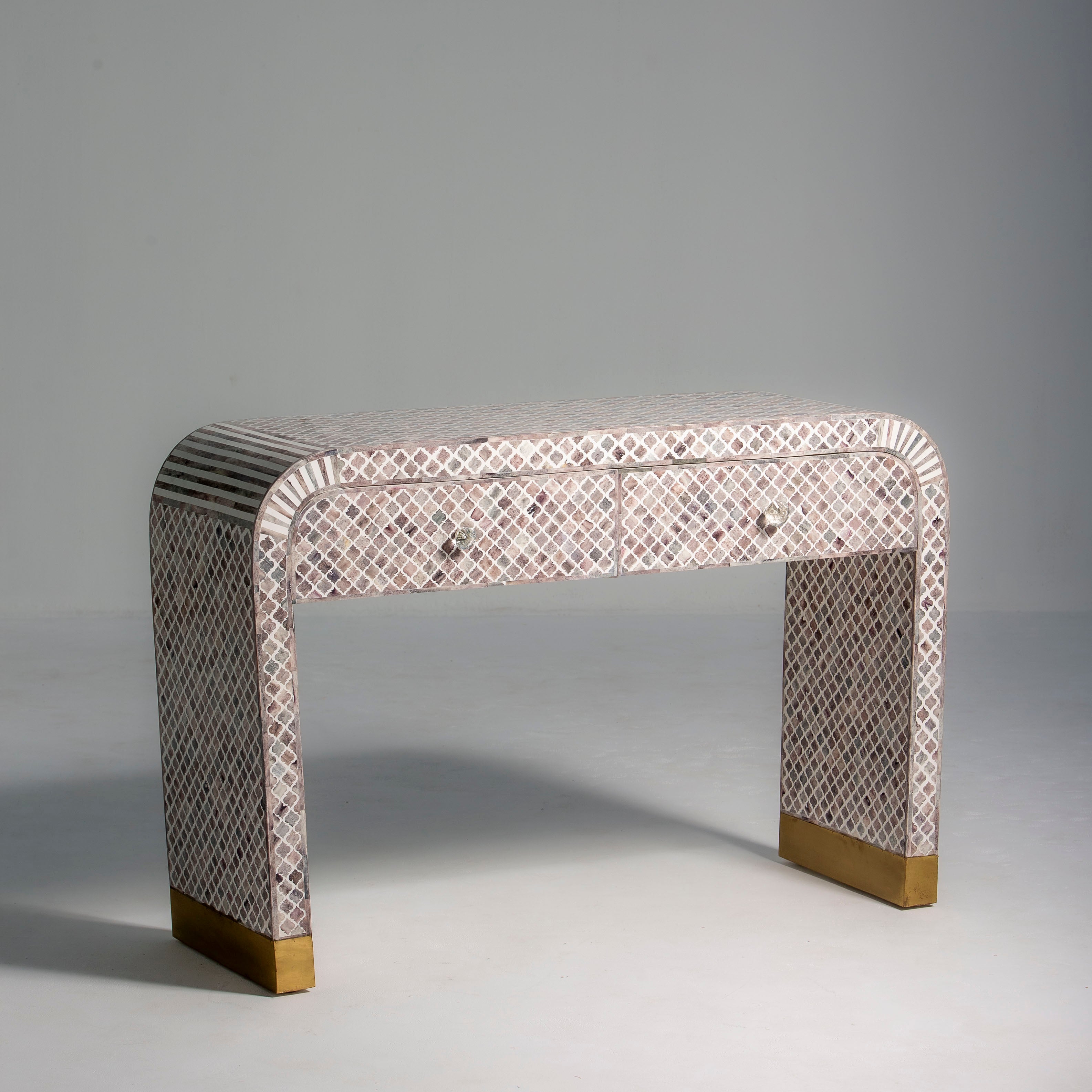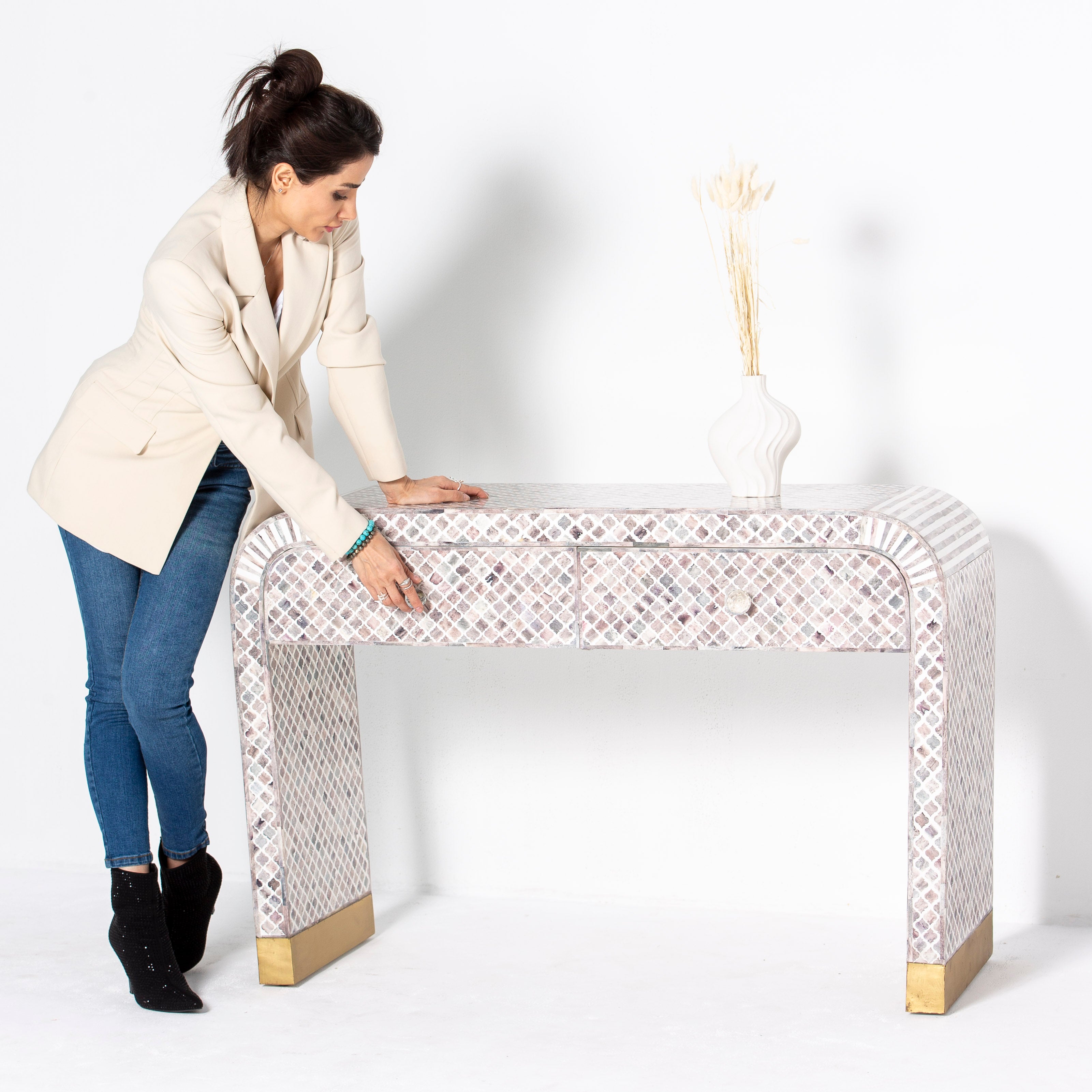 Discover timeless elegance with this handcrafted Indian console table, featuring exquisite brown inlay work that tells a story of traditional artistry. Two spacious drawers provide practical storage while the intricate detailing showcases the skill of master craftsmen. Perfect for entryways or living spaces, this piece blends functional design with authentic cultural heritage, adding warmth and character to any room.