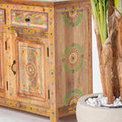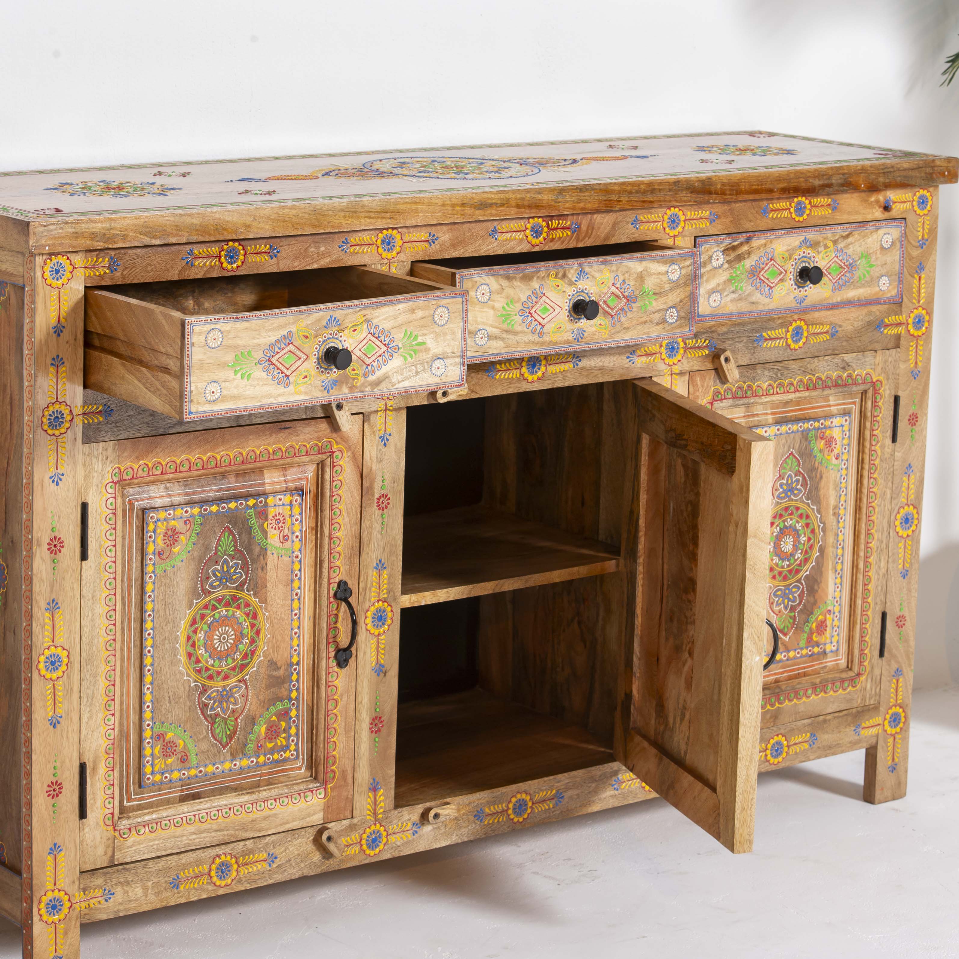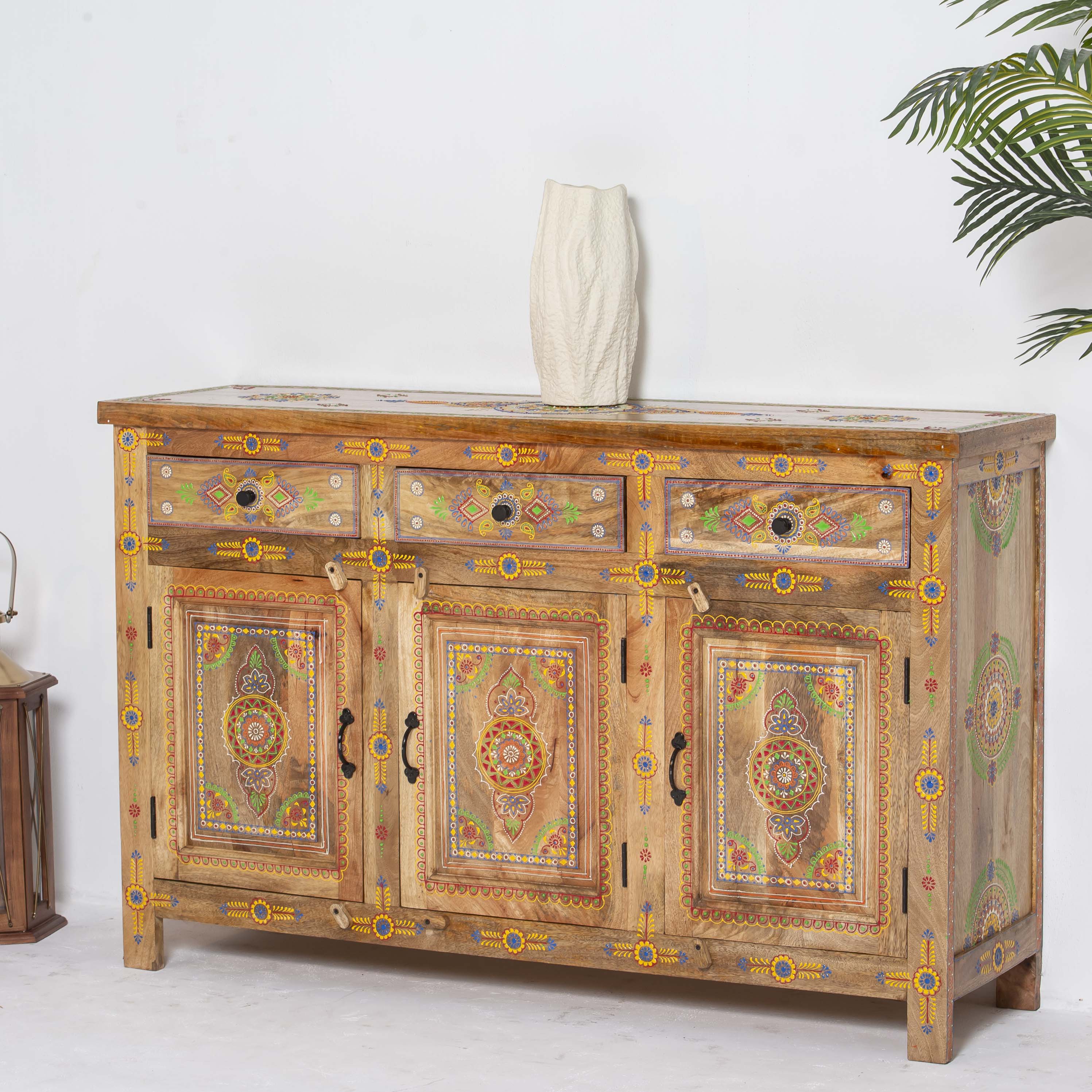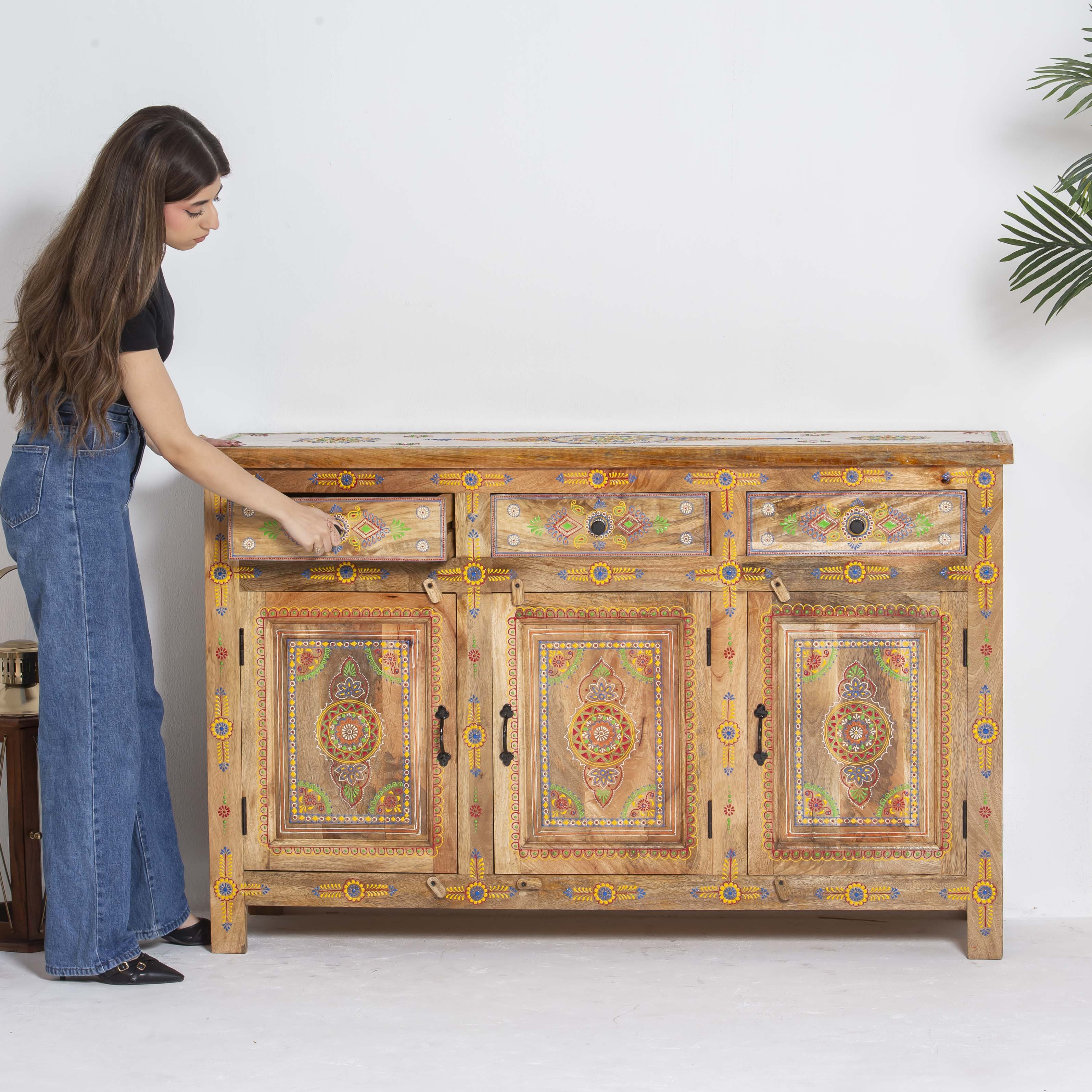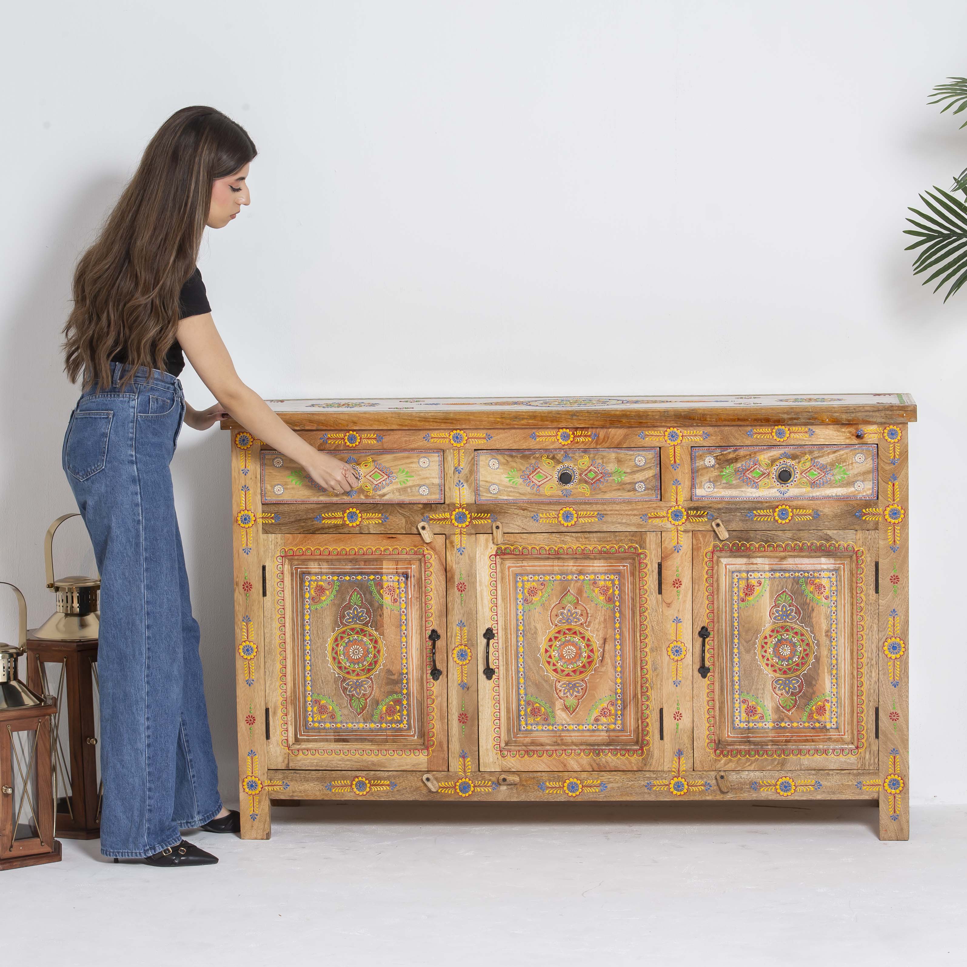The ELMORA Painting Wooden Sideboard brings authentic Indian craftsmanship into your home. Hand-carved from premium mango wood, each piece showcases traditional artisanal techniques passed down through generations. The intricate painted details add character and warmth to any room, making this sideboard a functional work of art. Perfect for storing essentials while serving as a striking focal point that celebrates heritage and quality craftsmanship.