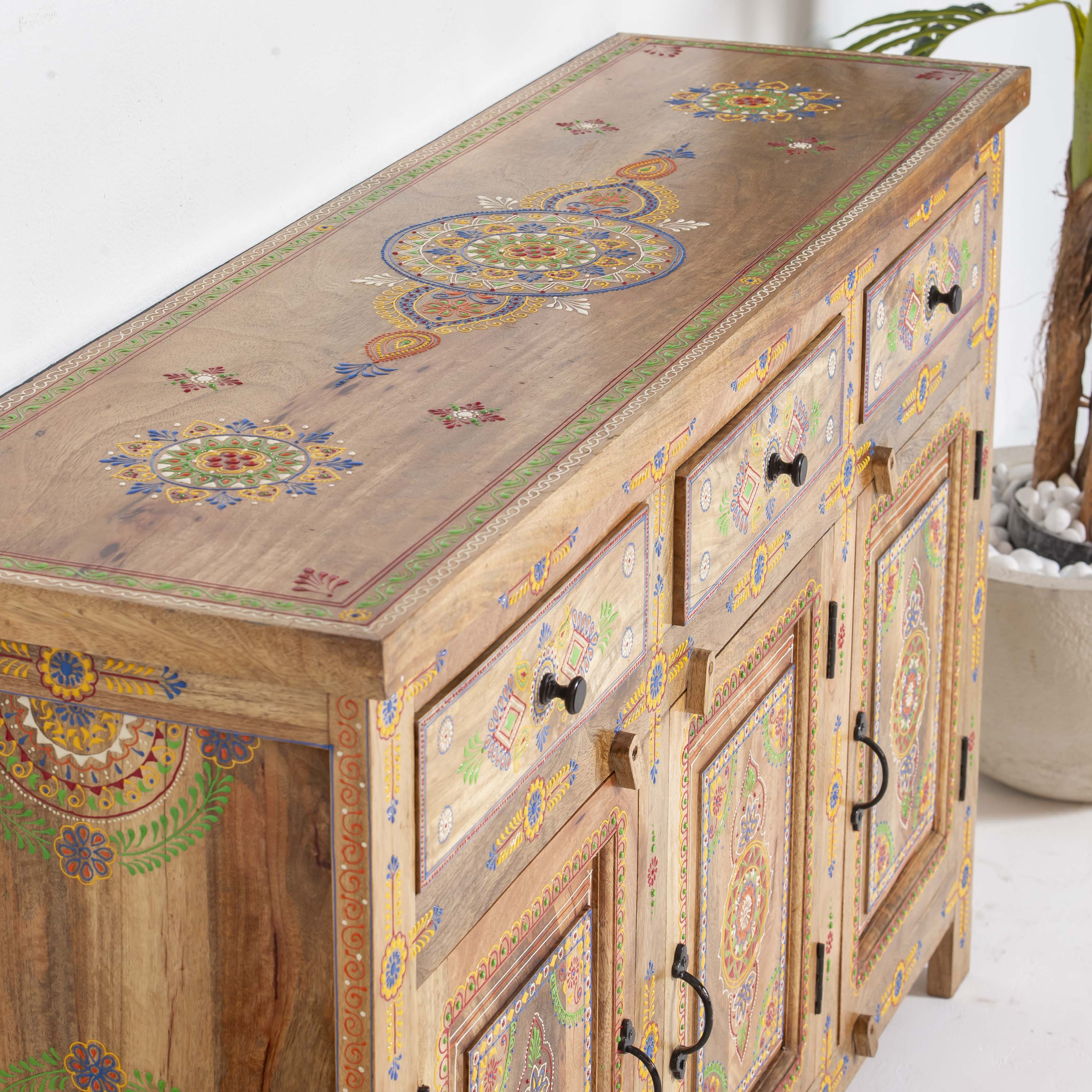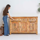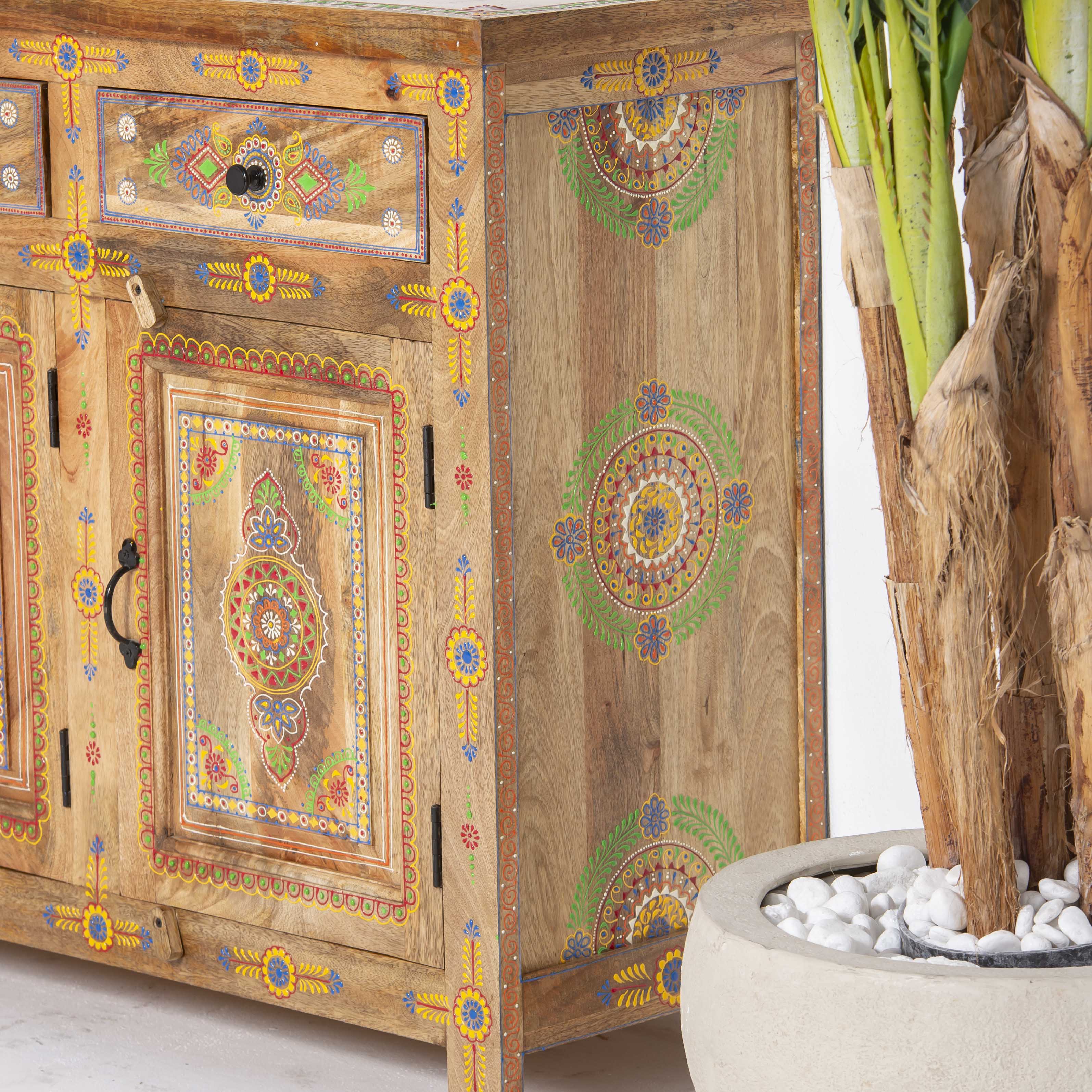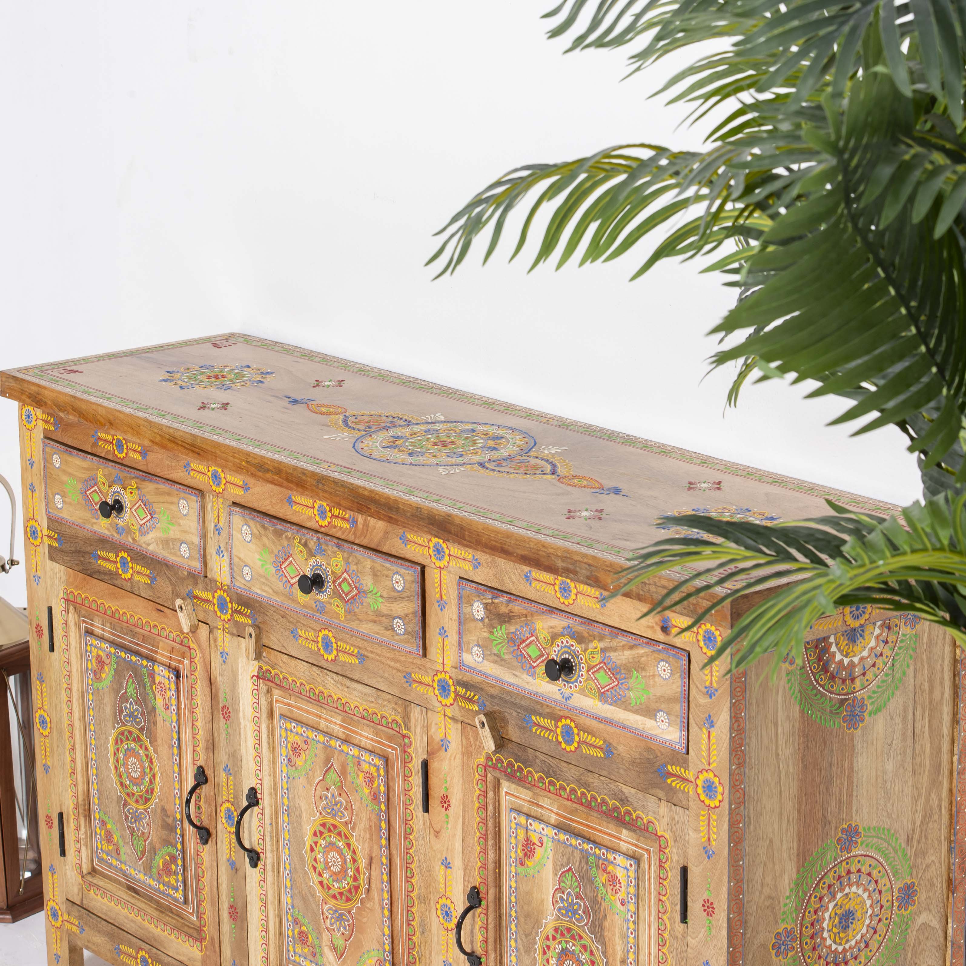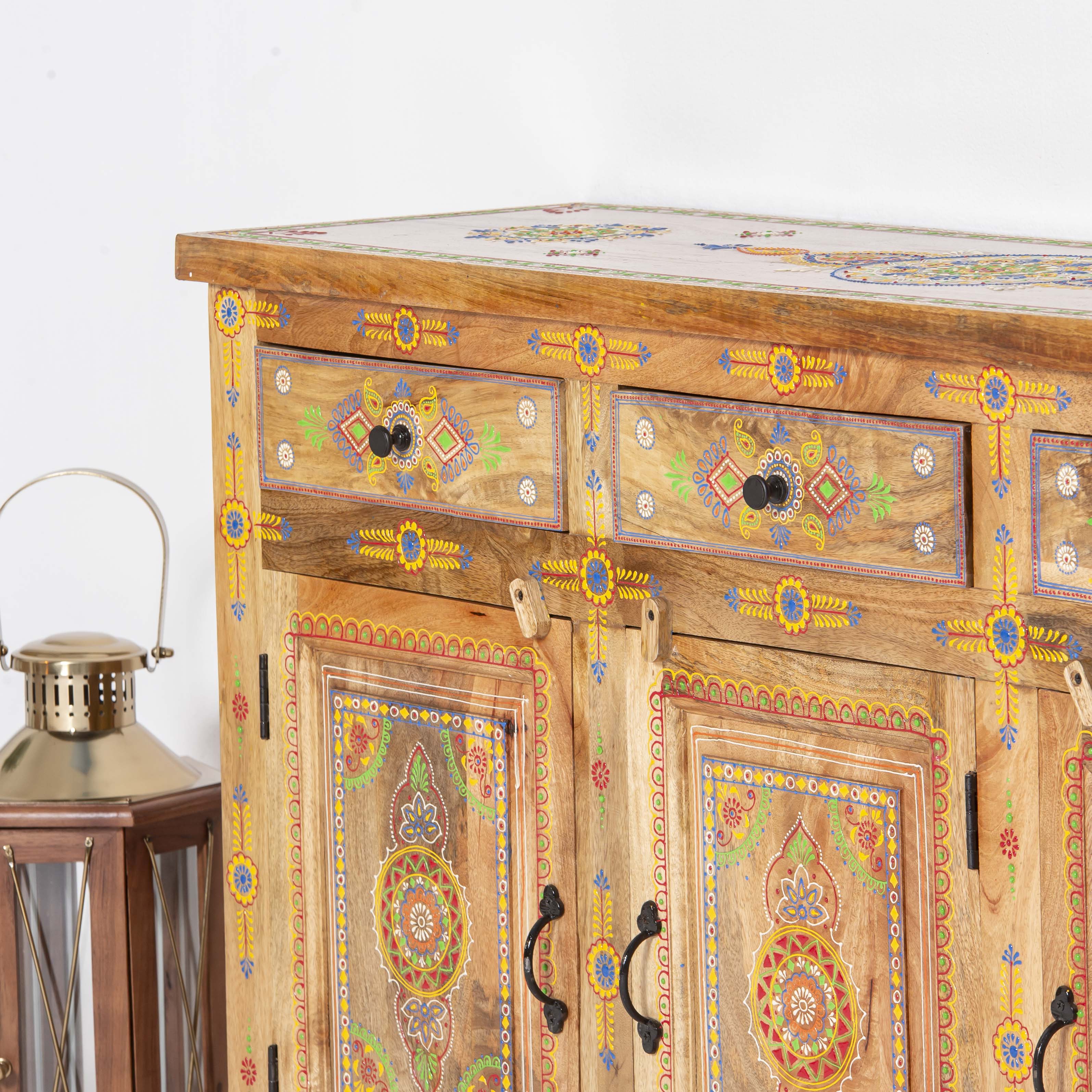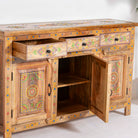 The ELMORA Painting Wooden Sideboard brings authentic Indian craftsmanship into your home. Hand-carved from premium mango wood, each piece showcases traditional artisanal techniques passed down through generations. The intricate painted details add character and warmth to any room, making this sideboard a functional work of art. Perfect for storing essentials while serving as a striking focal point that celebrates heritage and quality craftsmanship.
