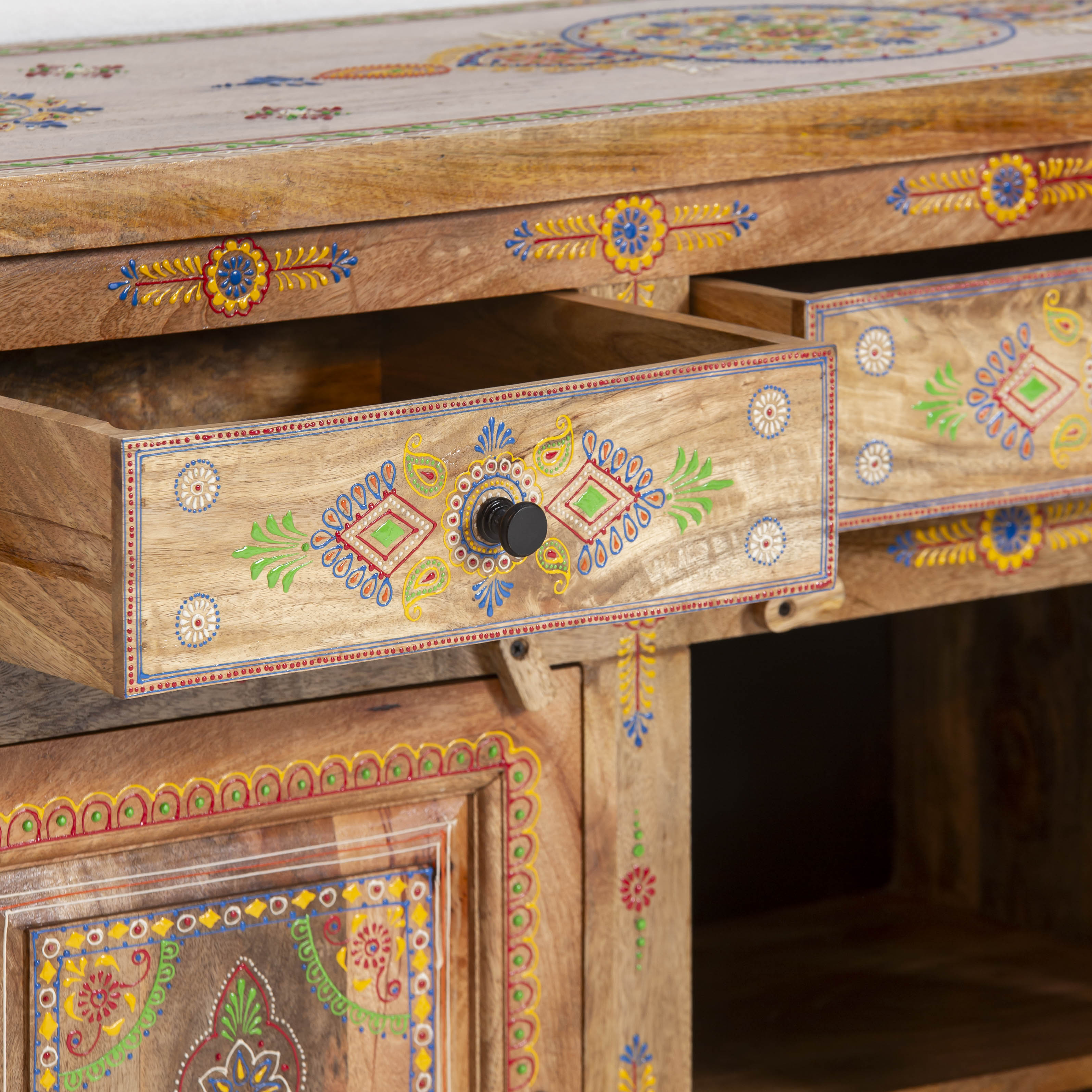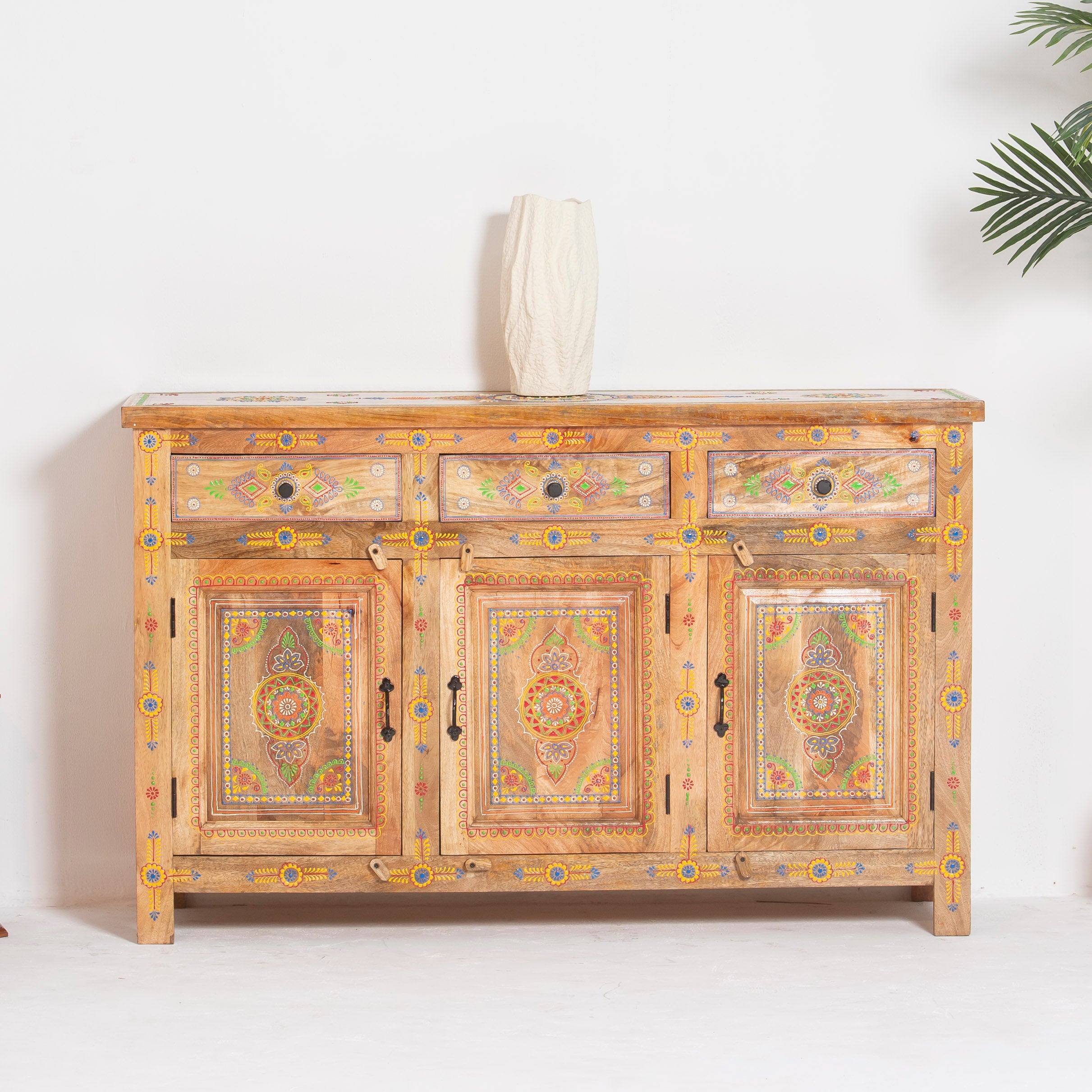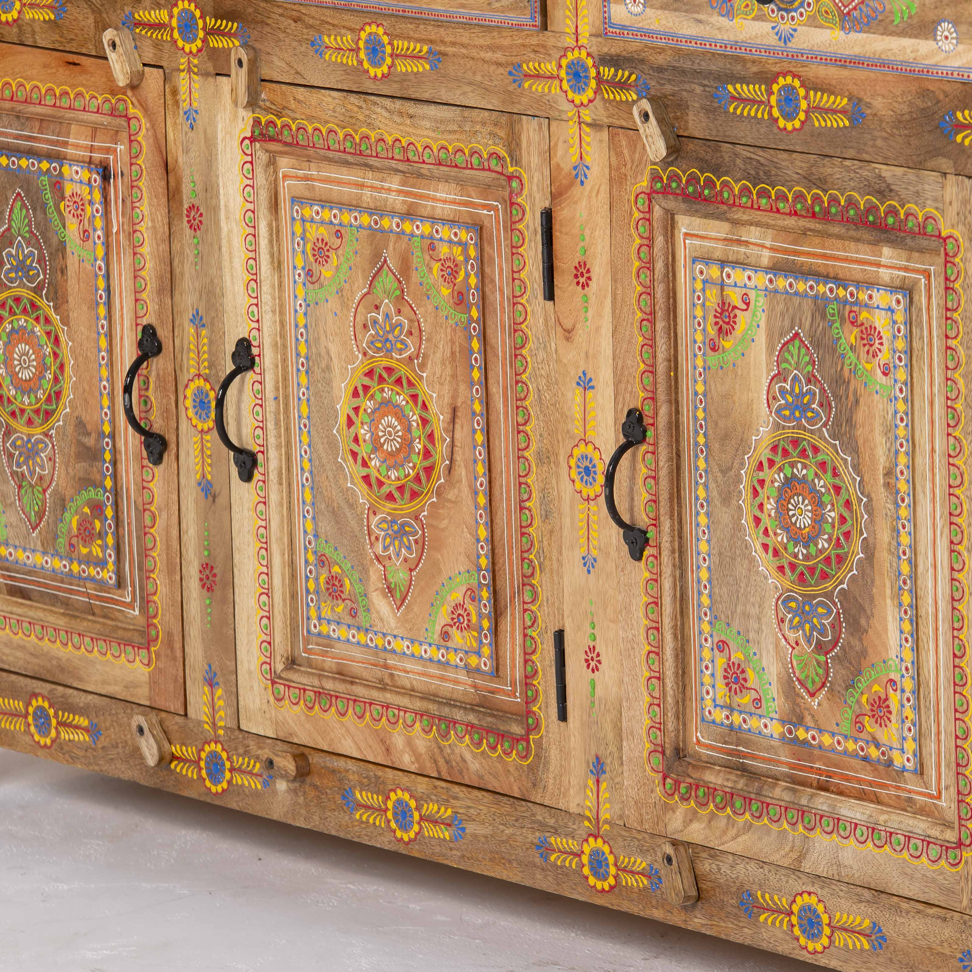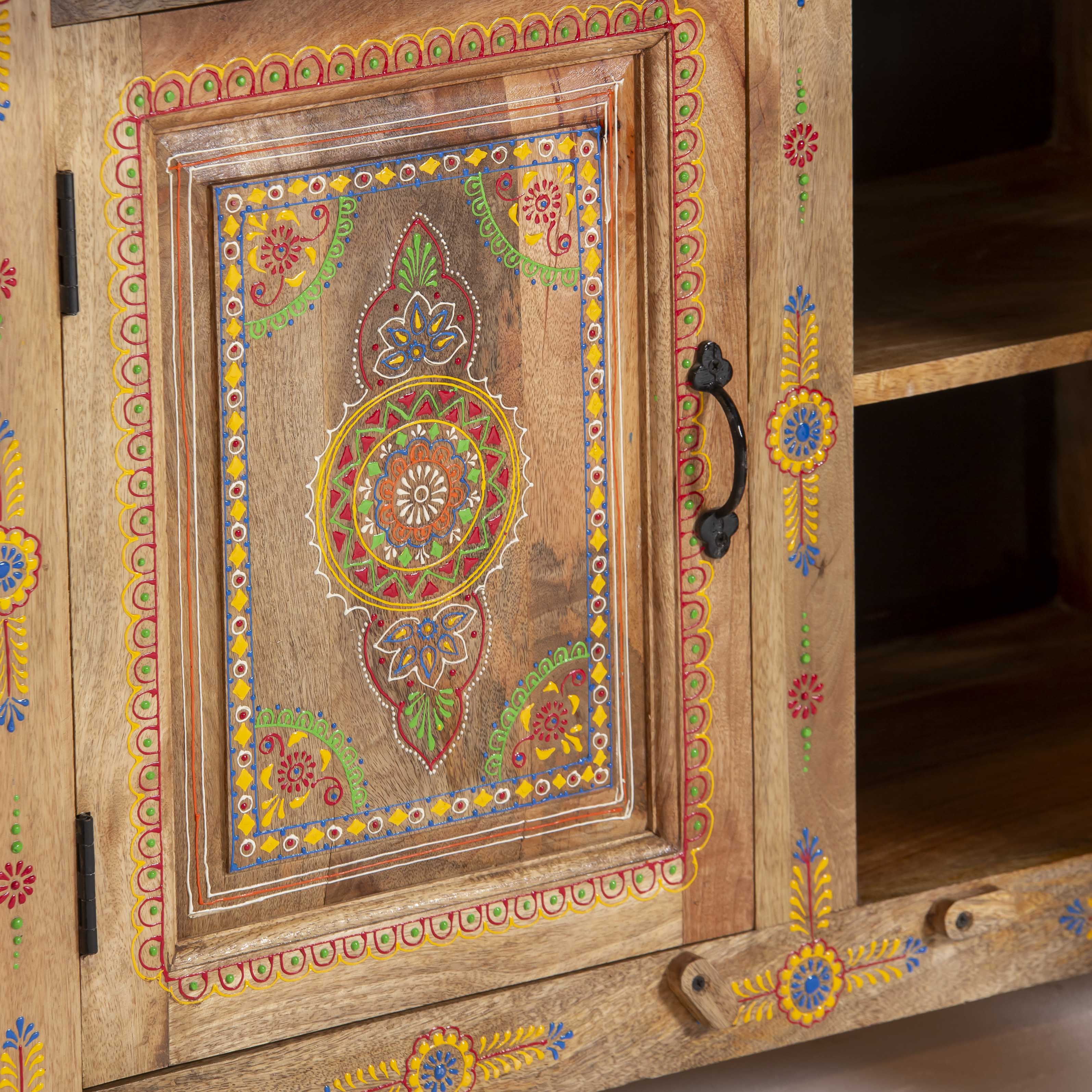 The ELMORA Painting Wooden Sideboard brings authentic Indian craftsmanship into your home. Hand-carved from premium mango wood, each piece showcases traditional artisanal techniques passed down through generations. The intricate painted details add character and warmth to any room, making this sideboard a functional work of art. Perfect for storing essentials while serving as a striking focal point that celebrates heritage and quality craftsmanship.