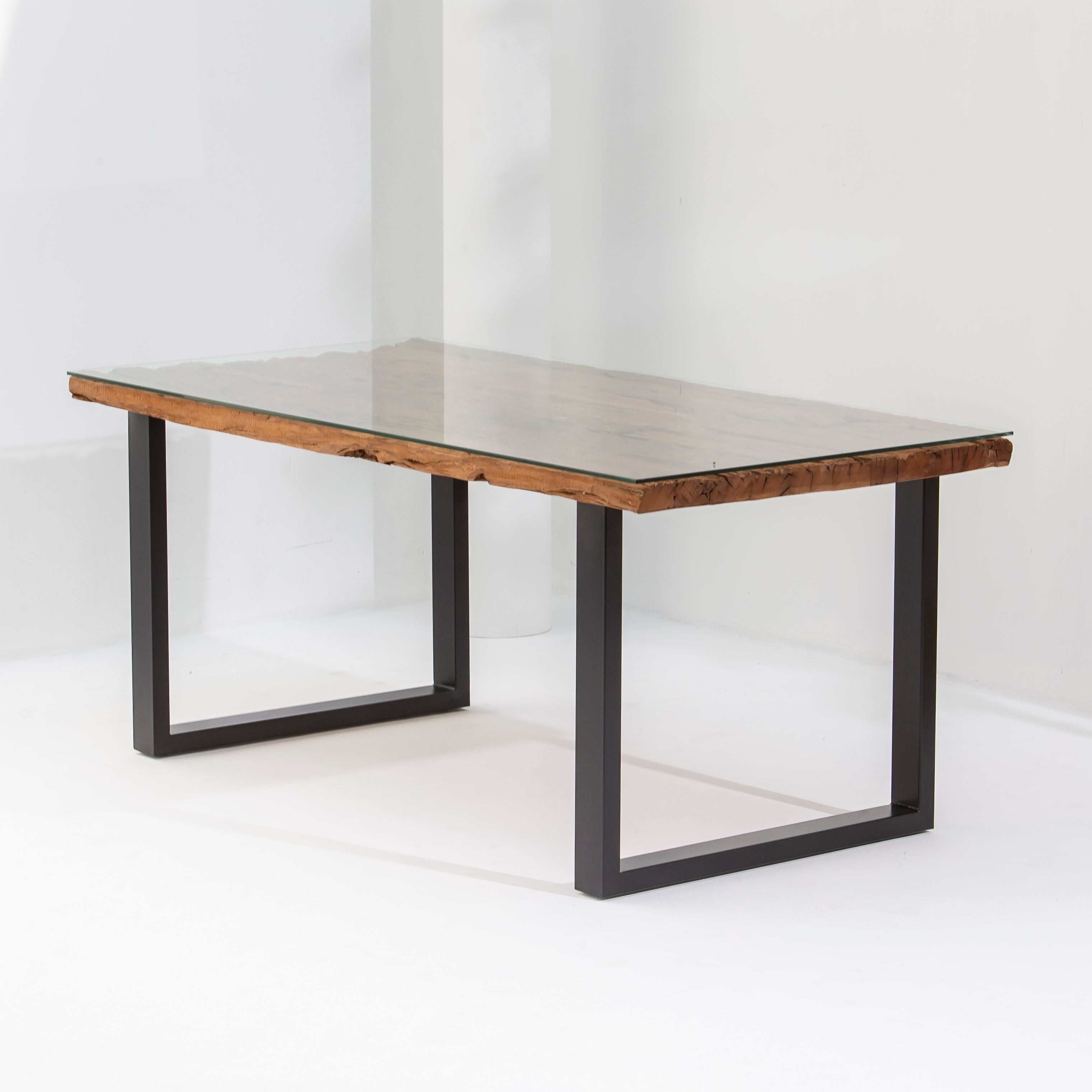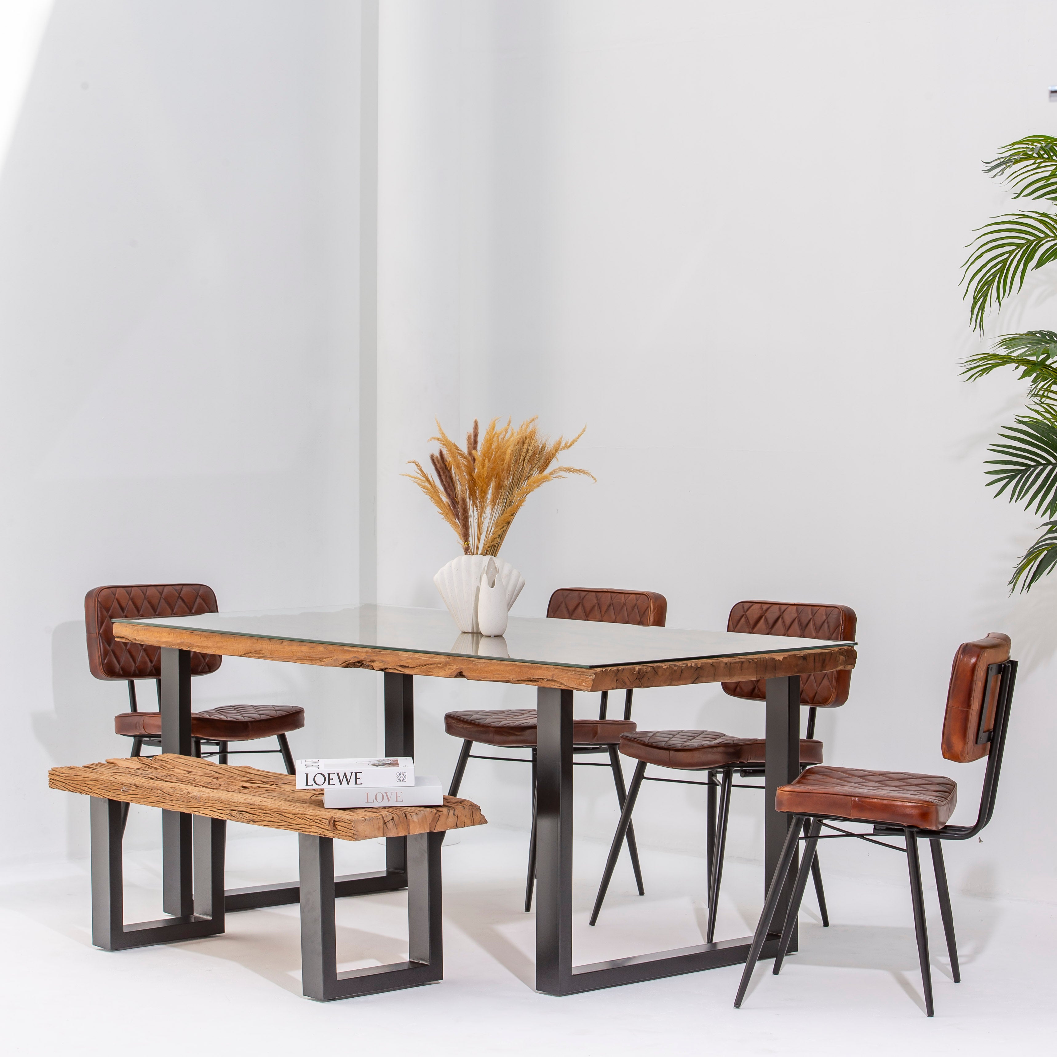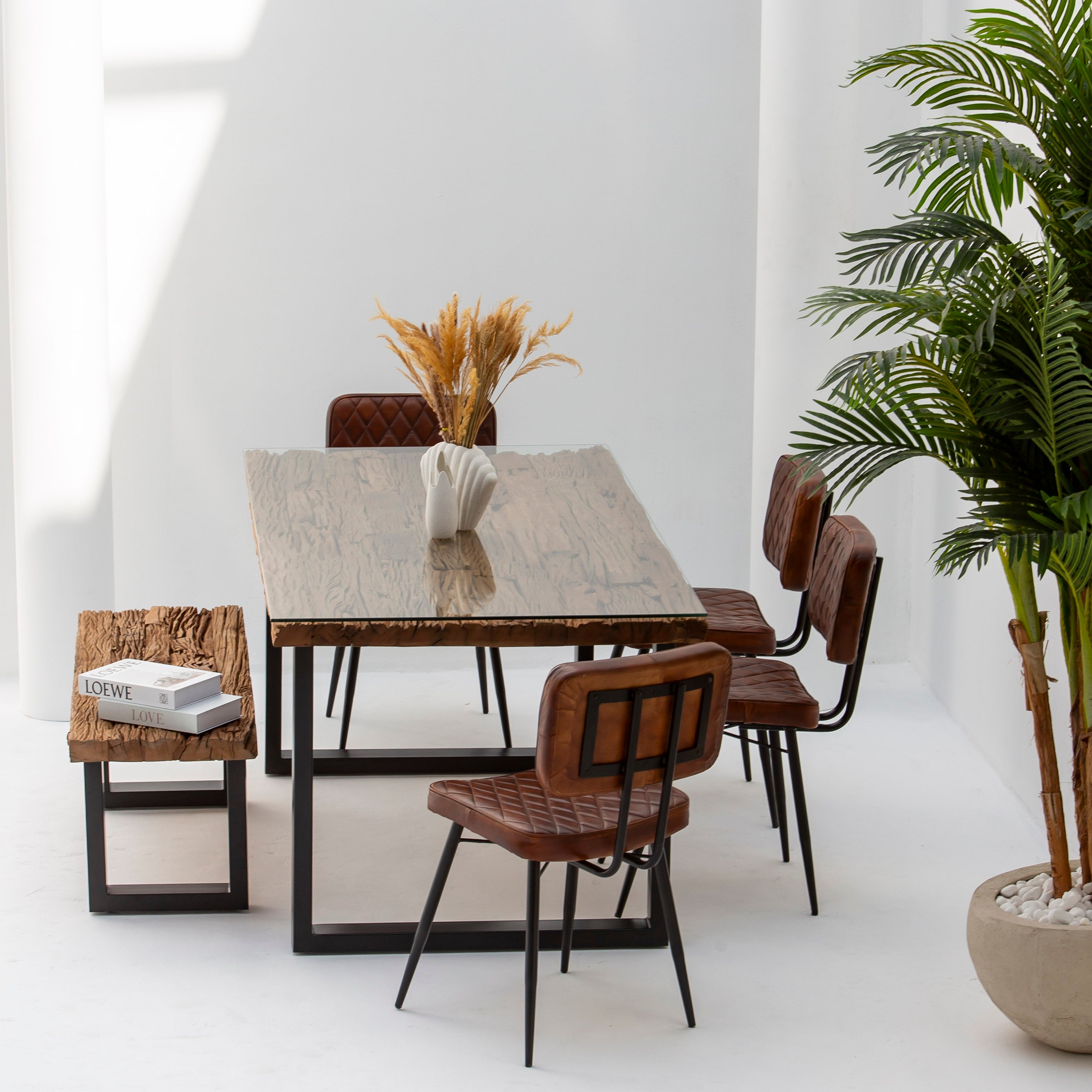 Crafted from authentic Indian railway sleepers, this dining table merges industrial heritage with functional elegance. The reclaimed wood carries the patina of history, while sturdy metal legs provide contemporary support and stability. Each piece is unique, showcasing natural grain variations and character marks that tell a story of its past. Ideal for those seeking distinctive furniture that combines sustainability with timeless design. Perfect for creating a conversation-starting centerpiece in modern or eclectic interiors.