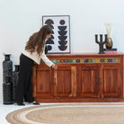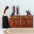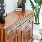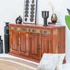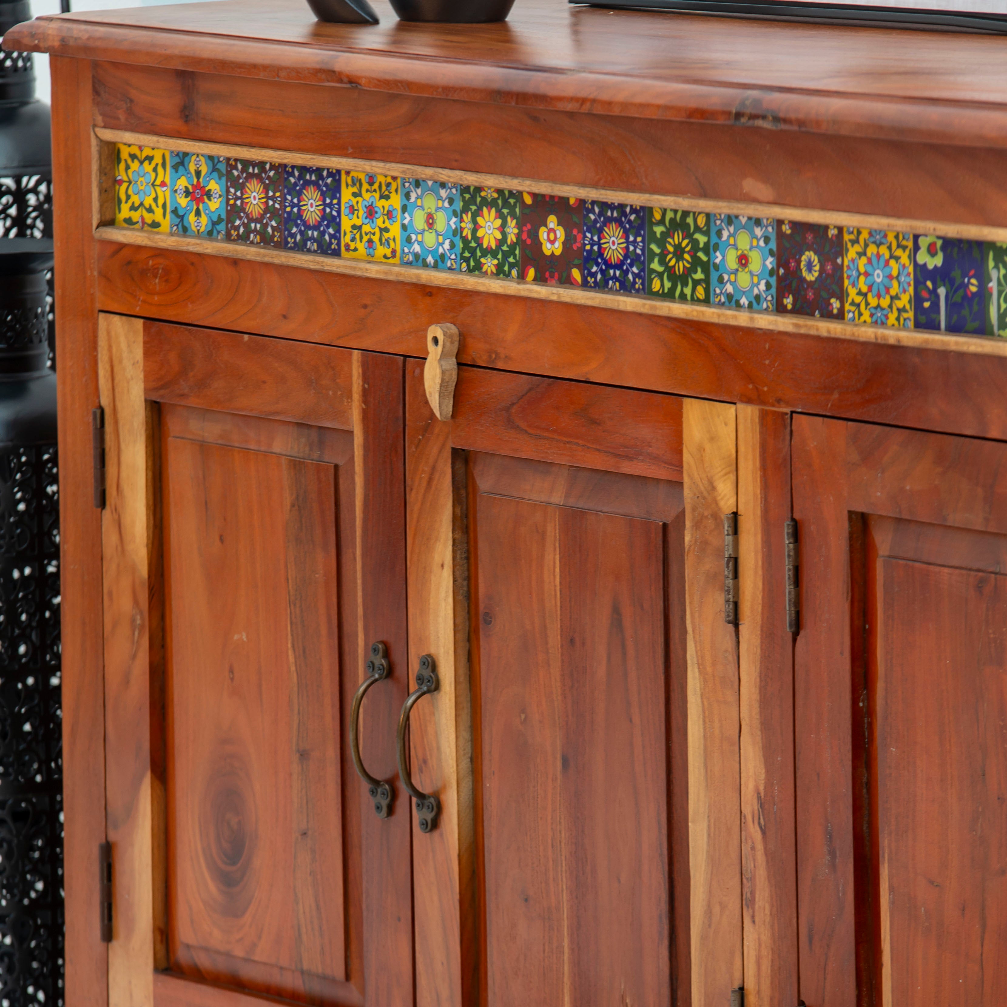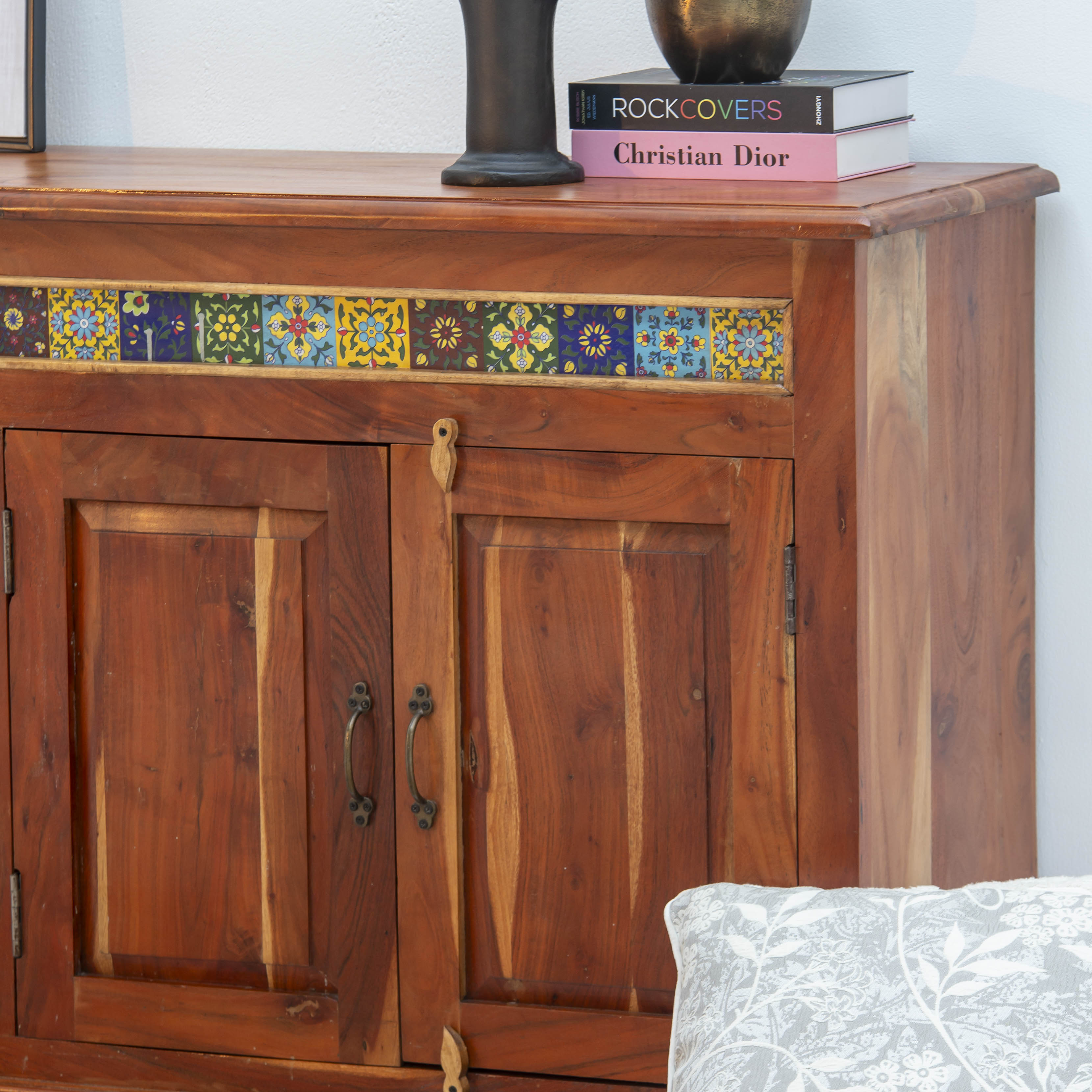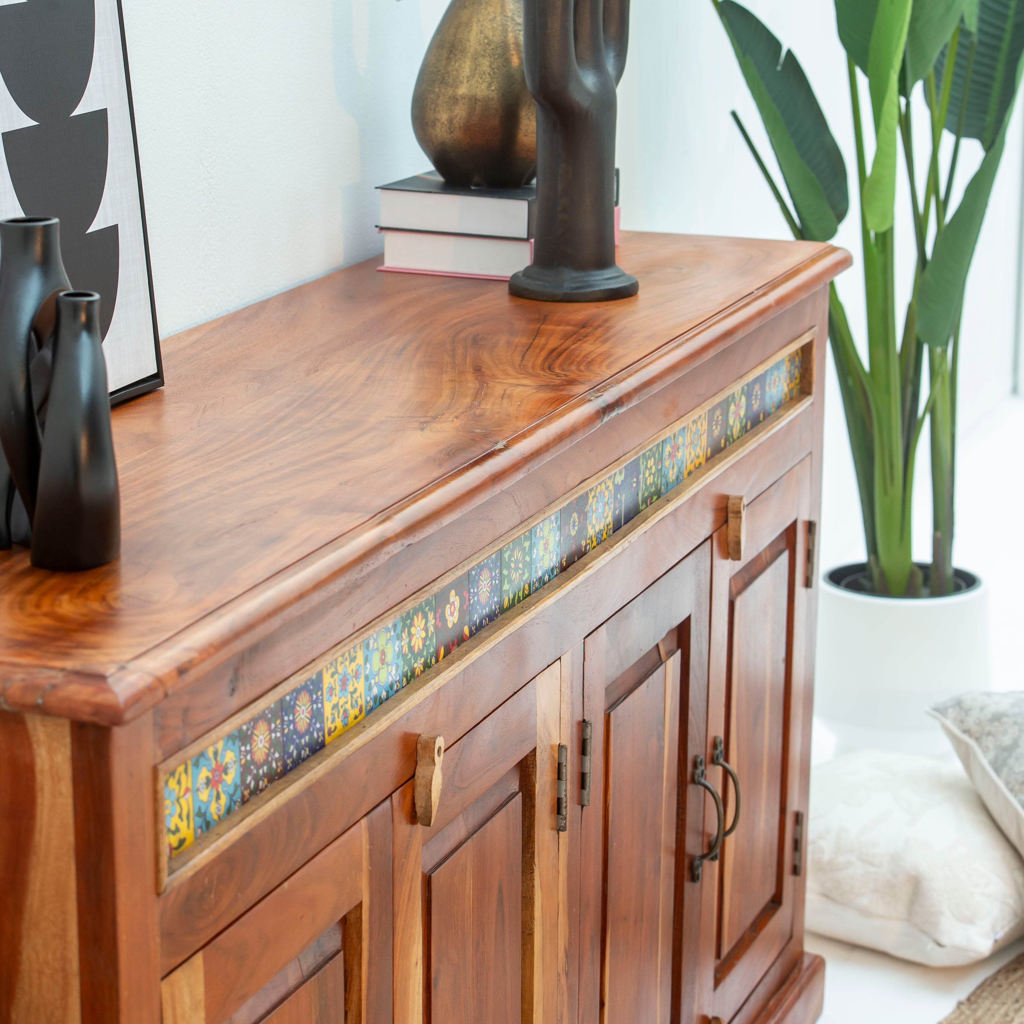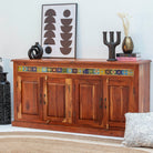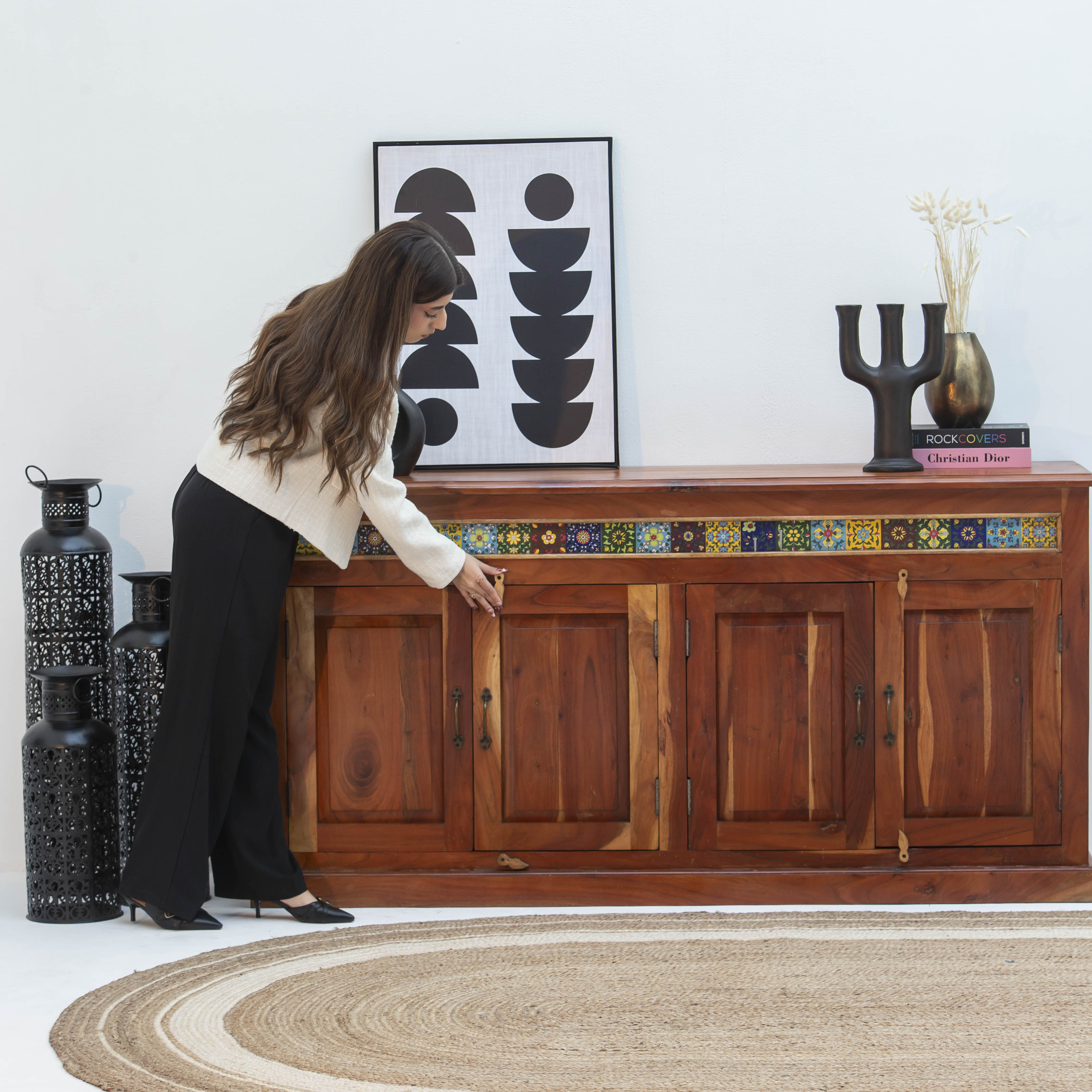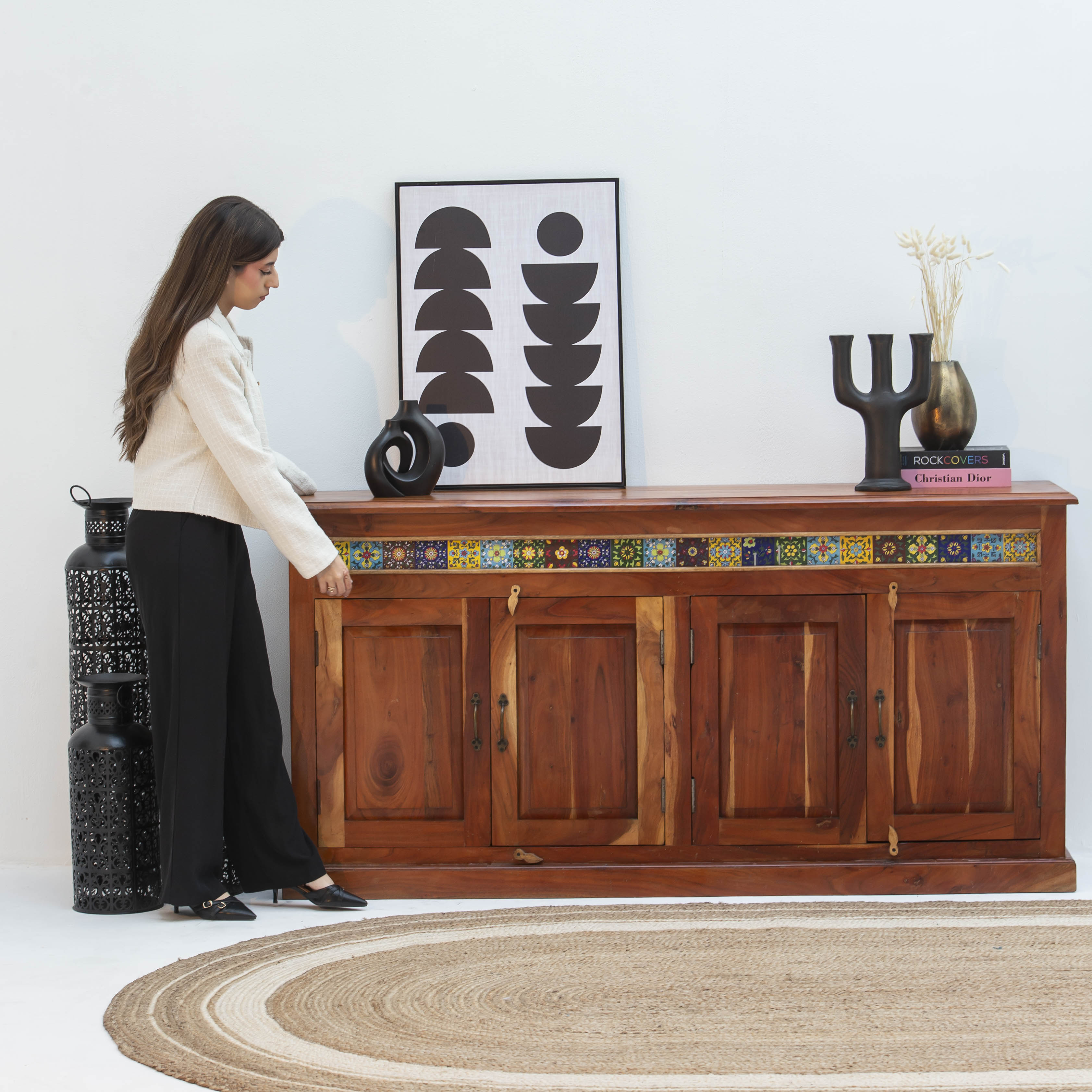 Celebrate the artistry of traditional craftsmanship with this handcrafted four-door sideboard, expertly fashioned from premium mango wood. Each piece showcases authentic Indian artisanal techniques, featuring distinctive acacia tile detailing that adds character and visual depth. Sturdy construction meets timeless design, offering generous storage while serving as a striking focal point in any room. The natural wood grain and hand-applied finishes ensure every sideboard is beautifully unique, bringing warmth and heritage into your home.