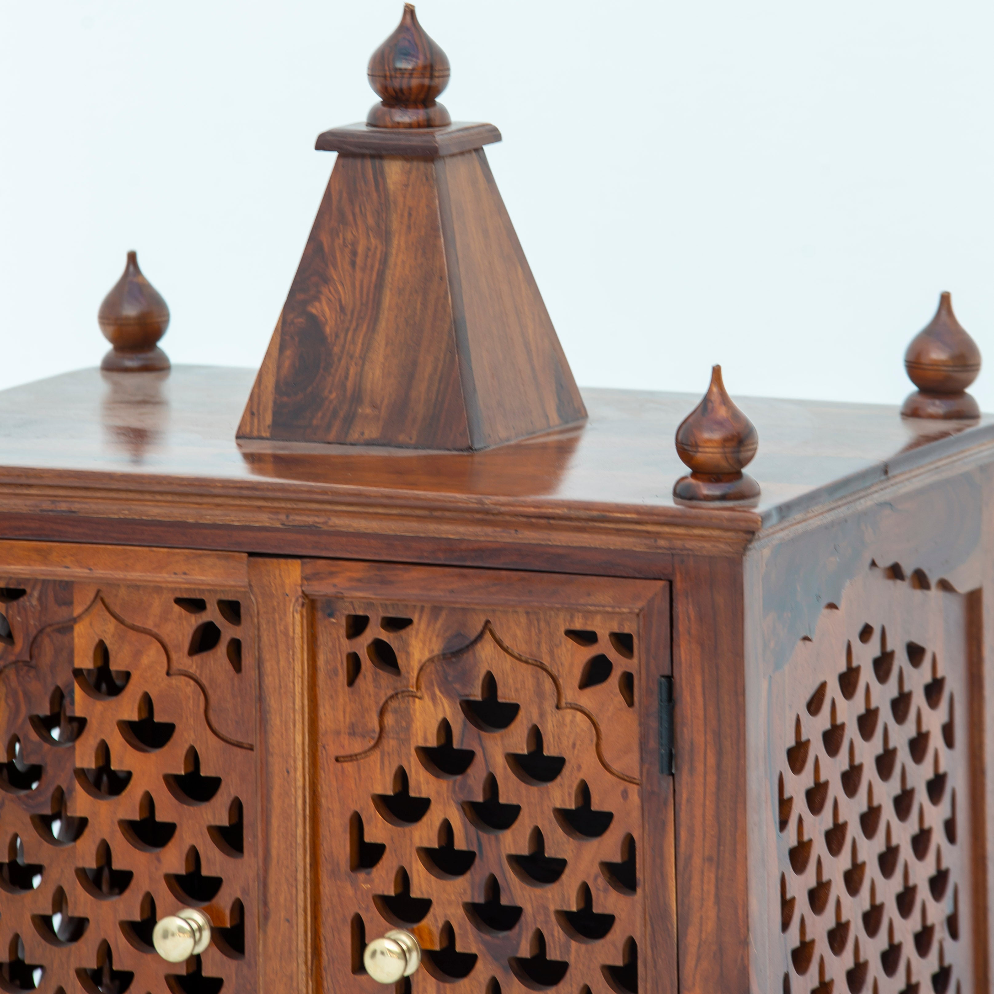 Handcrafted wooden temple featuring authentic Indian artistry and traditional design. Constructed from premium mango solid wood, this piece showcases natural grain patterns and warm tones. Each temple is meticulously made in India by skilled craftsmen, ensuring quality and durability. Perfect for home altars, spiritual spaces, or as a decorative accent that brings cultural elegance to any room. A timeless addition that honors traditional craftsmanship while adding natural beauty to your interior.