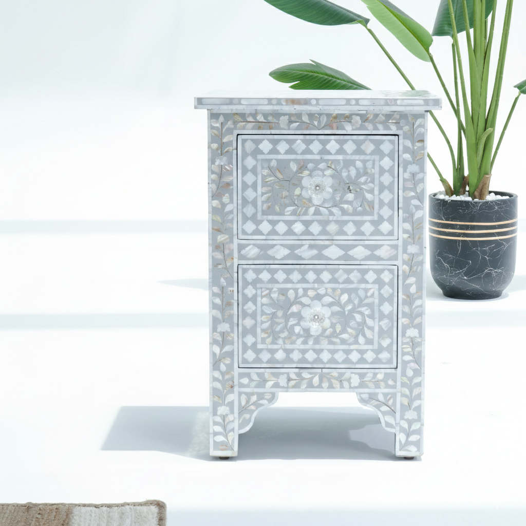 The Mop Grey Bedside Table combines contemporary design with functionality. Its sleek finish and spacious surface make it ideal for any bedroom decor. 1-year warranty, made in India. Enjoy the beauty of our art and craft furniture.
