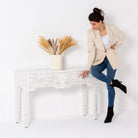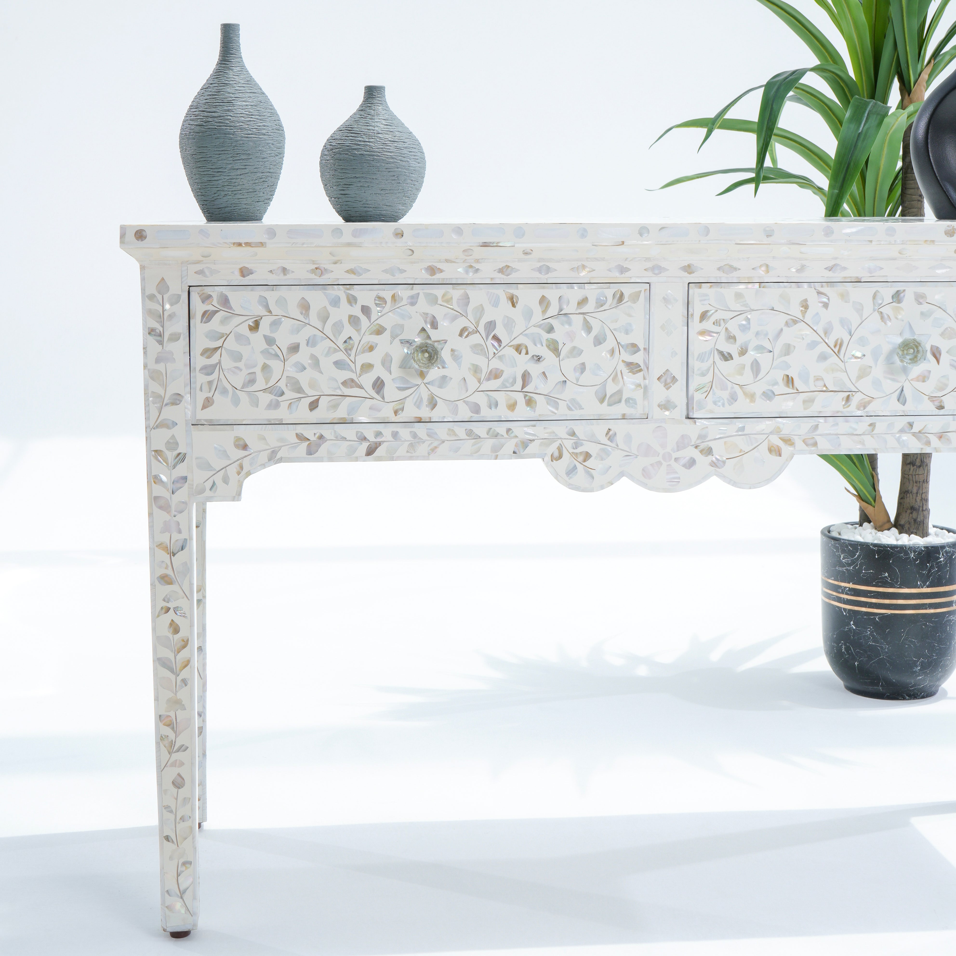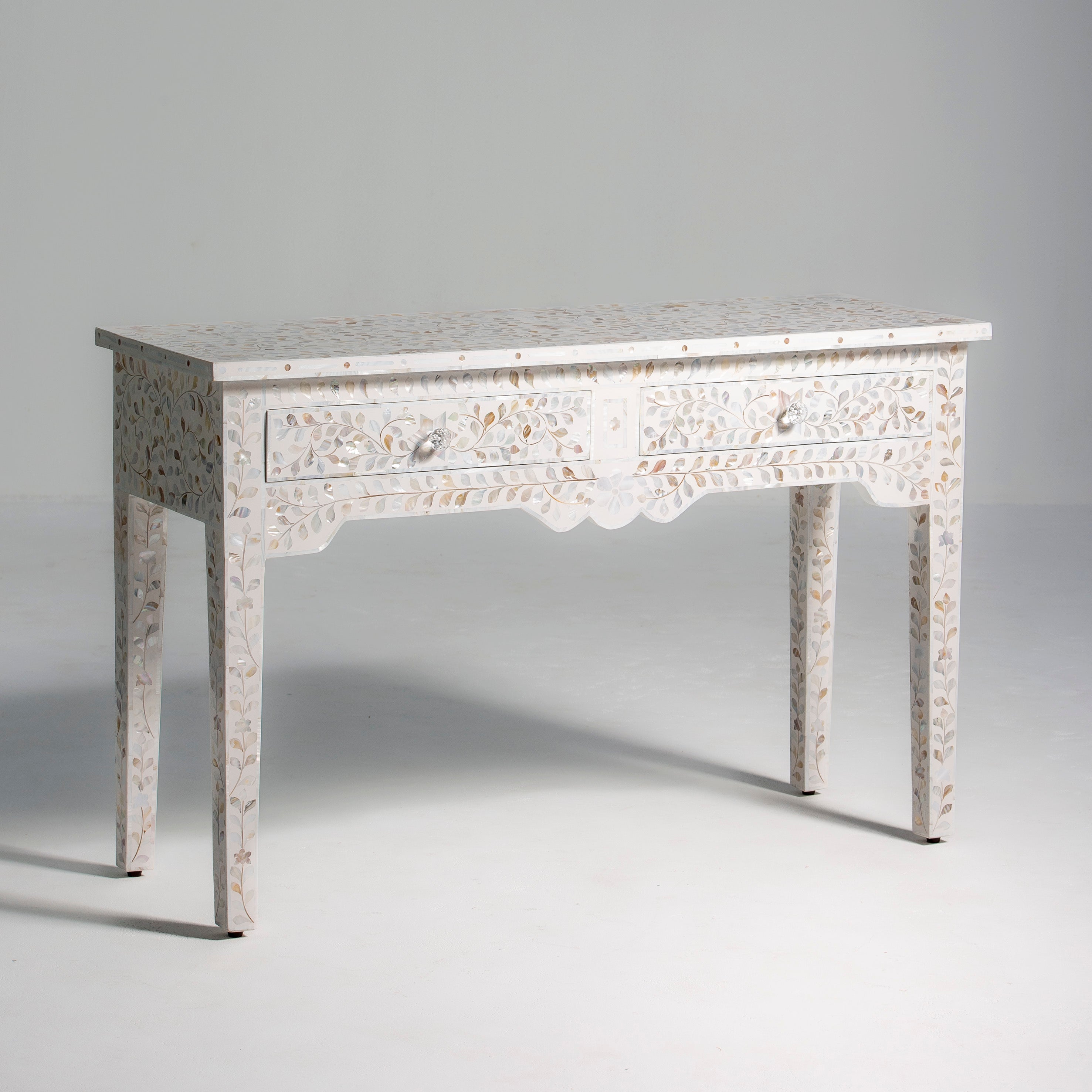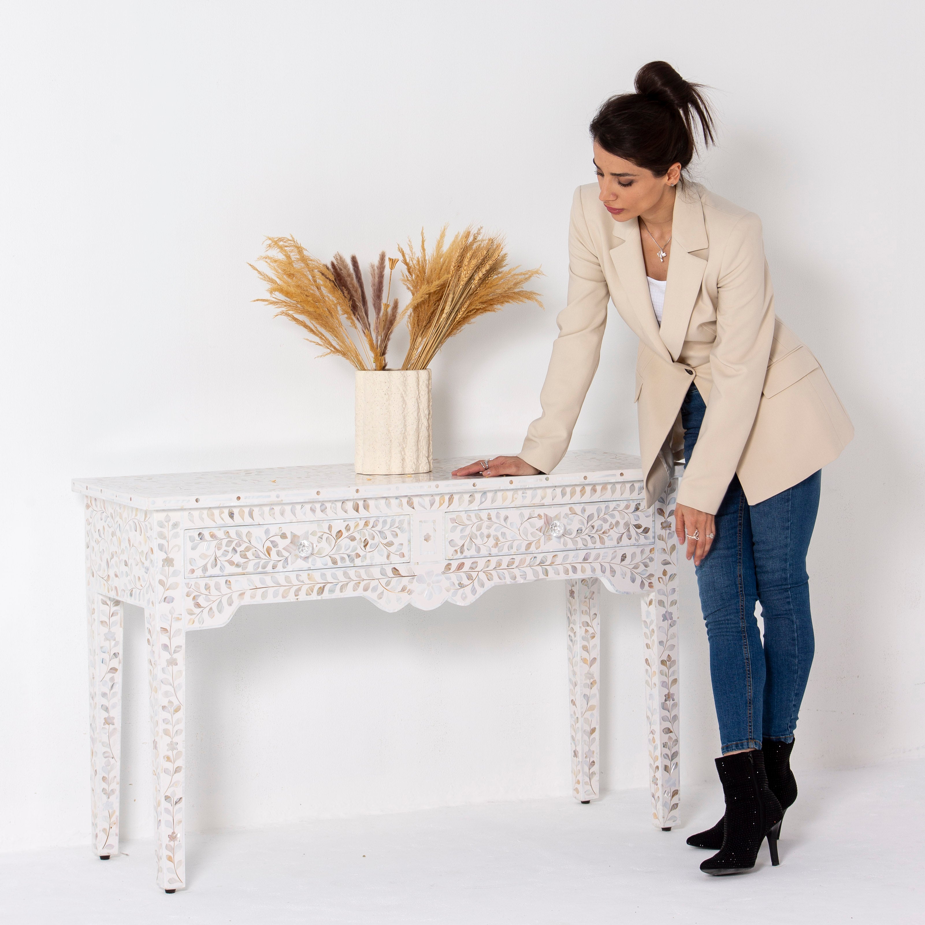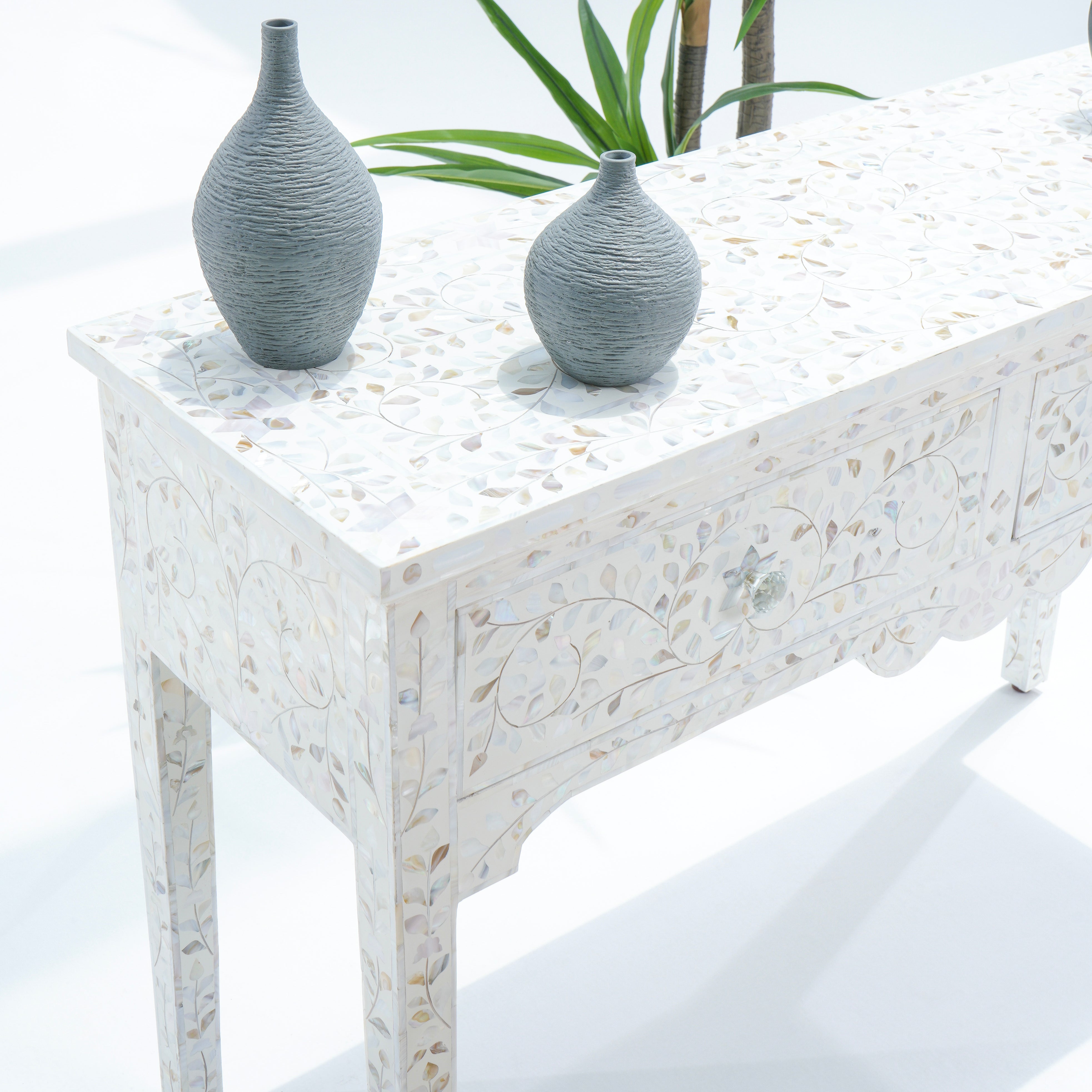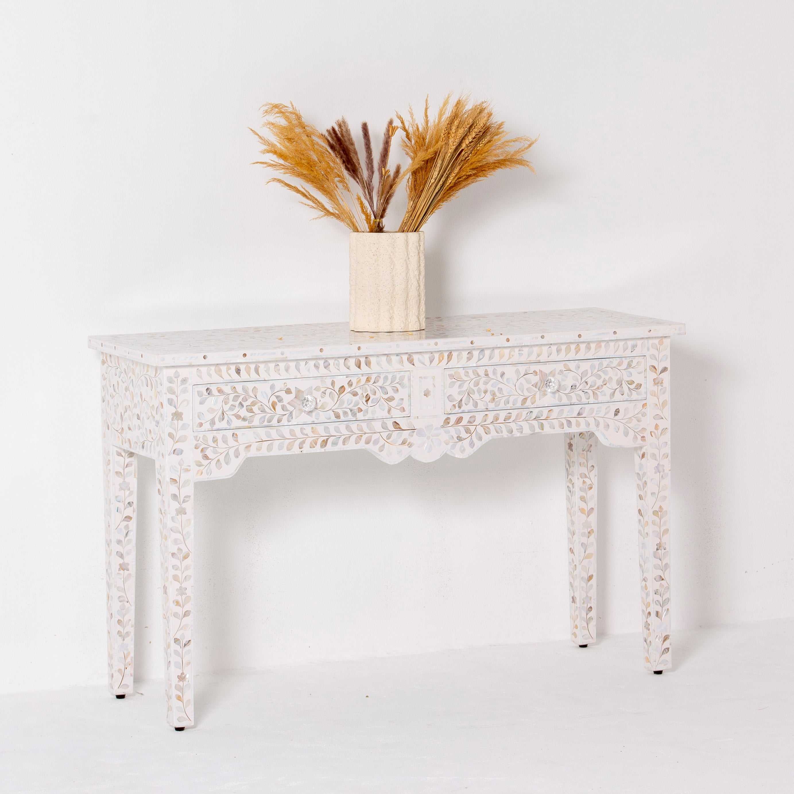 This handcrafted console table marries functionality with artistic expression through its luminous ocean pearl mother-of-pearl inlays set against a crisp white finish. Two generous drawers provide discreet storage for everyday essentials while maintaining the piece's refined silhouette. Each detail reflects traditional artisanal techniques, from the intricate shell work to the carefully proportioned frame. An ideal companion for hallways, bedrooms, or living spaces seeking both beauty and practicality—a testament to enduring craftsmanship that transforms any room into a gallery of curated elegance.